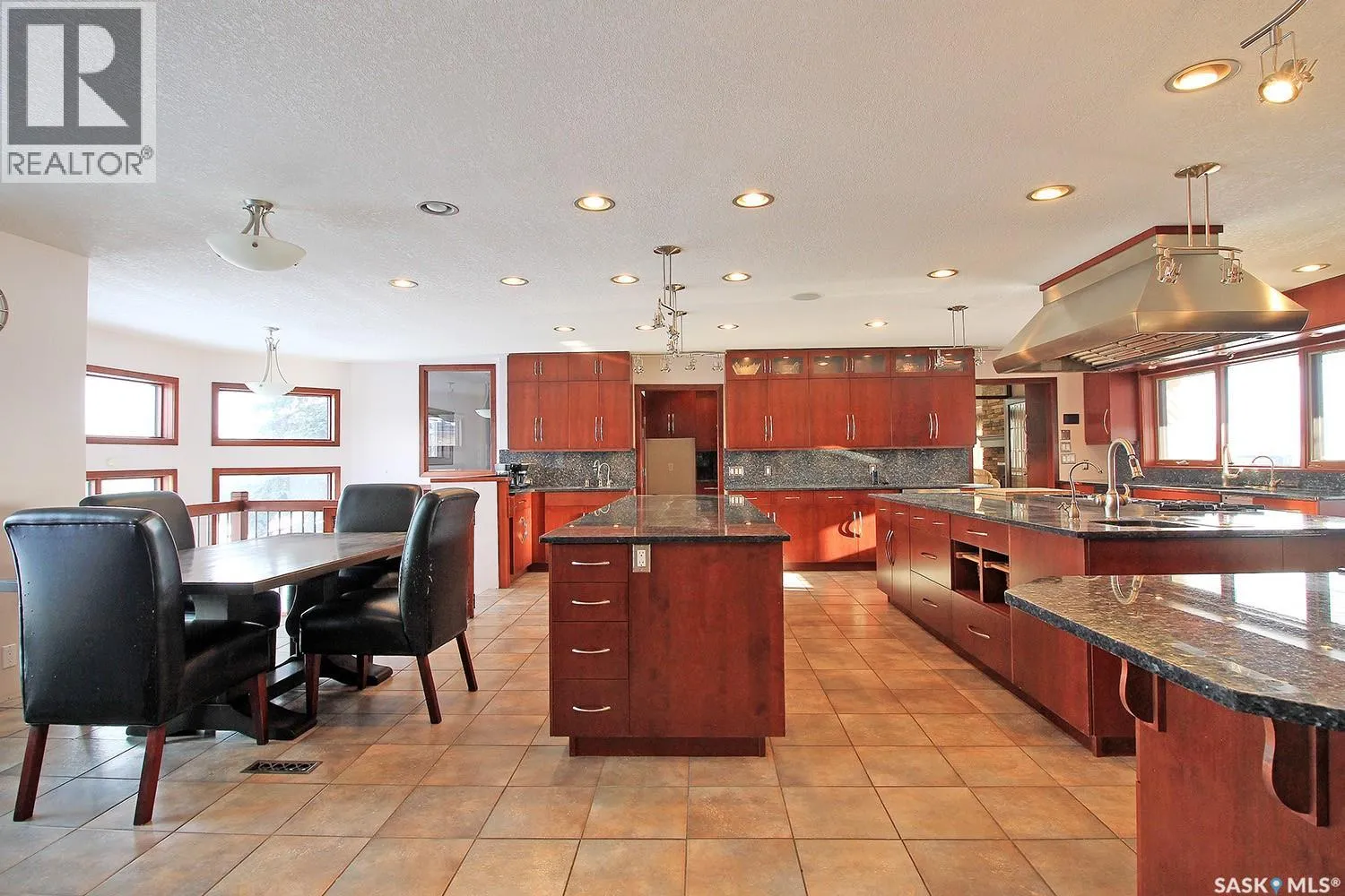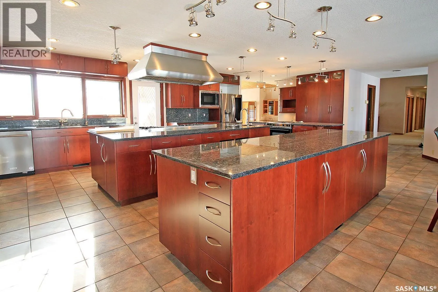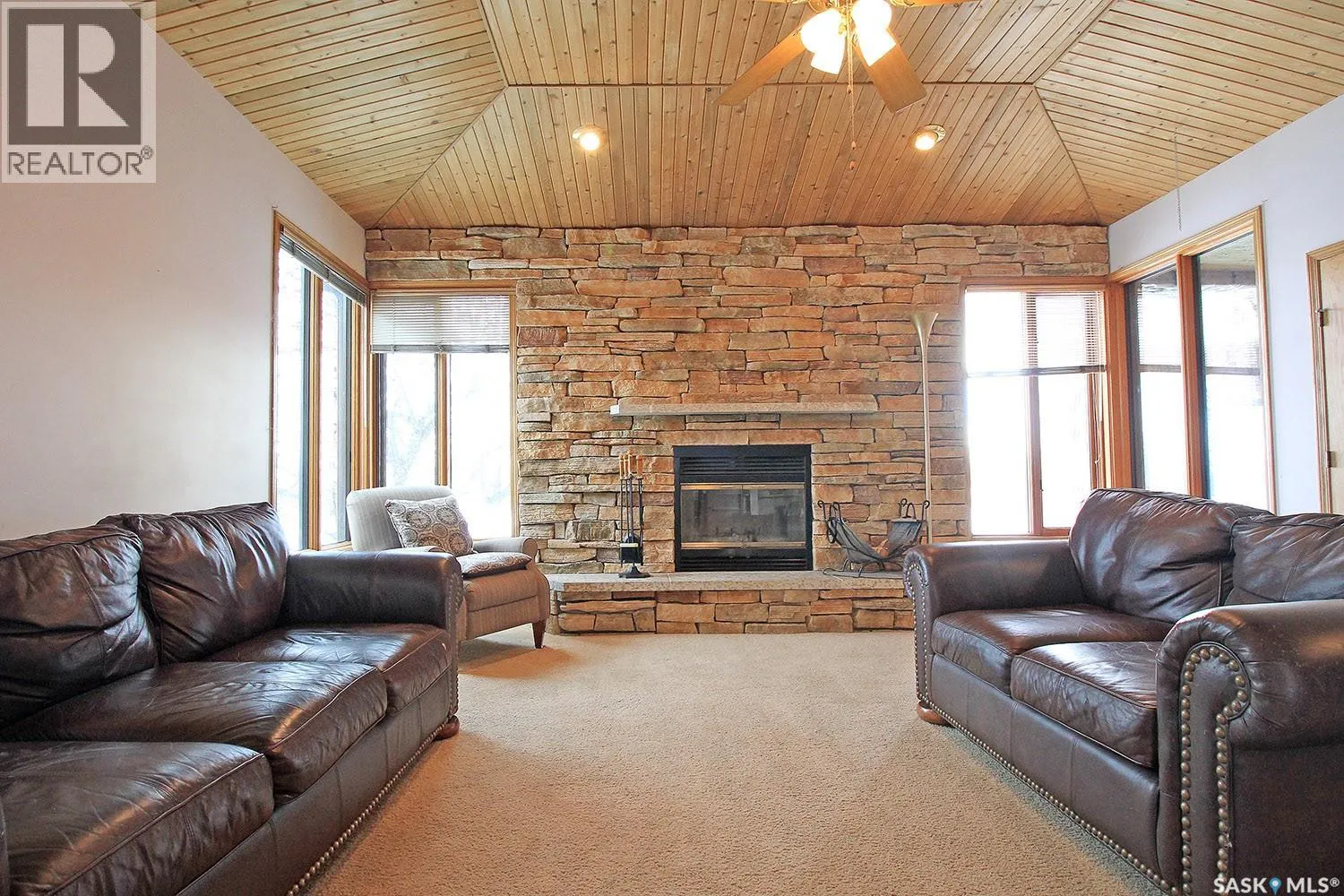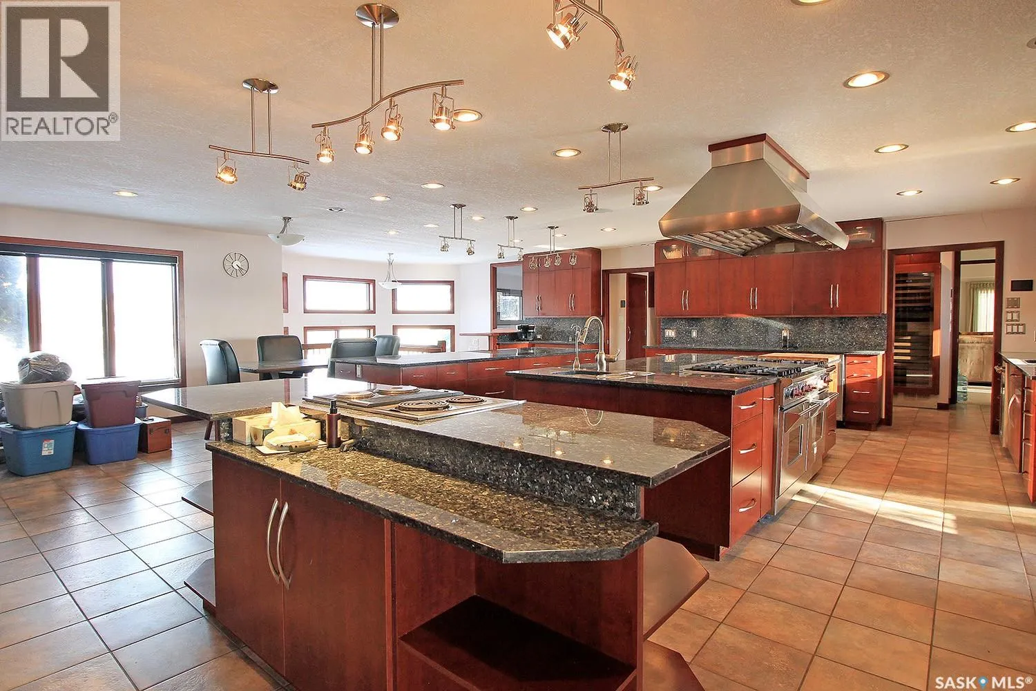 1 1/4 km south of Queen Street on York Lake Road. On the west side Located just 1 ¼ km outside of Yorkton on York Lake Road, this stunning 5,452 sq. ft. bungalow sits on 19 acres of private land. Built in 1988 with a major addition in 2005, this home is truly one of a kind, offering an abundance of space and luxury amenities. The heart of the home is its expansive Great Room, ideal for entertaining on a grand scale. With its soaring ceilings and open concept layout. The chefâs kitchen is equally impressive, featuring both electric and gas ranges, multiple dishwashers, a walk-in cooler, and three separate granite islands. Whether youâre an avid home cook or a professional chef, this kitchen offers everything needed to create incredible meals. This home features five bathrooms, ensuring convenience throughout. The fully developed basement is designed for both entertainment and wellness, featuring a theatre room with a curved full-length screen, projector, and reclining chairs with built-in sound shakers. Designed with comfort in mind, the home is equipped with three furnaces, three air conditioning units, two wood-burning fireplaces, and one gas fireplace. A Generac generator ensures the entire home remains powered when needed. The homeâs infrastructure is built for efficiency and convenience, with three utility rooms housing three electrical panels, two water heaters, a water softener, an iron filtration system, and a commercial reverse osmosis system. For music lovers, speakers are installed inside and outside the home, with touchscreens in the newer addition to control SiriusXM or personal music selections. This remarkable property offers an unparalleled combination of space, luxury, and functionality. Whether youâre looking for a private retreat, an entertainerâs paradise, or a home that can support a business venture, this estate has it all! (id:27476)
