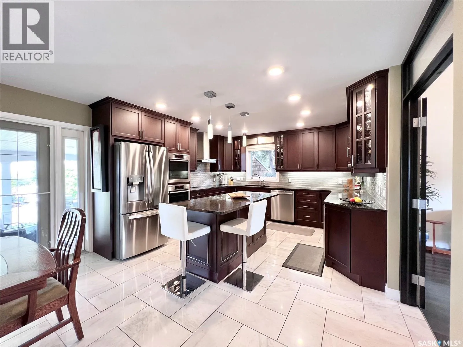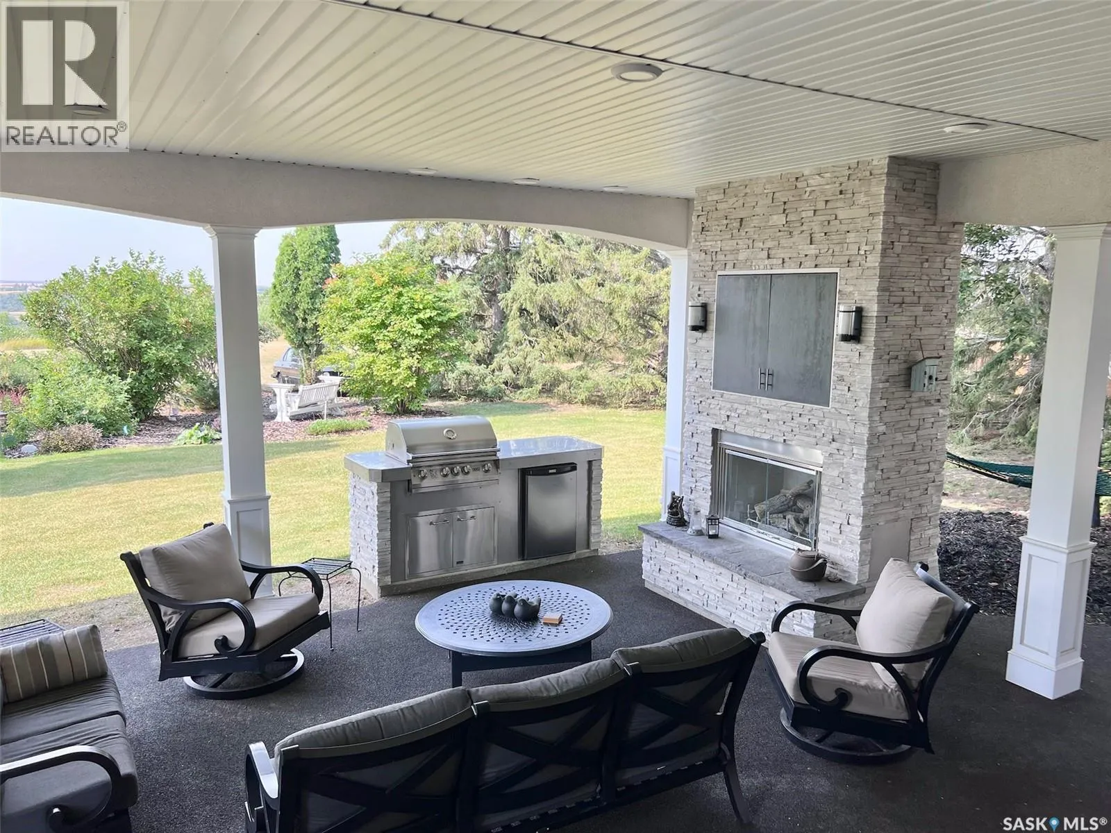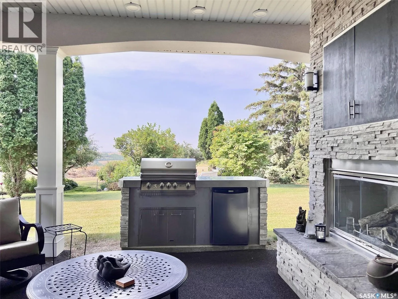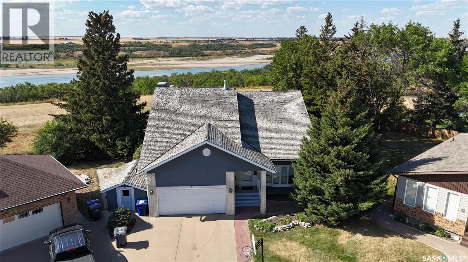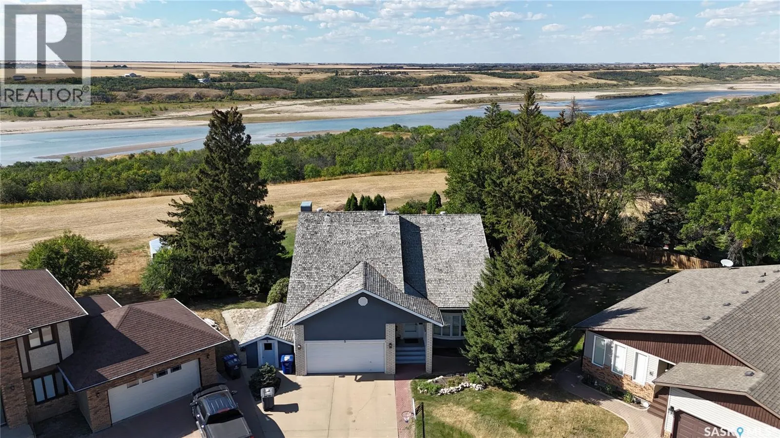 If your looking for WOW Factor this is it! Overlooking the beautiful South Saskatchewan River this home is a dream with completely renovated main level and second level and to maximize those picturesque river views! Enter into the grand foyer with stunning vaulted ceilings and statement chandelier. The kitchen is the perfect work space for any level of home chef with granite countertops, stainless steel appliances, double built-in ovens, huge island and under counter lighting. The office is just steps away with its own gas fireplace, custom built in shelves and glass moving privacy wall; working from home will feel like heaven with the greenspace and riverbank views it offers! The stunning tile floor leads around the corner to the powder room, perfect for guests to pop into and the laundry room with storage. The second level contains two generous sized spare rooms, a large 4 piece bathroom and then into the massive primary suite. In the primary suite you will get not only beautiful river views, but also a stunning 4 piece en-suite, with tub and walk-in shower, his and hers walk-in closets and dressing area. Let your hosting dreams come to life in the amazing covered patio with built-in natural gas BBQ, beer fridge, natural gas fireplace, space heaters, and TV cabinet, perfect for riders game days! Between the easy maintenance of the rubber patio and eye catching stone work, this area will fast become a family favorite hang out spot! The basement offers a large family room with the perfect games/craft room attached! With the added benefit of an extra bedroom and bathroom, this could be a great in-law suite! There is over $400,000 of recent high end upgrades like cedar shakes and lifetime metal shingles, 2 x 6 insulated walls with additional 2' of external insulation, custom woodwork and more! Get a detailed list from us! Just a short 48 minute drive to Saskatoon, 25 minutes to Lake Diefenbaker, this could be everything your family has been waiting for! (id:27476)