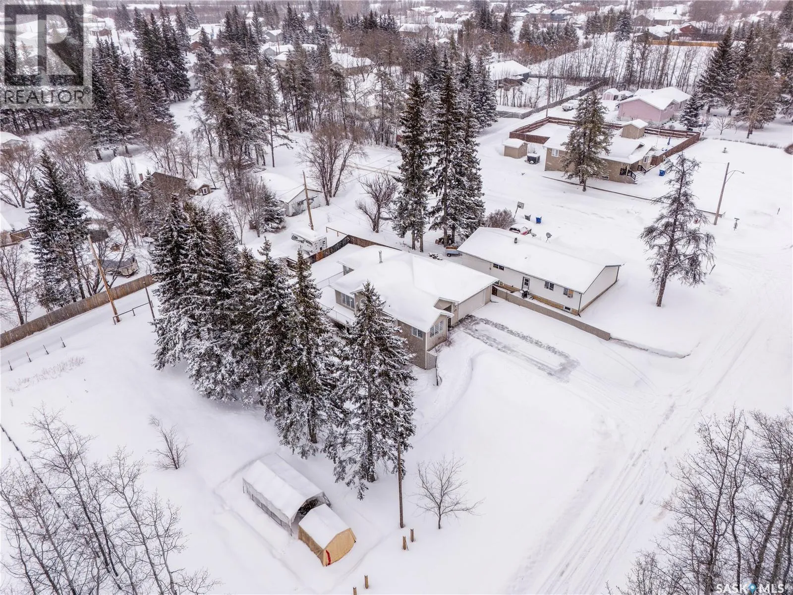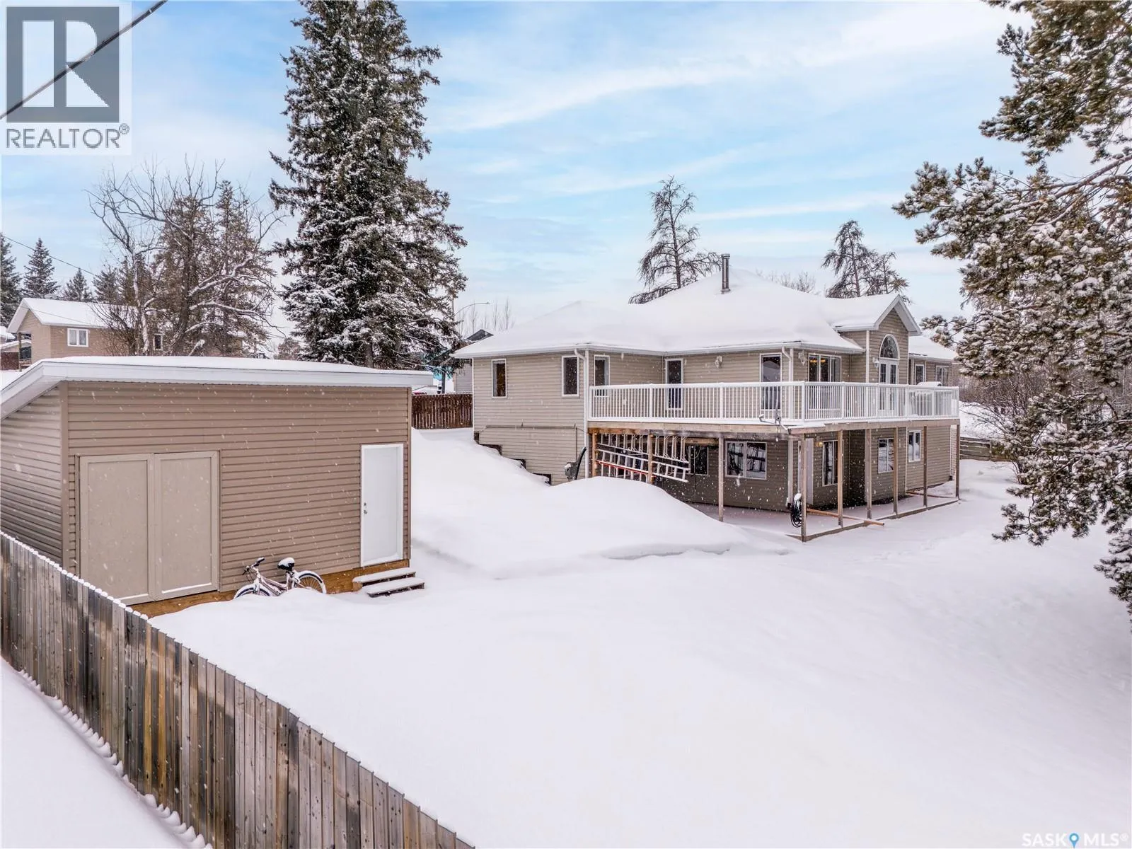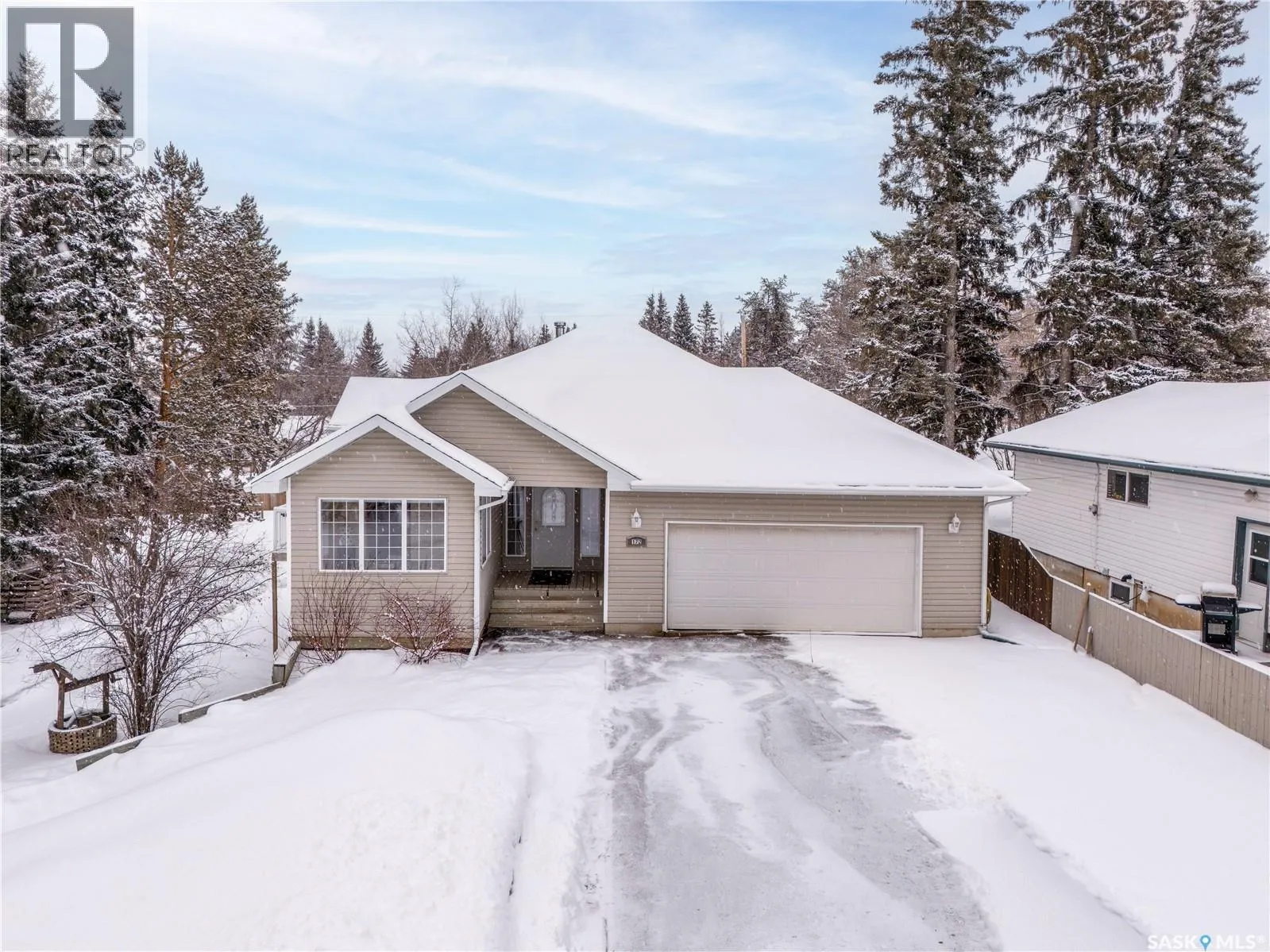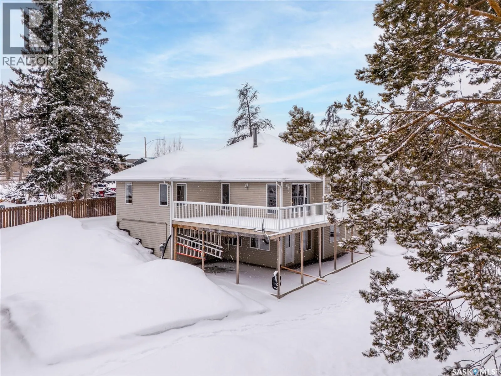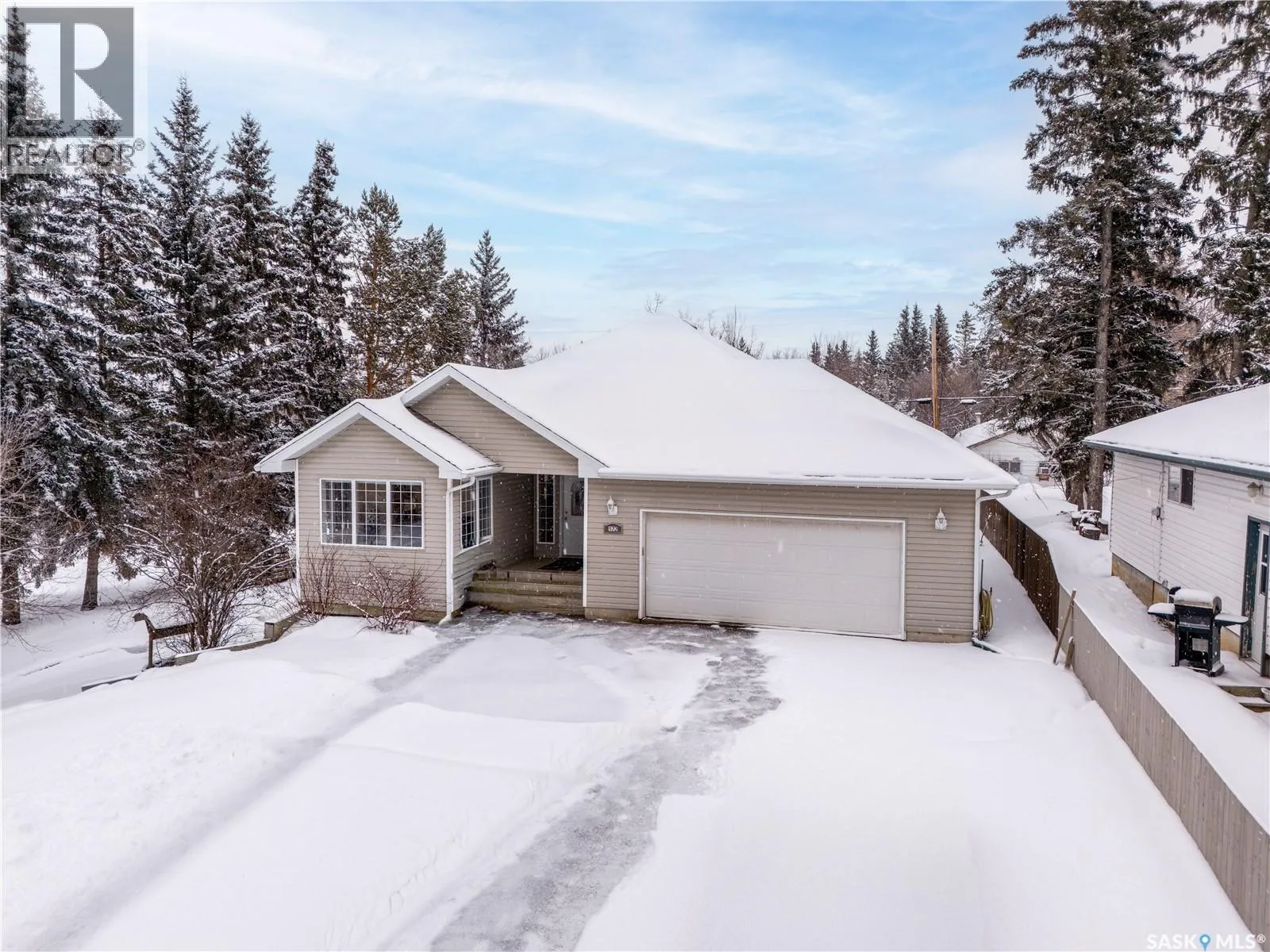 Pride of ownership is evident in this well-maintained home situated on three lots, offering four bedrooms and two bathrooms. With high vaulted ceilings and plenty of windows it fills the space with natural light and creating a bright, inviting atmosphere throughout the open-concept floor plan. The kitchen has new appliances, lots of counter space and a cozy breakfast nook. The main floor includes the primary bedroom, a second bedroom, the main bathroom, and laundry. Hardwood floors and a wood stove add warmth and character with doors that lead out to the large wraparound deck. The fully developed walkout basement provides additional living space with direct access to the backyard. Downstairs youâll find two more bedrooms, a bathroom with dual shower heads, a large rec area, and in-floor heat. The home is also equipped with hot water on demand and secondary laundry hook ups. The double attached garage is heated and includes 220V power. Outside, youâll find a garden area and a cozy fire pit area, perfect for evenings with family and friends. The property also includes a 12x18 shed, perfect size for lawn equipment and tools. This well-cared-for property offers space, comfort, and small-town living in a peaceful setting, conveniently located across from the Kâ12 school. (id:27476)