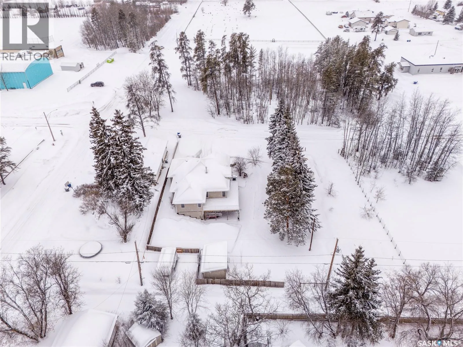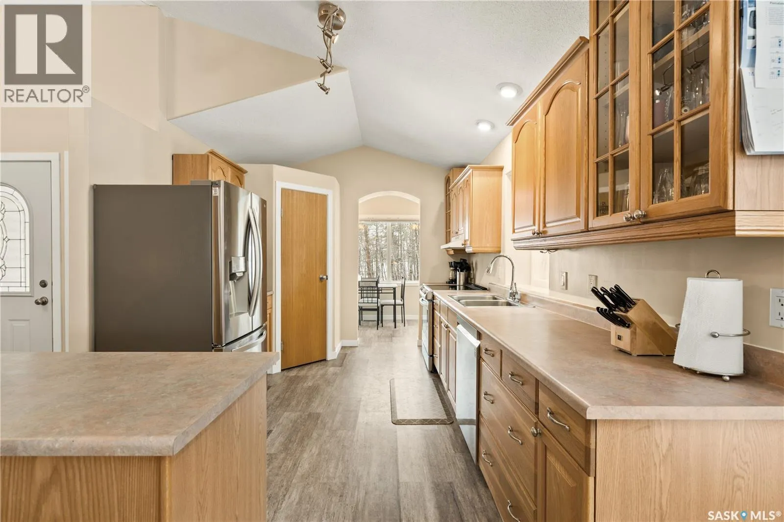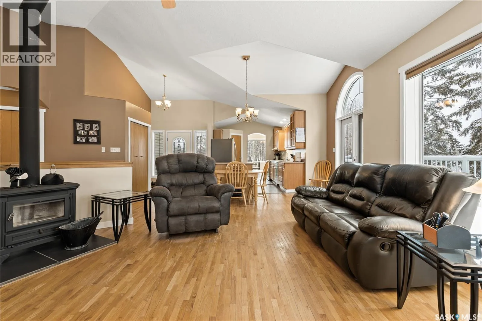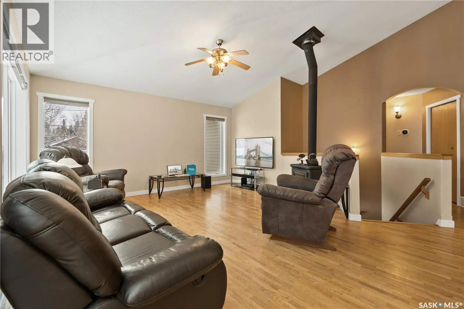 Pride of ownership is evident in this well-maintained home situated on three lots, offering four bedrooms and two bathrooms. With high vaulted ceilings and plenty of windows it fills the space with natural light and creating a bright, inviting atmosphere throughout the open-concept floor plan. The kitchen has new appliances, lots of counter space and a cozy breakfast nook. The main floor includes the primary bedroom, a second bedroom, the main bathroom, and laundry. Hardwood floors and a wood stove add warmth and character with doors that lead out to the large wraparound deck. The fully developed walkout basement provides additional living space with direct access to the backyard. Downstairs youâll find two more bedrooms, a bathroom with dual shower heads, a large rec area, and in-floor heat. The home is also equipped with hot water on demand and secondary laundry hook ups. The double attached garage is heated and includes 220V power. Outside, youâll find a garden area and a cozy fire pit area, perfect for evenings with family and friends. The property also includes a 12x18 shed, perfect size for lawn equipment and tools. This well-cared-for property offers space, comfort, and small-town living in a peaceful setting, conveniently located across from the Kâ12 school. (id:27476)