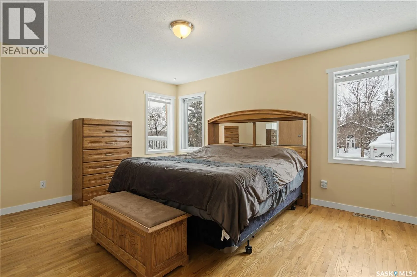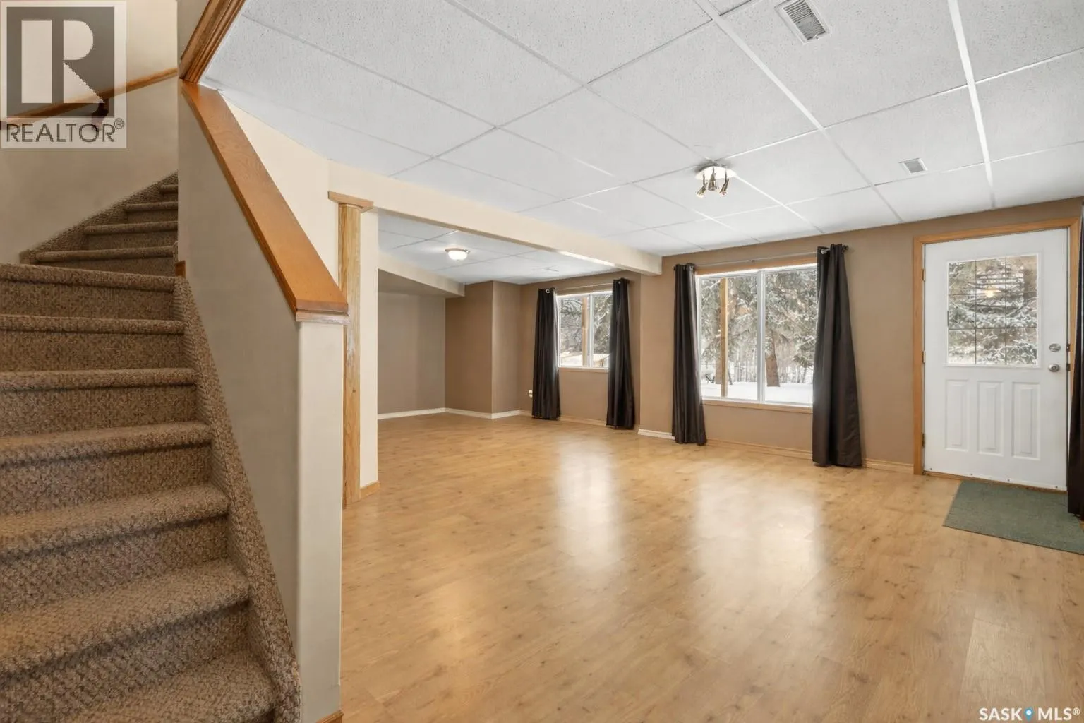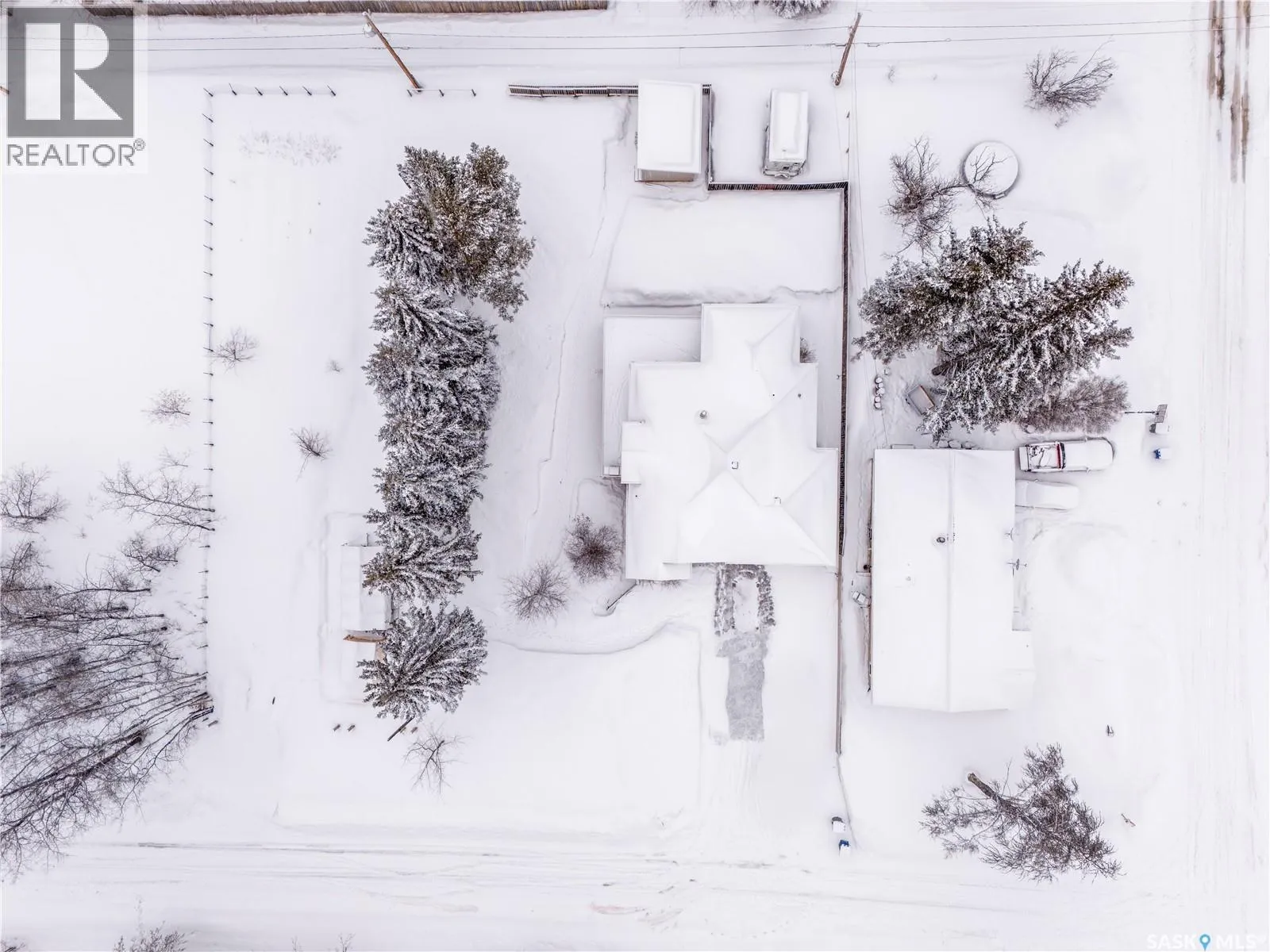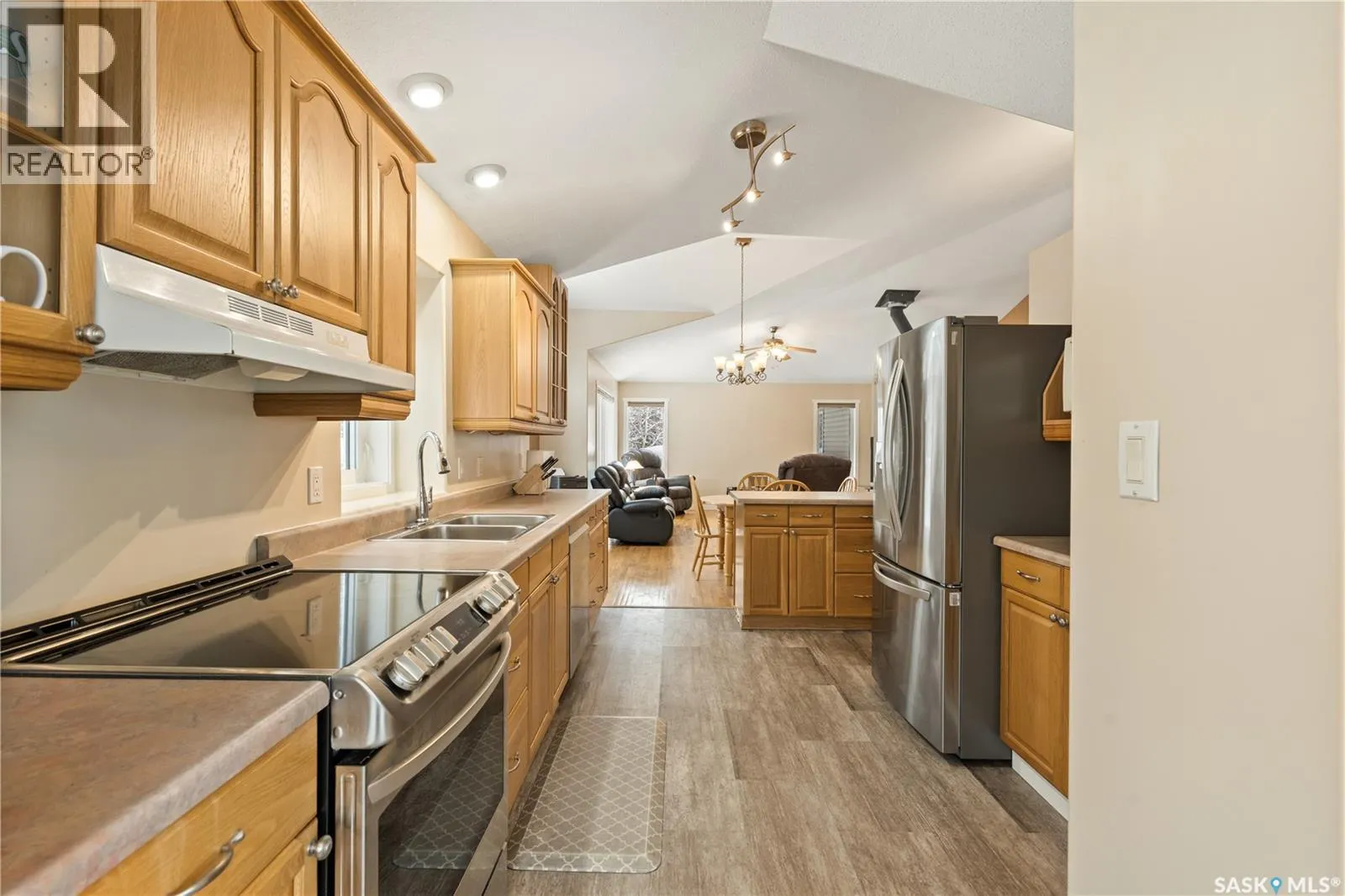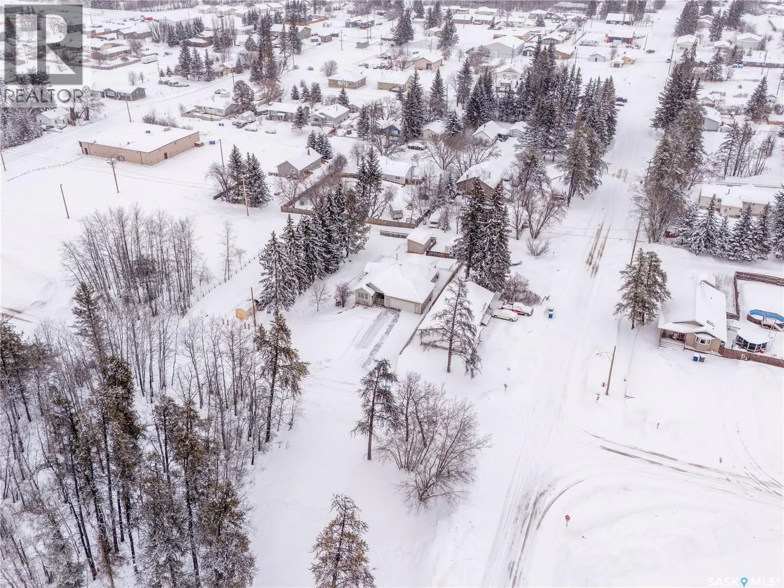 Pride of ownership is evident in this well-maintained home situated on three lots, offering four bedrooms and two bathrooms. With high vaulted ceilings and plenty of windows it fills the space with natural light and creating a bright, inviting atmosphere throughout the open-concept floor plan. The kitchen has new appliances, lots of counter space and a cozy breakfast nook. The main floor includes the primary bedroom, a second bedroom, the main bathroom, and laundry. Hardwood floors and a wood stove add warmth and character with doors that lead out to the large wraparound deck. The fully developed walkout basement provides additional living space with direct access to the backyard. Downstairs youâll find two more bedrooms, a bathroom with dual shower heads, a large rec area, and in-floor heat. The home is also equipped with hot water on demand and secondary laundry hook ups. The double attached garage is heated and includes 220V power. Outside, youâll find a garden area and a cozy fire pit area, perfect for evenings with family and friends. The property also includes a 12x18 shed, perfect size for lawn equipment and tools. This well-cared-for property offers space, comfort, and small-town living in a peaceful setting, conveniently located across from the Kâ12 school. (id:27476)