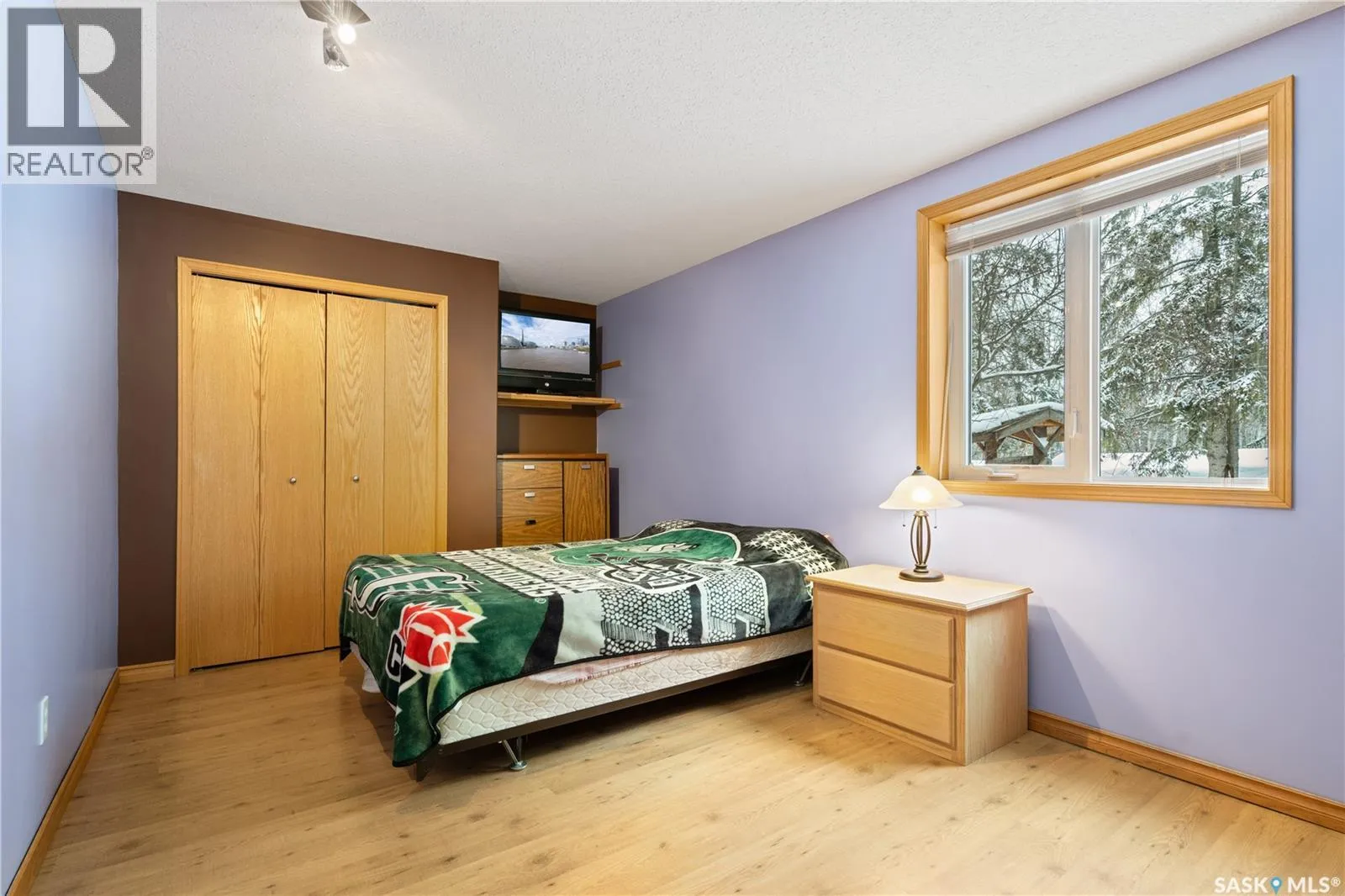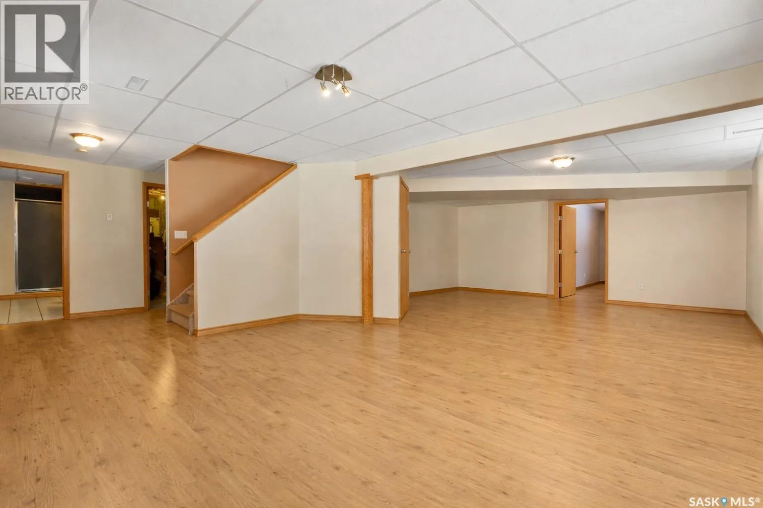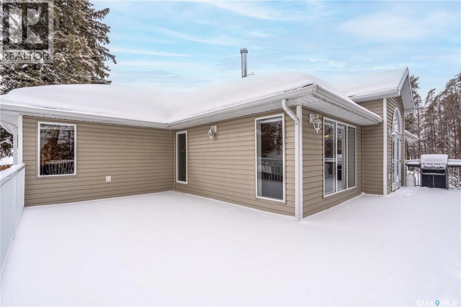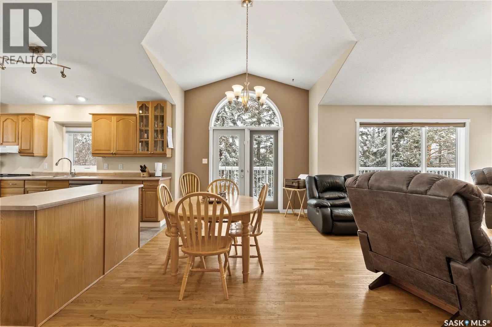 Pride of ownership is evident in this well-maintained home situated on three lots, offering four bedrooms and two bathrooms. With high vaulted ceilings and plenty of windows it fills the space with natural light and creating a bright, inviting atmosphere throughout the open-concept floor plan. The kitchen has new appliances, lots of counter space and a cozy breakfast nook. The main floor includes the primary bedroom, a second bedroom, the main bathroom, and laundry. Hardwood floors and a wood stove add warmth and character with doors that lead out to the large wraparound deck. The fully developed walkout basement provides additional living space with direct access to the backyard. Downstairs youâll find two more bedrooms, a bathroom with dual shower heads, a large rec area, and in-floor heat. The home is also equipped with hot water on demand and secondary laundry hook ups. The double attached garage is heated and includes 220V power. Outside, youâll find a garden area and a cozy fire pit area, perfect for evenings with family and friends. The property also includes a 12x18 shed, perfect size for lawn equipment and tools. This well-cared-for property offers space, comfort, and small-town living in a peaceful setting, conveniently located across from the Kâ12 school. (id:27476)