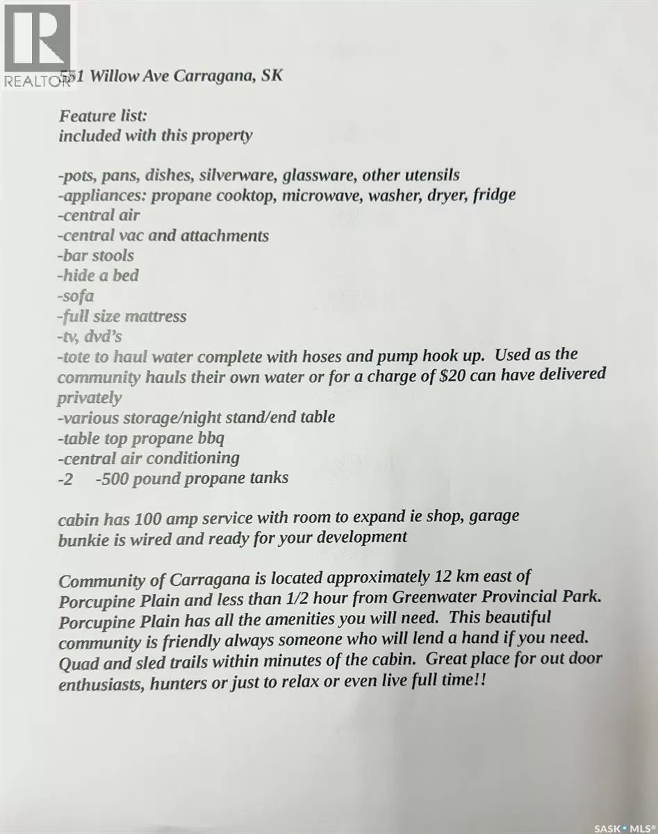 contact listing agent Welcome to 551 Willow Ave in Carragana, SK! This well-designed 460 sq ft, four-season cabin offers year-round comfort including running water (hauled from Porcupine Plain water station included in the sale is the tote, hoses and pump) and sewer. Inside, you'll find essential appliances, including a propane cooktop, microwave, washer, dryer, refrigerator. All kitchen essentialsâutensils, dishes, pots, and pansâare included. A tabletop propane BBQ is ready for use, with a separate tank or cabin hookup. The living room features a leather sofa and hide-a-bed. Oak cabinets offer plenty of storage space. Cabin is linoleum flooring from front to back for easy maintenance. Loads of natural light fills the space through excellent windows. The main bedroom offers a full/double bed with storage. The three-piece bathroom has a walk-in shower. Additional features include central vacuum, air conditioning, and a second bathroom with outside access, currently used for storage but easily convertible into another bedroom or two-piece bath. The property holds endless potentialâconsider a rooftop deck, expanded entrance deck, or additional structures to enhance your retreat. A 10x15 wired âBunkieâ is ready for development, perfect for extra sleeping space or storage. Utilities include two 500 lb propane tanks for heat, stove fuel, and hot water. Monthly power averages $25, annual taxes are $431, and winter propane costs around $300. The 100-amp electrical service allows expansion for a garage, shop, or future upgrades. Ideal for hunters and outdoor enthusiasts, this cabin sits near groomed trails for quadding and snowmobiling, surrounded by breathtaking scenery, ample wildlife, and pure serenity. Wild raspberries and asparagus grow around the lot. Located just 12 km from Porcupine Plain. This cabin is your perfect seasonal escape or full-time home! Call today to setup your appointment to view!! (id:27476)