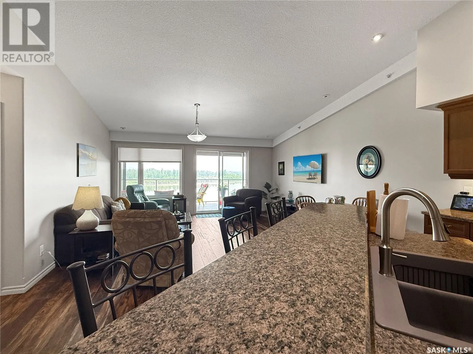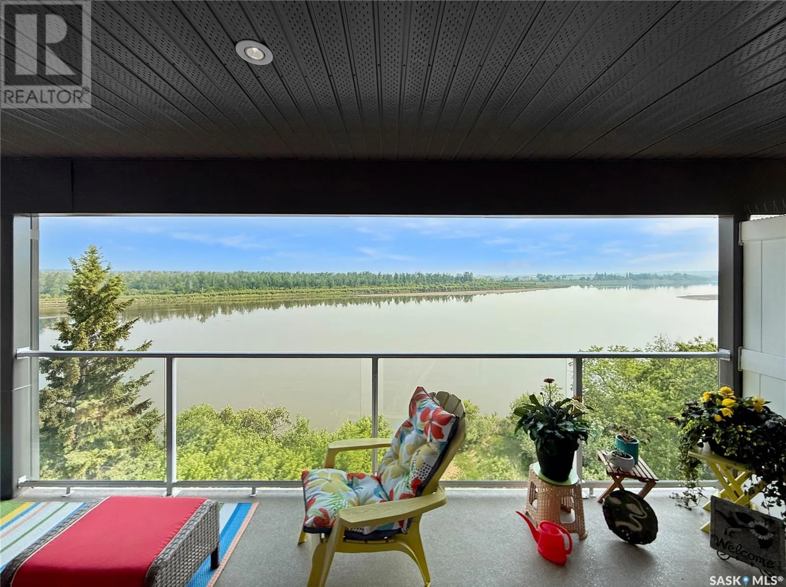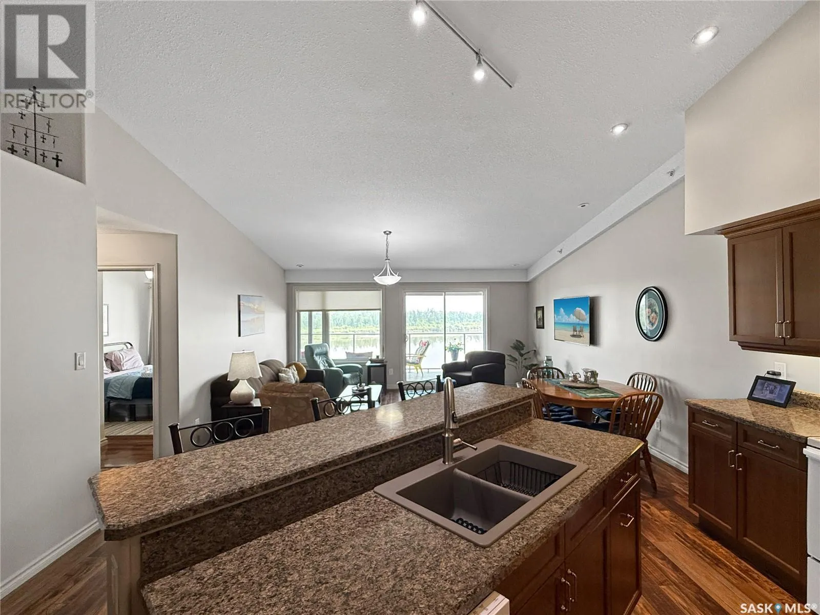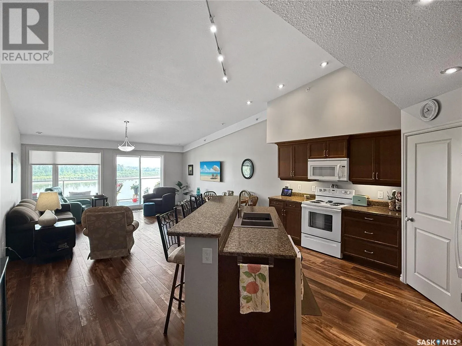 RIVERVIEW!! Welcome to this beautifully TOP Floor condo nestled in the sought-after River's Edge development. Enjoy breathtaking views of the river from your private, oversized covered balconyâperfect for relaxing or entertaining, complete with a convenient natural gas BBQ hookup. Inside, the open-concept layout is highlighted by soaring vaulted ceilings that create a spacious, airy atmosphere. The living and dining areas flow seamlessly, with 2 bathrooms, making the space both functional and inviting. The well-equipped kitchen features modern finishes, ample cabinetry, and a layout designed for effortless meal preparation. Both bedrooms are generously sized, with the primary suite offering a private ensuite bathroom. The second full bathroom adds flexibility for guests or family. A large laundry room offers exceptional convenience and comes with abundant storage spaceâideal for keeping your home organized and clutter-free. This condo comes with two dedicated parking spotsâone secure underground stall and one above-ground space, offering convenience and flexibility for you and your guests. Donât miss the opportunity to own this rare riverfront gem, combining low-maintenance living with incredible views, practical features, and an unbeatable location in a well-maintained community. (id:27476)