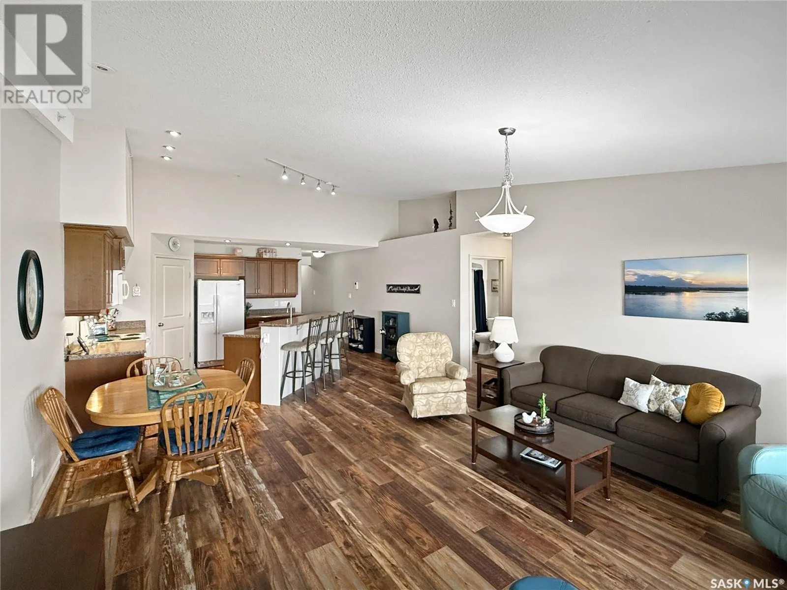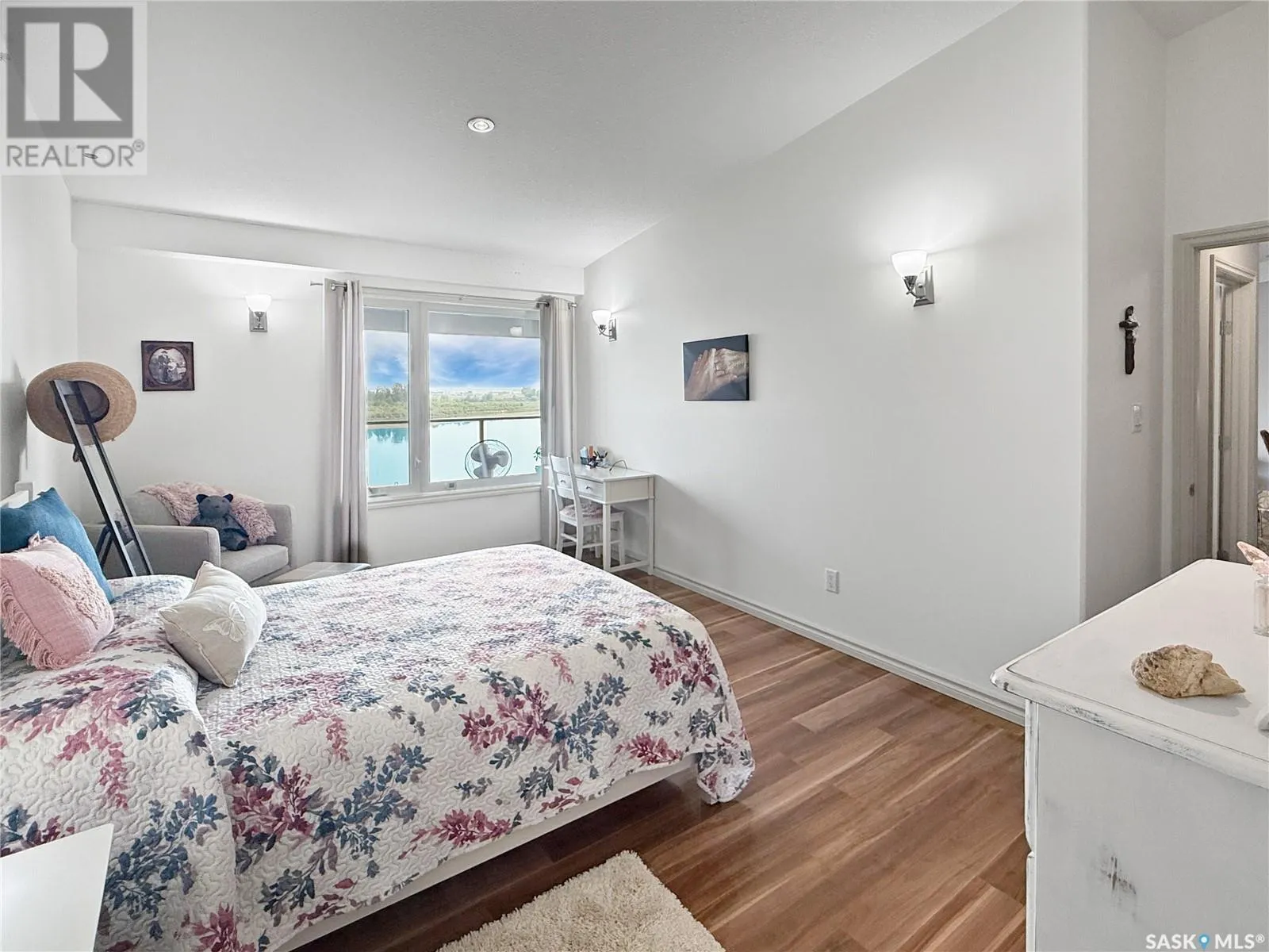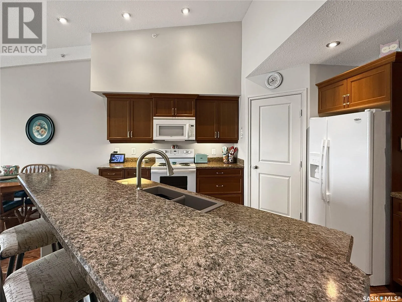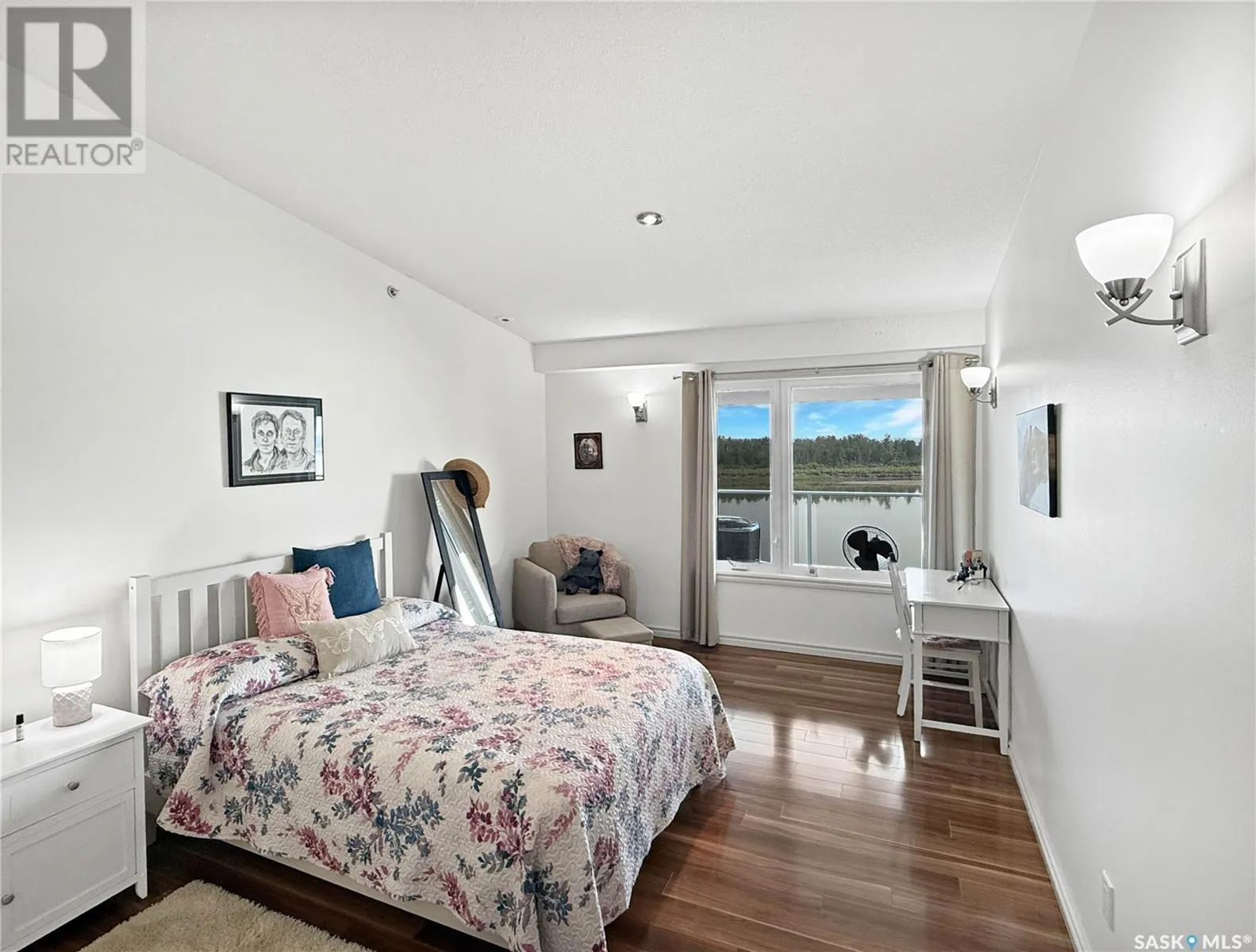 RIVERVIEW!! Welcome to this beautifully TOP Floor condo nestled in the sought-after River's Edge development. Enjoy breathtaking views of the river from your private, oversized covered balconyâperfect for relaxing or entertaining, complete with a convenient natural gas BBQ hookup. Inside, the open-concept layout is highlighted by soaring vaulted ceilings that create a spacious, airy atmosphere. The living and dining areas flow seamlessly, with 2 bathrooms, making the space both functional and inviting. The well-equipped kitchen features modern finishes, ample cabinetry, and a layout designed for effortless meal preparation. Both bedrooms are generously sized, with the primary suite offering a private ensuite bathroom. The second full bathroom adds flexibility for guests or family. A large laundry room offers exceptional convenience and comes with abundant storage spaceâideal for keeping your home organized and clutter-free. This condo comes with two dedicated parking spotsâone secure underground stall and one above-ground space, offering convenience and flexibility for you and your guests. Donât miss the opportunity to own this rare riverfront gem, combining low-maintenance living with incredible views, practical features, and an unbeatable location in a well-maintained community. (id:27476)