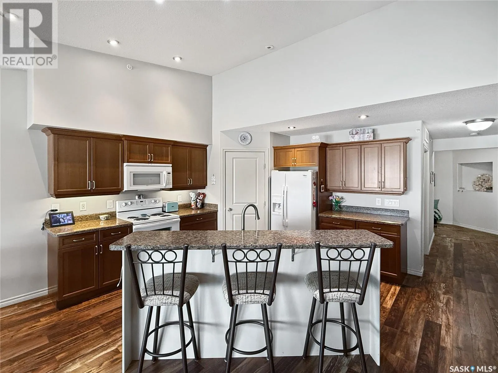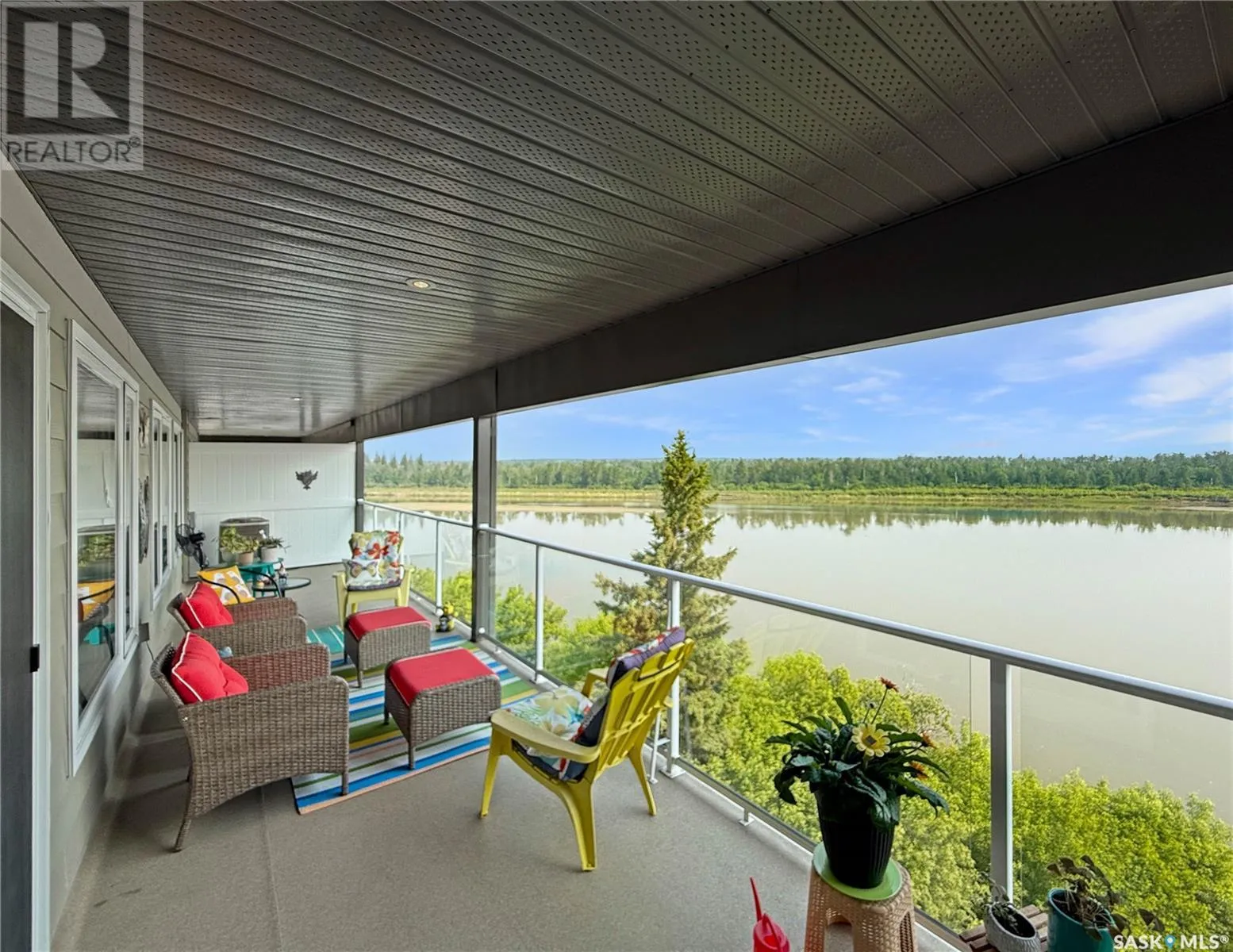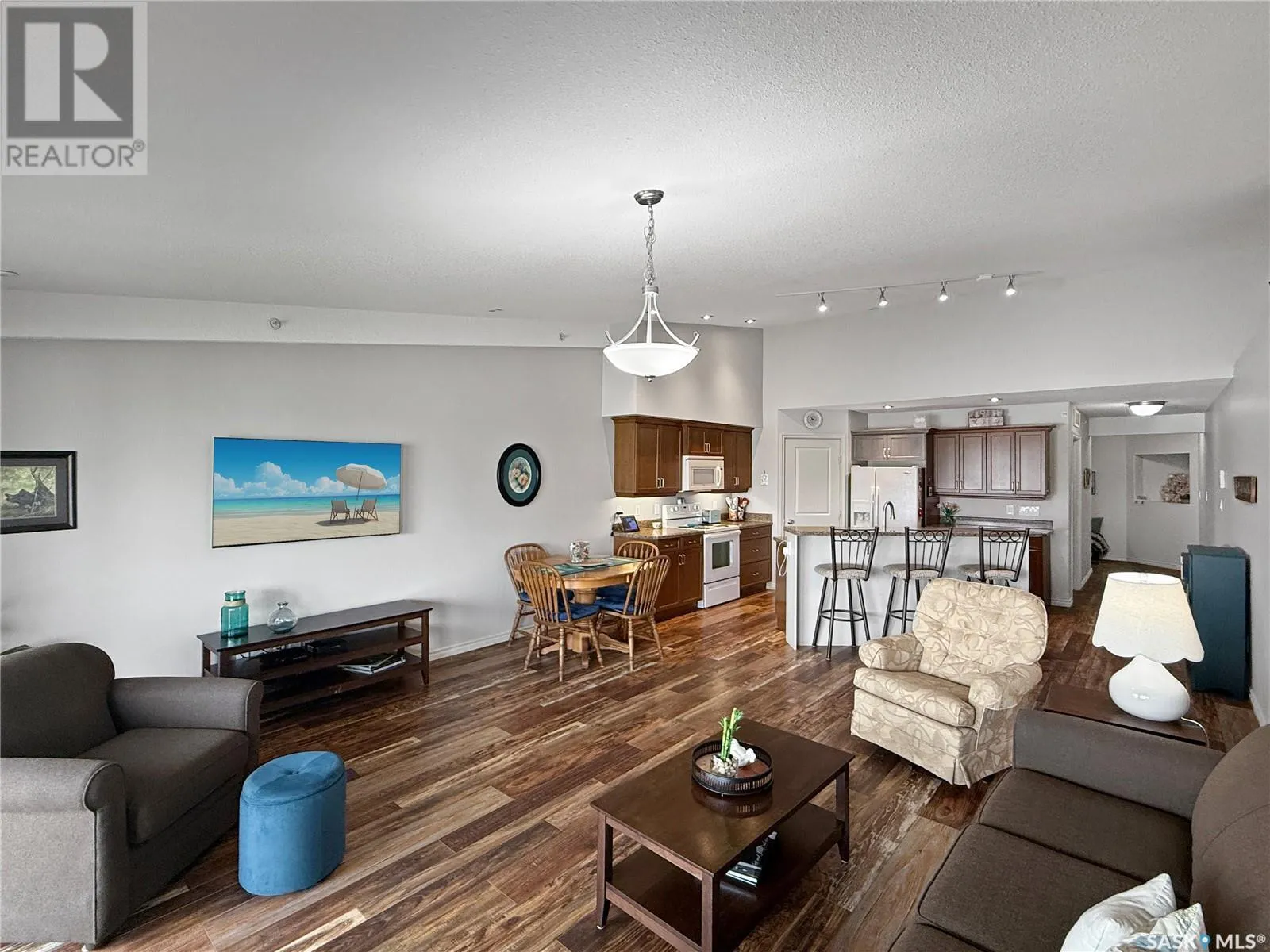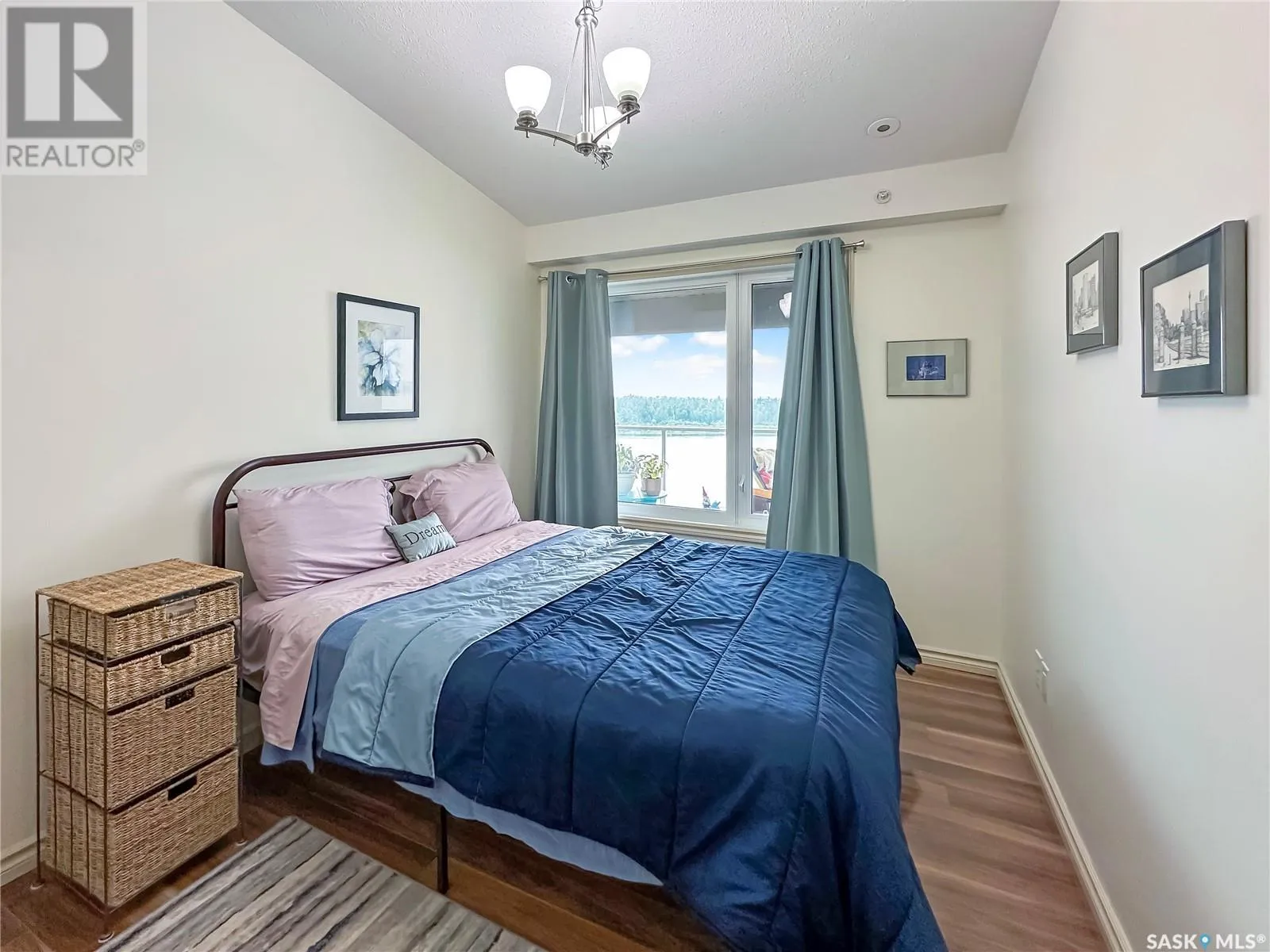 RIVERVIEW!! Welcome to this beautifully TOP Floor condo nestled in the sought-after River's Edge development. Enjoy breathtaking views of the river from your private, oversized covered balconyâperfect for relaxing or entertaining, complete with a convenient natural gas BBQ hookup. Inside, the open-concept layout is highlighted by soaring vaulted ceilings that create a spacious, airy atmosphere. The living and dining areas flow seamlessly, with 2 bathrooms, making the space both functional and inviting. The well-equipped kitchen features modern finishes, ample cabinetry, and a layout designed for effortless meal preparation. Both bedrooms are generously sized, with the primary suite offering a private ensuite bathroom. The second full bathroom adds flexibility for guests or family. A large laundry room offers exceptional convenience and comes with abundant storage spaceâideal for keeping your home organized and clutter-free. This condo comes with two dedicated parking spotsâone secure underground stall and one above-ground space, offering convenience and flexibility for you and your guests. Donât miss the opportunity to own this rare riverfront gem, combining low-maintenance living with incredible views, practical features, and an unbeatable location in a well-maintained community. (id:27476)