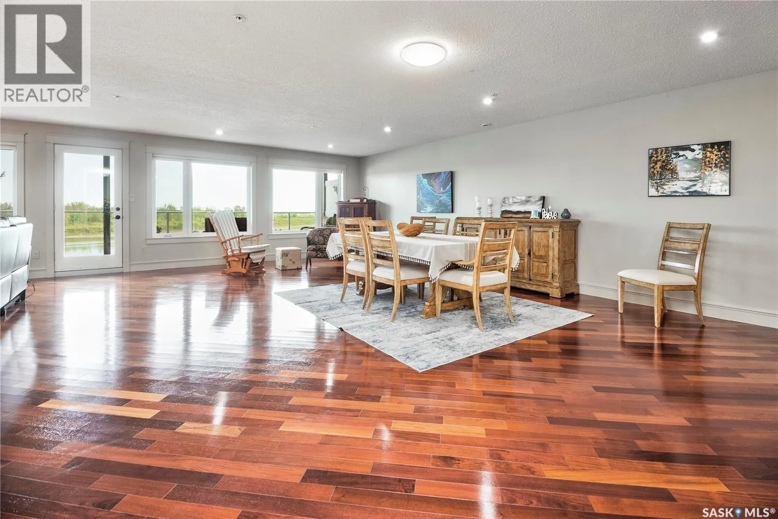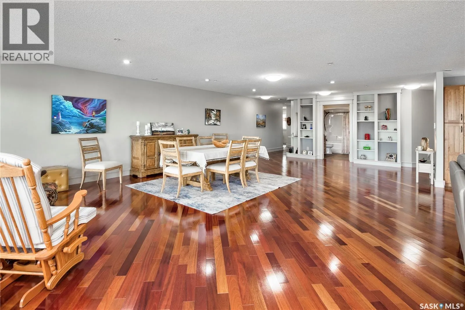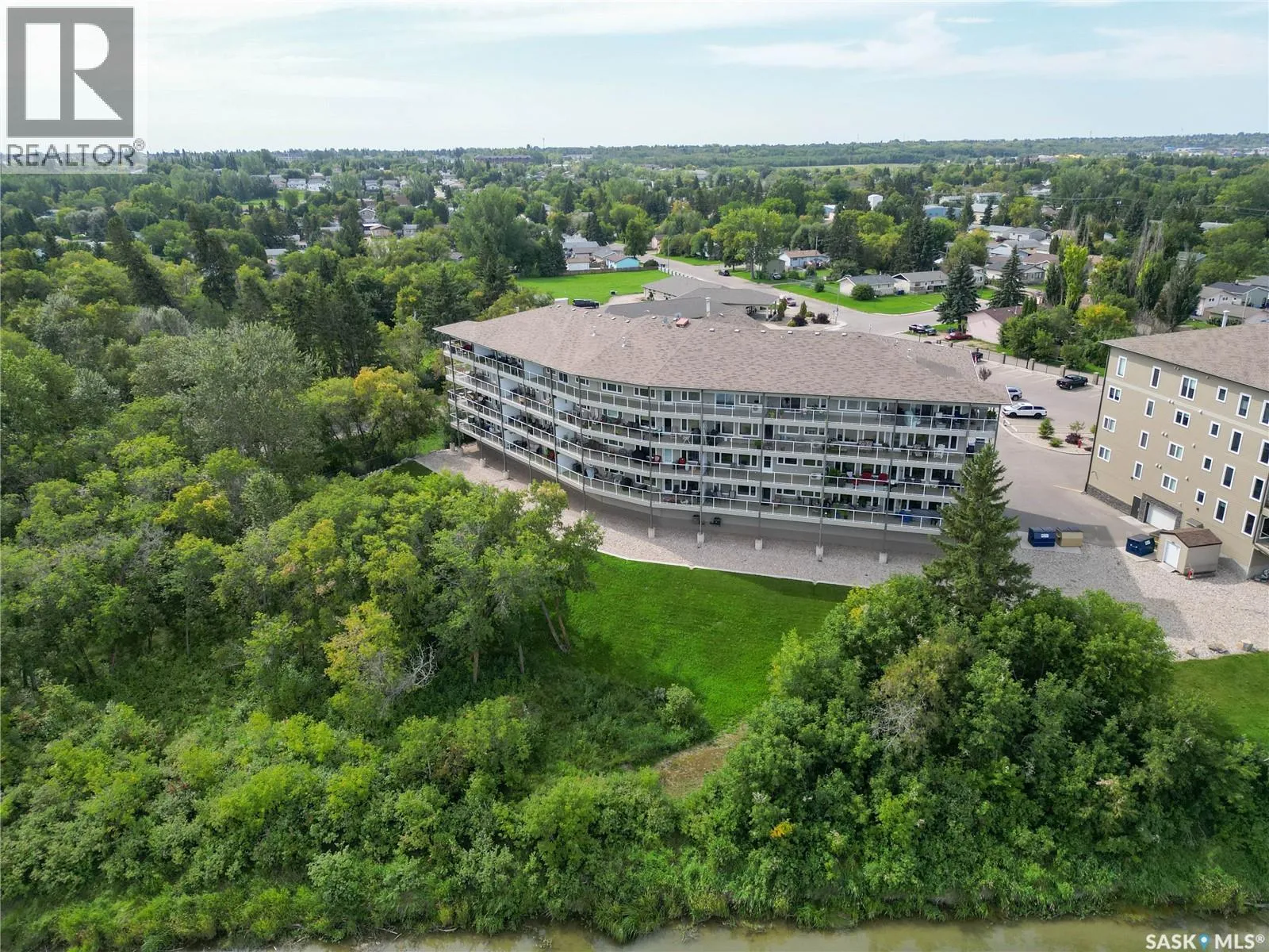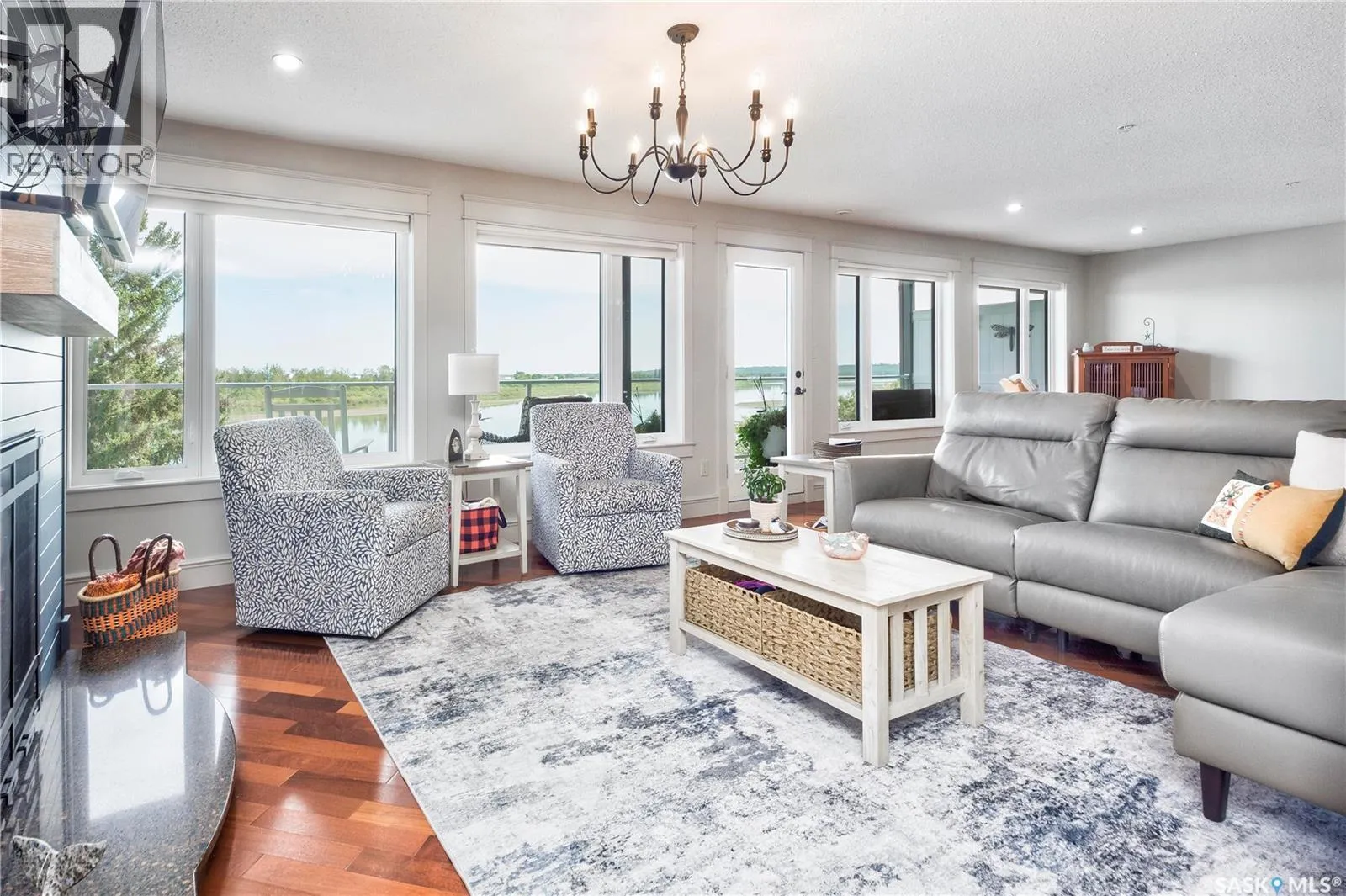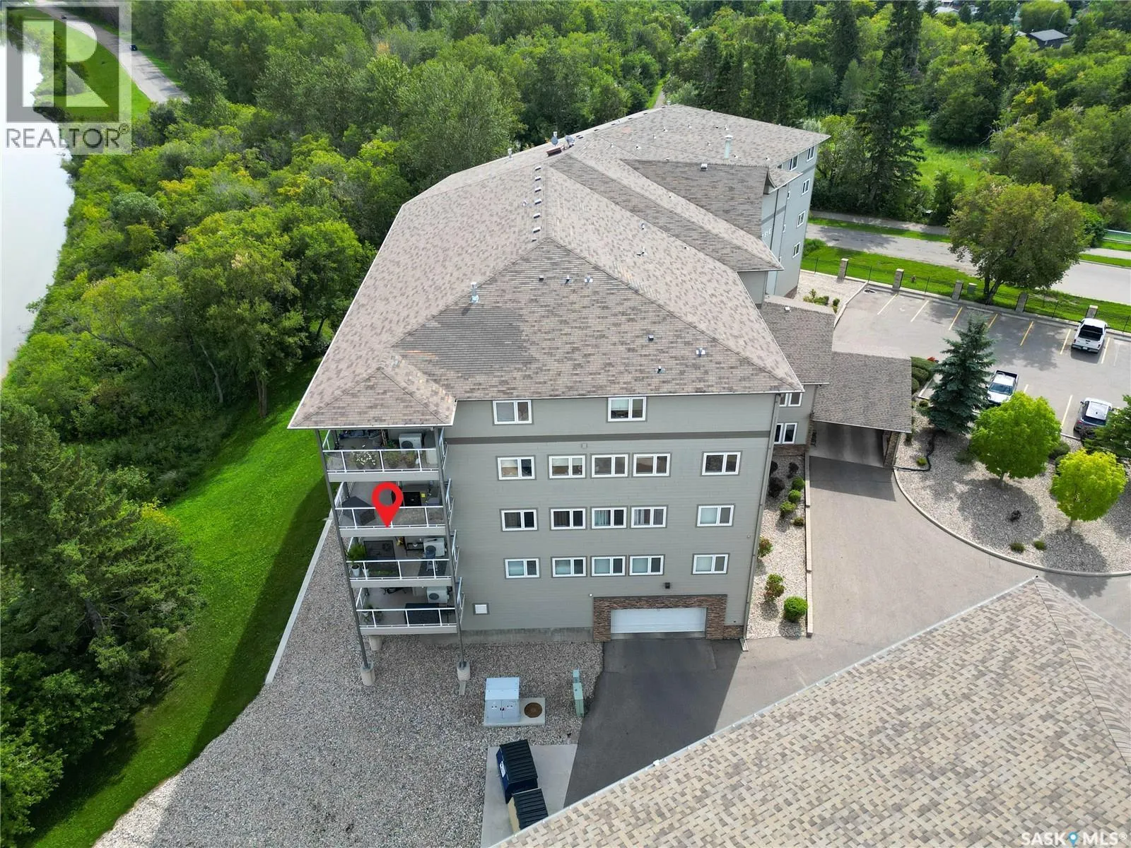 Experience elevated riverfront living in this exceptional third-floor corner condominium, offering 2,000 sq. ft. of luxurious space with some of the finest views in Prince Albert. Northeast facing, this home captures both sunrise and sunset, best enjoyed from the oversized wraparound balcony overlooking the North Saskatchewan River and Rotary Trail. The thoughtfully designed interior features a grand open-concept living and dining area, perfectly suited for entertaining or quiet evenings at home. A chefâs kitchen anchors the space with granite countertops, custom cherry cabinetry and an abundance of workspace. Brazilian cherry hardwood flooring flows seamlessly throughout, complemented by tile in the bathrooms, foyer, and laundry room. The private primary suite offers a spa-inspired ensuite and an impressive walk-in closet. Upgraded LED lighting and included heat provide both efficiency and comfort year-round. This exclusive building also offers exceptional amenities, including one in-building heated parking stall and one exterior stall, a generous common area with kitchenette and pool table, plus an exercise room for active living. With direct access to the riverbank and Rotary Trail, this residence blends natural beauty with modern eleganceâan extraordinary opportunity to own one of Prince Albertâs most desirable riverfront condominiums. Recent upgrades from 2022-2023 include a new fridge, dishwasher, air conditioner, microwave fan, washer, dryer, and freezer. (id:27476)