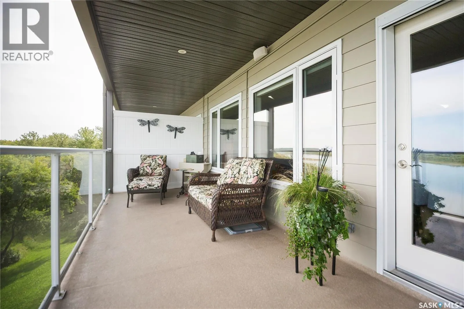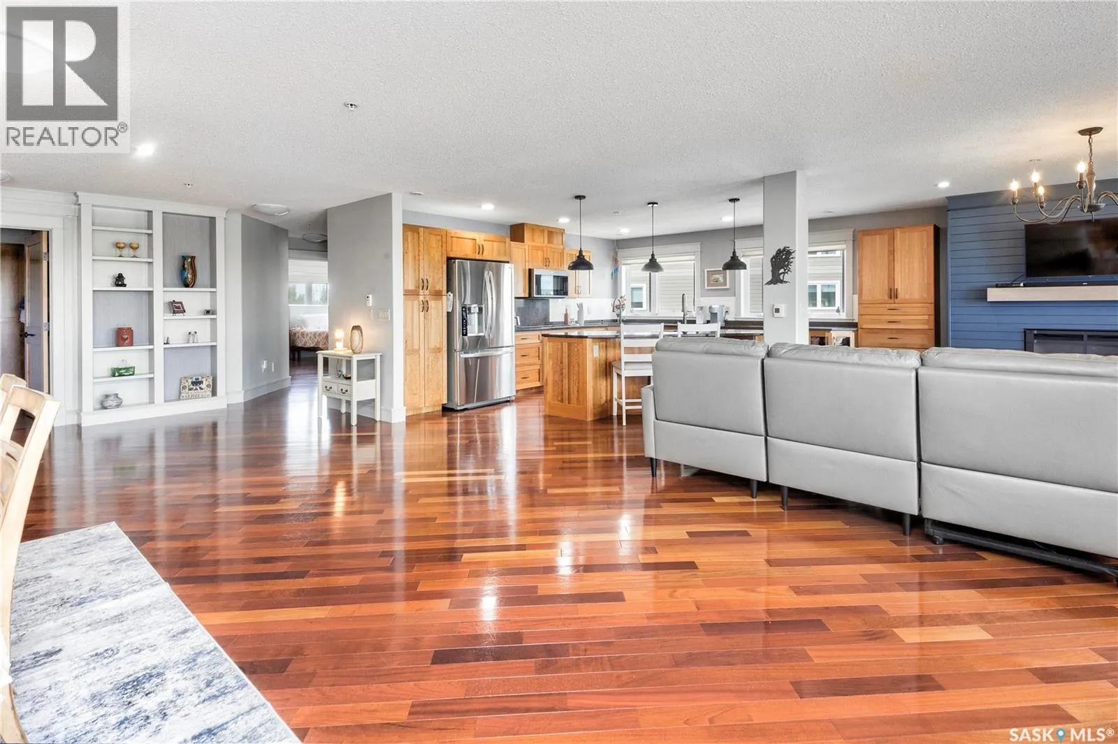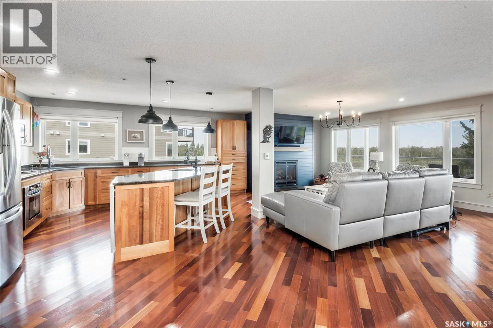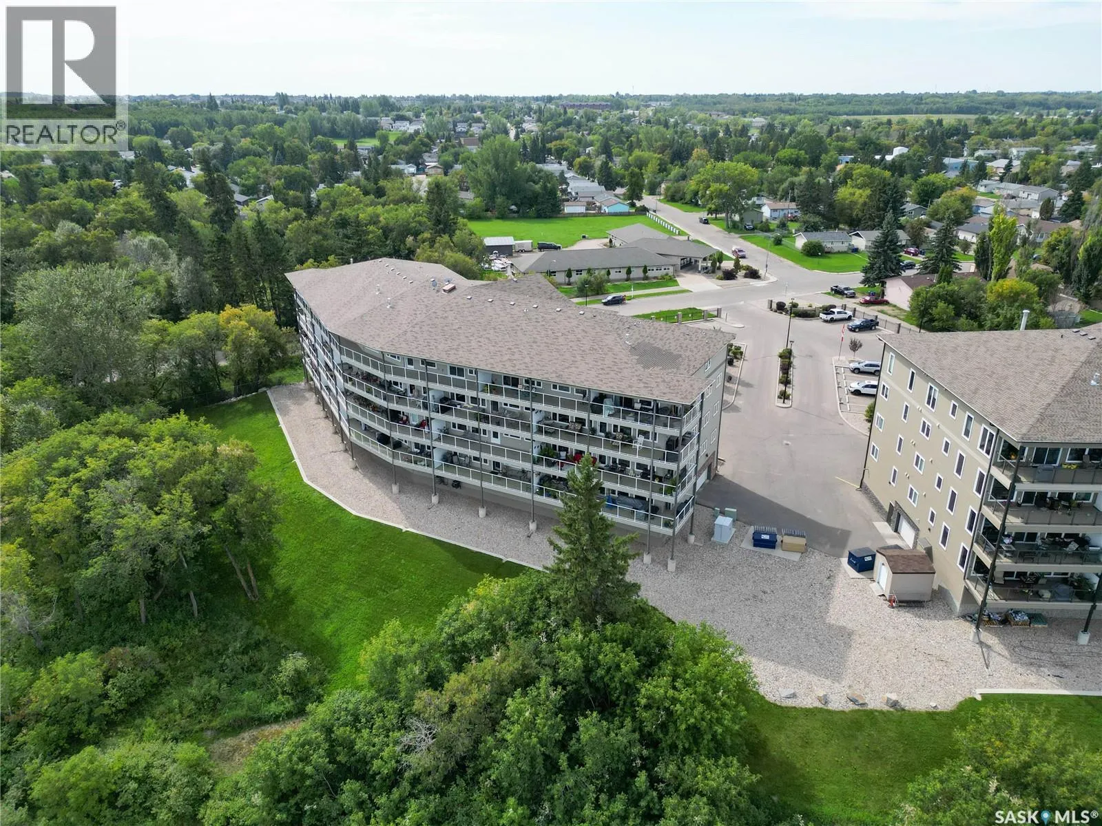 Experience elevated riverfront living in this exceptional third-floor corner condominium, offering 2,000 sq. ft. of luxurious space with some of the finest views in Prince Albert. Northeast facing, this home captures both sunrise and sunset, best enjoyed from the oversized wraparound balcony overlooking the North Saskatchewan River and Rotary Trail. The thoughtfully designed interior features a grand open-concept living and dining area, perfectly suited for entertaining or quiet evenings at home. A chefâs kitchen anchors the space with granite countertops, custom cherry cabinetry and an abundance of workspace. Brazilian cherry hardwood flooring flows seamlessly throughout, complemented by tile in the bathrooms, foyer, and laundry room. The private primary suite offers a spa-inspired ensuite and an impressive walk-in closet. Upgraded LED lighting and included heat provide both efficiency and comfort year-round. This exclusive building also offers exceptional amenities, including one in-building heated parking stall and one exterior stall, a generous common area with kitchenette and pool table, plus an exercise room for active living. With direct access to the riverbank and Rotary Trail, this residence blends natural beauty with modern eleganceâan extraordinary opportunity to own one of Prince Albertâs most desirable riverfront condominiums. Recent upgrades from 2022-2023 include a new fridge, dishwasher, air conditioner, microwave fan, washer, dryer, and freezer. (id:27476)