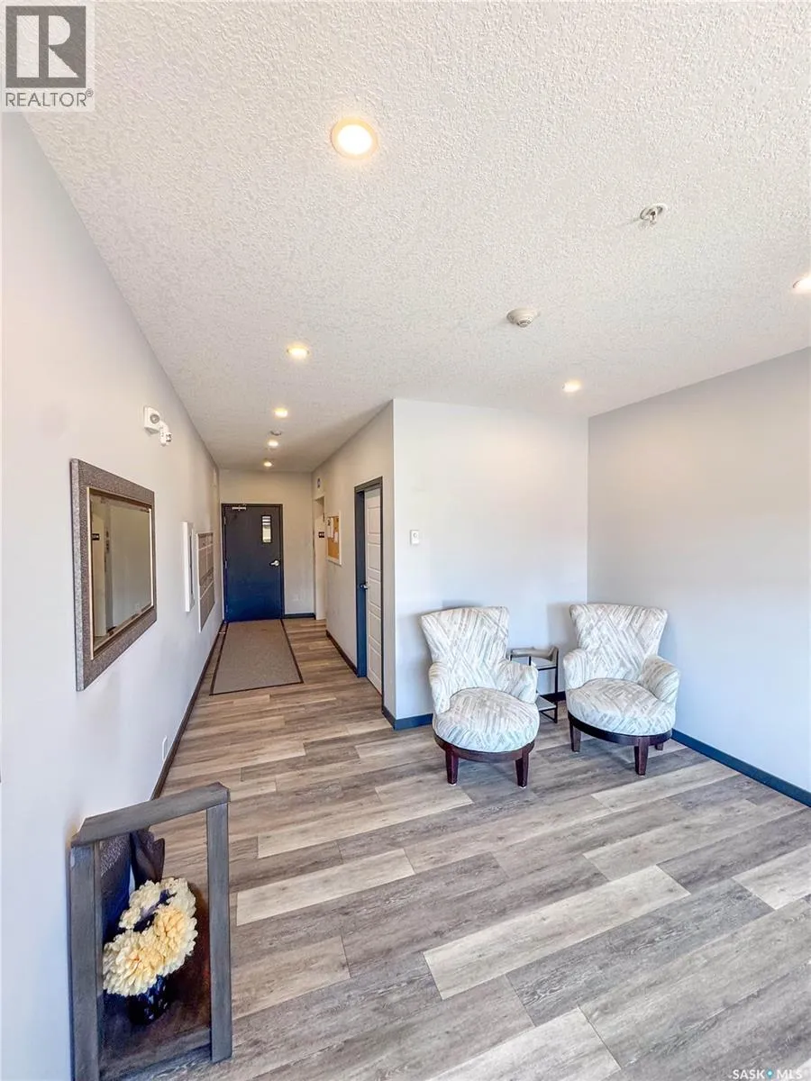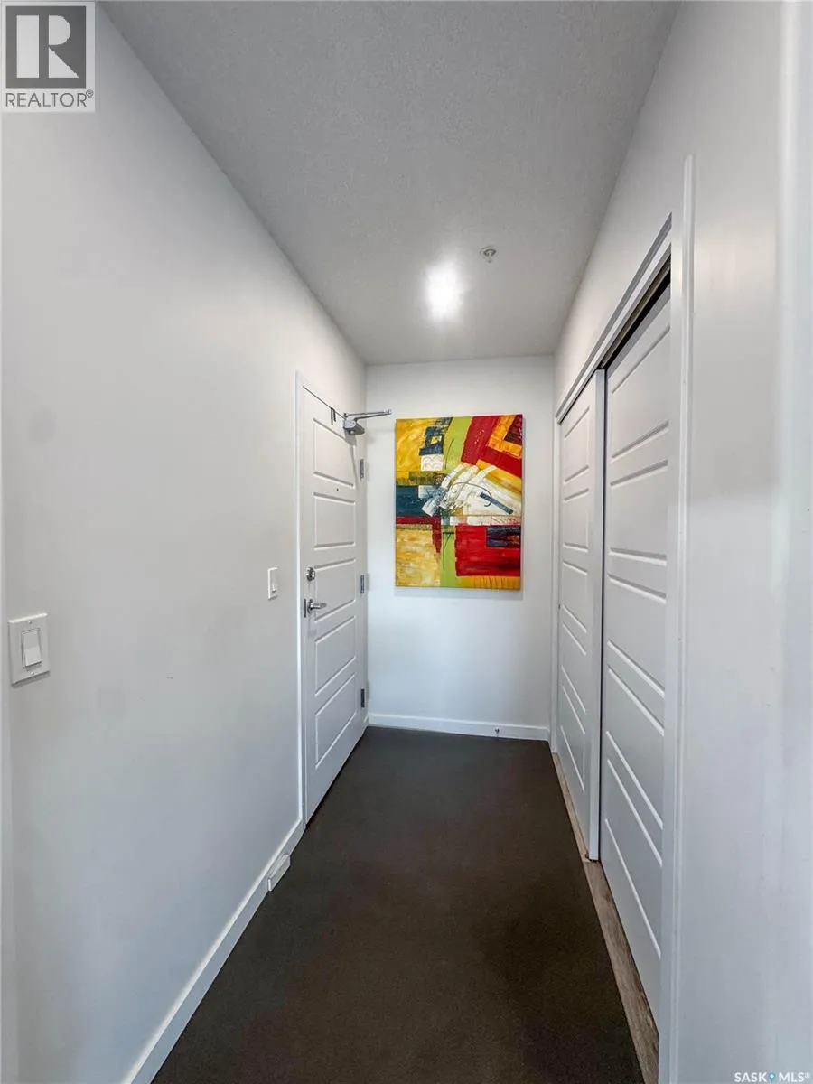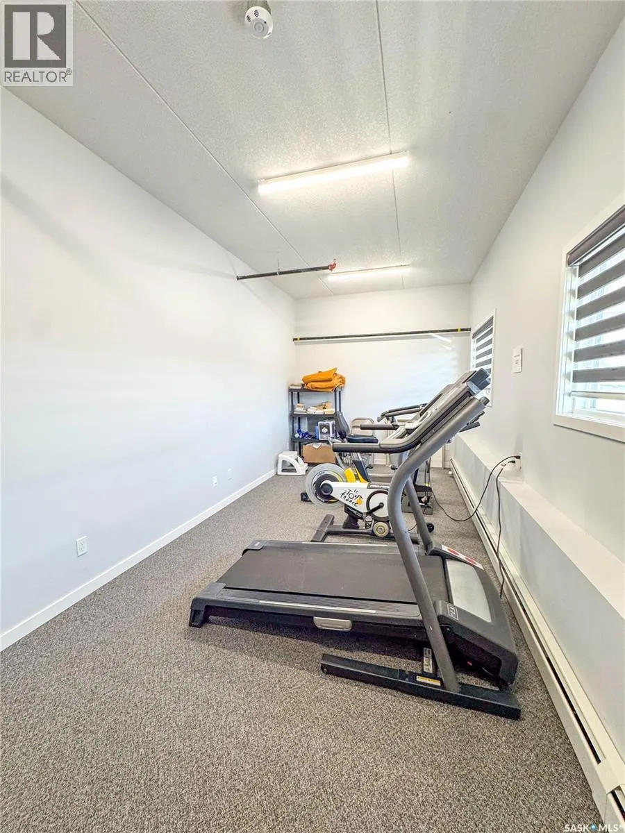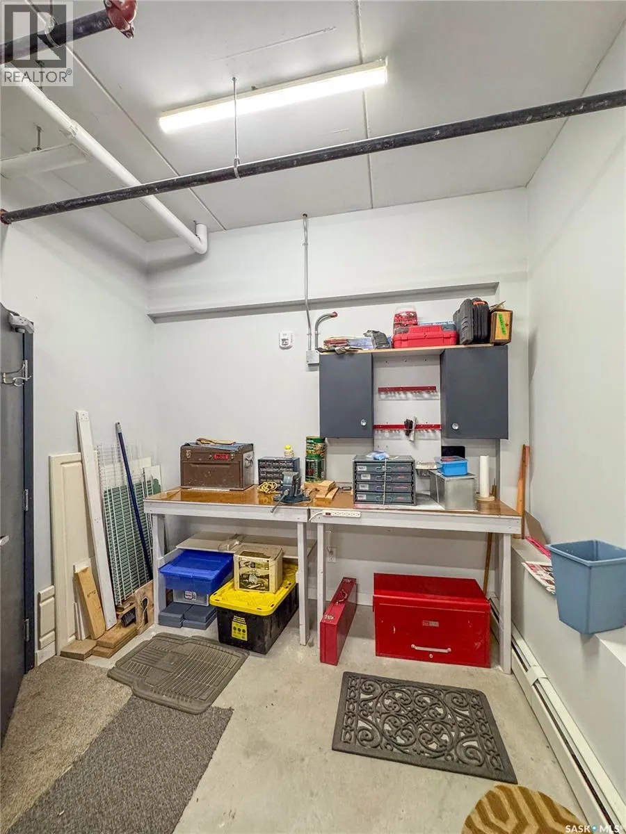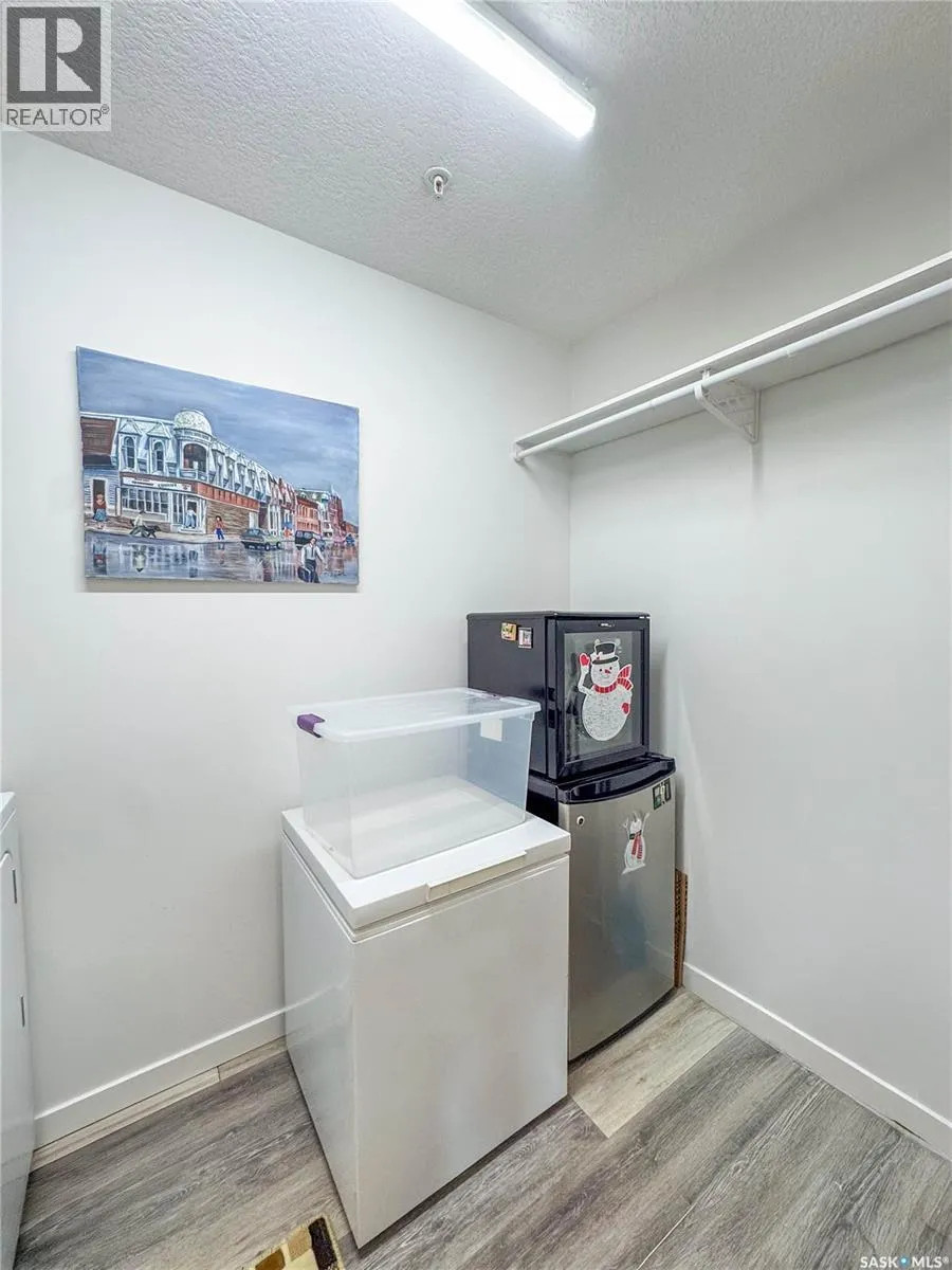 Stunning 2 bedroom, 2 bathroom condo offering 1,174 sq ft of luxury and low-maintenance living. This open-concept home features vinyl plank flooring and quartz countertops throughout, a bright white kitchen with stainless steel appliances, a 6â island, and expansive windows that flood the space with natural light. Soaring 9â ceilings enhance the spacious feel, while the southeast-facing covered wrap-around balcony includes two electrified and insulated storage rooms plus a natural gas BBQ line. The primary suite boasts its own bathroom, and the in-suite laundry provides additional storage space for convenience. Building amenities include an elevator, heated parking garage space, workshop, common room with a kitchenette, and an exercise area. Ideally located near the Alfred Jenkins Field House, hospital, and many other amenities, this condo combines elegance, comfort, and ease of living. (id:27476)