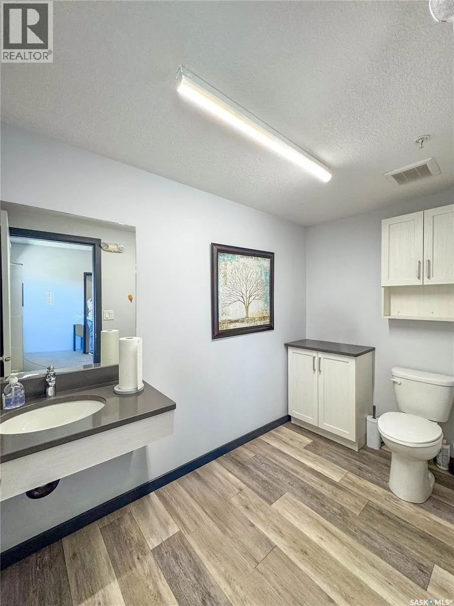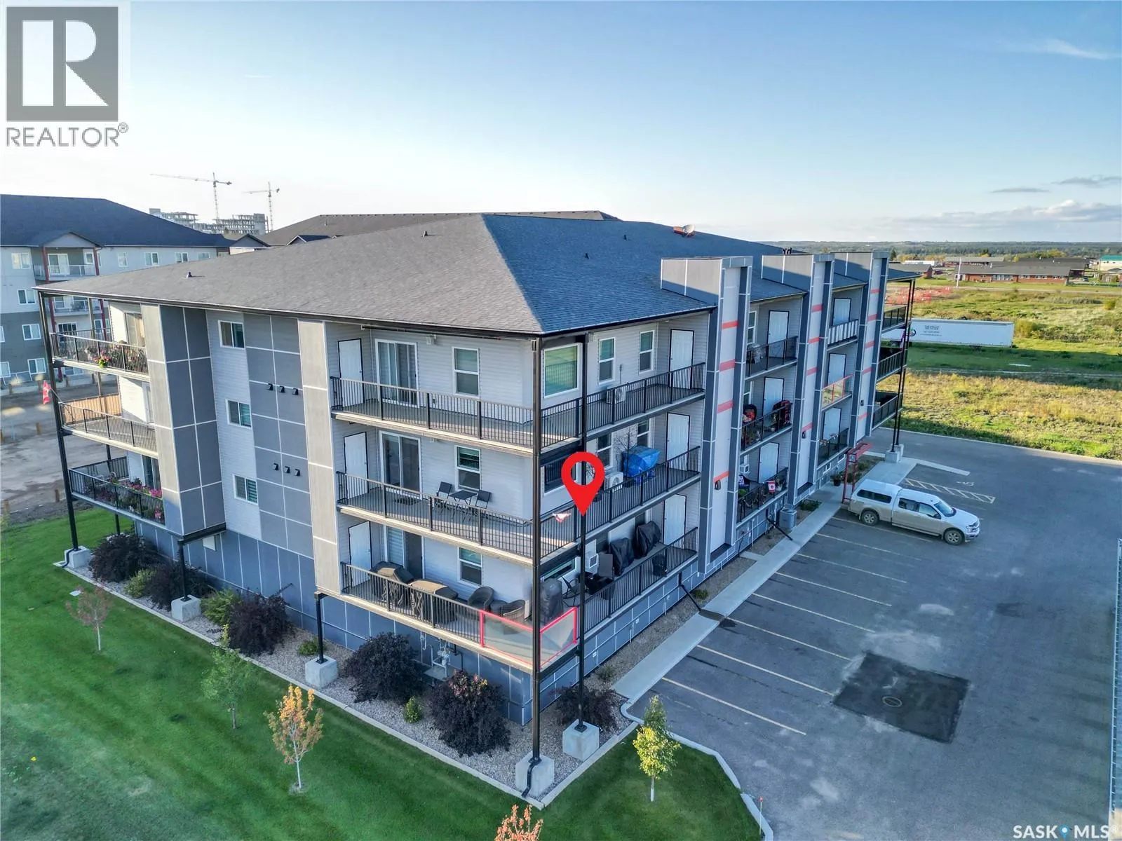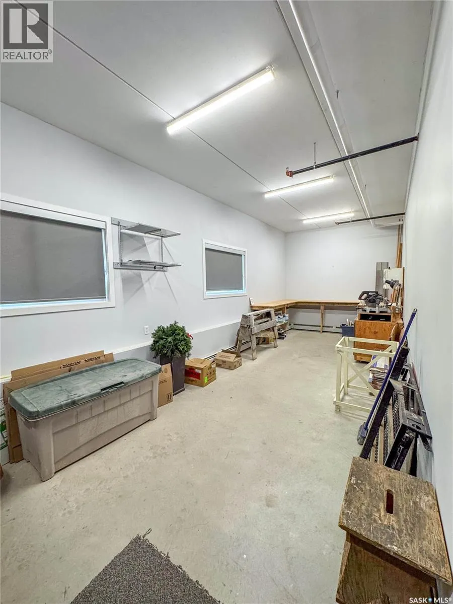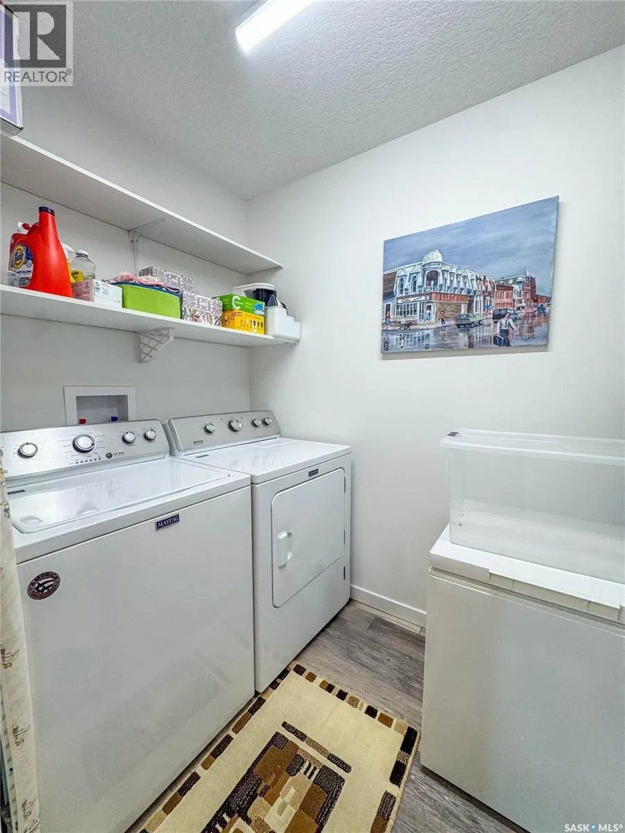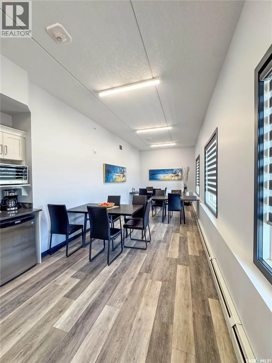 Stunning 2 bedroom, 2 bathroom condo offering 1,174 sq ft of luxury and low-maintenance living. This open-concept home features vinyl plank flooring and quartz countertops throughout, a bright white kitchen with stainless steel appliances, a 6â island, and expansive windows that flood the space with natural light. Soaring 9â ceilings enhance the spacious feel, while the southeast-facing covered wrap-around balcony includes two electrified and insulated storage rooms plus a natural gas BBQ line. The primary suite boasts its own bathroom, and the in-suite laundry provides additional storage space for convenience. Building amenities include an elevator, heated parking garage space, workshop, common room with a kitchenette, and an exercise area. Ideally located near the Alfred Jenkins Field House, hospital, and many other amenities, this condo combines elegance, comfort, and ease of living. (id:27476)