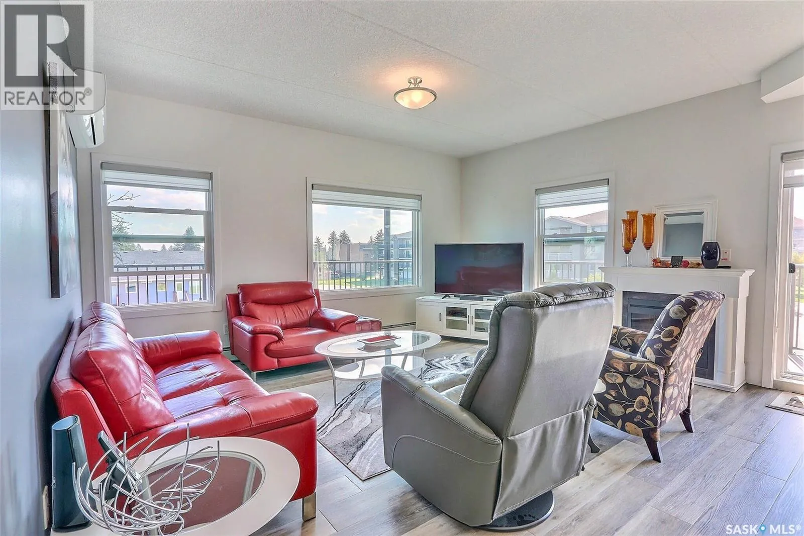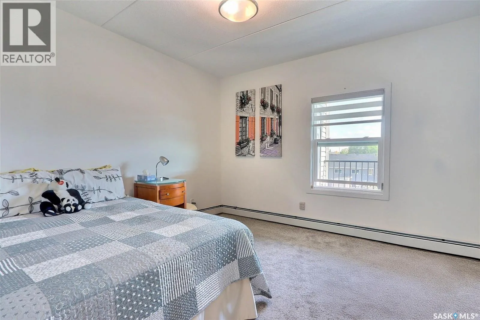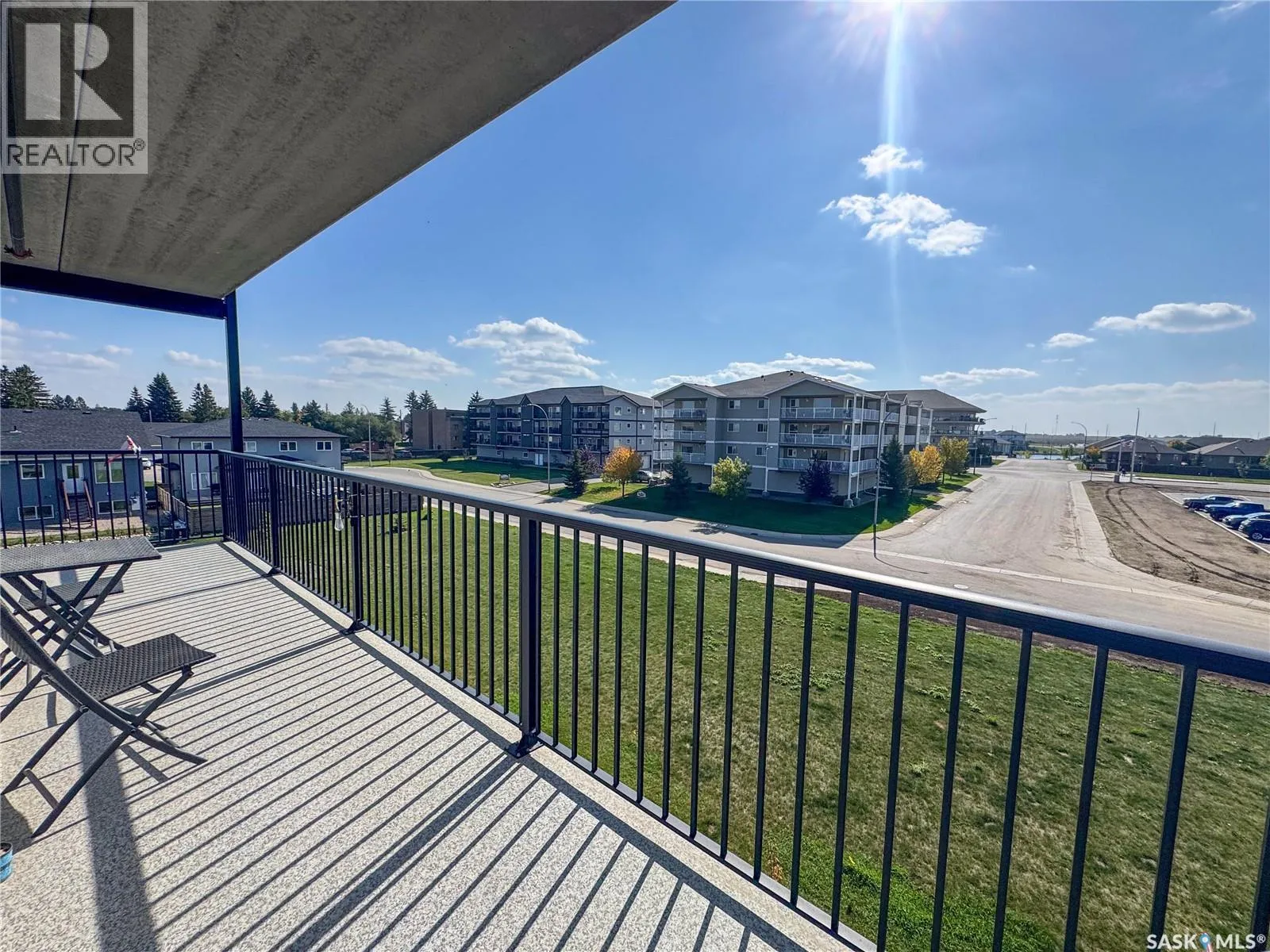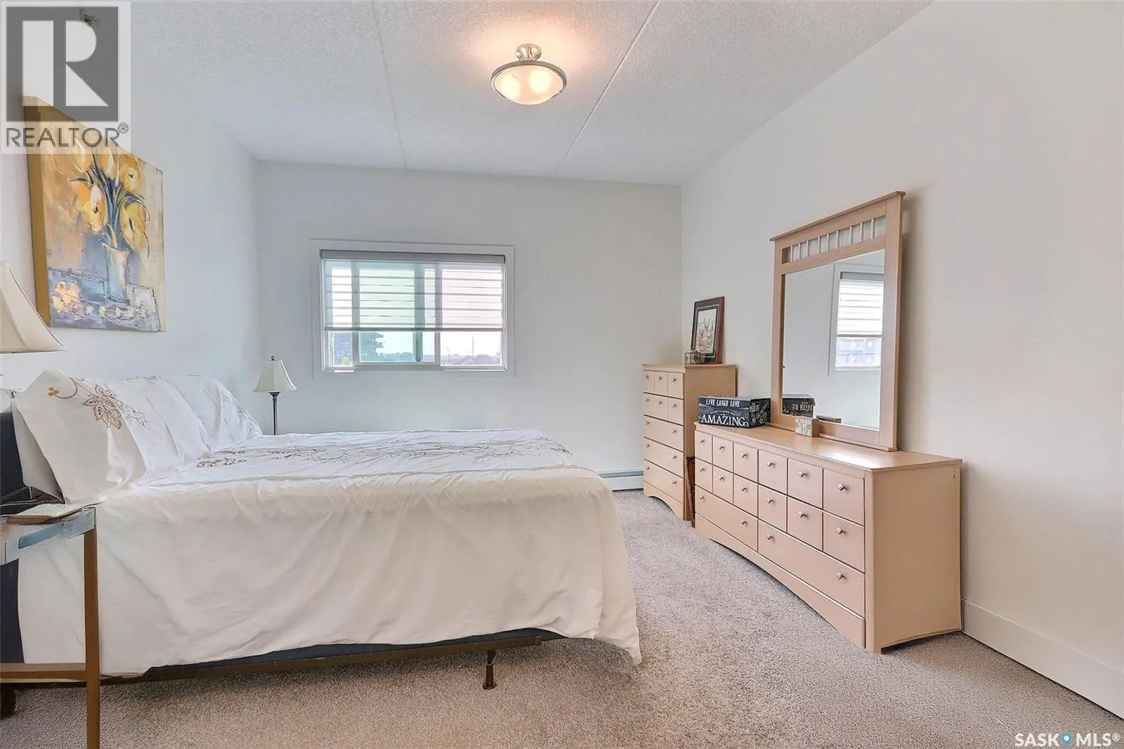 Stunning 2 bedroom, 2 bathroom condo offering 1,174 sq ft of luxury and low-maintenance living. This open-concept home features vinyl plank flooring and quartz countertops throughout, a bright white kitchen with stainless steel appliances, a 6â island, and expansive windows that flood the space with natural light. Soaring 9â ceilings enhance the spacious feel, while the southeast-facing covered wrap-around balcony includes two electrified and insulated storage rooms plus a natural gas BBQ line. The primary suite boasts its own bathroom, and the in-suite laundry provides additional storage space for convenience. Building amenities include an elevator, heated parking garage space, workshop, common room with a kitchenette, and an exercise area. Ideally located near the Alfred Jenkins Field House, hospital, and many other amenities, this condo combines elegance, comfort, and ease of living. (id:27476)