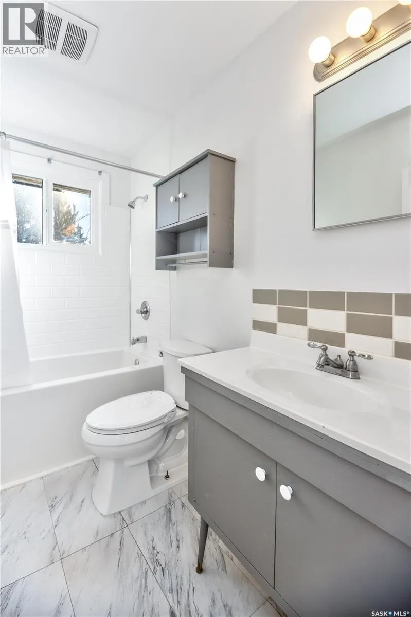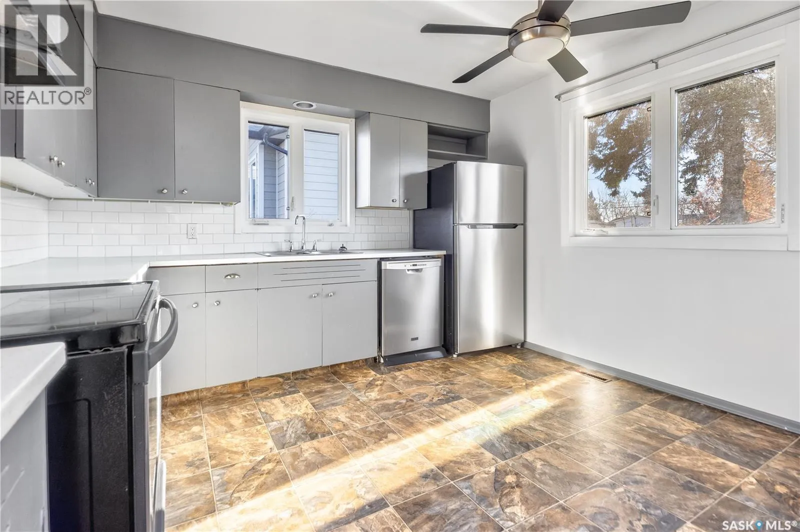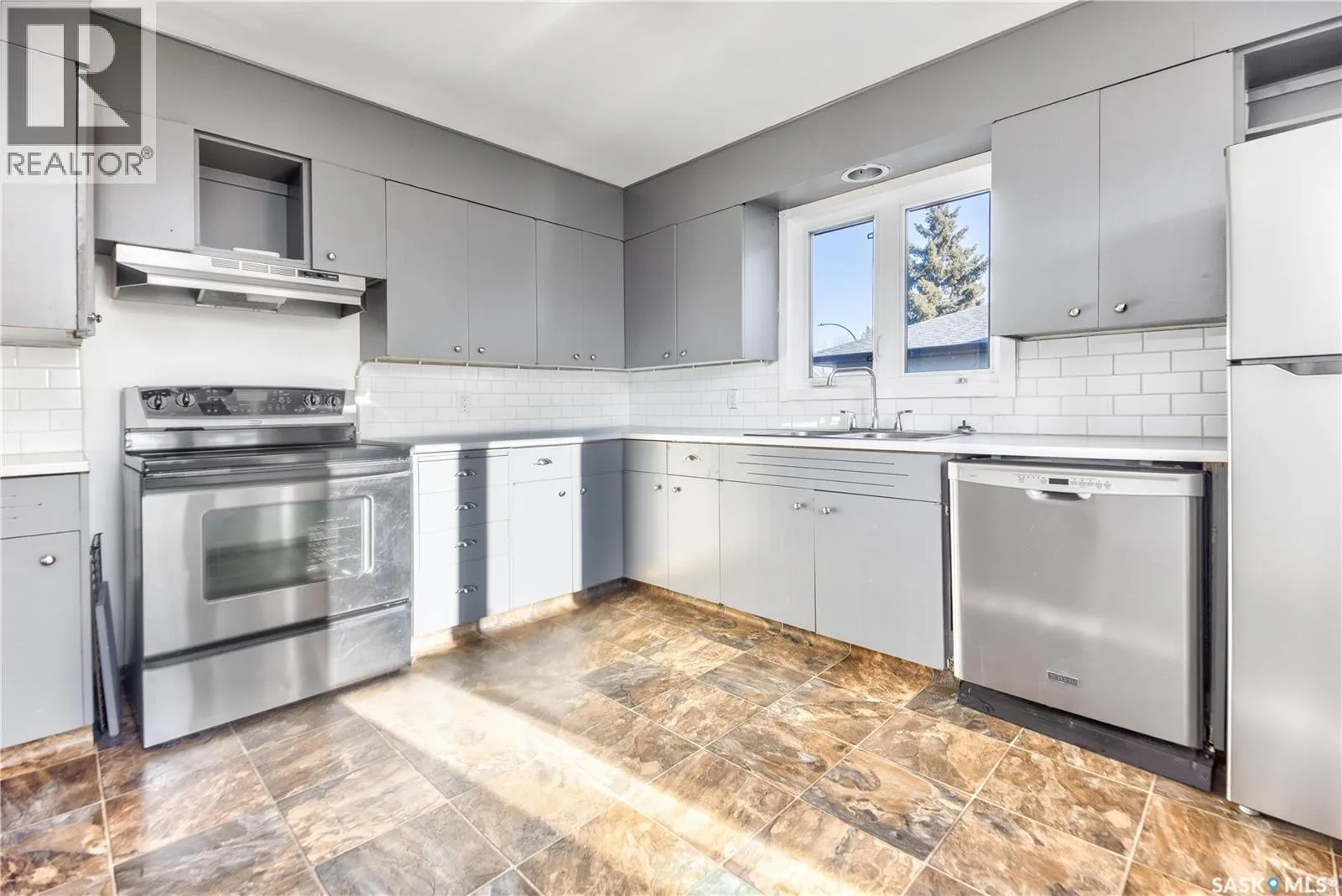 Discover exceptional value in this very clean and affordable four-bedroom bungalow located in a highly sought-after East Flat neighborhood, just steps from the Rotary Trail and the scenic North Saskatchewan River. Offering 816 sq ft of smartly designed living space, this home features an updated main bathroom, refreshed main level flooring, and newer PVC windows throughout. Comfort is top-notch with a newer central air conditioning unit and 100 amp electrical service. The sunny, south-facing backyard is fully fenced and perfect for outdoor enjoyment, while the oversized 18â x 24â single detached garage provides great storage or workspace. Shingles were updated in 2014, and all major appliancesâfridge, stove, washer, dryer, and dishwasherâare included, making this a move-in ready opportunity in a fantastic location! (id:27476)