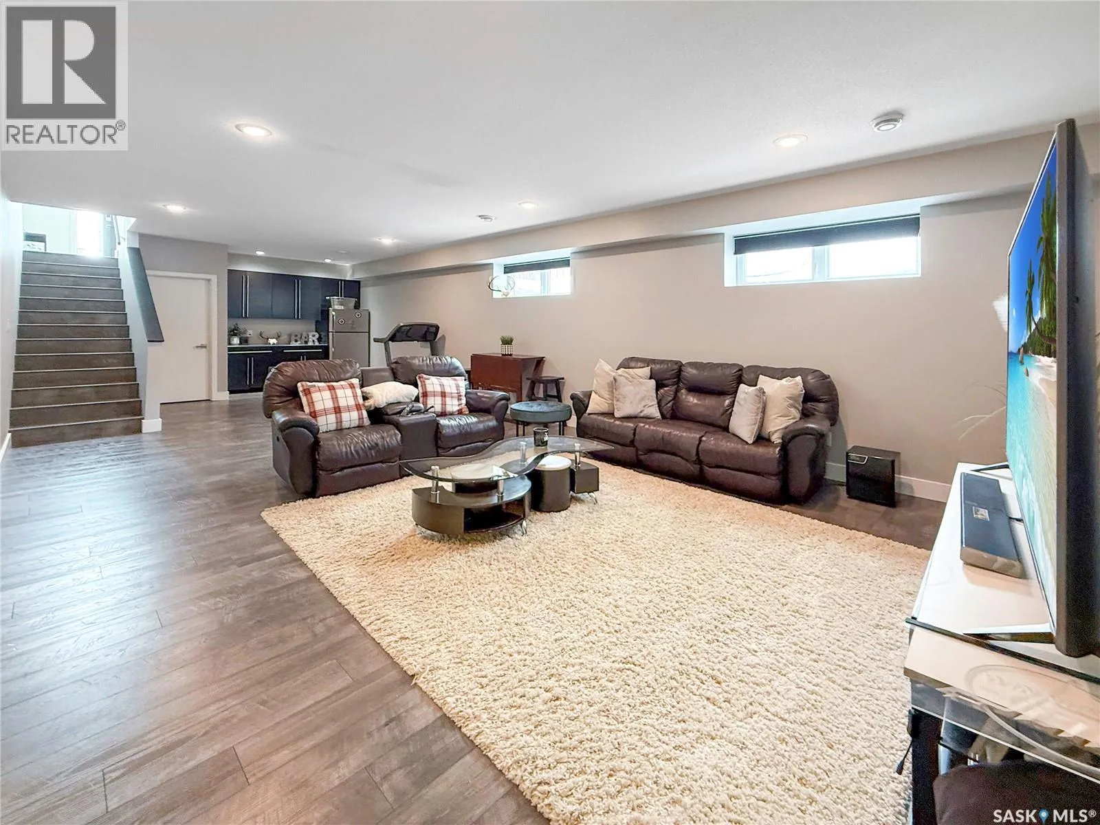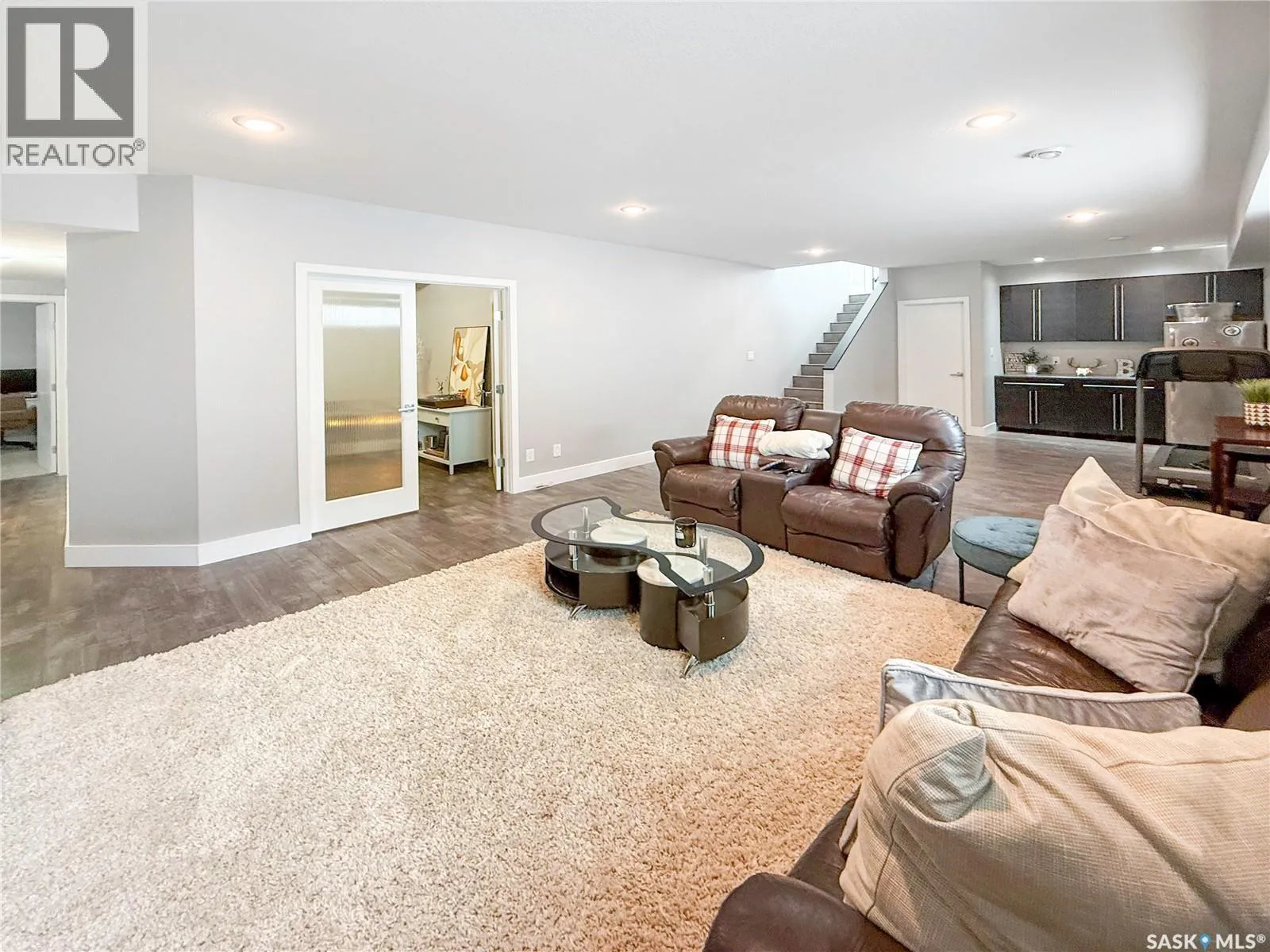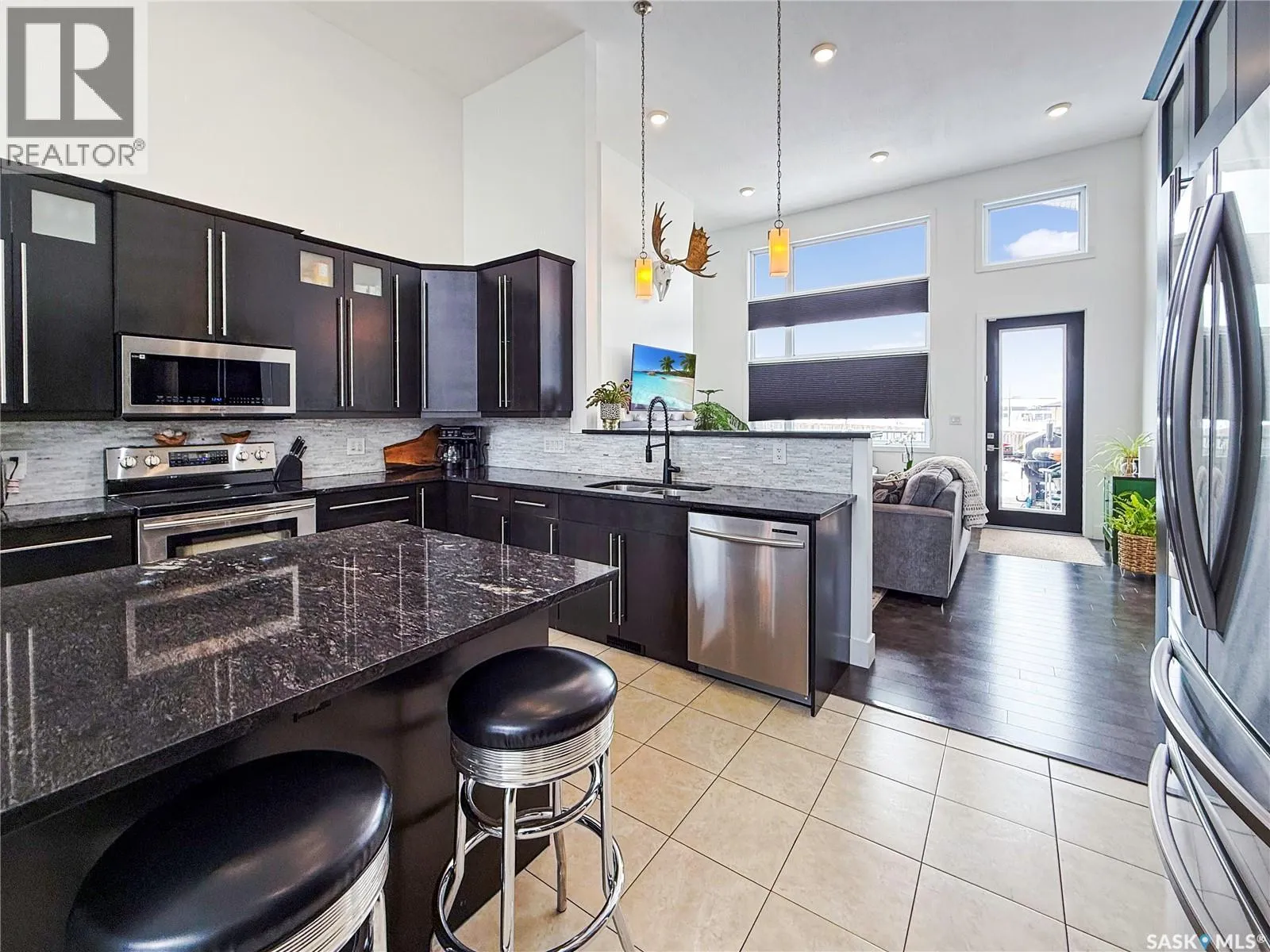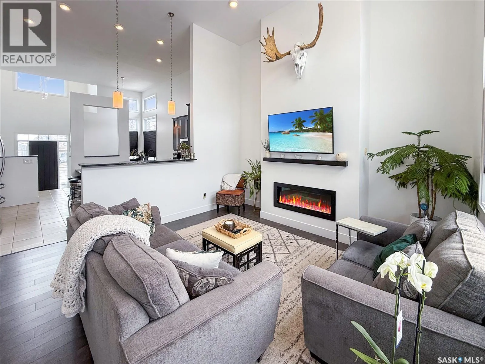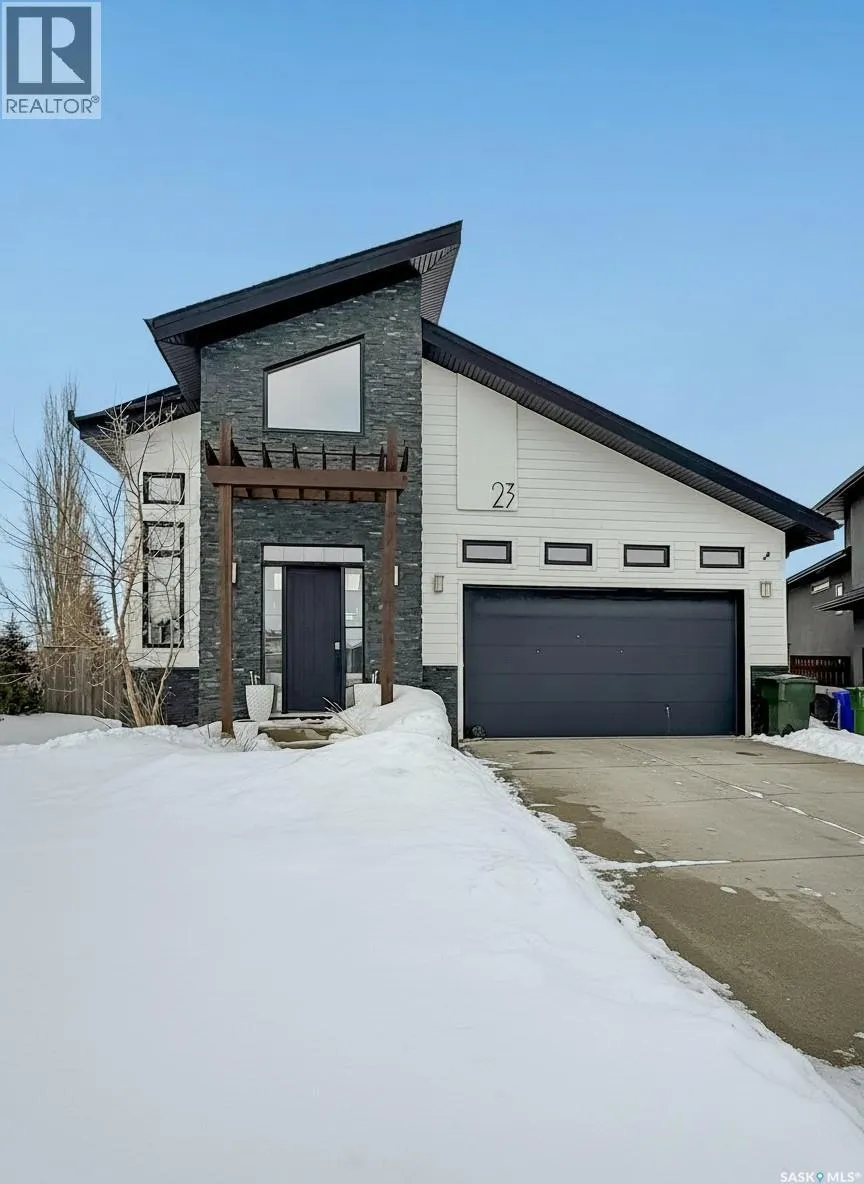 One-of-a-kind Custom home is Crescent Acres. 1608sqft, 5 bedrooms, 3 bathrooms, with heated attached garage. Step into a grand foyer with soaring ceilings. The main living area features 13.5â ceilings and oversized windows providing abundance of natural light with a sense of balance and warmth throughout the house. Open-concept layout connects the living, dining, and kitchen, ideal for everyday living and entertaining. The kitchen stands out with custom black maple cabinetry, granite countertops, backsplash, large island, and built-in desk. The spacious primary suite offers a walk-in closet and a well-appointed ensuite featuring a soaker tub and glass shower. Two additional bedrooms, a full 4-piece bathroom, and a convenient main floor laundry room complete the main level. The fully developed basement features a spacious family room, a private office with glass French doors, two additional generously sized bedrooms, a full 4-piece bathroom, a bar area, and ample storage. All with 9â ceilings, creating an open and inviting feel throughout. 24â x 26â heated garage with 14â ceilings, floor drain, built-in shelving, and workspace. Wonderful outdoor space featuring a back patio with natural gas hookup, a rock garden, huge back yard and a dedicated hot tub area. Situated on a quiet cul-de-sac, this property features a large pie-shaped lot backing onto the Rotary Trail. Steps to schools and a community rink. Luxury, function, and location, this could be #yourhappyplace. (id:27476)