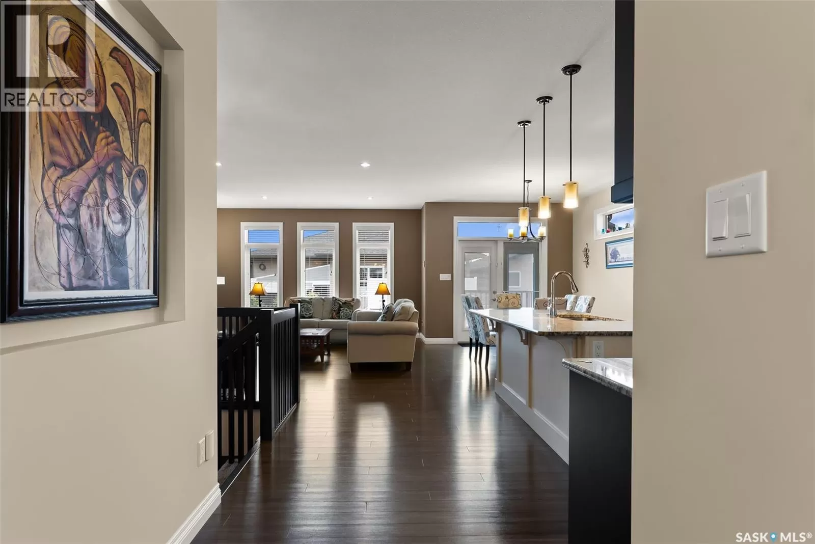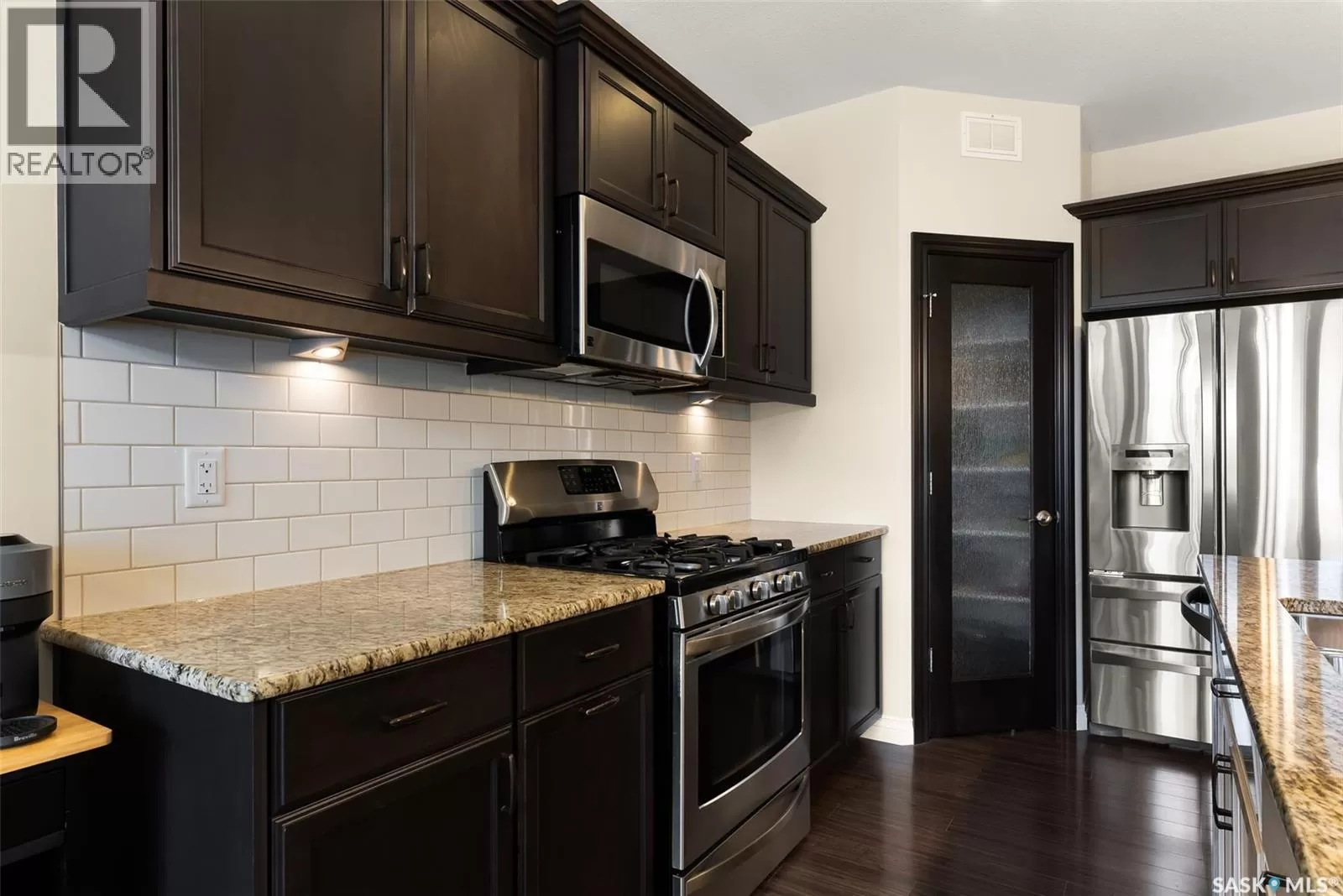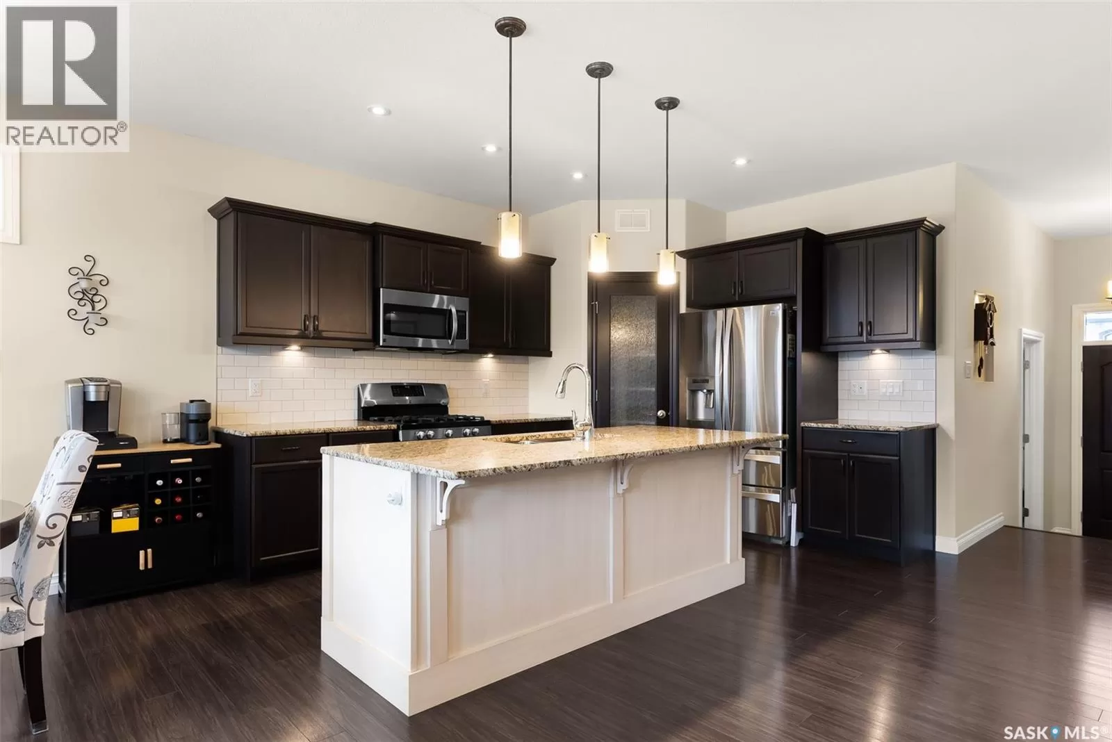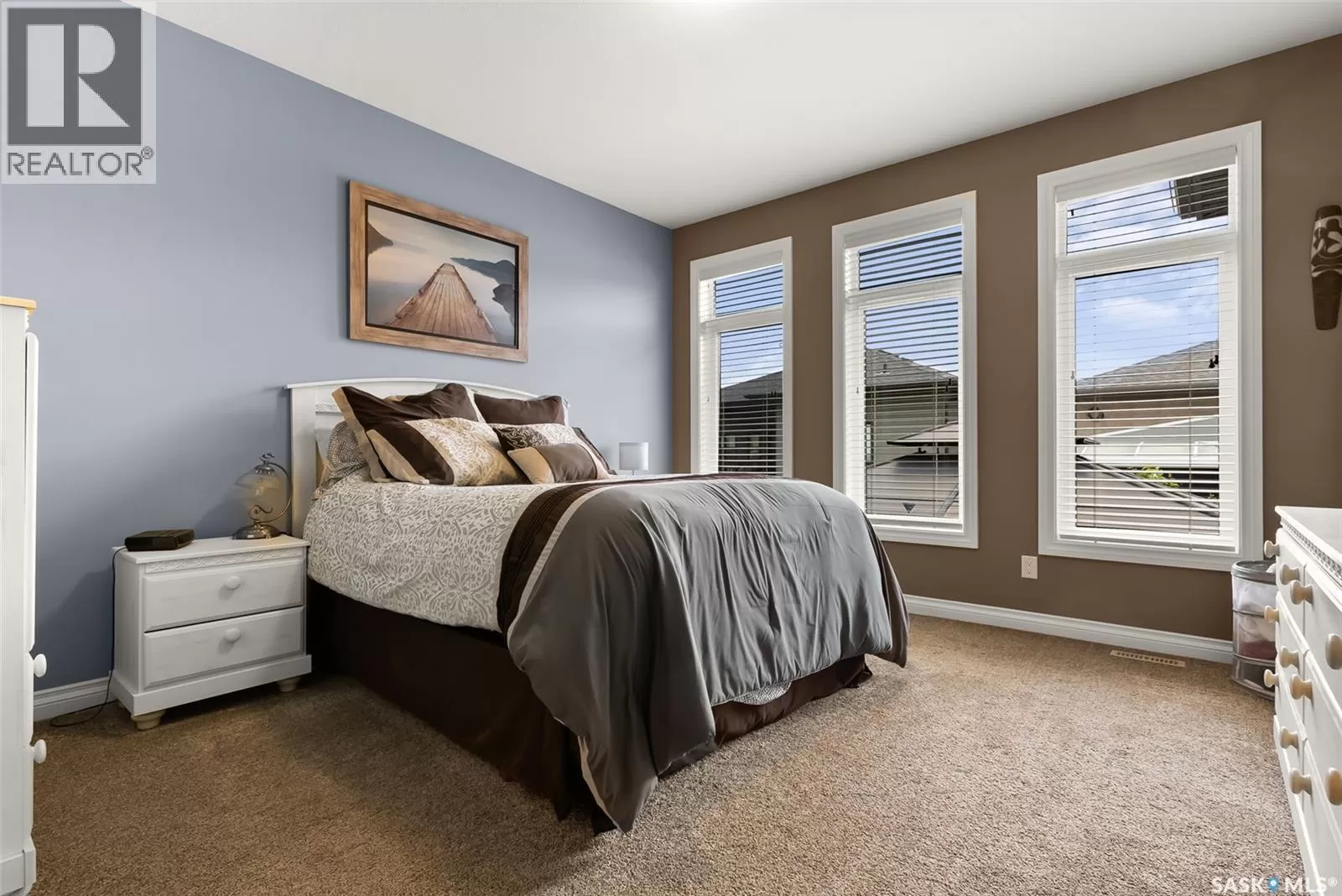 This pristine 1,490 sq/ft custom bungalow in The Greens on Gardiner was expertly crafted by Harmony Builders and showcases quality, comfort, and thoughtful design throughout. Premium upgrades, energy-efficient systems, and an exceptionally functional layout perfect for families or downsizers. Exceptional street appeal with xeriscaped front yard with river rock, stack stone and acrylic stucco exterior, large exposed aggregate driveway to the triple attached heated garage. The open-concept main floor features 9-foot ceilings, and triple-pane windows that flood the space with natural light. The chefâs kitchen is beautifully appointed with rich maple cabinetry, gas range stove, soft-close doors and drawers, crown moulding, under-cabinet lighting, granite countertops, and a large central island with pendant lighting. The bright living room includes a gas fireplace with built-in shelving and tile surround. Spacious dining room with direct access to the backyard and additional light via the piano window. A front-facing office behind glass French doors offers privacy without sacrificing natural light. The spacious primary bedroom features a walk-in closet and luxurious ensuite with dual sinks, and a 5-ft walk-in shower. Completing the main floor is mudroom and spacious designated main floor laundry area with tons of storage. The fully finished basement includes large rec room with two separate living spaces, two additional bedrooms with walk-in closets, and a 4-pc bath. Notice the oversized windows in the basement providing a comfortable feel with the additional natural light to shine through. Navien tankless water heater, high-efficiency furnace, HRV and open web truss floor system. Enjoy the beautifully landscaped, low-maintenance backyard with artificial turf, raised garden beds, gazebo and PVC fencing. The oversized triple garage is heated and finished, with a floor drain, built-in storage, and room for all your tools and toys. Close to all east end amenities! (id:27476)
