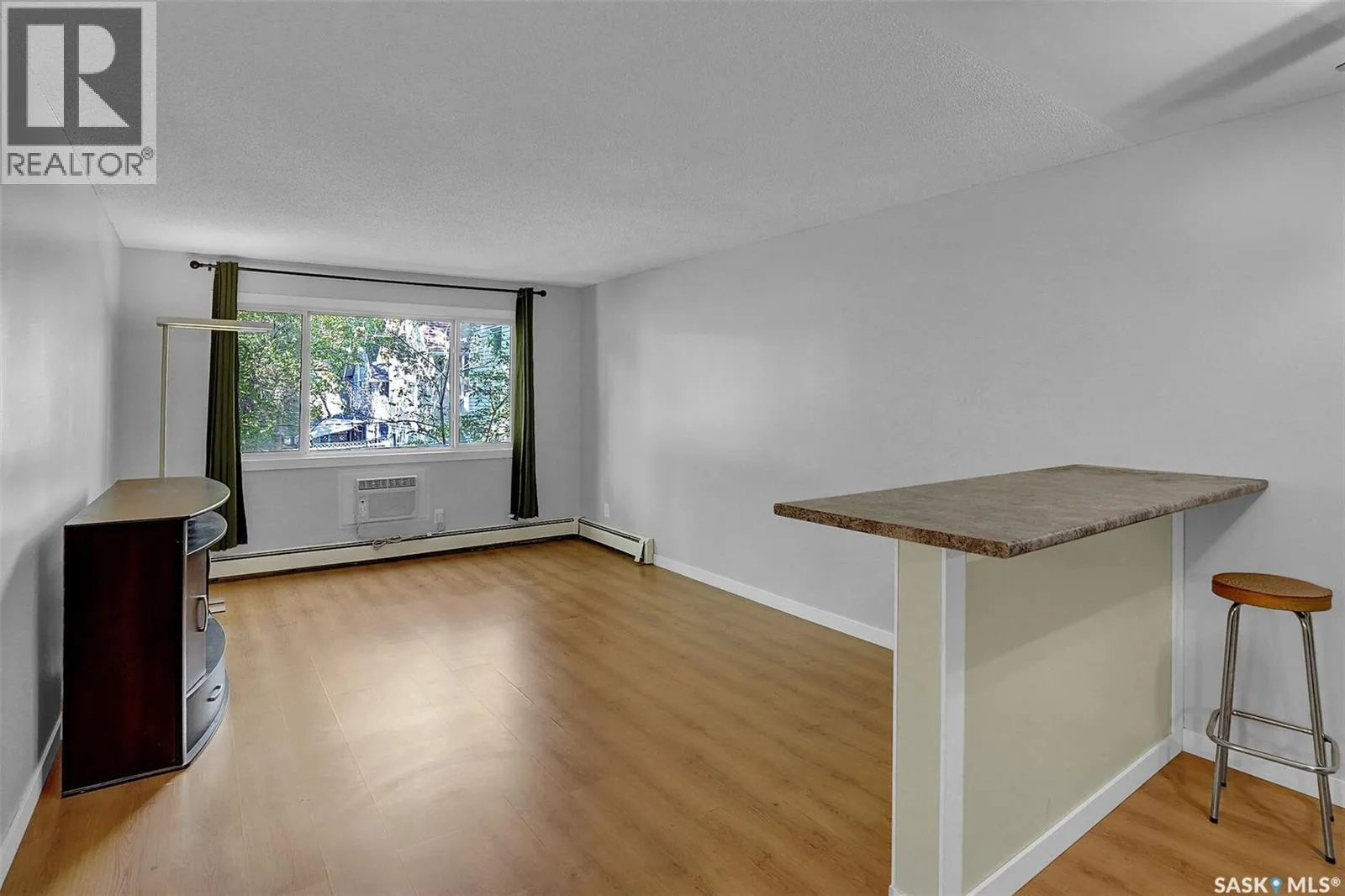 Ideal first time home ownership is possible in this affordable and move-in ready condo with a fantastic Cathedral location! Walking to downtown, Wascana Park and all of 13th Avenue shopping and culture. The comfortable living room has laminate flooring and is open to the kitchen and dining. Lots of cabinetry in the kitchen with fridge, stove, hood fan and built-in dishwasher included. There is one bedroom and a full bathroom. The storage room has the bonus of an added provision for in-suite laundry. There are upgraded windows and this condo has been refreshed with new paint and comes with one electrified parking. Condo fees include heat, water and sewer. (id:27476)