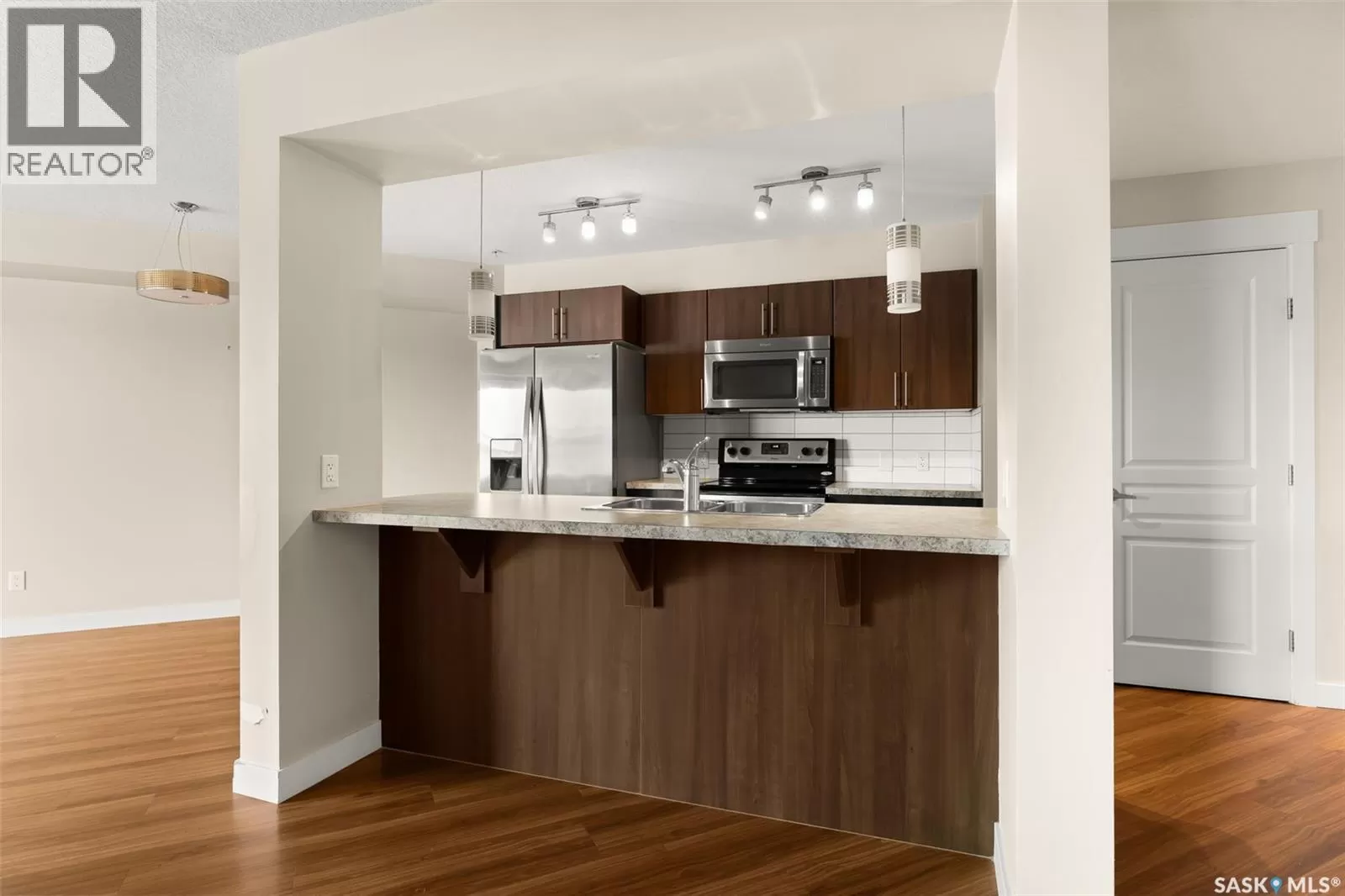 Bright open concept 3RD floor condo in great Harbor Landing location close to parks, schools and all amenities. 732 sq feet, 1 bedroom, 1 bath with multiple features and upgrades including good size living area with engineered hardwood flooring and neutral tones. Custom kitchen with large island, stainless steel appliances and pantry, large storage/laundry room, balcony, 1 heated interior parking space, all appliances included and central air conditioning. Building amenities include a guest suite, car wash/dog wash & bike storage in the parking area, fitness centre, a theatre room and visitor parking and much more. (id:27476)