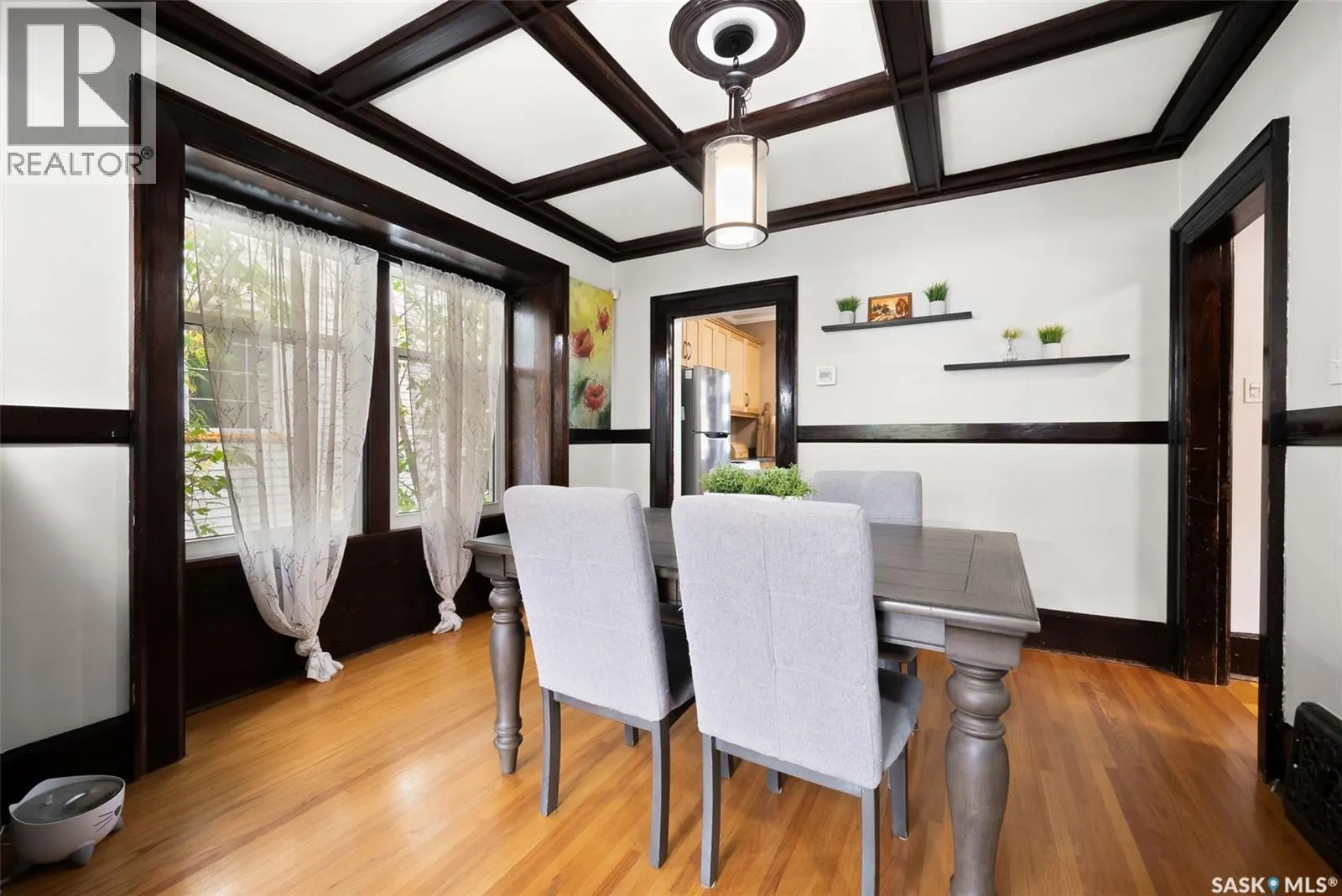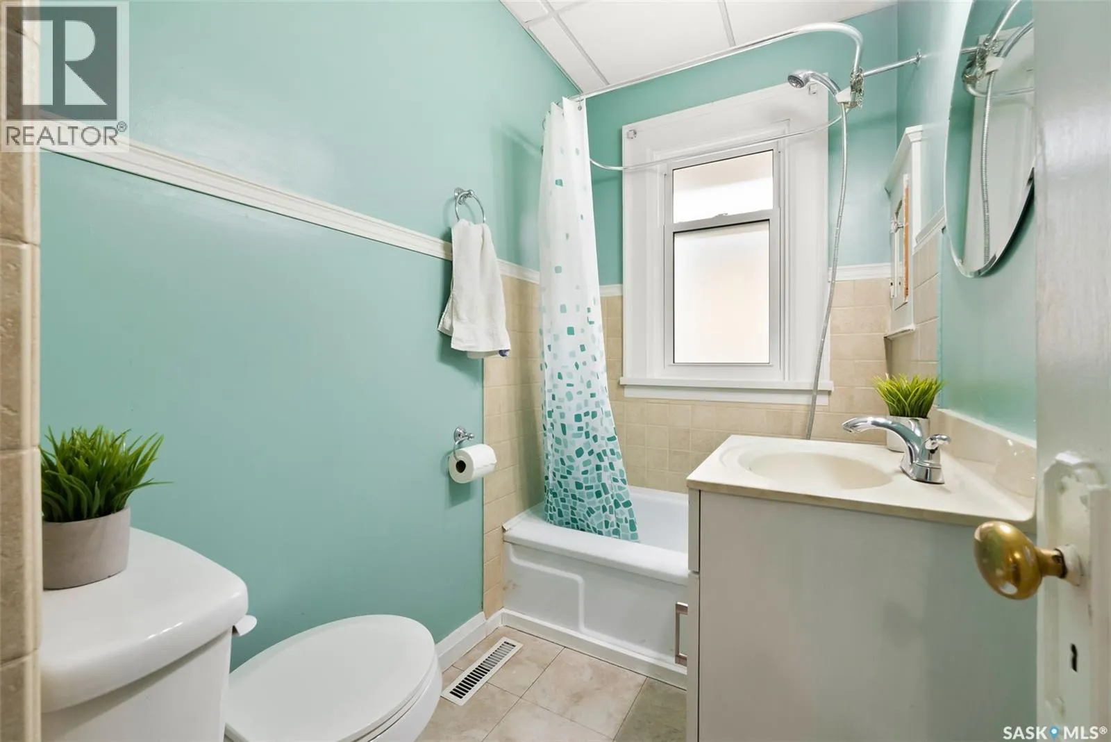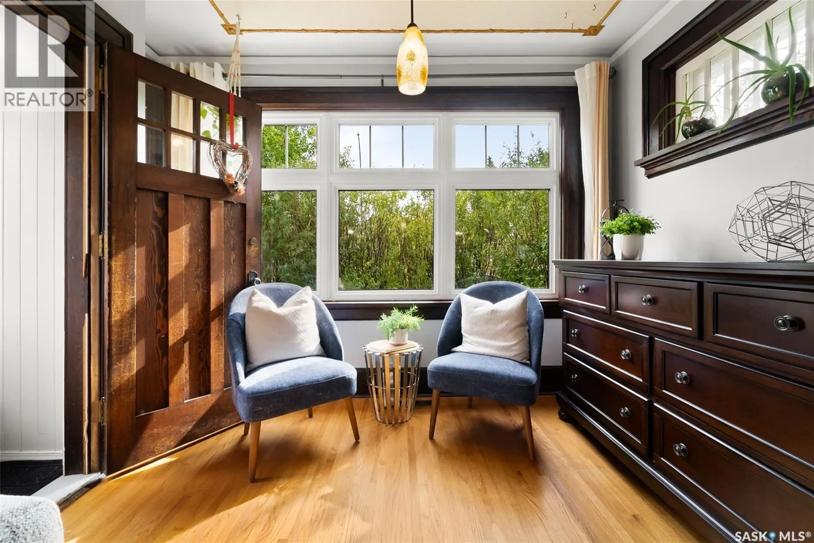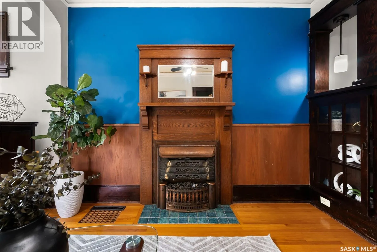Welcome to 2054 Pasqua Street, a charming 1 ½ storey home located in the heart of Cathedral. This 887 sq ft character home, built in 1922, offers a perfect blend of original charm and modern updates. Step inside to a bright and spacious living room featuring refinished original hardwood floors, beautiful woodwork, a new glass window in the original frame, and a striking antique (non-functional) fireplace with built-in bookshelves. The formal dining room boasts a trayed ceiling and a cozy bay window. The updated kitchen offers maple cabinetry, while the main floor 4-piece bathroom features newer fixtures, a modern vanity, and ceramic tile. Two good-sized bedrooms complete the main floor, one currently used as a home office. Upstairs, youâll find a private master retreat with bamboo flooring, newer windows, spray foam insulation, and a 3-piece ensuite bathroom. The finished basement offers a comfortable family room, cold storage, and a high-efficiency furnace. Enjoy the private backyard oasis with a fire pit area, pergola included, and a new deck built in 2022, perfect for relaxing or entertaining. A single detached garage (used as a shed) plus additional parking complete the exterior. Major upgrades include new shingles in 2024, PVC windows in 2022, new back door in 2020, front step in 2022, refinished hardwoods in 2019, new basement flooring, and updated wiring. Located steps from parks, schools, and Cathedralâs unique shops and restaurants, this home is move-in ready and full of character. (id:27476)