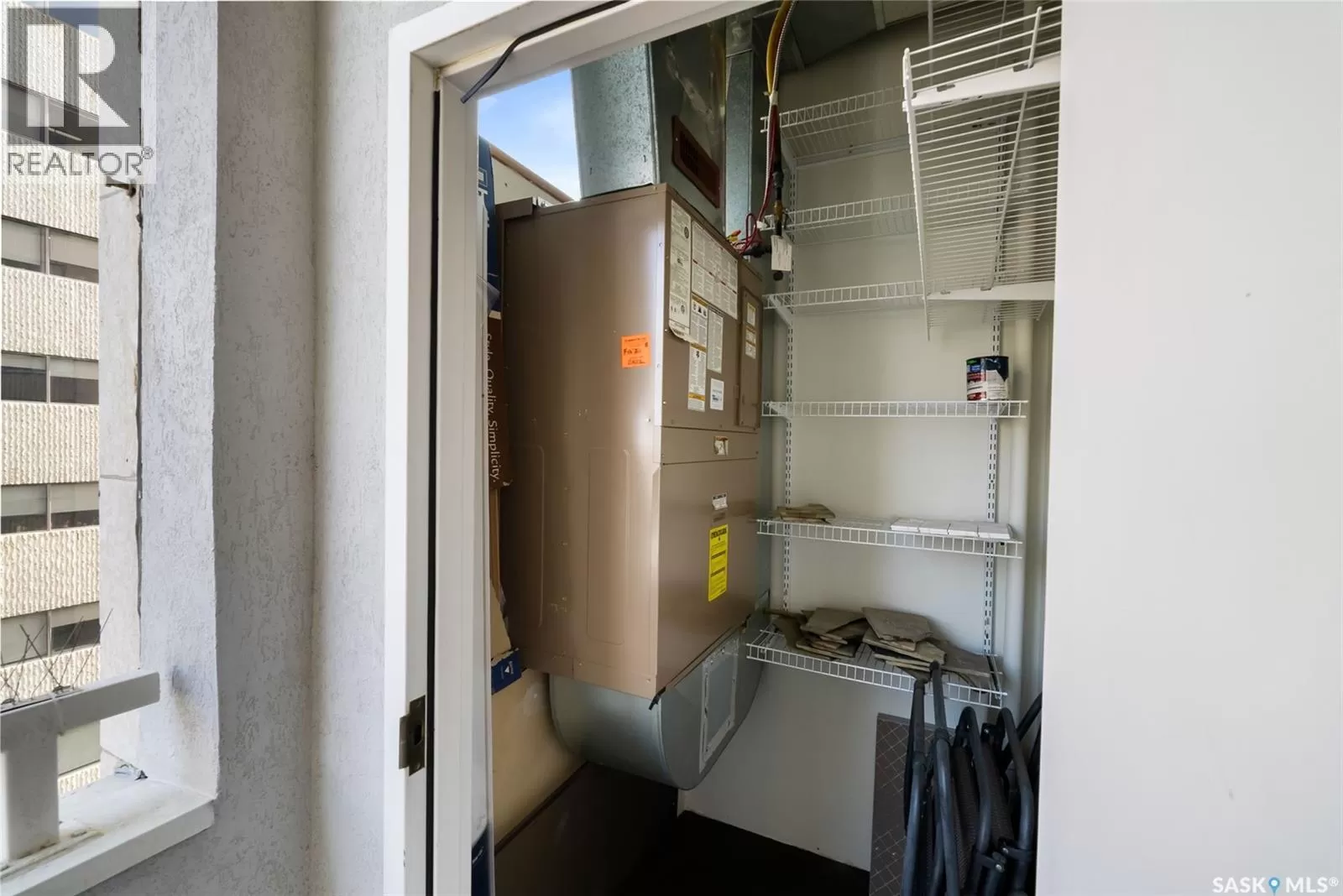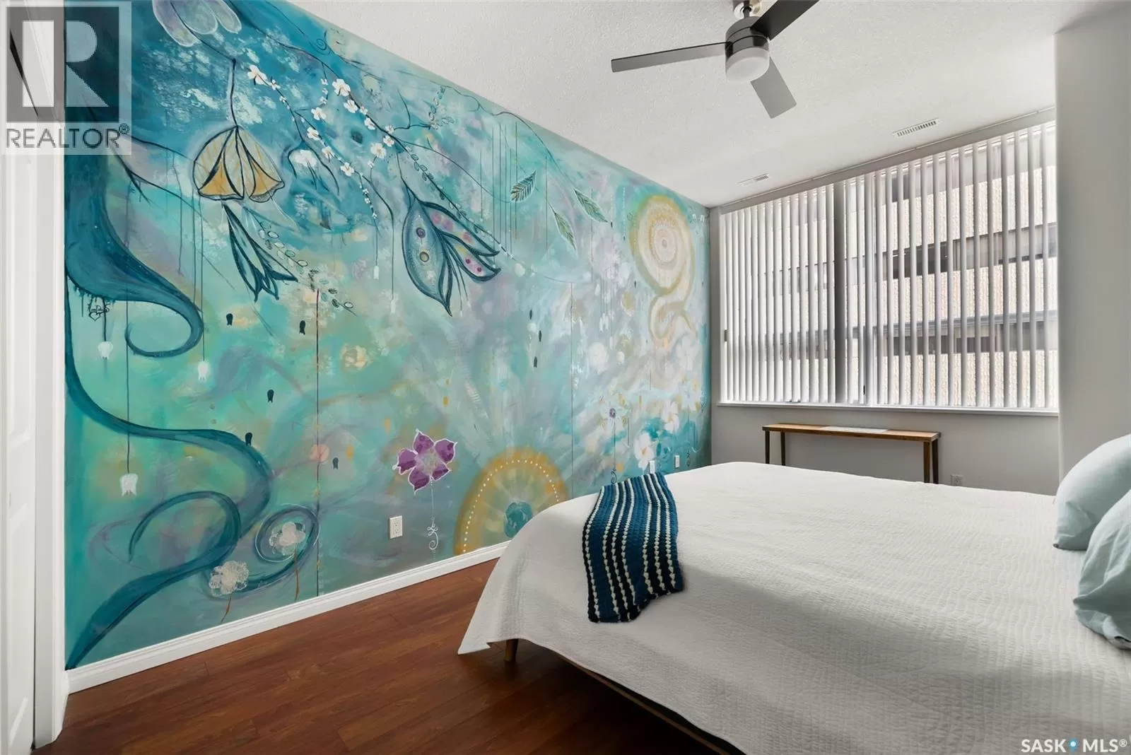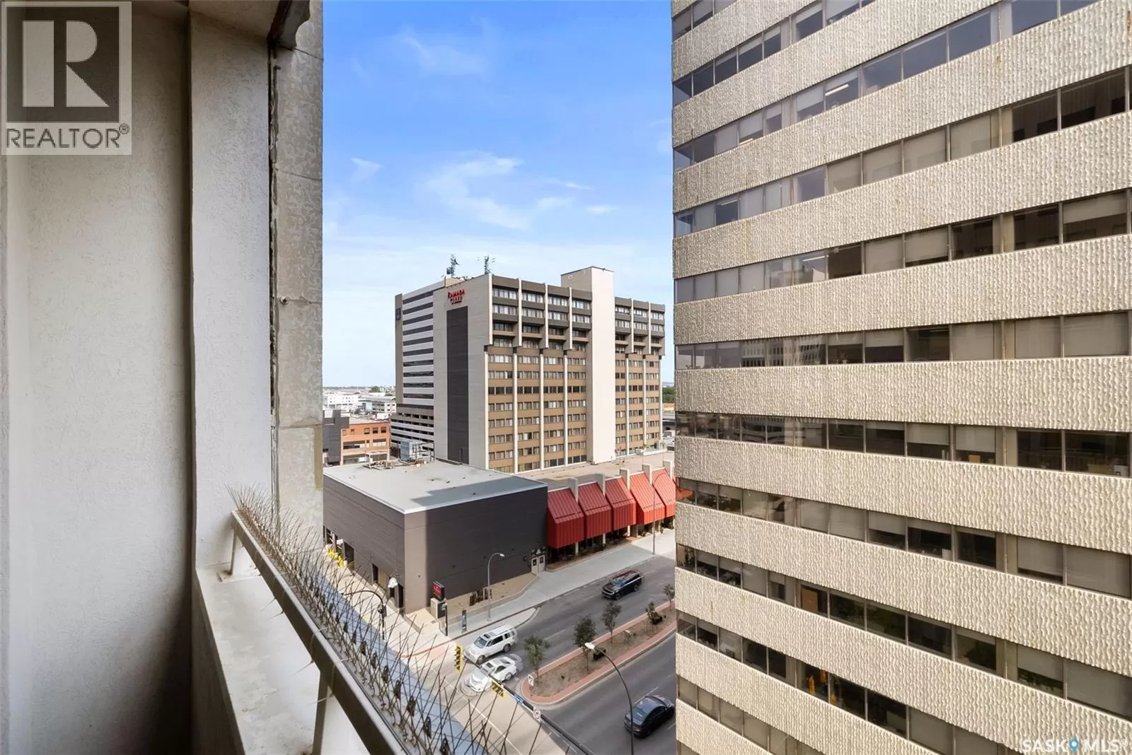 Welcome to the 7th floor of Victoria Place â where refined luxury meets the convenience of downtown Regina. This impeccably designed residence offers the ultimate urban lifestyle, just steps from some of the cityâs finest dining, shopping, and entertainment options. From the moment you enter, you'll be captivated by the high-end finishes and thoughtfully curated details throughout. Soaring 10-foot ceilings and a fresh, modern palette set the tone, complemented by elegant tile and laminate flooring that seamlessly unify the space. The show stopping kitchen, featuring quartz countertops, full-height custom cabinetry, integrated appliances, under cabinet lighting and a distinctive raw-edge sink â combines form and function with striking visual appeal. The spacious open-concept living and dining area is bathed in natural light from the east-facing balcony doors, creating a warm and inviting ambiance. Step outside to enjoy your private balcony â the perfect spot for a morning espresso or an evening escape. Retreat to the beautifully appointed bedroom, featuring an artistic accent wall that adds personality and charm to the serene space. The den provides office space, or whatever your needs require, for flexible versatility. The stylish 4-piece bathroom offers bright, modern tiling and ample storage, while in-suite laundry and a private balcony storage room enhance daily convenience. Constructed with solid concrete, the building ensures exceptional soundproofing and long-lasting quality â providing peace, privacy, and a true sense of sanctuary in the heart of the city. Donât miss this rare opportunity to own a piece of luxury in one of Reginaâs most iconic downtown addresses. Urban sophistication awaits. (id:27476)
