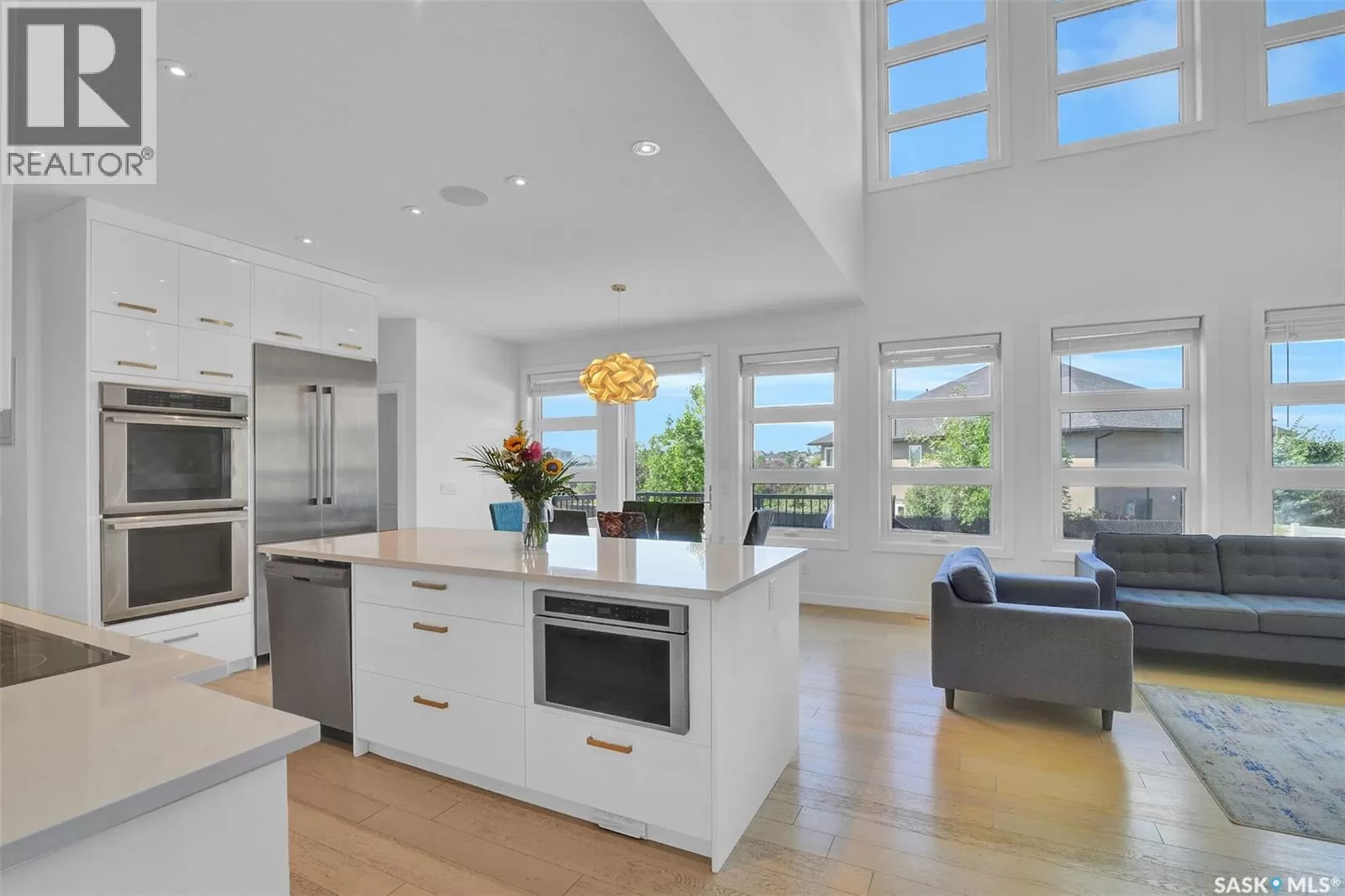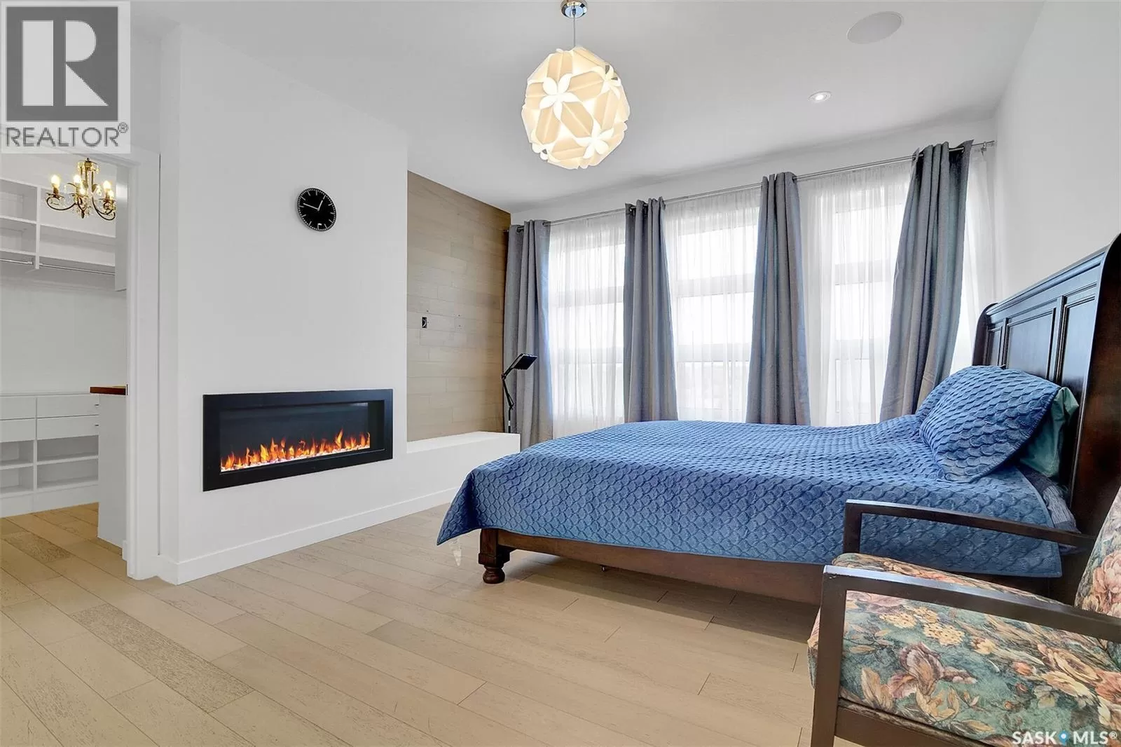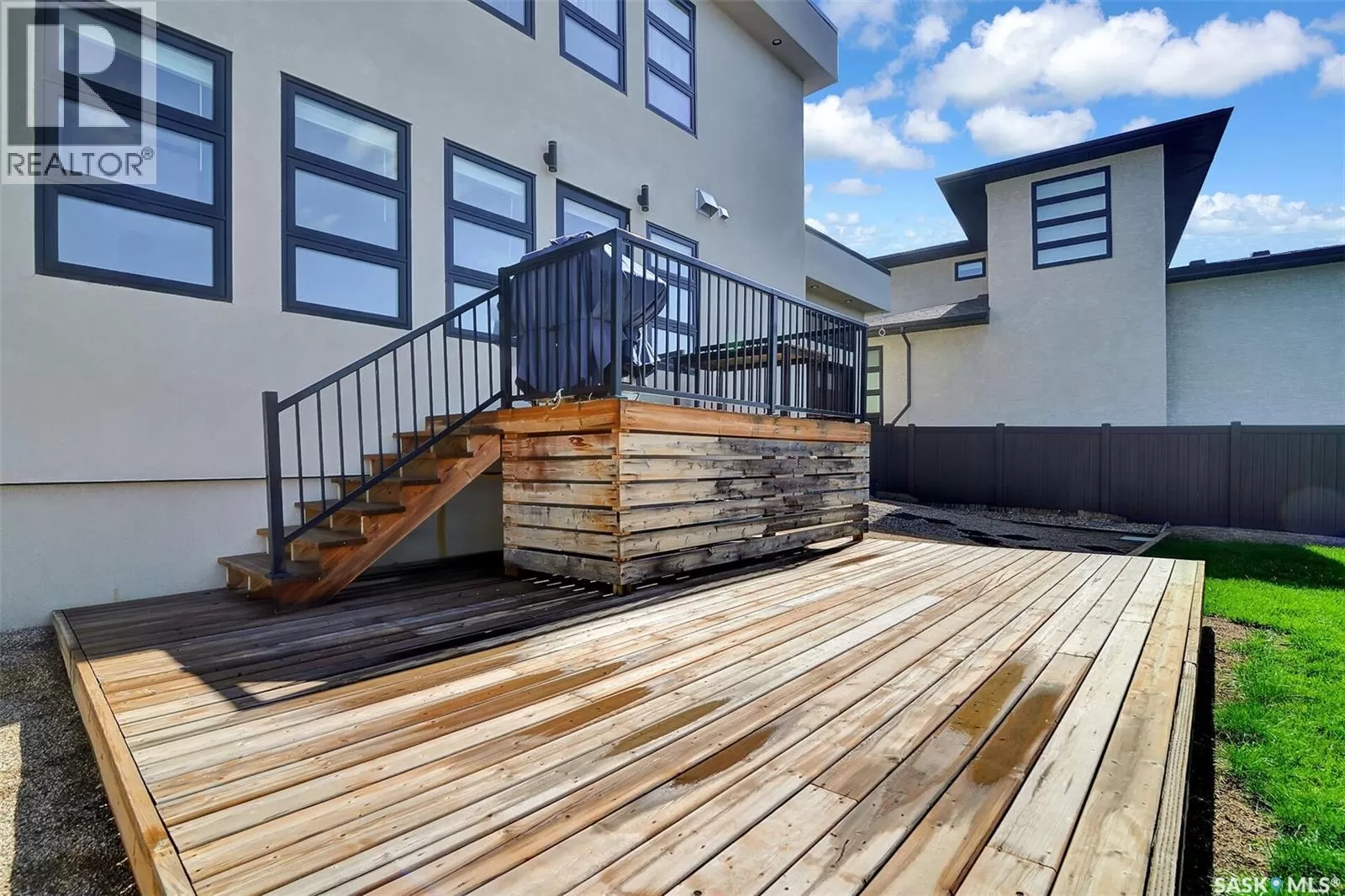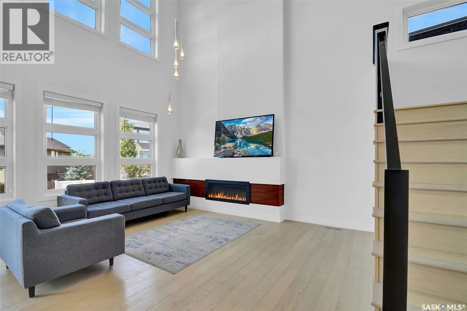 Custom built, steps away to the green space/park, 20âceilling in living room. Gorgeous 1937 sqft two storey home with 4bedrooms and 4bathrooms located in the desirable neighbourhood Greens on Gardiner. Open concept main floor with hardwood flooring throughout, spacious foyer with nice tile flooring, living room features 20â ceiling with abundance windows give lots of natural light, gas fireplace. Kitchen offering beautiful granite countertops, tile back splash, a large eat-in island and abundance white modern cabinets give lots of storage space, high end stainless steel appliances by Thermadore, imported from Germany. A good sized of dinning room with garden doors lead to 2 tiered deck with natural gas BBQ hook up, beautiful yard is landscaped and fenced. Thereâs an office /den and 2pc bath to finish the main floor. The upper floor boasts 2bedrooms and 2 full baths, the larger master bedroom features a huge walk-in closet, gas fireplace, bar fridge, 5pc ensuite with heated tile flooring. The basement is fully developed with 2 additional bedrooms, a large rec com, a bar area and another 3pc bath. The triple attached garage is heated, insulted and drywalled. The back yard could also accommodate a pool you desire. One more bedroom can be added on the 2nd floor, See the last two photos for the illustration of the placement of the bedroom and the access to it. (id:27476)