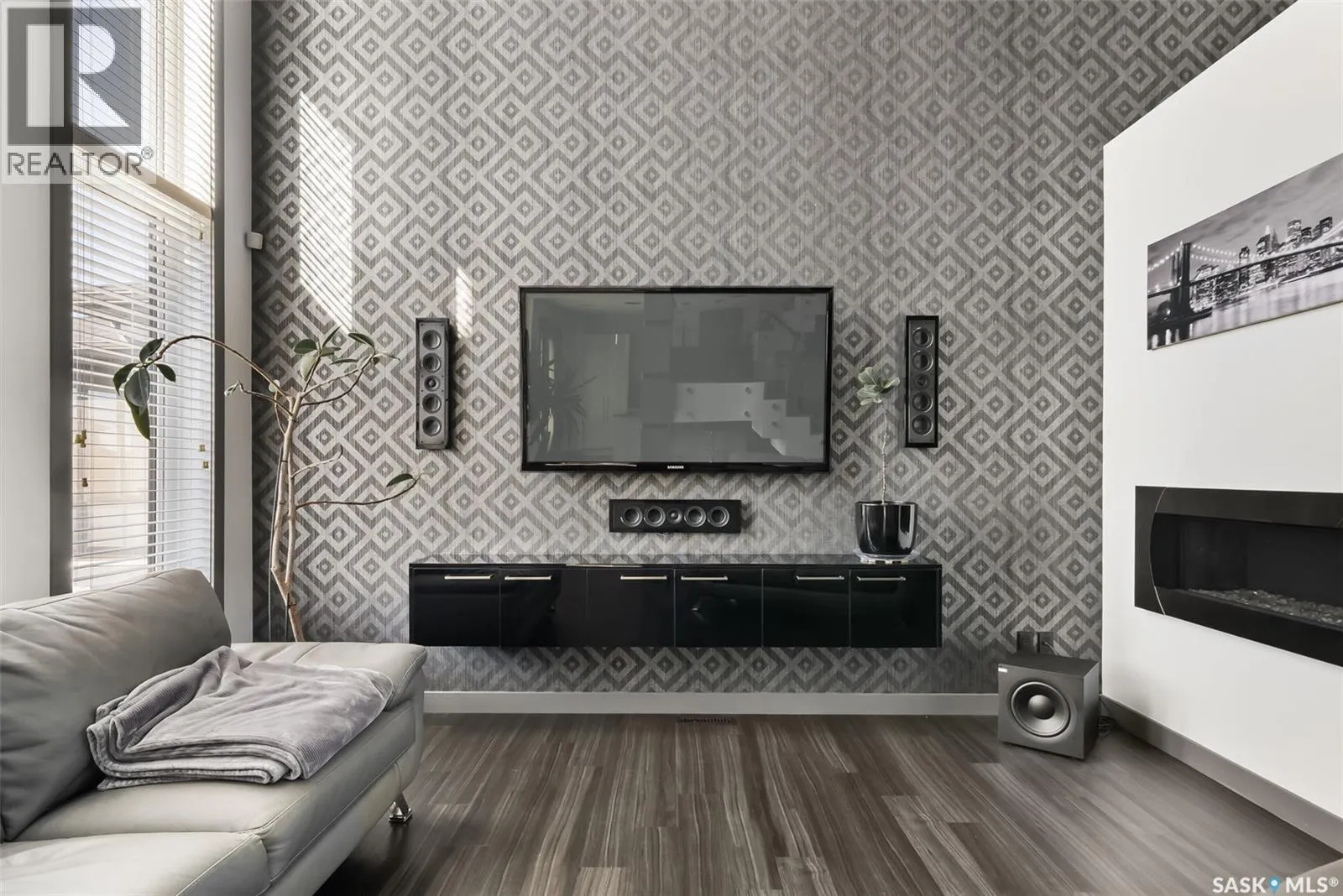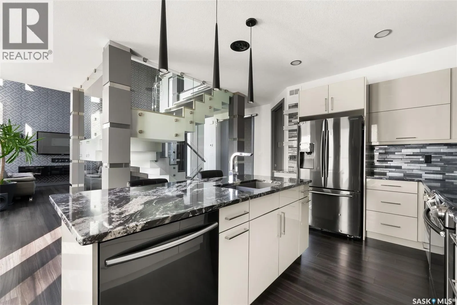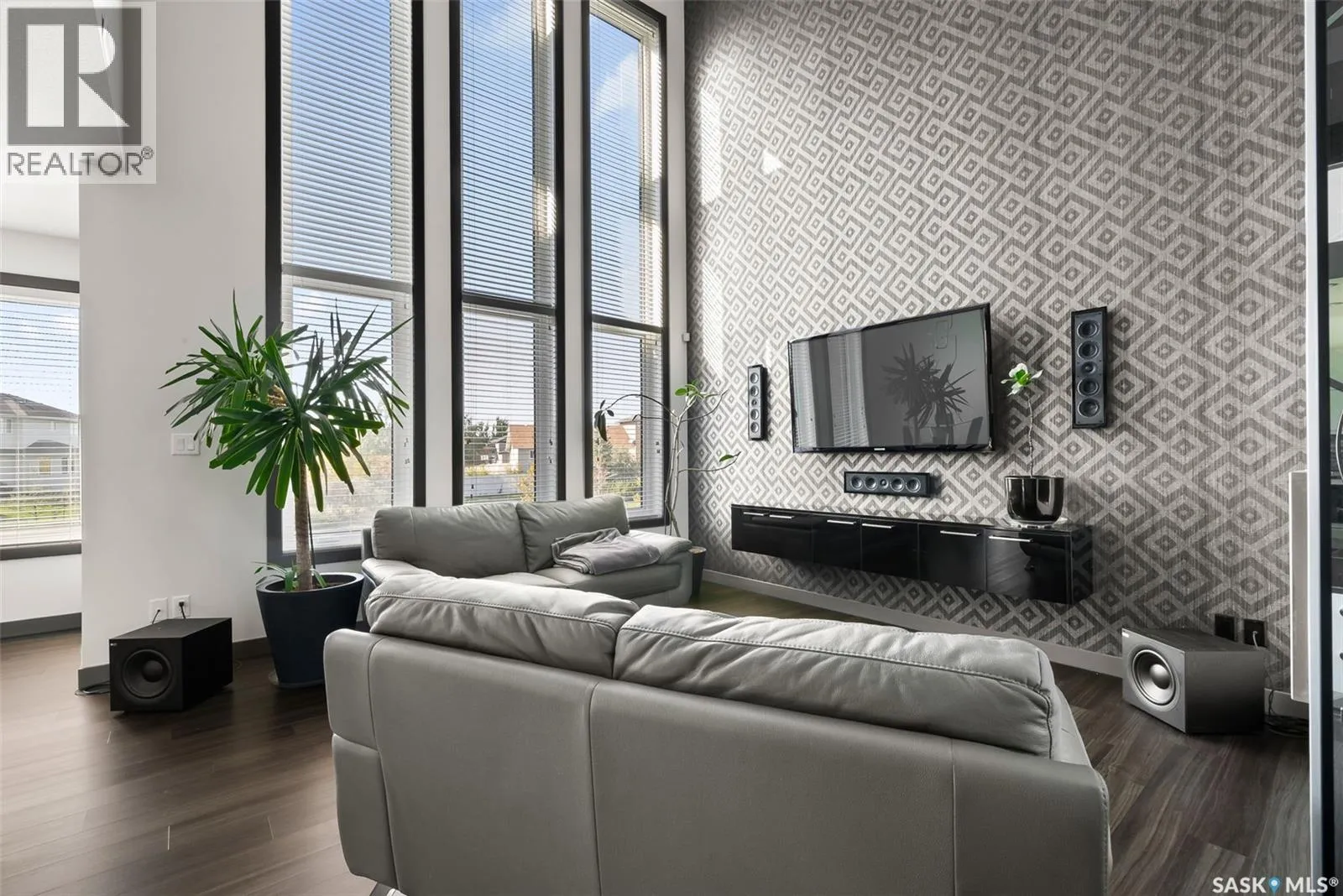 Welcome to this stunning custom-built walkout in Fairways West! This home is in a prime location and backs the beautiful walking path leading to the Goulet Golf Course. The moment you step inside, 19-foot ceilings and floor-to-ceiling windows create a dramatic sense of space and light. A striking glass-and-stainless steel staircase, accented with subtle stair lighting, introduces the homeâs modern, refined style. The kitchen is both beautiful and practical, featuring custom white cabinetry, a generous sit-up island, granite countertops and premium stainless-steel appliances. There is garden door access from the kitchen which opens onto a private west-facing deckâideal for morning coffee or evening entertaining while taking in the peaceful green space. Upstairs youâll find the primary retreat, complete with a walk-in closet and a luxurious five-piece ensuite featuring dual vanities, a stand-alone soaker tub and a custom-tiled shower. Two additional bedrooms, a four-piece bath, and a convenient laundry room complete this level. The fully developed walkout basement is built for entertaining or unwinding after a long day. The rec room is set up as a perfect home theatre complete with a projector screen and built-in sound system! A sleek wet bar adds style and convenience, while the fourth bedroom doubles as a guest room, office, or home gym. Expansive windows keep the space bright and welcoming. The oversized double attached garage is a standoutâheated, drywalled and equipped with 12-foot ceilings, a floor drain, and water taps. There are built-in speakers throughout the house and receivers are all included. Every detail in this home combines contemporary design with practical luxury. Discover a residence where craftsmanship and lifestyle meet in one exceptional property. This Fairways West show piece is one you do not want to miss out on! (id:27476)