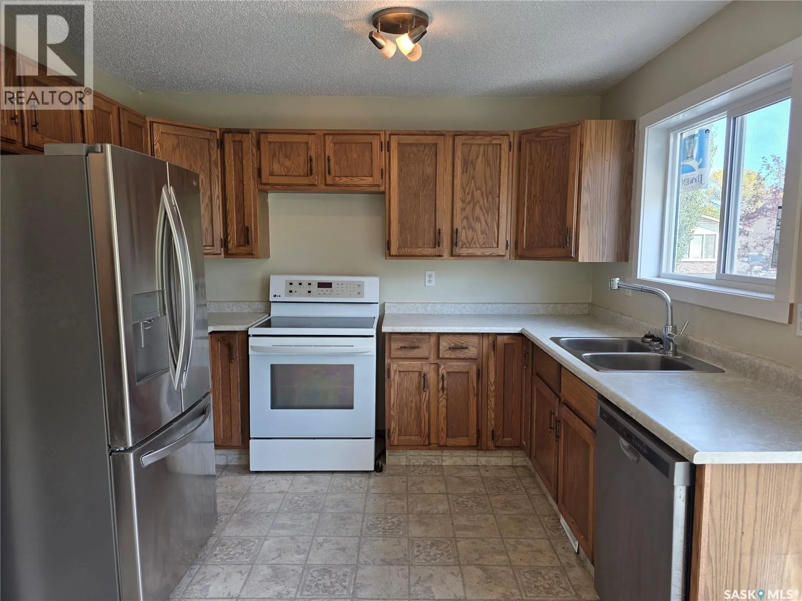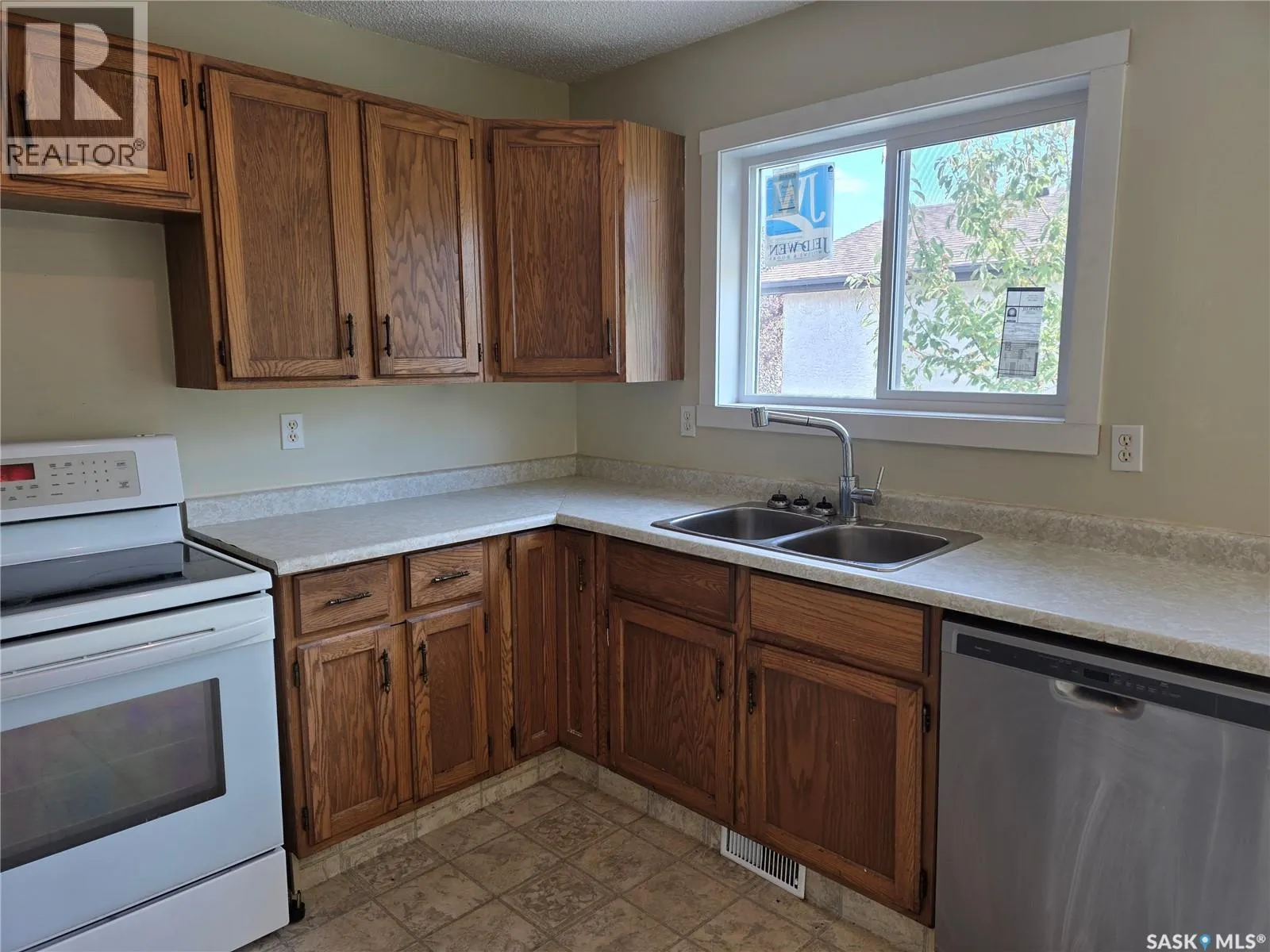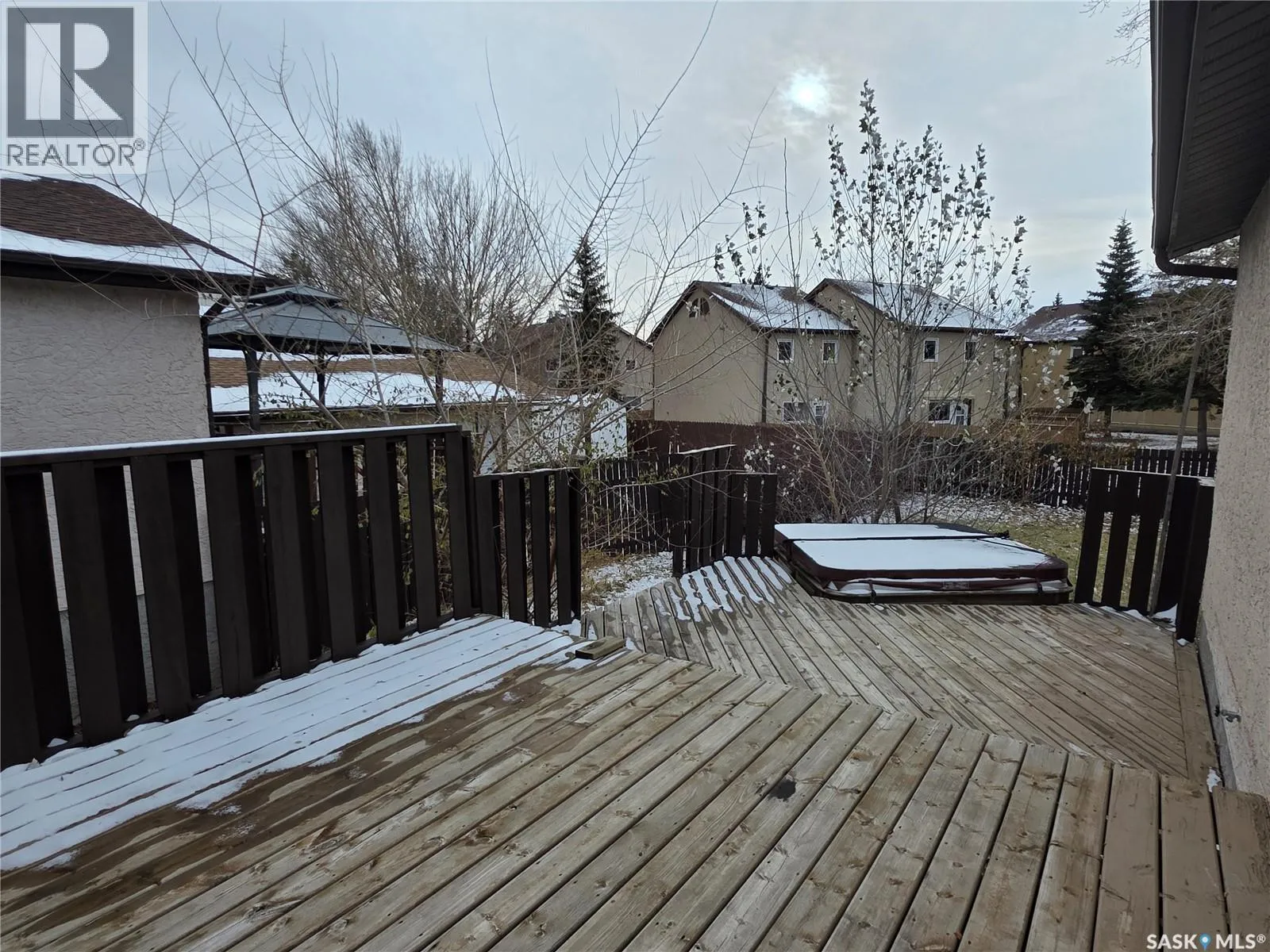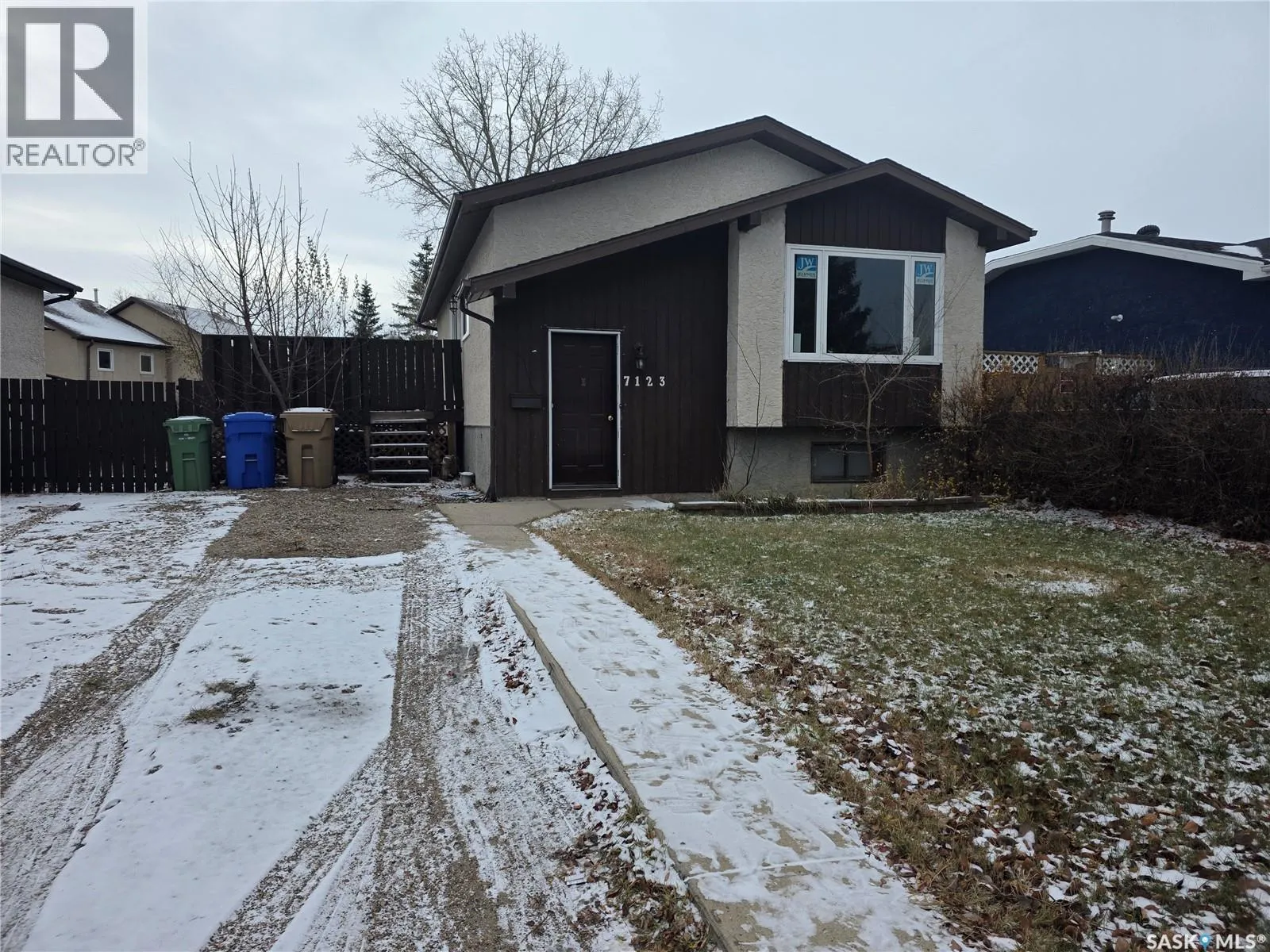 Starter home with major glow-up potentialâyour Pinterest board called, time to bring your ideas to life! This 2 bedroom, 1 bathroom bi-level offers 899 sqft of potential and is ready for a new family to make it their own. With a little paint, new flooring, and your personal touch, this house can easily become your home. The bright front-facing living room is filled with natural light and flows into the kitchen and eat-in dining space. Patio doors lead to a double-tiered side deckâperfect for BBQ nights and watching the kids play. The kitchen comes complete with fridge, stove, and dishwasher. Two bedrooms and a full bath finish off the main floor. The basement is already framed for a future rec room, den, bathroom, and utility/laundry area, giving you a head start on creating extra living space. Practical updates include newer shingles, updated windows on the main level, and central A/C for summer comfort. Step outside to a fully fenced backyard where kids and pets can play safely, plus enjoy cherry and plum trees right in your own yard! A front gravel driveway provides plenty of off-street parking for you and your guests. All of this is located in the family-friendly neighborhood of Rochdale Park in NW Regina, walking distance to the NW Leisure Centre, Doug Wickenheiser Arena, parks, and tons of nearby amenities. (id:27476)