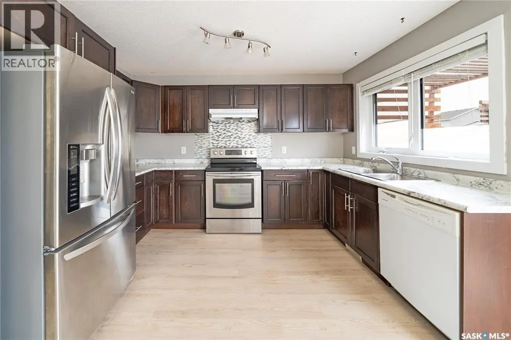 Welcome to this beautifully maintained two-storey detached home located in the heart of Harbour Landing, one of Reginaâs most sought-after neighbourhoods. This spacious home offers three bedrooms on the second floor, including a large master bedroom with a private 4-piece ensuite and his-and-hers closets, along with an additional 4-piece bathroom for family or guests. The main floor features stylish laminate and vinyl plank flooring, a cozy 2-piece bathroom, and a convenient pantry. Youâll love spending summer evenings with your family on the charming front veranda, perfect for relaxing outdoors. The fully finished basement adds even more living space, with two additional bedrooms, a full 4-piece bathroom, and a separate storage room â ideal for extended family, guests, or rental potential. Outside, enjoy a beautifully landscaped yard with an upgraded deck and pergola, perfect for entertaining. The home also includes a 2-car concrete parking pad at the back. Located just steps from Harbour Landing School and Norseman Park, and close to major commercial amenities like Walmart, Winners, restaurants, and shops, this home combines comfort, convenience, and charm in one perfect package. (id:27476)