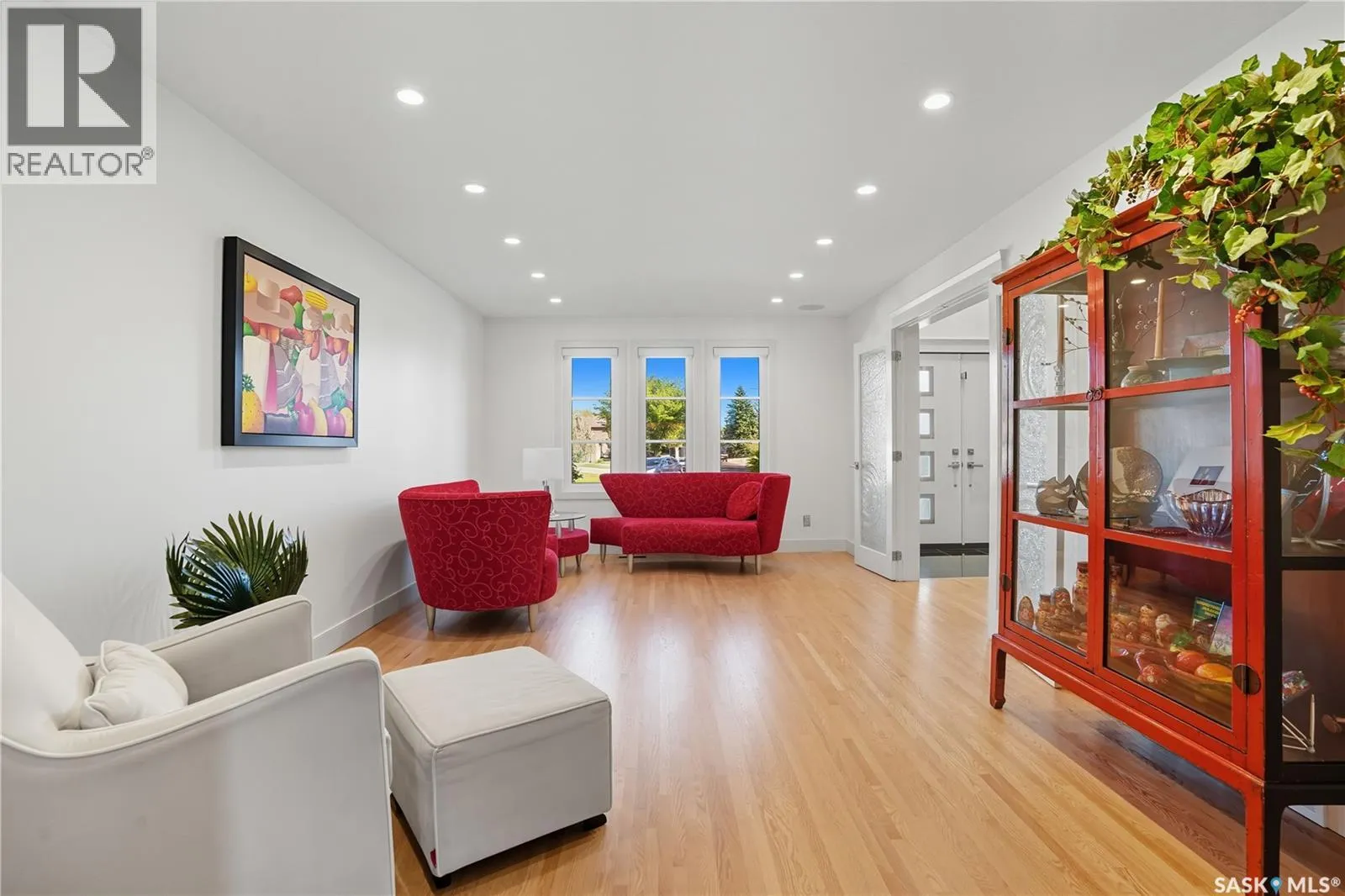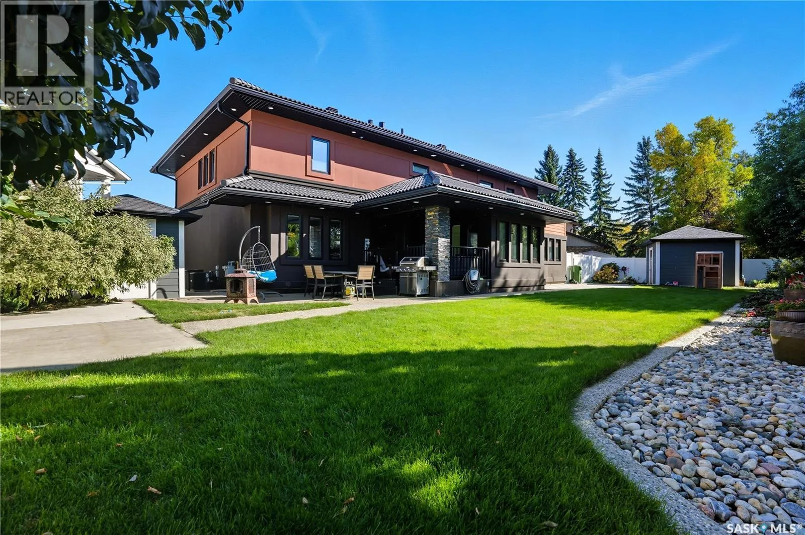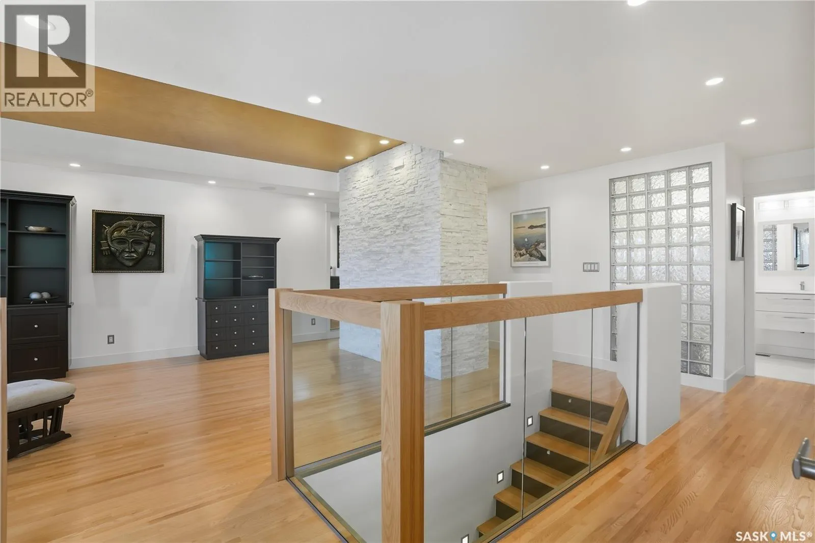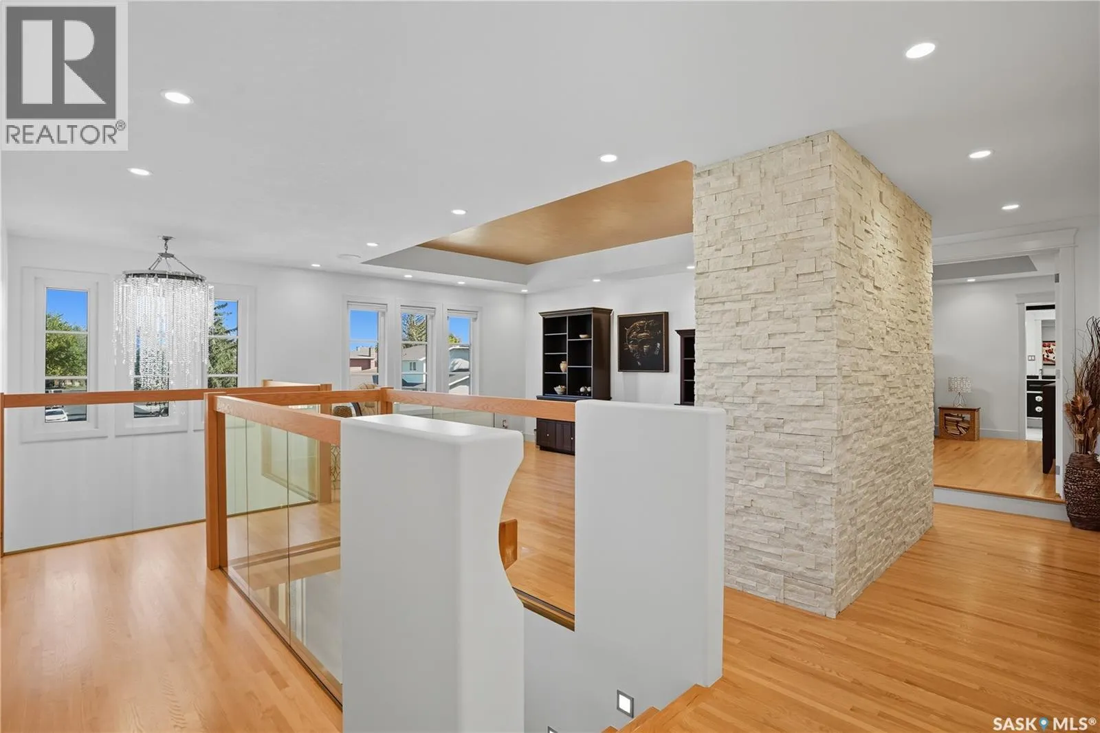 Welcome to 34 Leslie Place, a quiet bay in Reginaâs desirable Albert Park. This extensively renovated home blends elegance, comfort, and functionalityâready for immediate enjoyment. The grand entryway opens to a sunken living room with a 2-way gas fireplace and white quartz surround, a central wood-tile staircase, family room, and formal dining area overlooking the backyard. Custom hardwood floors flow throughout. The kitchen features warm wood cabinetry, granite countertops, tile flooring, double stainless sinks, a fireplace, and a cozy breakfast nook. A 2-piece bath and office/den with private entranceâcurrently a salonâcomplete the main floor. Upstairs, a bonus room overlooks a crystal chandelier and highlights custom woodwork, a gas fireplace, coffered ceiling, pot lights, and built-in sound. The luxurious 5-piece bath offers double sinks, glass block accents, and a seating area. The spacious primary suite includes two private balconies, dual closets (including built-in shoe storage), and a spa-like ensuite with soaker tub, walk-in shower, and water closet. Three additional bedrooms complete the upper level. The finished basement features a soundproof entertainment room, bedroom, 3-piece bath, and laundry with sink and cabinetry. Outside, enjoy a fully landscaped corner lot with stone/stucco exterior, wood accents, custom lighting, and double drive. The attached heated double garage features epoxy flooring, a custom aluminum and glass overhead door, and ample storage space. The PVC-fenced backyard includes a private, covered deck with lighting, and a stone patio. Value-added features: built on piles, exterior EIFS envelope, tile roofing system, natural gas BBQ hookup, central A/C, Control4 system, alarm, 200-amp panel, sewer backflow valve, HRV, hi-eff furnaces with humidifiers, and more. All drawings and improvement details available. A rare find in a prime locationâcall your agent today. (id:27476)