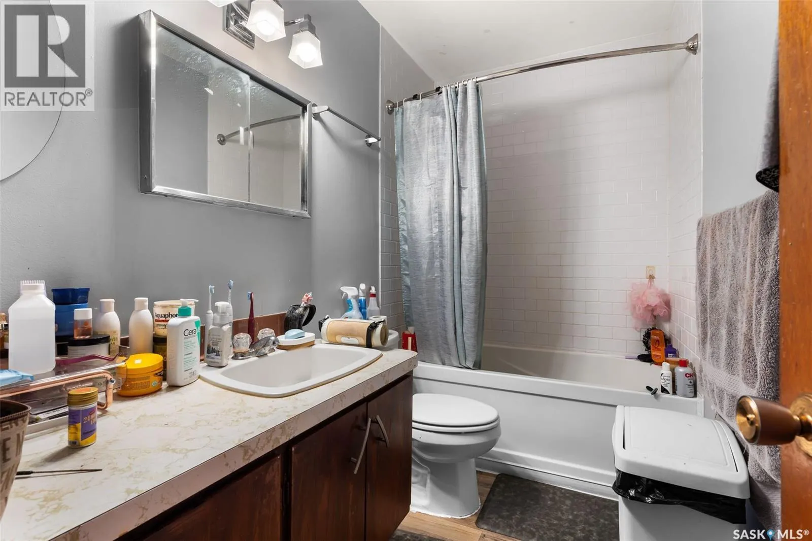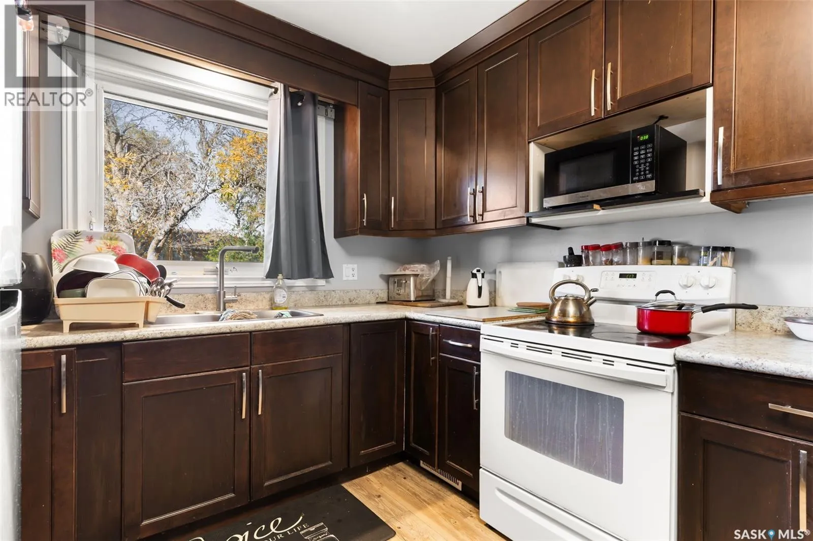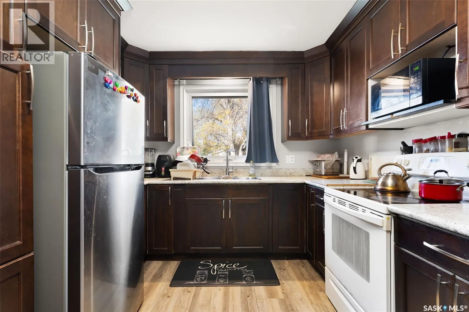 This solid duplex offers a fantastic opportunity for both homeowners and investors, featuring four bedrooms and two bathrooms. Unit is to be sold with attached property at 1437 Rupert Street (MLS #SK020175) Seller will only accepted offers for both sides. This side has been thoughtfully renovated, showcasing newer upstairs windows (excluding the living room), fresh paint throughout, updated fixtures, and high-quality laminate flooring. The kitchen and dining area have been opened up for a more modern flow, complemented by updated counters, cupboards, sink, and taps. The main four-piece bathroom includes a newer tub surround, while the basement boasts spray foam insulation, a generous family area, a large bedroom, a three-piece bath, laundry space, and an upgraded electrical panel. (Please note that basement bedroom window may not meet egress standards). The backyard is fully fenced, with a chain-link divider separating the two yards, and ample level parking adds to the convenience. Please contact your Realtor for more information on rental numbers or personal tour. (id:27476)