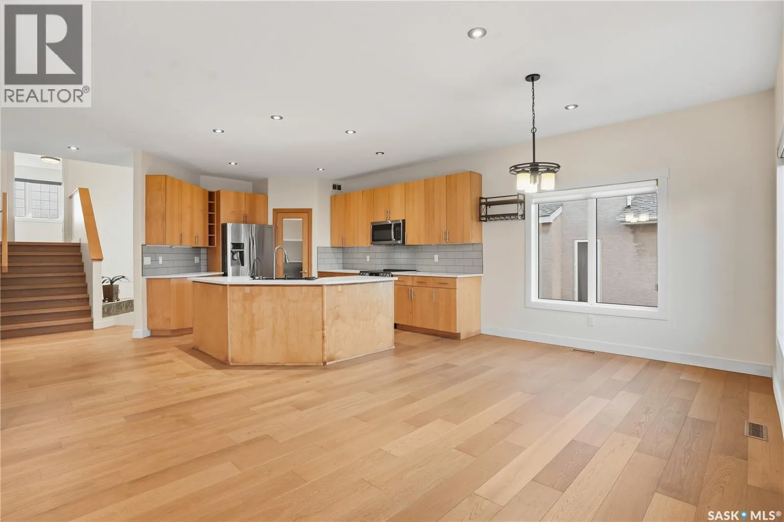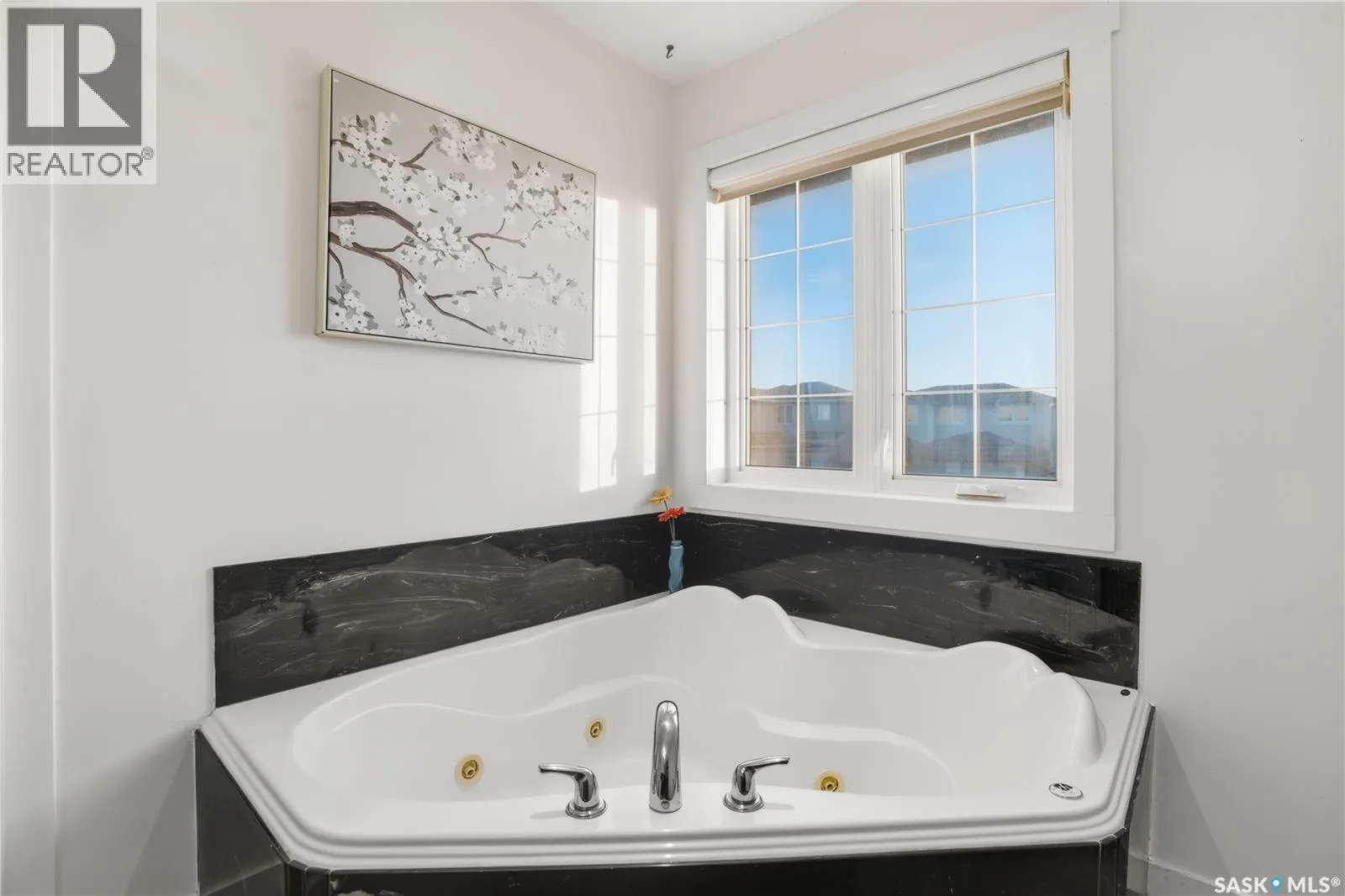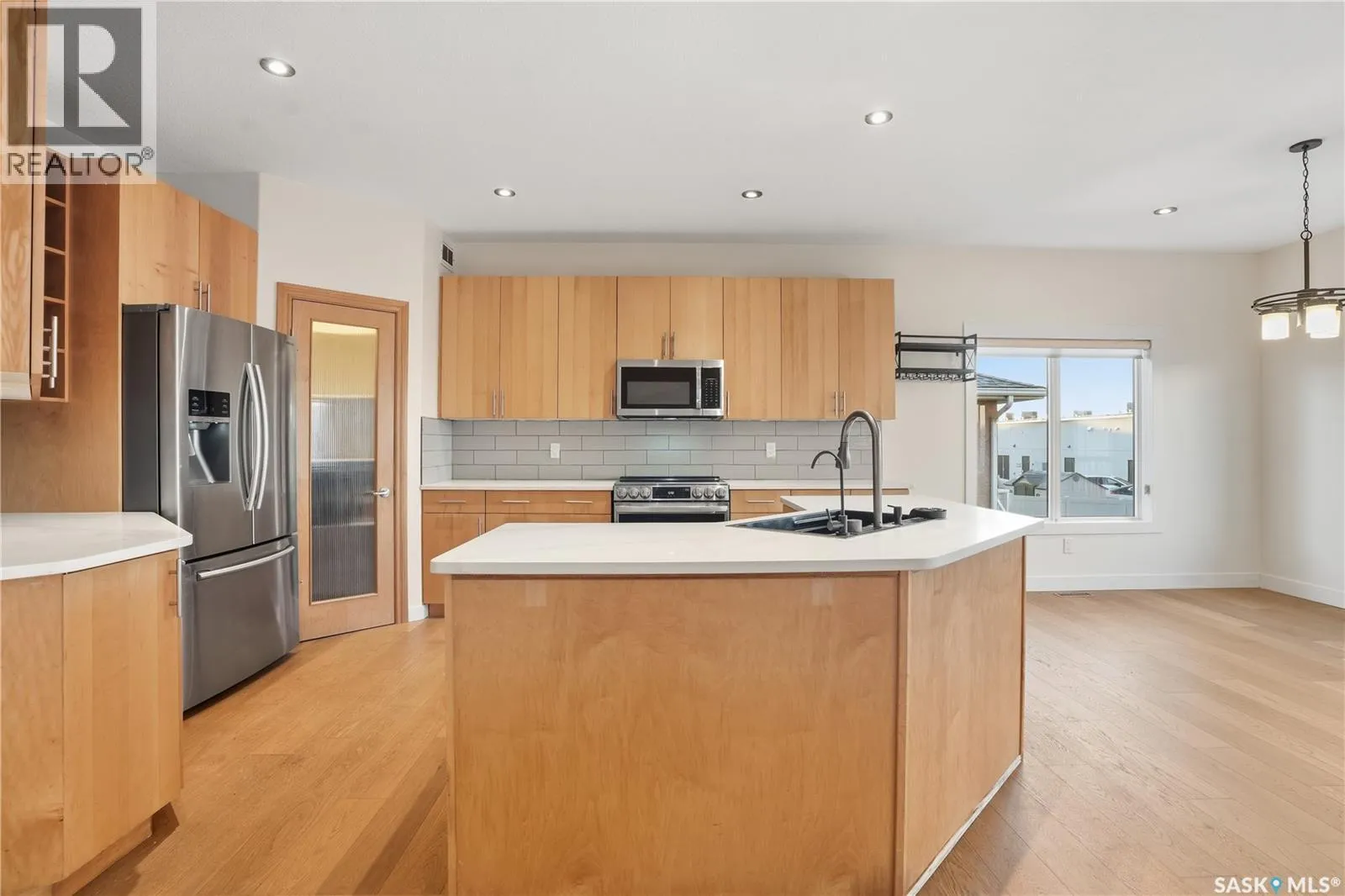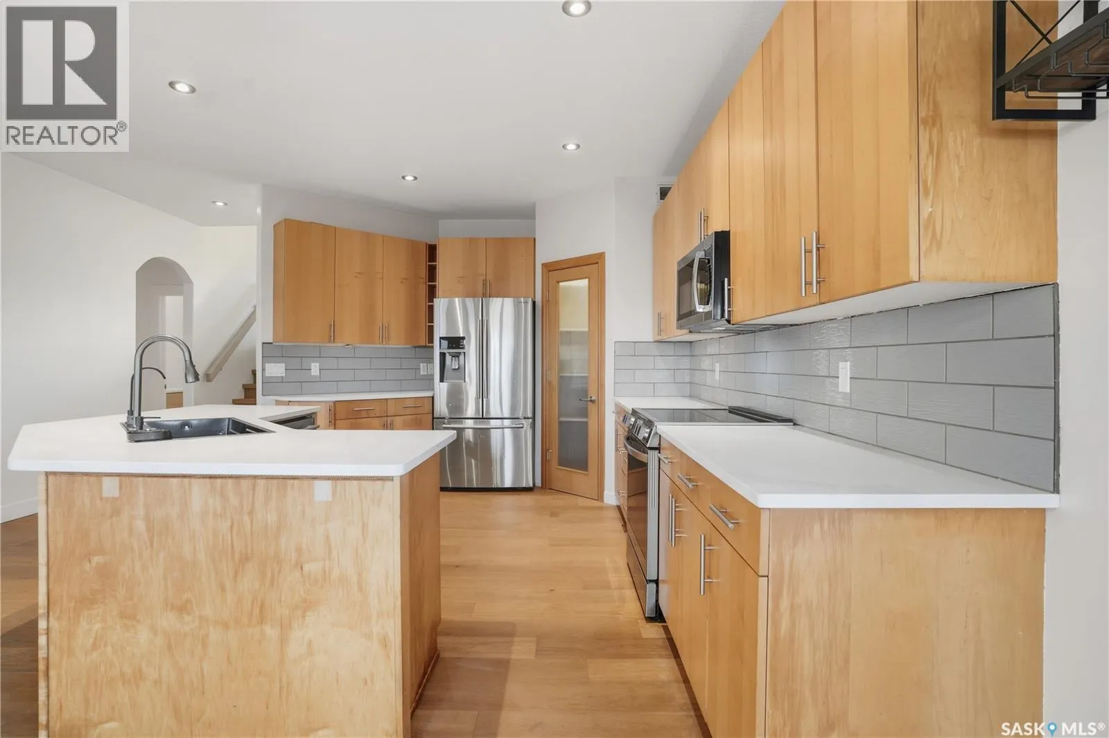 Welcome to this beautiful family home in Gardiner Park. Close to shopping, elementary school and all the east end amenities. As you enter into the large high ceiling foyer, you will immediately see the new engineering hardwoods, which are located throughout the main floor and second floor of the house. This house has an open concept layout and is filled with tons of natural light which pours through the abundance of windows. The kitchen comes complete with an eat-in nook and has extended maple cabinets with new quartz counter tops, stainless steel appliances. The kitchen opens up to the living room with a wall niche above the gas fireplace. A nice sized bedroom, a 4 piece bathroom and a big laundry room finished the main floor. The second level features a spacious master bedroom, with a large walk-in closet and ensuite that features a corner jetted tub surrounding in marble. The lower level is totally finished and includes a huge rec room , the 3rd bedroom, a big den which can be used us the 4th bedroom if needed, and a convenient 3 pc bathroom. The 4 feet windows give the lower level that nice open feeling. The utility room has tons of room for storage or a hobby room. Double 24' x 22' attached garage is insulated & boarded. Nice sized deck overlooks the backyard with lawn and garden area, low maintenance front yard. Upgrade recent years includes but not limited to: new shingles in 2025, new engineering hardwood flooring on main floor, second floor and stairs to the basement in 2025, new quartz kitchen counter tops in 2025, new vinyl plank flooring in the basement in 2025, new microwave hood fan and kitchen sink in 2025, etc. As per the Sellerâs direction, all offers will be presented on 10/16/2025 5:00PM. (id:27476)