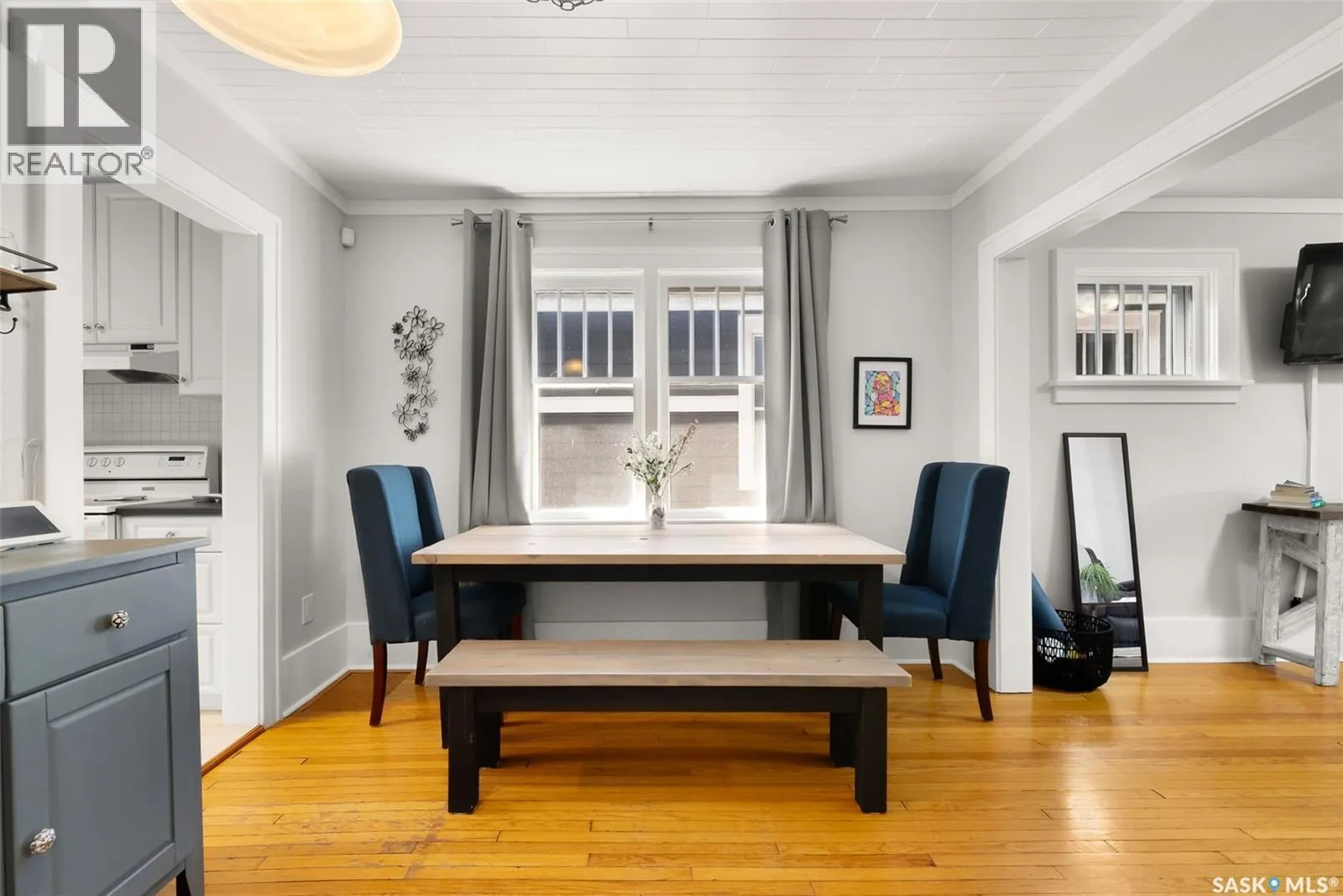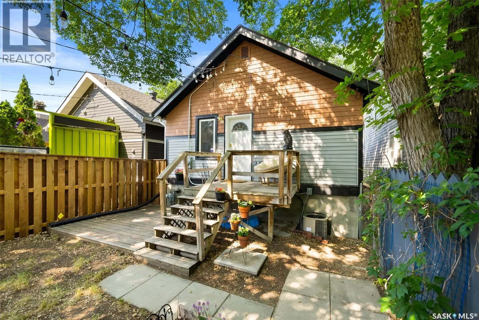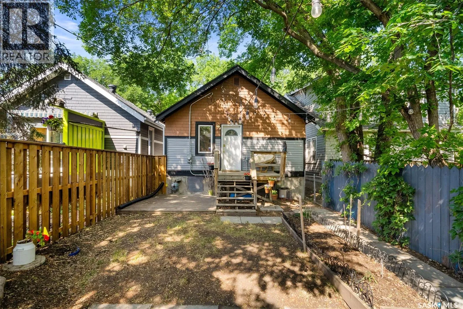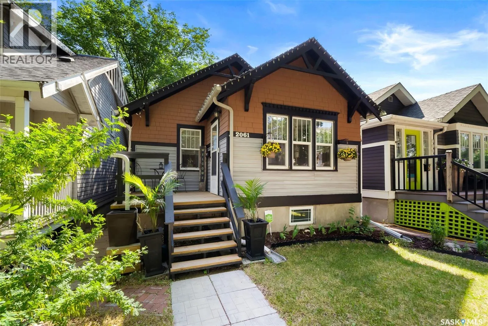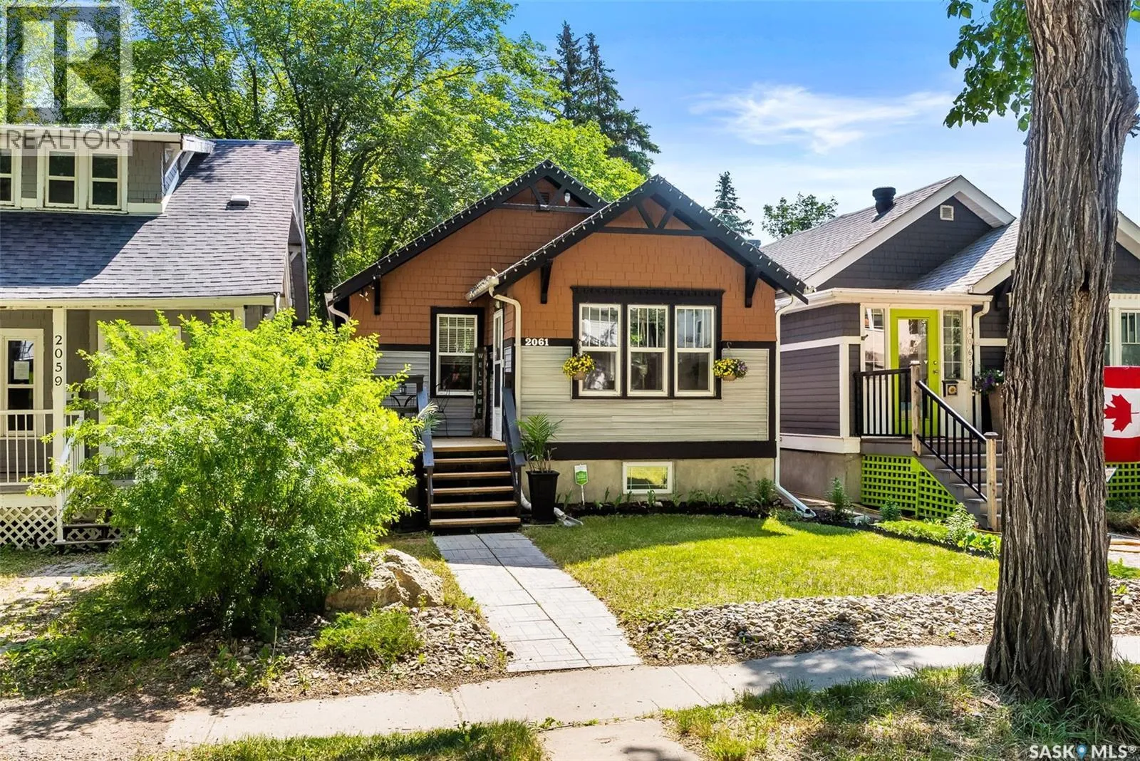 Welcome to 2061 Elphinstone Streetâperfectly situated in the heart of Reginaâs sought-after Cathedral neighborhood. Just steps from 13th Avenueâs trendy coffee shops, restaurants, and boutiques, and within walking distance to Mosaic Stadium, Brandt Centre, and Evraz Place, this home offers unbeatable access to local events and amenities. Inside, this inviting bungalow features a bright, sunlit sitting room, spacious living and dining areas, and original hardwood flooring that adds timeless character. Classic details like tall baseboards, crown molding, and plaster accents enhance the cozy atmosphere. The white kitchen offers a full appliance package and a unique foldaway pantry hatchâblending charm with functionality. The main floor includes two generously sized bedrooms and a beautifully updated 4-piece bathroom complete with vinyl plank flooring, a clawfoot tub, and modern vanity. Additional features include central A/C, a security system, and basement laundry. Enjoy the fully fenced and landscaped backyard with garden beds, patio space, single detached garage, and extra parking via the rear alley. Seller states upgrades include a full electrical replacement and new panel (2021), and half the windows replaced in 2023. Live the Cathedral lifestyleâwalk to the farmers market, catch a concert, or relax with a book from a local Little Free Library. Donât miss your chance to own this charming home in one of Reginaâs most vibrant communities. Book your showing today! (id:27476)