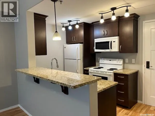 Easy Lifestyle Condo living in the prestigious Bellagio located in Hillsdale across from Wascana Lake with great access to the U of R, Downtown and all of Regina's South amenities. Well kept one bedroom condo unit boasts modern kitchen cabinets with eating bar, granite counter tops including bathroom, all appliances, fridge stove built in dishwasher, microwave hood fan, garburator in suite laundry with stackable washer dryer, spacious bedroom with walk thru closet to 4 piece bath and direct entry off living room to covered deck. This unit has been professionally painted in the last month. Underground parking. amenities and exercise room. (id:27476)