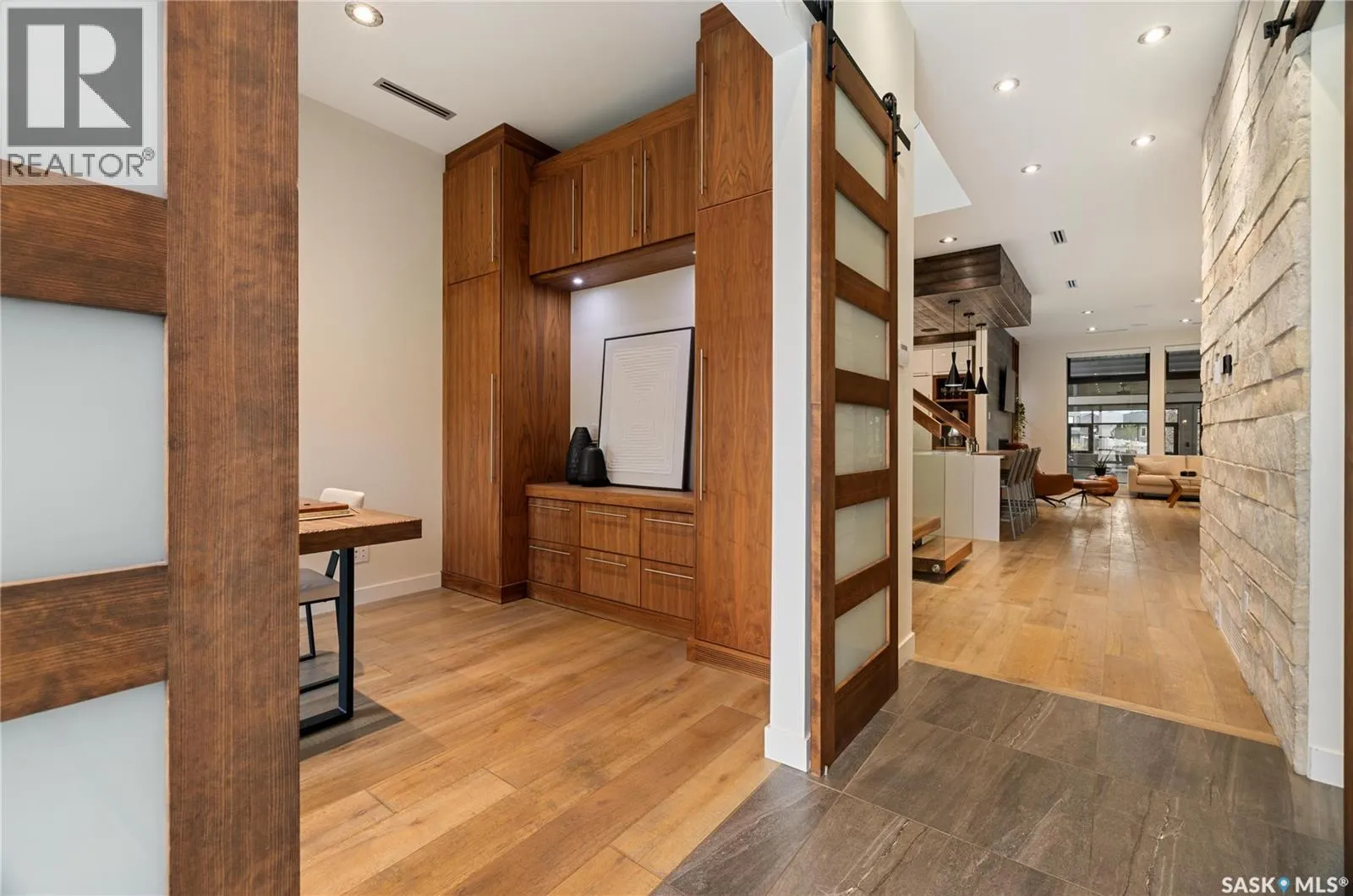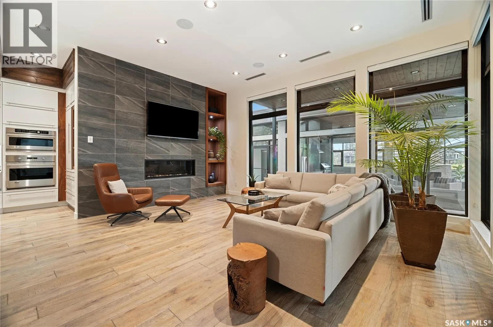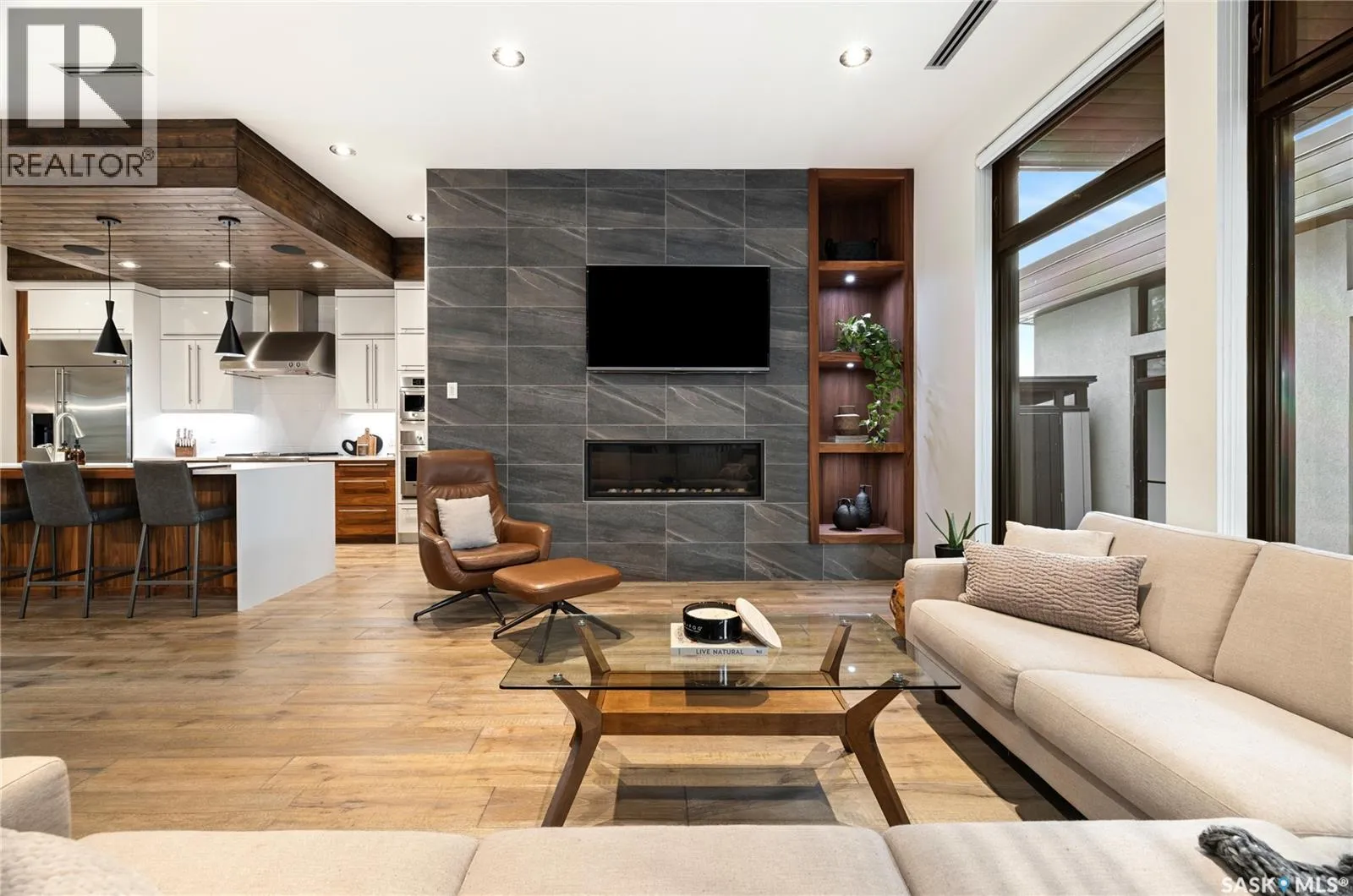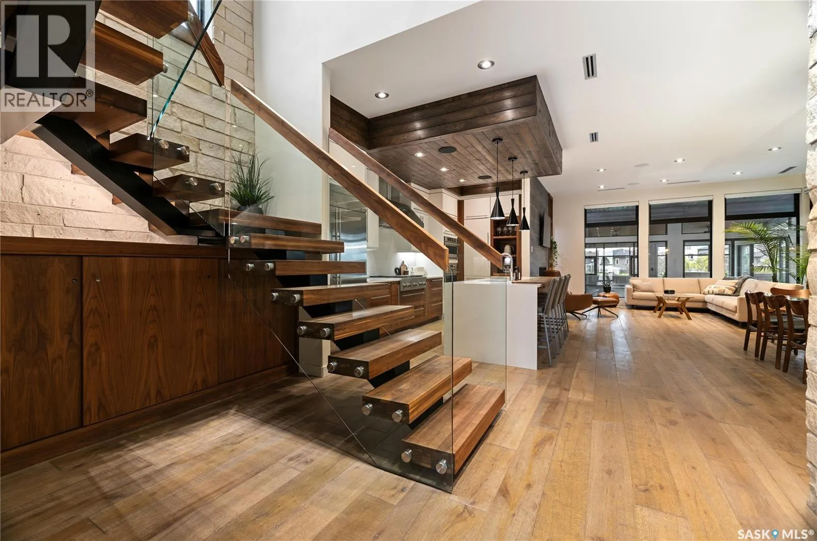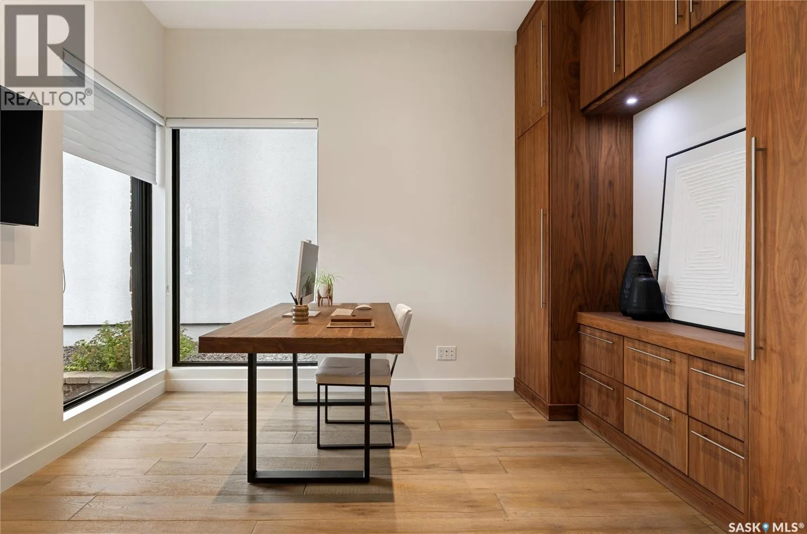 This is more than a homeâitâs an experience. Where modern design meets timeless elegance, every detail invites you to slow down & take it in. Floor-to-ceiling windows flood the main level with natural light, framing views of the park & your private pool. The open living area centers around a striking fireplace, while the walnut & white two-tone kitchen delivers both warmth & sophistication. The dining area is complemented by a glass wine cellar & a versatile reading nook or gym that opens directly to the pool terrace. A front office with custom walnut built-ins provides a refined workspace. Upstairs, the primary suite is a true retreatâcomplete with a private terrace for sunset views, a spa-inspired ensuite with a deep soaker tub, & elegant finishes throughout. The upper-level family lounge features a coffee bar, study nook, & access to the covered terrace, perfect for morning light or evening calm. Down the hall, two bedrooms with built-ins share a stylish 4-piece bath, while a private guest bedroom enjoys its own balcony overlooking the street. A flexible den or dance room offers space for yoga, hobbies, or quiet escape. Step outside to your private backyard oasis featuring a three-season pool house & a serene park backdrop. Built using Bone Structure® steel framing, this home stands apart for its precision engineering & efficiencyâSIP panel construction, in-floor heating, forced-air on-demand heat/cooling, & spray foam insulation for comfort & sound control. Recognized with the 2015 RRHBA Innovation Award, it was crafted by its original builder-owner with no detail overlooked. Every surface, texture, & sightline was designed to elevate the sensesâfrom ceramic wood-look floors & rich walnut detailing to soaring ceilings & ever-changing natural light. Experience the difference. Schedule your private viewing today. (id:27476)