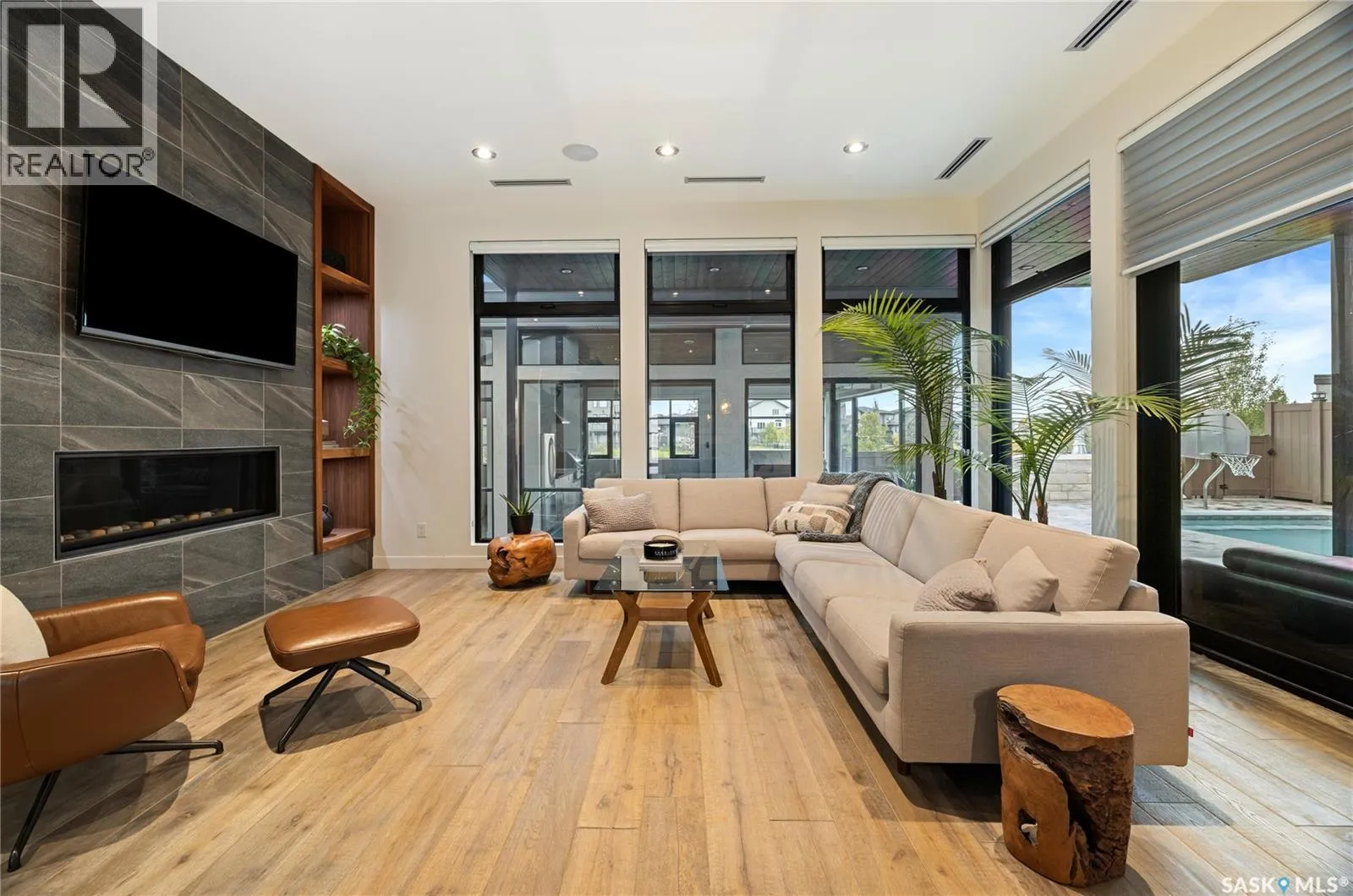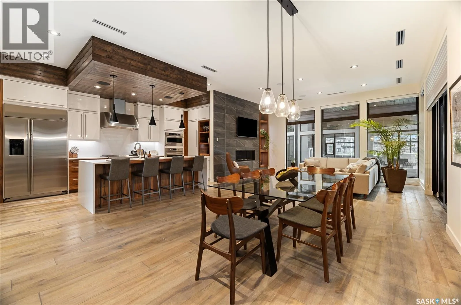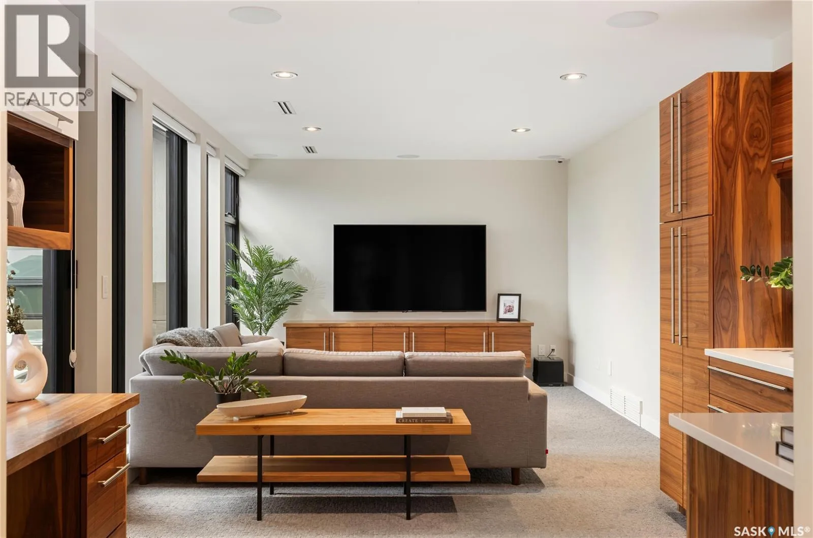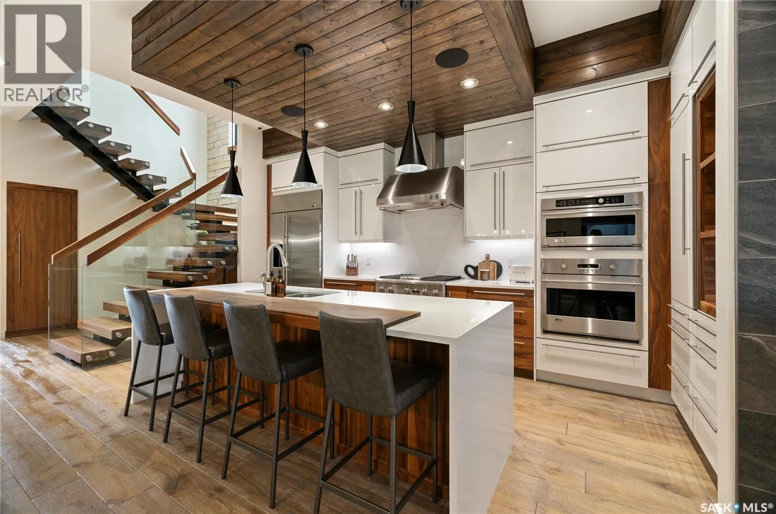 This is more than a homeâitâs an experience. Where modern design meets timeless elegance, every detail invites you to slow down & take it in. Floor-to-ceiling windows flood the main level with natural light, framing views of the park & your private pool. The open living area centers around a striking fireplace, while the walnut & white two-tone kitchen delivers both warmth & sophistication. The dining area is complemented by a glass wine cellar & a versatile reading nook or gym that opens directly to the pool terrace. A front office with custom walnut built-ins provides a refined workspace. Upstairs, the primary suite is a true retreatâcomplete with a private terrace for sunset views, a spa-inspired ensuite with a deep soaker tub, & elegant finishes throughout. The upper-level family lounge features a coffee bar, study nook, & access to the covered terrace, perfect for morning light or evening calm. Down the hall, two bedrooms with built-ins share a stylish 4-piece bath, while a private guest bedroom enjoys its own balcony overlooking the street. A flexible den or dance room offers space for yoga, hobbies, or quiet escape. Step outside to your private backyard oasis featuring a three-season pool house & a serene park backdrop. Built using Bone Structure® steel framing, this home stands apart for its precision engineering & efficiencyâSIP panel construction, in-floor heating, forced-air on-demand heat/cooling, & spray foam insulation for comfort & sound control. Recognized with the 2015 RRHBA Innovation Award, it was crafted by its original builder-owner with no detail overlooked. Every surface, texture, & sightline was designed to elevate the sensesâfrom ceramic wood-look floors & rich walnut detailing to soaring ceilings & ever-changing natural light. Experience the difference. Schedule your private viewing today. (id:27476)