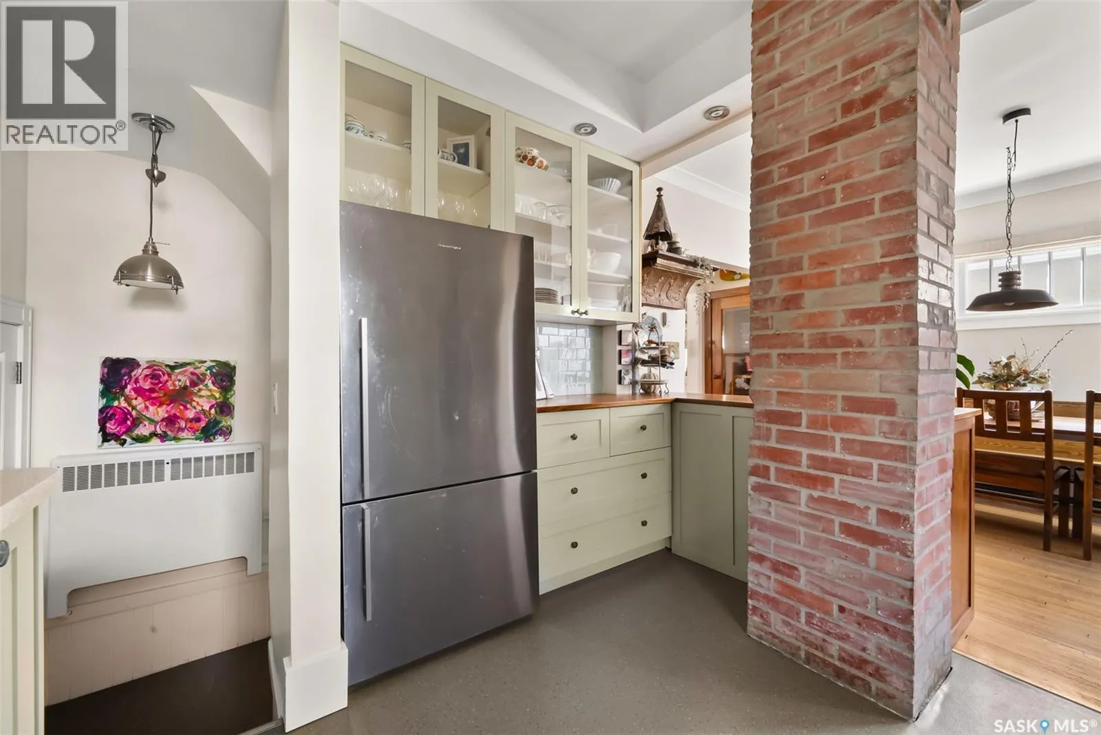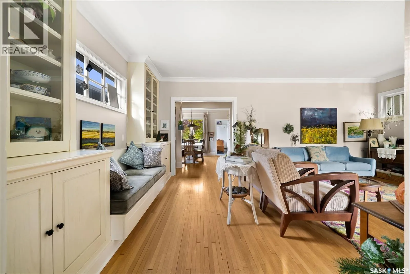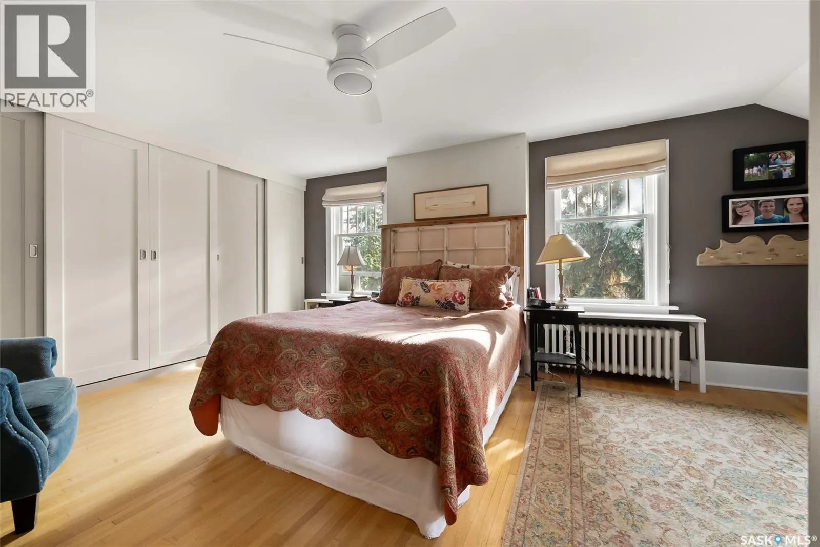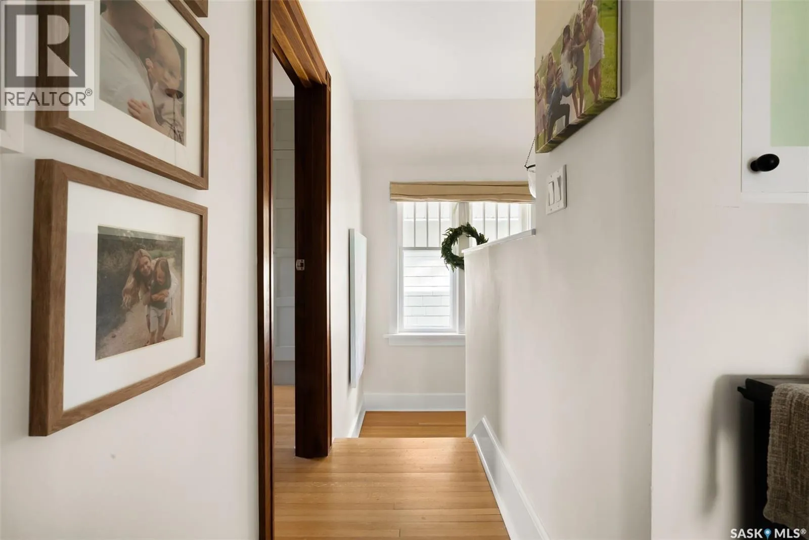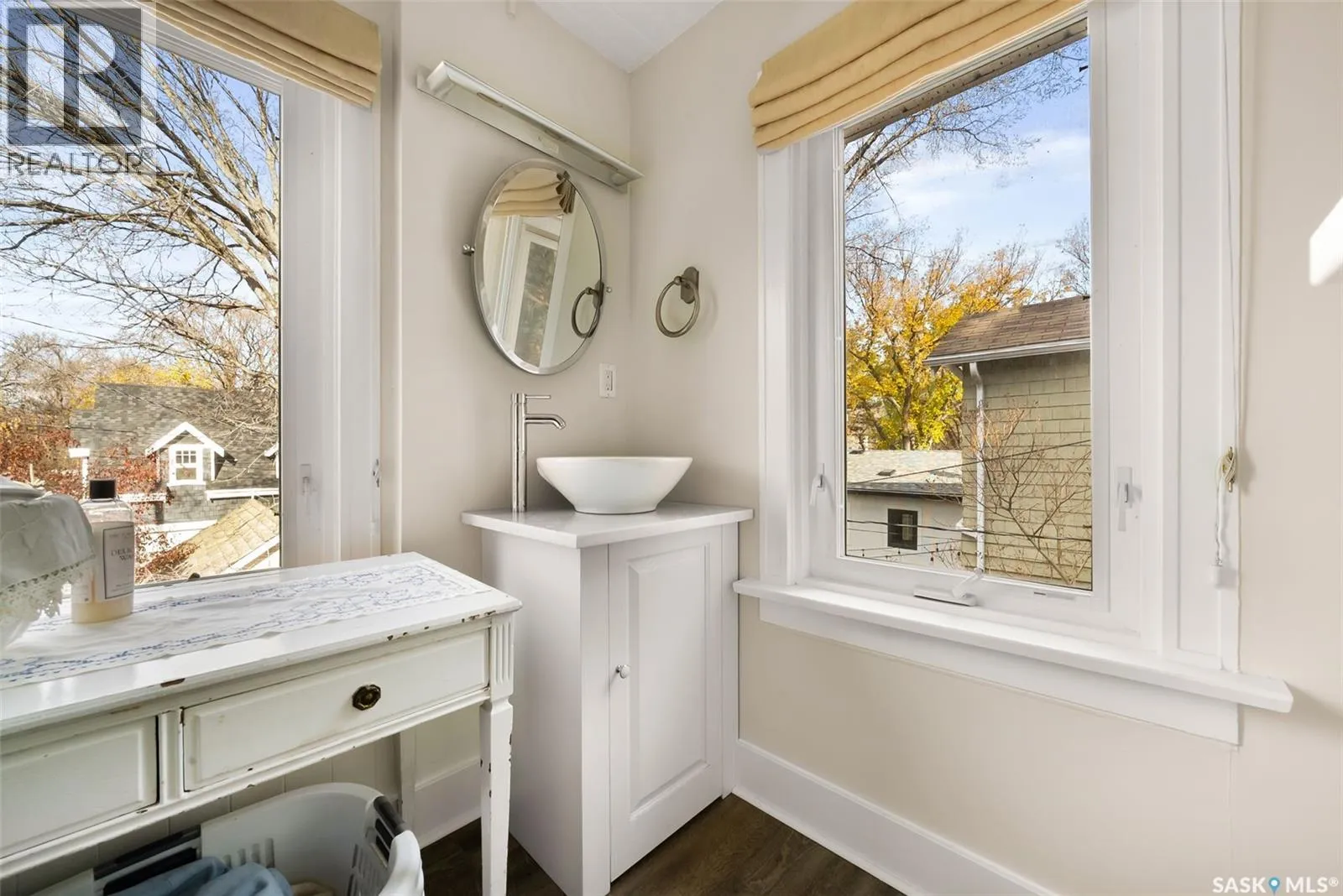 Location, location, Location! This solid 2 storey character home is located in the heart of Lakeview and has many thoughtful updates. Located on prestigious McCallum Avenue, just blocks from Lakeview Elementary School, Sheldon Williams Collegiate, Wascana Park, Kiwanis Park and Lakeview Park. The welcoming and bright front foyer has custom walnut closet doors. Hardwood floors flow throughout the living, dining, and sunroom. The front sunroom would be ideal for a home office or reading nook. The spacious living room features a gas fireplace, custom built-ins and bench seating. A custom walnut wine cabinet links the living and dining room, creating an elegant flow for entertaining. The beautiful kitchen blends heritage charm and modern finishes with quartz and walnut counters, glass tile backsplash, an exposed brick chimney plus Jennair and Fischer Paykel stainless appliances. The 2 piece powder room and mudroom with a door to the backyard completes the main level. Upstairs are two large bedrooms with handmade solid walnut doors. The primary bedroom has a full wall of built-in closets. The 2nd bedroom was converted from 2 bedrooms and could easily be converted back to make this a three bedroom home. There are 2 bathrooms, one is a 2 piece with the added convenience of 2nd floor laundry and the other is a 4 piece with ceramic tile. The developed basement has a bright rec room with laminate floors for added living space and a large utility area that houses the boiler and optional laundry area. The private backyard includes a pressure-treated deck with modern steel rails, mature perennials, trees and shrubs and a paver stone walkway to the single detached garage. This home is the perfect blend of classic character, quality updates, and one of Reginaâs most desirable locations â a true gem! (id:27476)