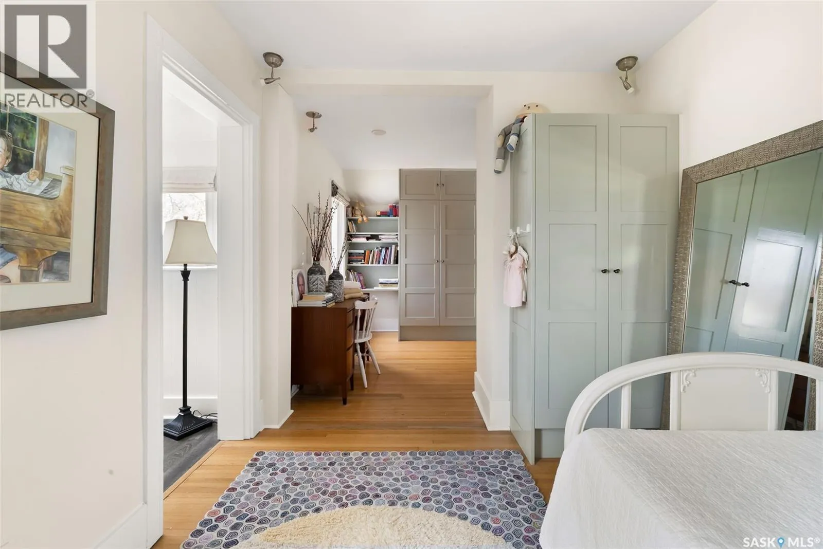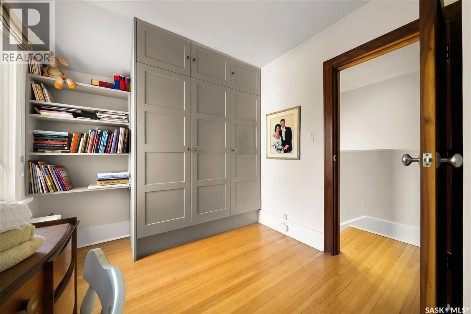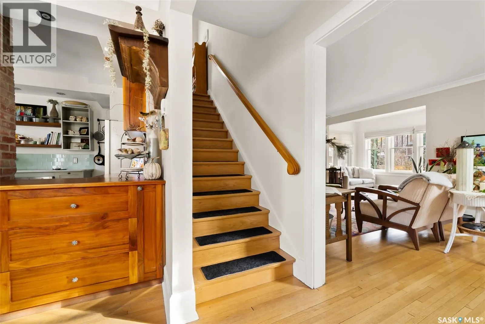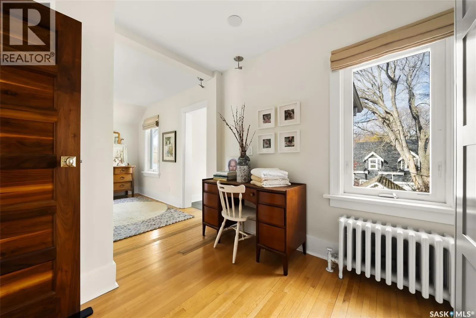 Location, location, Location! This solid 2 storey character home is located in the heart of Lakeview and has many thoughtful updates. Located on prestigious McCallum Avenue, just blocks from Lakeview Elementary School, Sheldon Williams Collegiate, Wascana Park, Kiwanis Park and Lakeview Park. The welcoming and bright front foyer has custom walnut closet doors. Hardwood floors flow throughout the living, dining, and sunroom. The front sunroom would be ideal for a home office or reading nook. The spacious living room features a gas fireplace, custom built-ins and bench seating. A custom walnut wine cabinet links the living and dining room, creating an elegant flow for entertaining. The beautiful kitchen blends heritage charm and modern finishes with quartz and walnut counters, glass tile backsplash, an exposed brick chimney plus Jennair and Fischer Paykel stainless appliances. The 2 piece powder room and mudroom with a door to the backyard completes the main level. Upstairs are two large bedrooms with handmade solid walnut doors. The primary bedroom has a full wall of built-in closets. The 2nd bedroom was converted from 2 bedrooms and could easily be converted back to make this a three bedroom home. There are 2 bathrooms, one is a 2 piece with the added convenience of 2nd floor laundry and the other is a 4 piece with ceramic tile. The developed basement has a bright rec room with laminate floors for added living space and a large utility area that houses the boiler and optional laundry area. The private backyard includes a pressure-treated deck with modern steel rails, mature perennials, trees and shrubs and a paver stone walkway to the single detached garage. This home is the perfect blend of classic character, quality updates, and one of Reginaâs most desirable locations â a true gem! (id:27476)