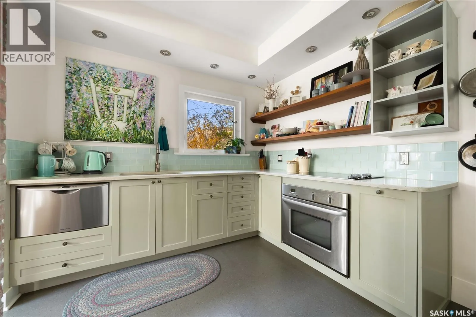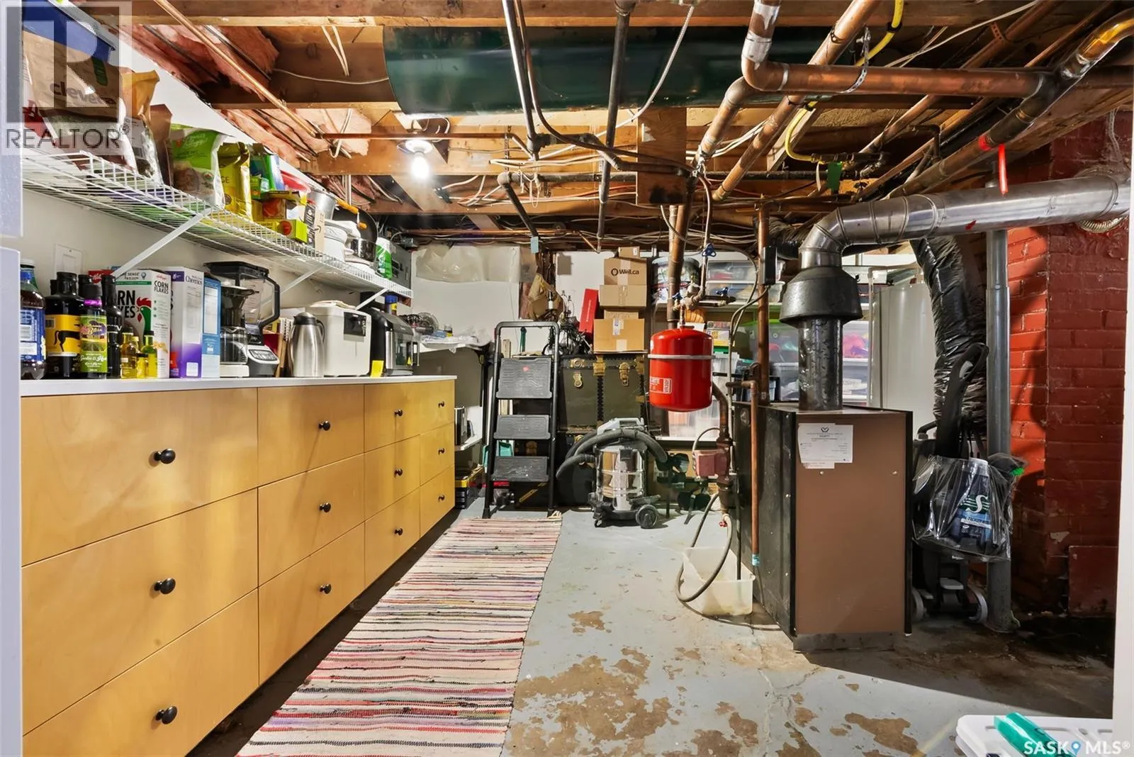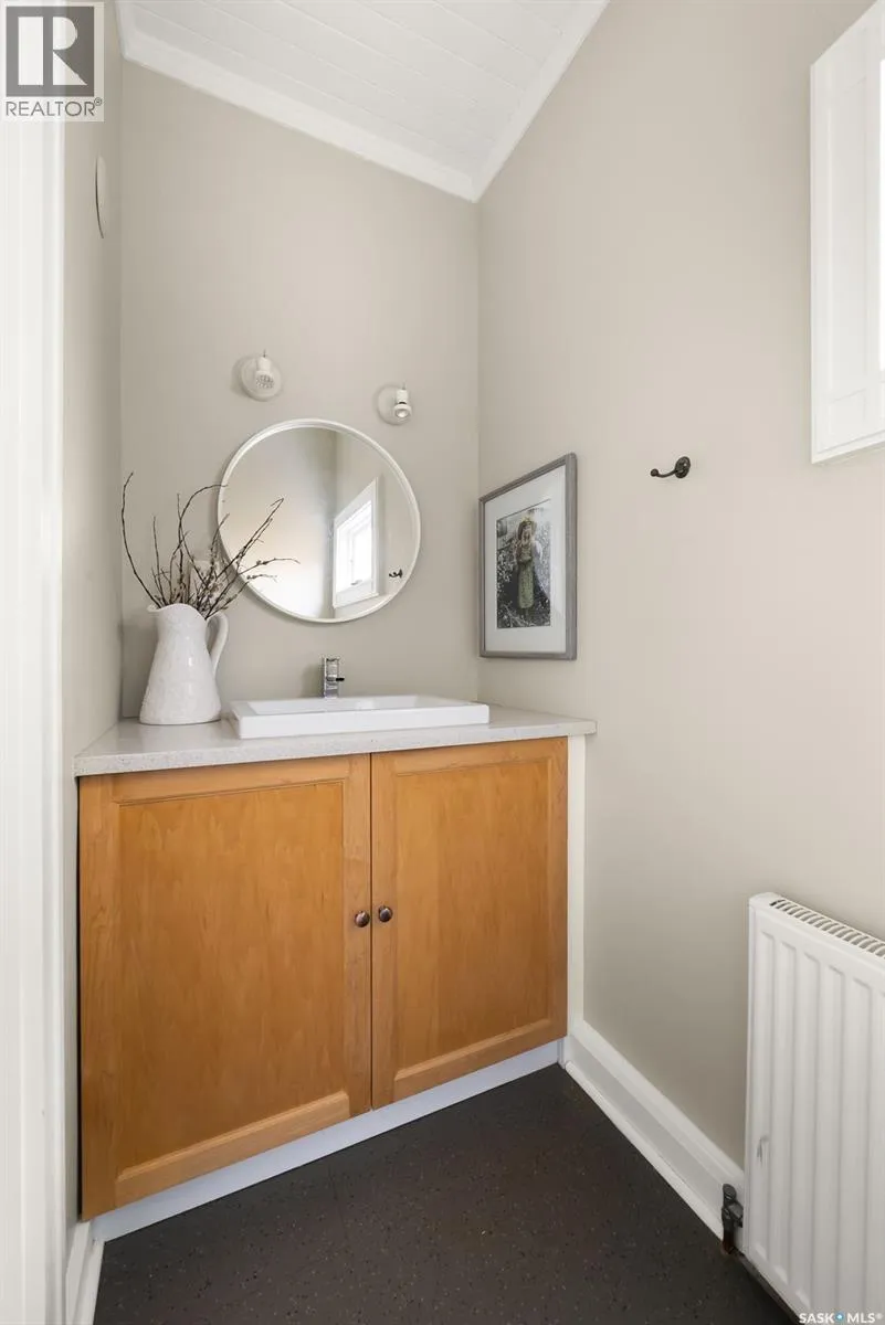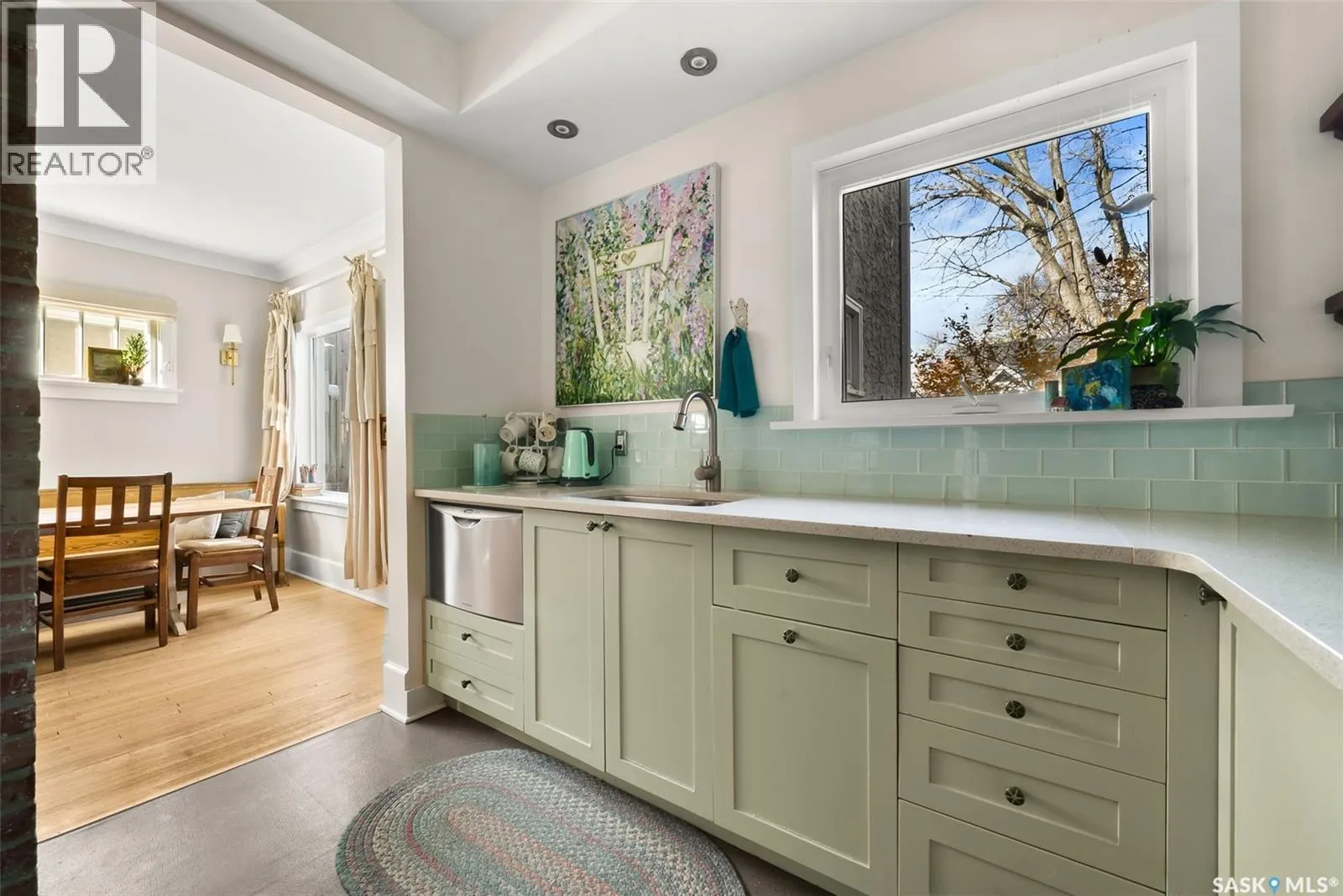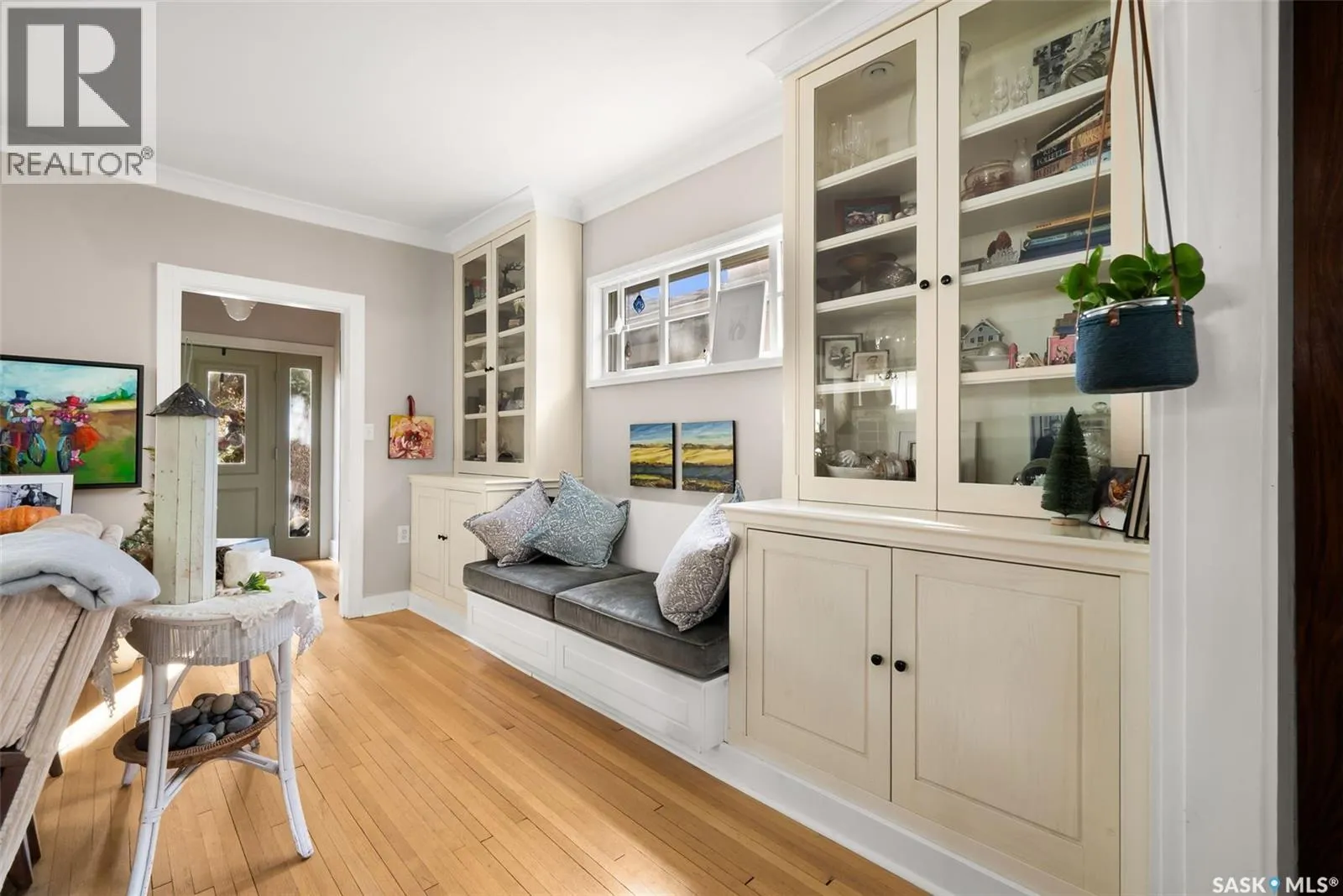 Location, location, Location! This solid 2 storey character home is located in the heart of Lakeview and has many thoughtful updates. Located on prestigious McCallum Avenue, just blocks from Lakeview Elementary School, Sheldon Williams Collegiate, Wascana Park, Kiwanis Park and Lakeview Park. The welcoming and bright front foyer has custom walnut closet doors. Hardwood floors flow throughout the living, dining, and sunroom. The front sunroom would be ideal for a home office or reading nook. The spacious living room features a gas fireplace, custom built-ins and bench seating. A custom walnut wine cabinet links the living and dining room, creating an elegant flow for entertaining. The beautiful kitchen blends heritage charm and modern finishes with quartz and walnut counters, glass tile backsplash, an exposed brick chimney plus Jennair and Fischer Paykel stainless appliances. The 2 piece powder room and mudroom with a door to the backyard completes the main level. Upstairs are two large bedrooms with handmade solid walnut doors. The primary bedroom has a full wall of built-in closets. The 2nd bedroom was converted from 2 bedrooms and could easily be converted back to make this a three bedroom home. There are 2 bathrooms, one is a 2 piece with the added convenience of 2nd floor laundry and the other is a 4 piece with ceramic tile. The developed basement has a bright rec room with laminate floors for added living space and a large utility area that houses the boiler and optional laundry area. The private backyard includes a pressure-treated deck with modern steel rails, mature perennials, trees and shrubs and a paver stone walkway to the single detached garage. This home is the perfect blend of classic character, quality updates, and one of Reginaâs most desirable locations â a true gem! (id:27476)