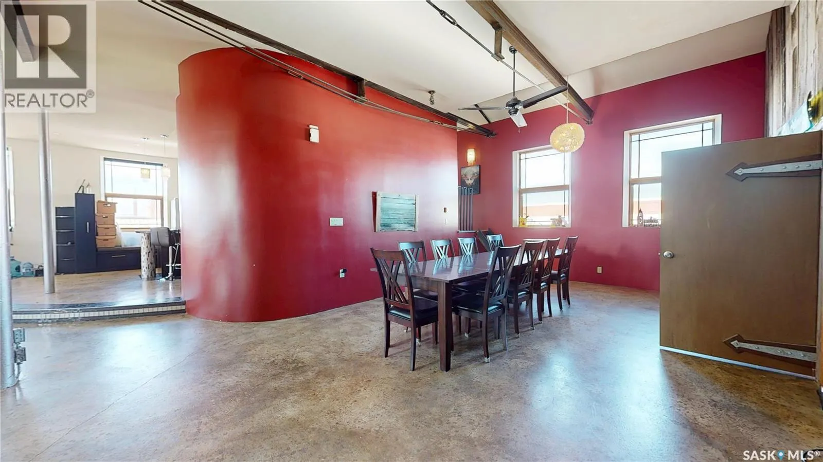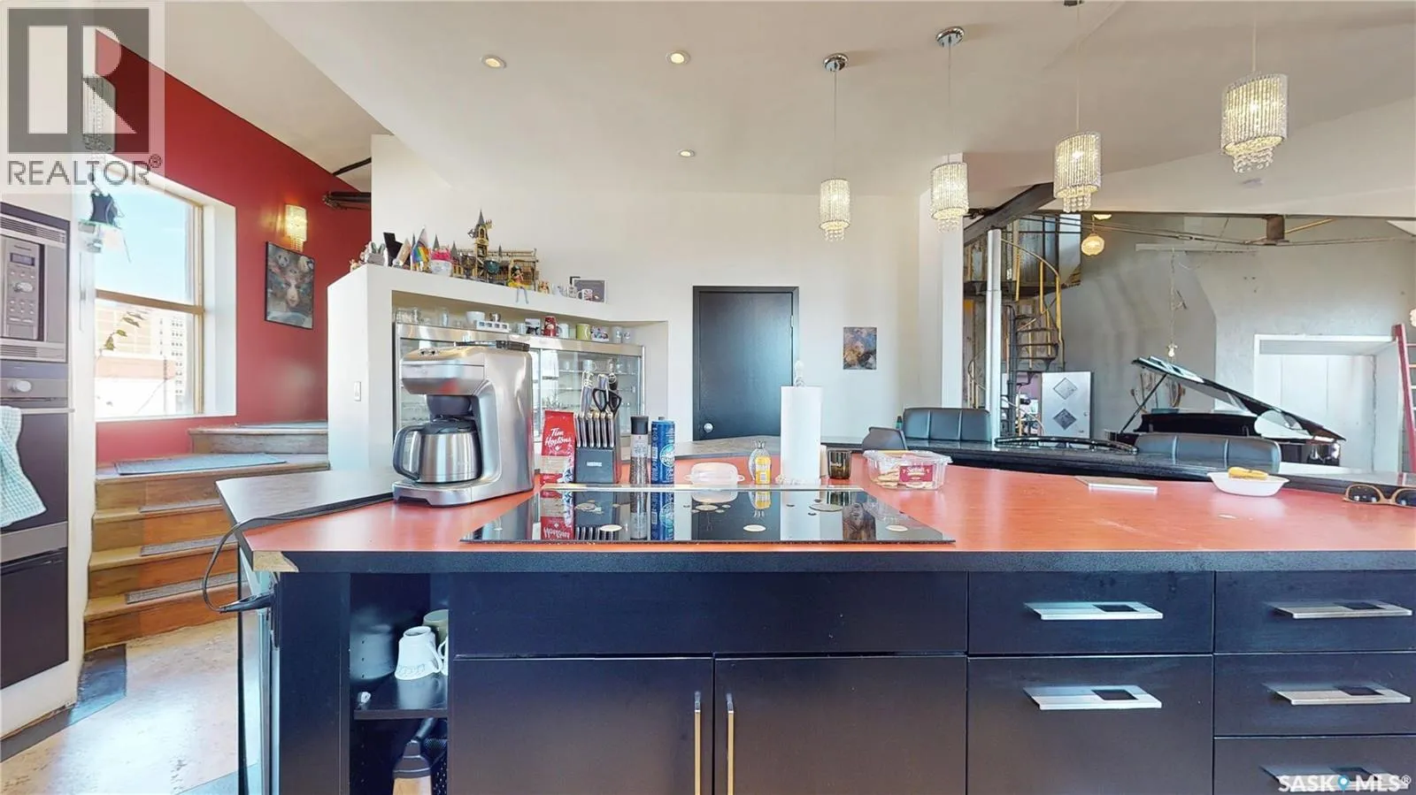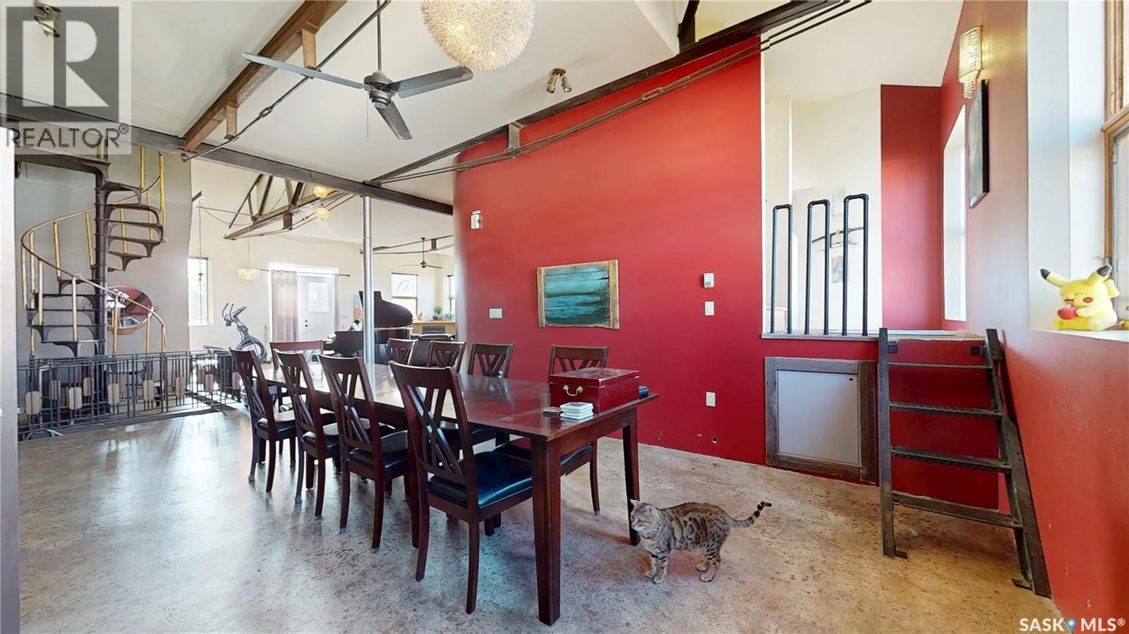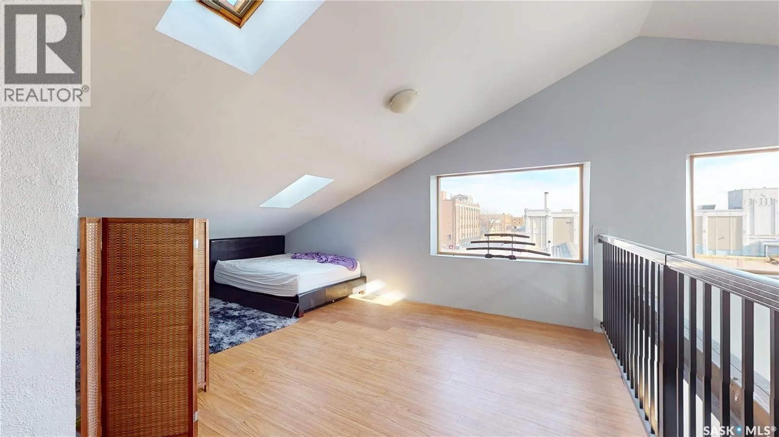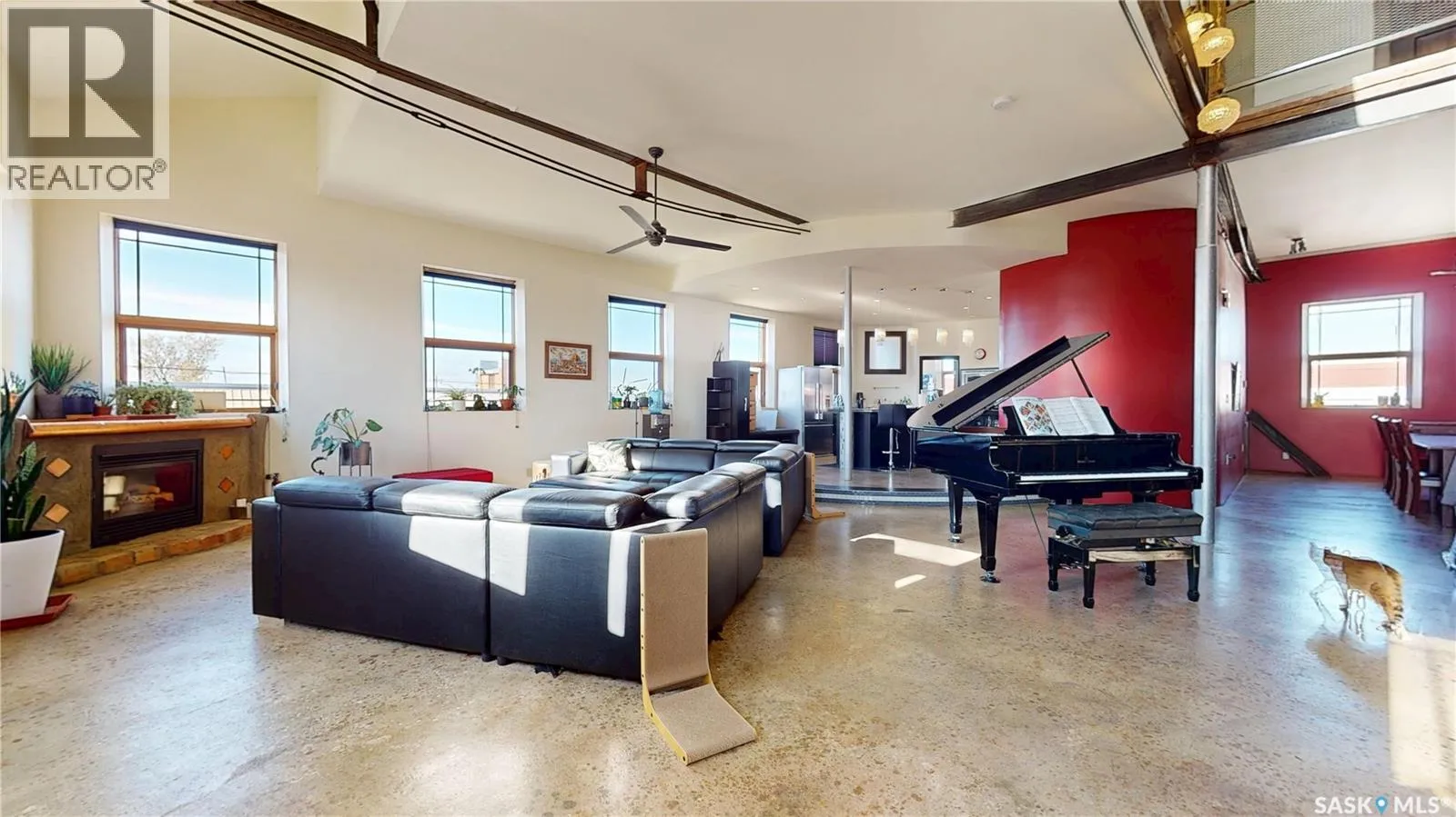 Welcome to one of Regina's most distinctive and impressive Warehouse District residences. This exceptional condo offers over 3,500 sq. ft. of living space, blending historic industrial charm with modern luxury. Perfect for professionals seeking a bold, inspiring environment, this unique property combines architectural character with practical design for both home and work life. Inside, you're greeted by soaring vaulted ceilings, 36 oversized windows, and multiple skylights, bathing every corner in natural light. The freight elevator serves as both a functional feature and a statement piece of the home's heritage. A spacious private balcony provides an ideal retreat for outdoor dining or relaxing under the city skyline - an incredibly rare amenity in the Warehouse District. Designed for flexibility, the open-concept floor plan features expansive living and dining areas, a large professional office, and a soundproof theatre room perfect for entertainment or presentations. The primary suite offers 2 generous walk-in closets and a spa-inspired en-suite with dual shower heads. High-end finishes, and architectural details highlight the unique character of this one-of-a-kind home. Additional features include a two-car attached garage, in-suite laundry, pet friendly policies, and proximity to downtown dining, breweries, and fitness studios. More than just a condo, this property represents an exclusive opportunity to live, work, and entertain in style at the heart of Regina's Warehouse community. 3,500+ sq. ft., 2 Bedrooms, Loft, 3 Bathrooms, 2-car Garage, Private Balcony, Pet Friendly, Low Condo Fees, In Floor Heating (id:27476)