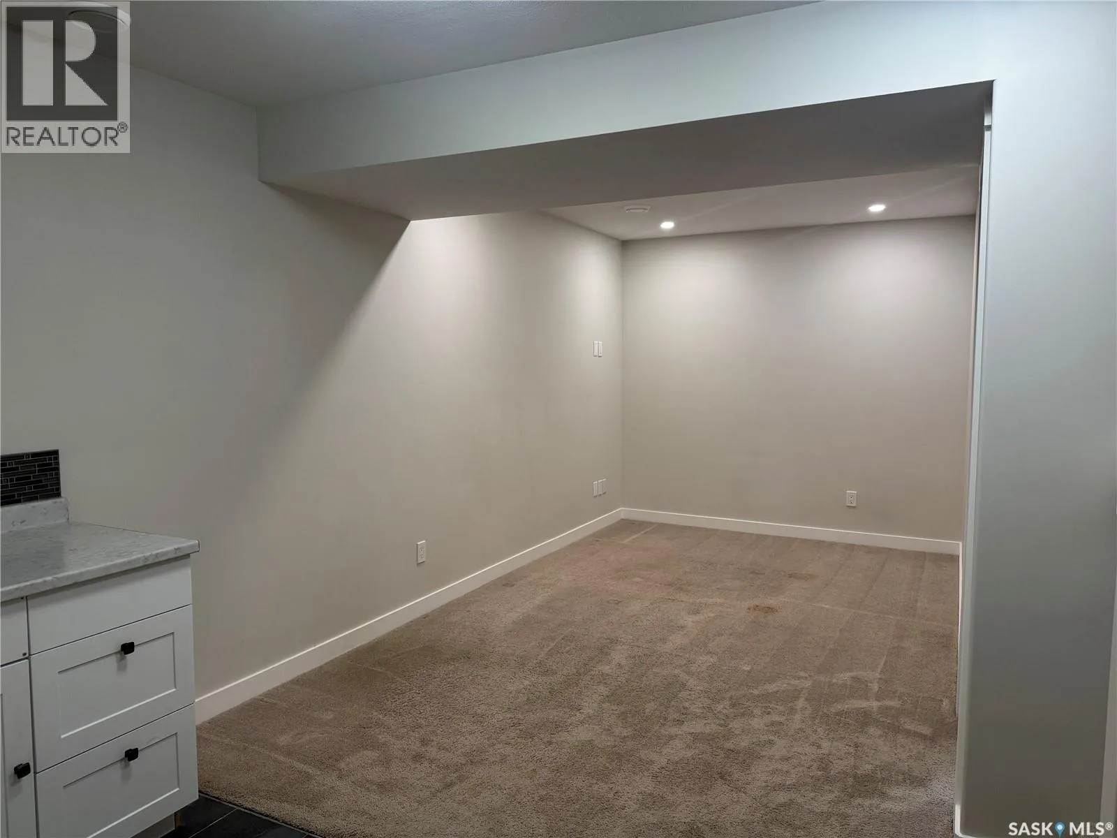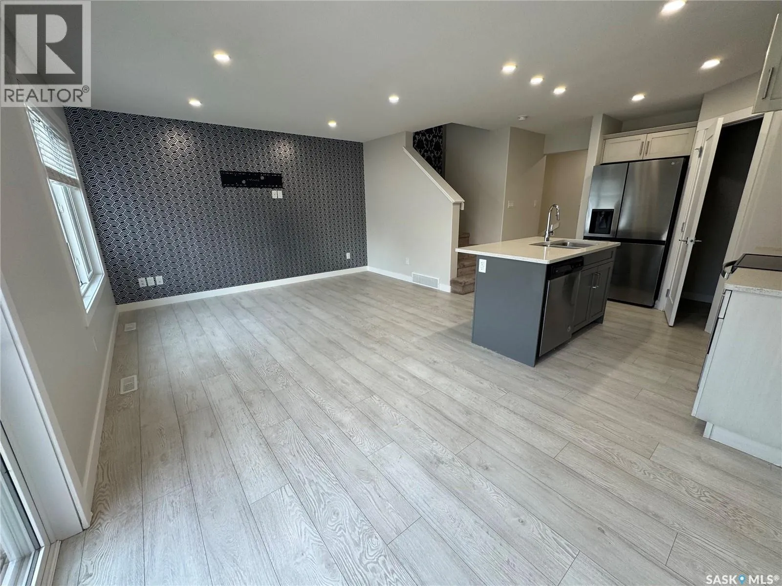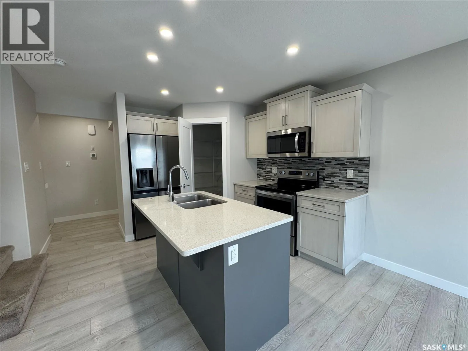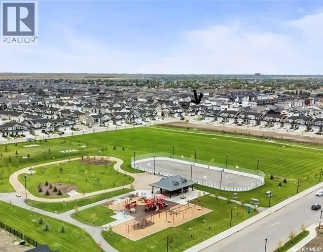 Welcome to this beautifully maintained two-storey attached home in the thriving community of The Towns, ideally located just a one-minute walk from Horizon Park. This move-in-ready property is perfect for families, first-time buyers, or investors looking to settle in one of Reginaâs most desirable and rapidly growing neighbourhoods. The original owner has taken great care of the home â returning from Calgary after tenancy to personally oversee professional carpet cleaning, interior touch-up painting, and a full house deep clean. The main floor features a bright, open-concept layout with a modern kitchen that includes quartz countertops, stylish cabinetry, new fridge, a walk-in pantry, and a large island ideal for hosting or everyday use. The dining and living areas are flooded with natural light and overlook the backyard. A convenient 2-piece bath completes the main level. Upstairs, youâll find three spacious bedrooms, a 4-piece main bathroom, a flex area perfect for a home office or play space, and a dedicated laundry area. The primary suite offers a walk-in closet and 4-piece ensuite. The basement is fully developed, offering a large rec room with wet bar, additional bedroom, and full bathroom â perfect for extended family or guests. A separate side entrance offer potential for future rental or Airbnb use, subject to City of Regina approval.The fridge was replaced last year. (id:27476)