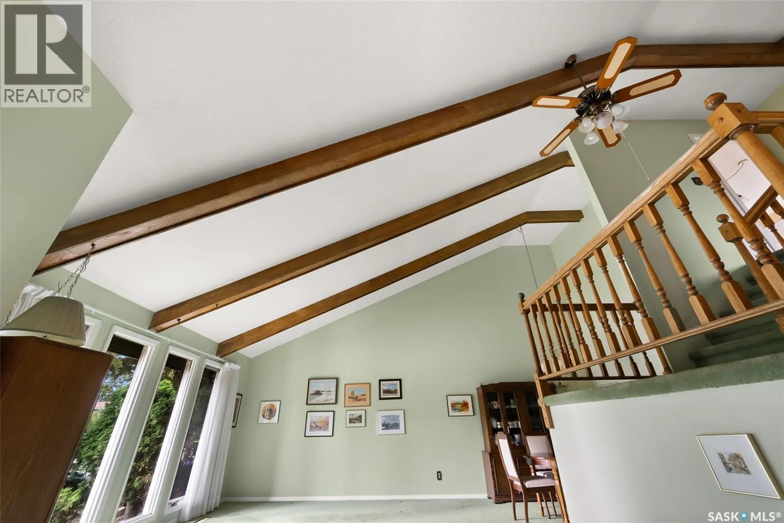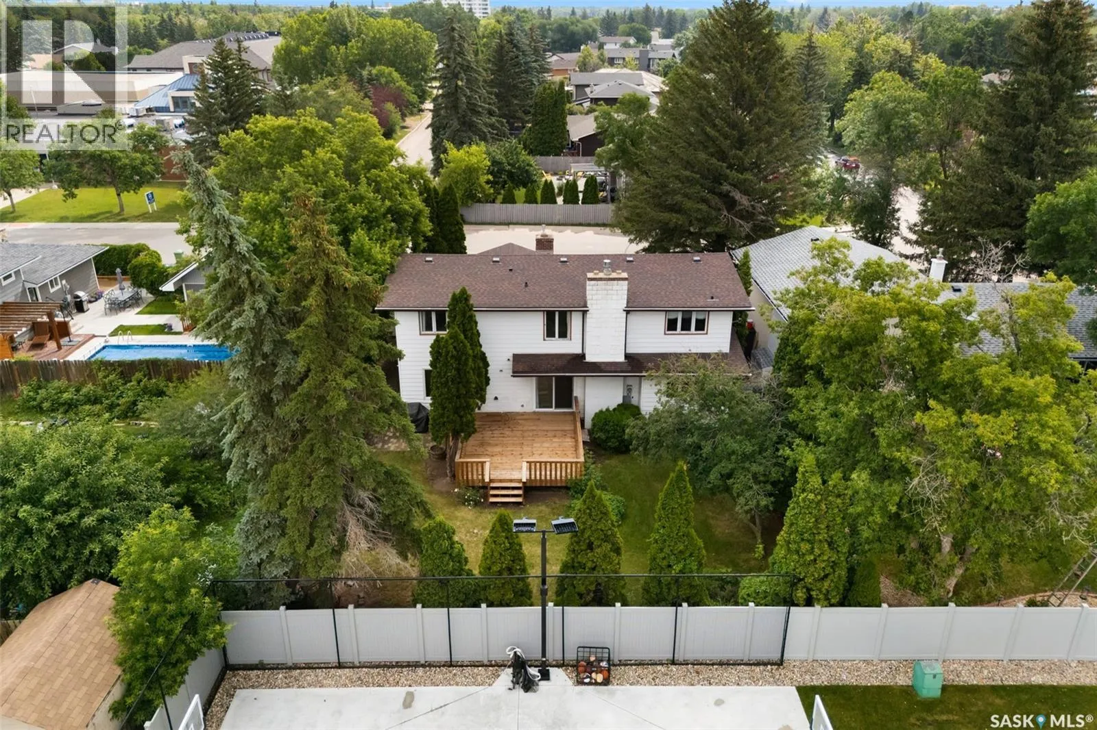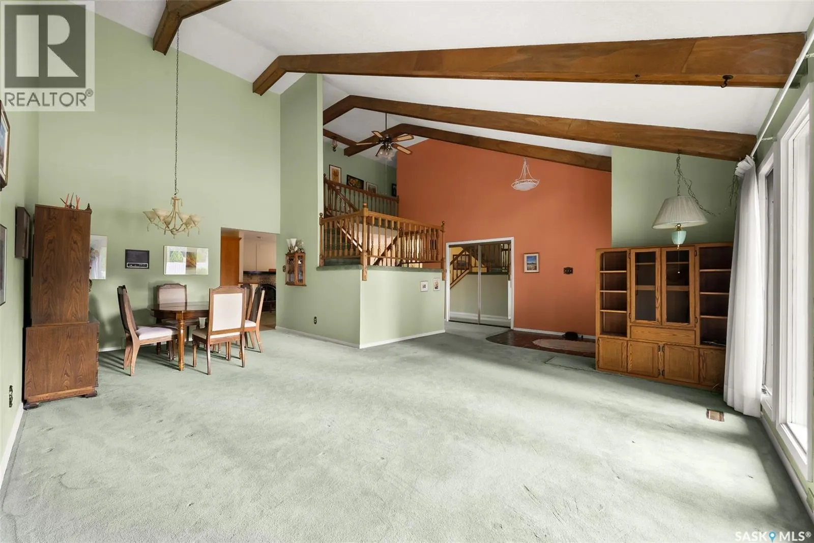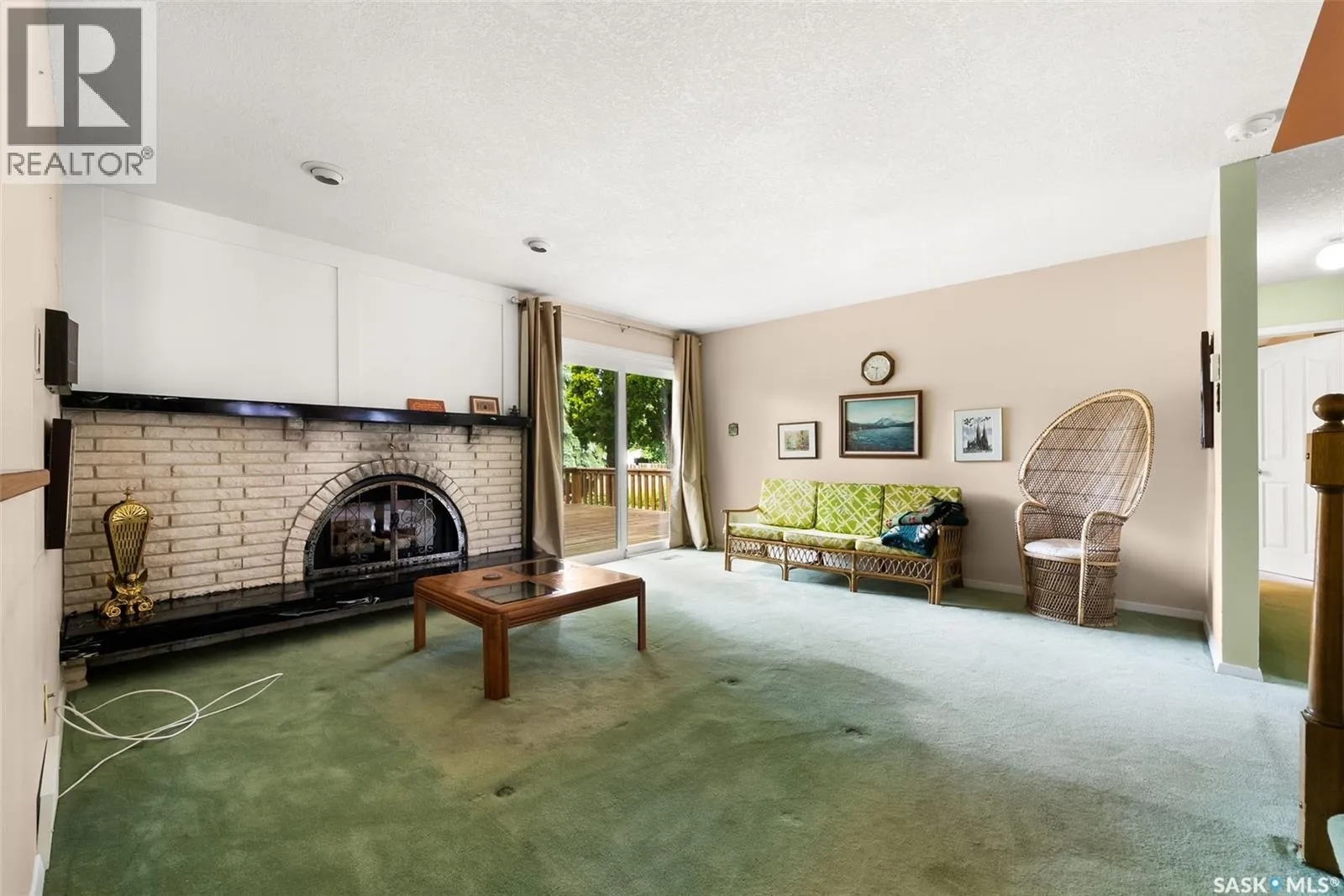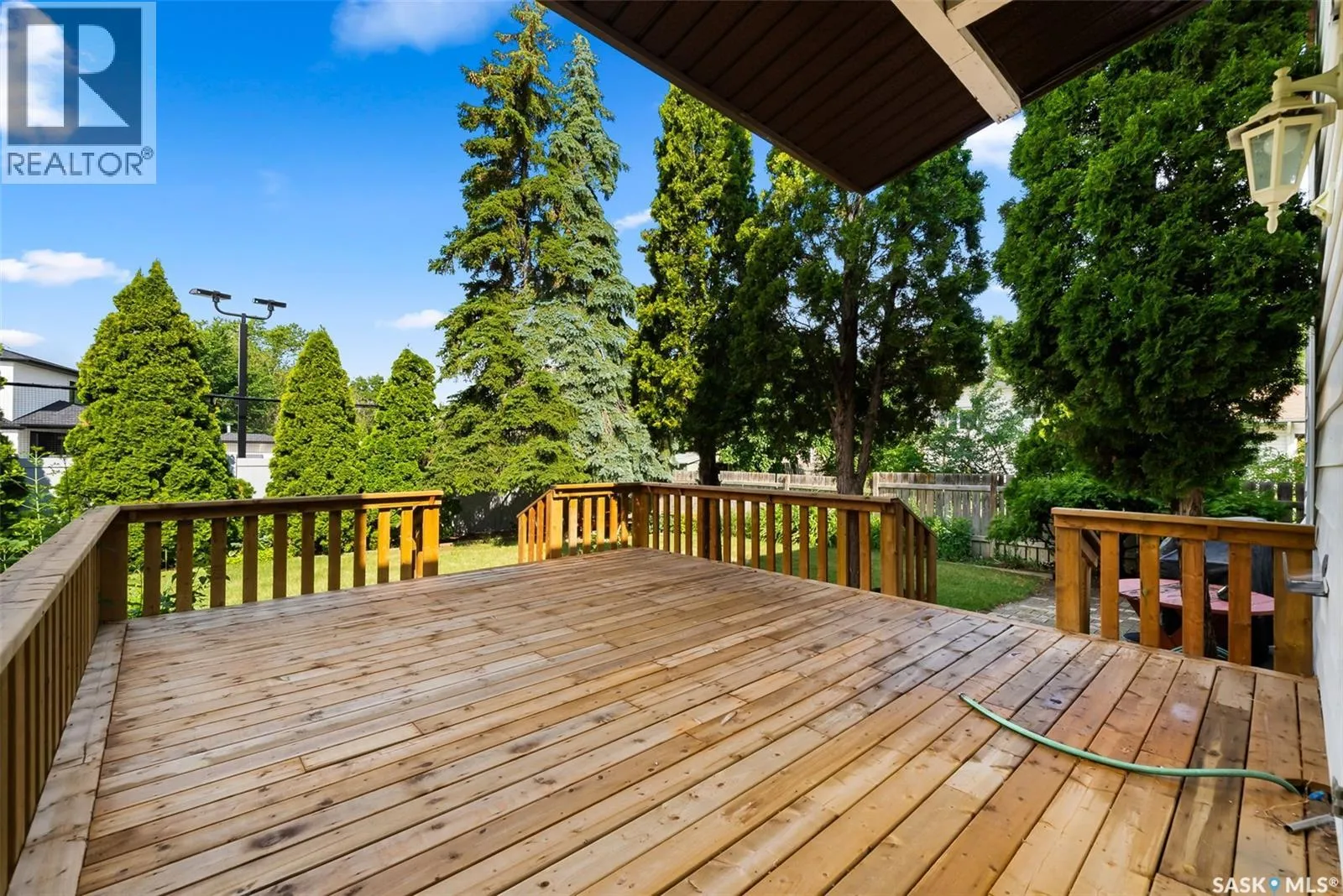 Welcome to this expansive 2,300 square foot two-storey split located in the highly desirable South Albert Park neighborhood. From the moment you enter, you're greeted by a dramatic vaulted ceiling with decorative beams, a striking central staircase, and a second-floor mezzanine that overlooks the formal living roomâcreating a sense of openness and architectural charm. The main floor offers a formal dining room and a bright, spacious eat-in kitchen featuring solid wood cabinetry, newer stainless steel appliances, and a lovely view of the backyard. Adjacent to the kitchen is a cozy family area with a gas fireplace and garden doors that lead to a newer, oversized wood deck. The backyard is lush and private, filled with mature trees and shrubs that offer a peaceful retreat. Numerous new windows on the main floor bring in natural light, while newer shingles add to the home's curb appeal and durability. Also on the main level is an updated three-piece bathroom with a tiled shower, dual vanity, and tiled flooring, along with a generously sized primary bedroom for convenient main-floor living. Upstairs, you'll find four additional bedrooms and a beautifully renovated main bathroom with a quartz vanity and tiled surround. The basement level is designed for entertaining and relaxation, featuring a huge recreation room, games area, and a third bathroom. There's excellent storage in the utility room, plus a dedicated laundry space. The insulated double garage includes a newer overhead door and a well-maintained concrete slab. Two newer high-efficiency furnaces ensure comfort and energy savings year-round. This home blends timeless character with thoughtful updates, offering space, warmth, and functionality in one of Reginaâs most established communities. (id:27476)
