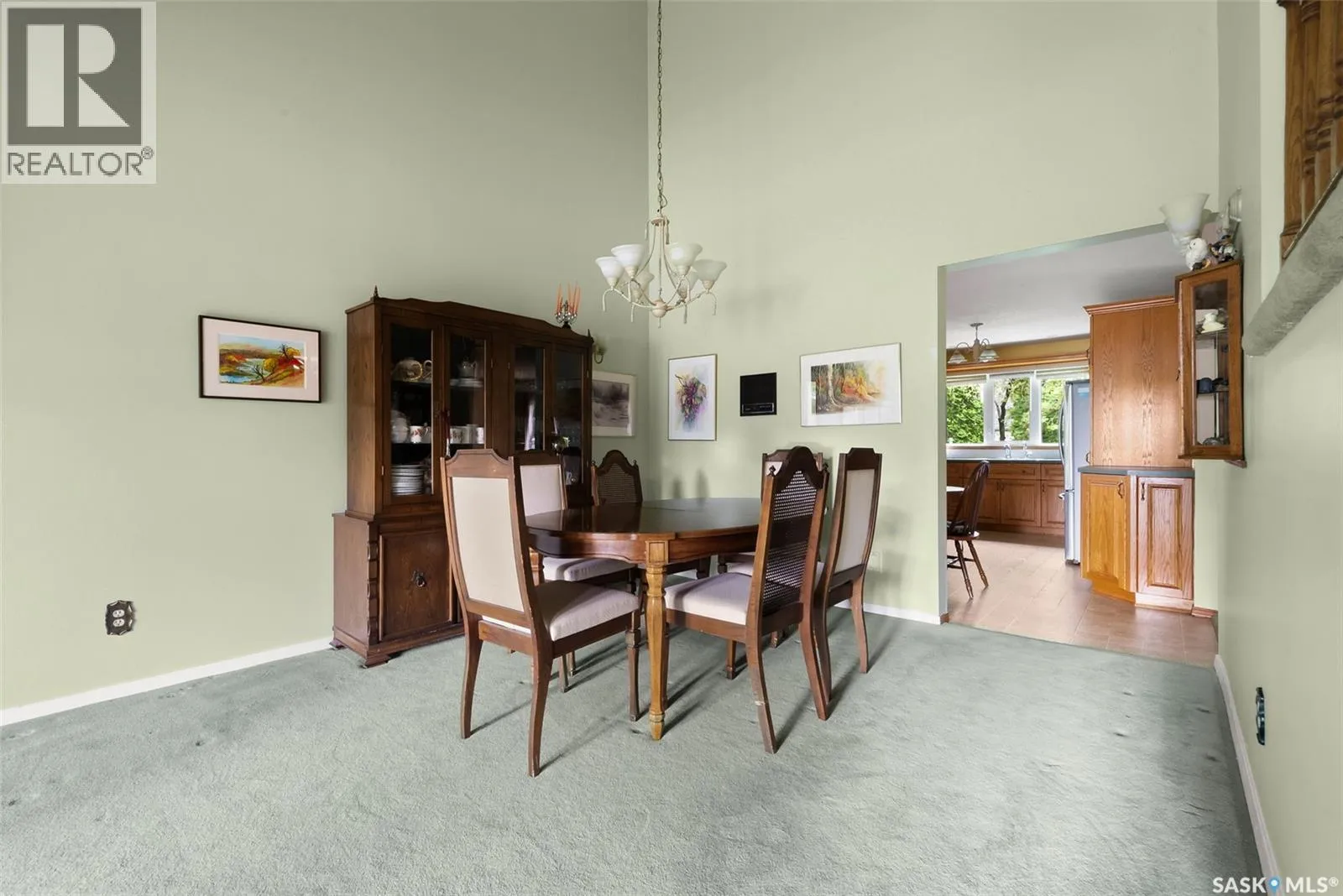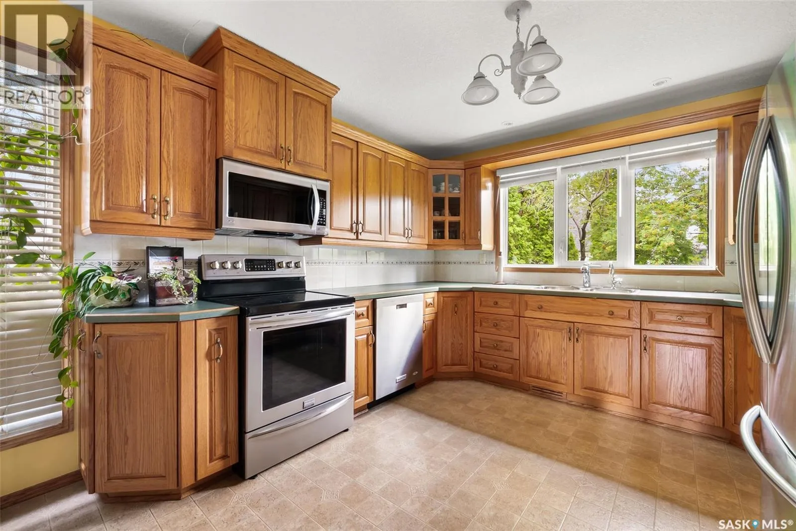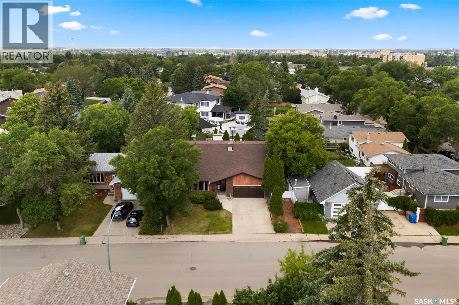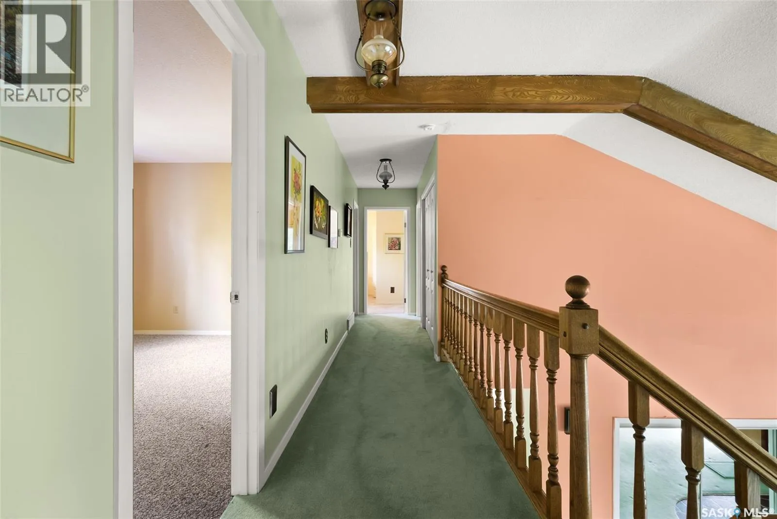 Welcome to this expansive 2,300 square foot two-storey split located in the highly desirable South Albert Park neighborhood. From the moment you enter, you're greeted by a dramatic vaulted ceiling with decorative beams, a striking central staircase, and a second-floor mezzanine that overlooks the formal living roomâcreating a sense of openness and architectural charm. The main floor offers a formal dining room and a bright, spacious eat-in kitchen featuring solid wood cabinetry, newer stainless steel appliances, and a lovely view of the backyard. Adjacent to the kitchen is a cozy family area with a gas fireplace and garden doors that lead to a newer, oversized wood deck. The backyard is lush and private, filled with mature trees and shrubs that offer a peaceful retreat. Numerous new windows on the main floor bring in natural light, while newer shingles add to the home's curb appeal and durability. Also on the main level is an updated three-piece bathroom with a tiled shower, dual vanity, and tiled flooring, along with a generously sized primary bedroom for convenient main-floor living. Upstairs, you'll find four additional bedrooms and a beautifully renovated main bathroom with a quartz vanity and tiled surround. The basement level is designed for entertaining and relaxation, featuring a huge recreation room, games area, and a third bathroom. There's excellent storage in the utility room, plus a dedicated laundry space. The insulated double garage includes a newer overhead door and a well-maintained concrete slab. Two newer high-efficiency furnaces ensure comfort and energy savings year-round. This home blends timeless character with thoughtful updates, offering space, warmth, and functionality in one of Reginaâs most established communities. (id:27476)
