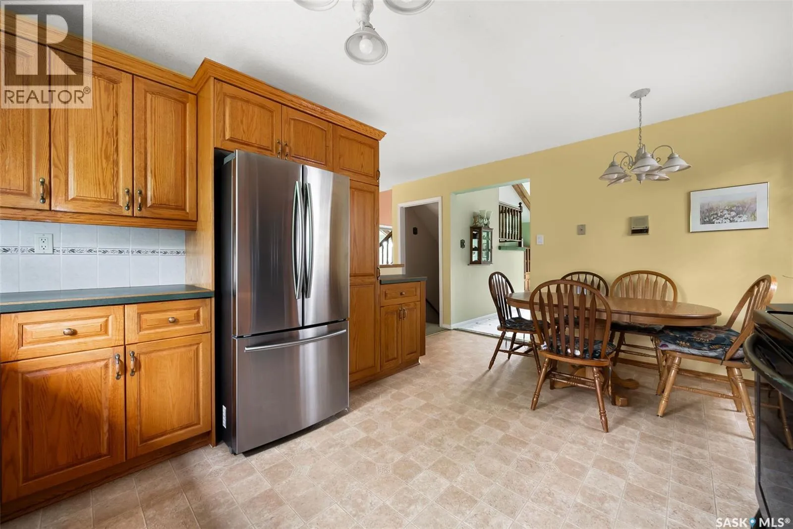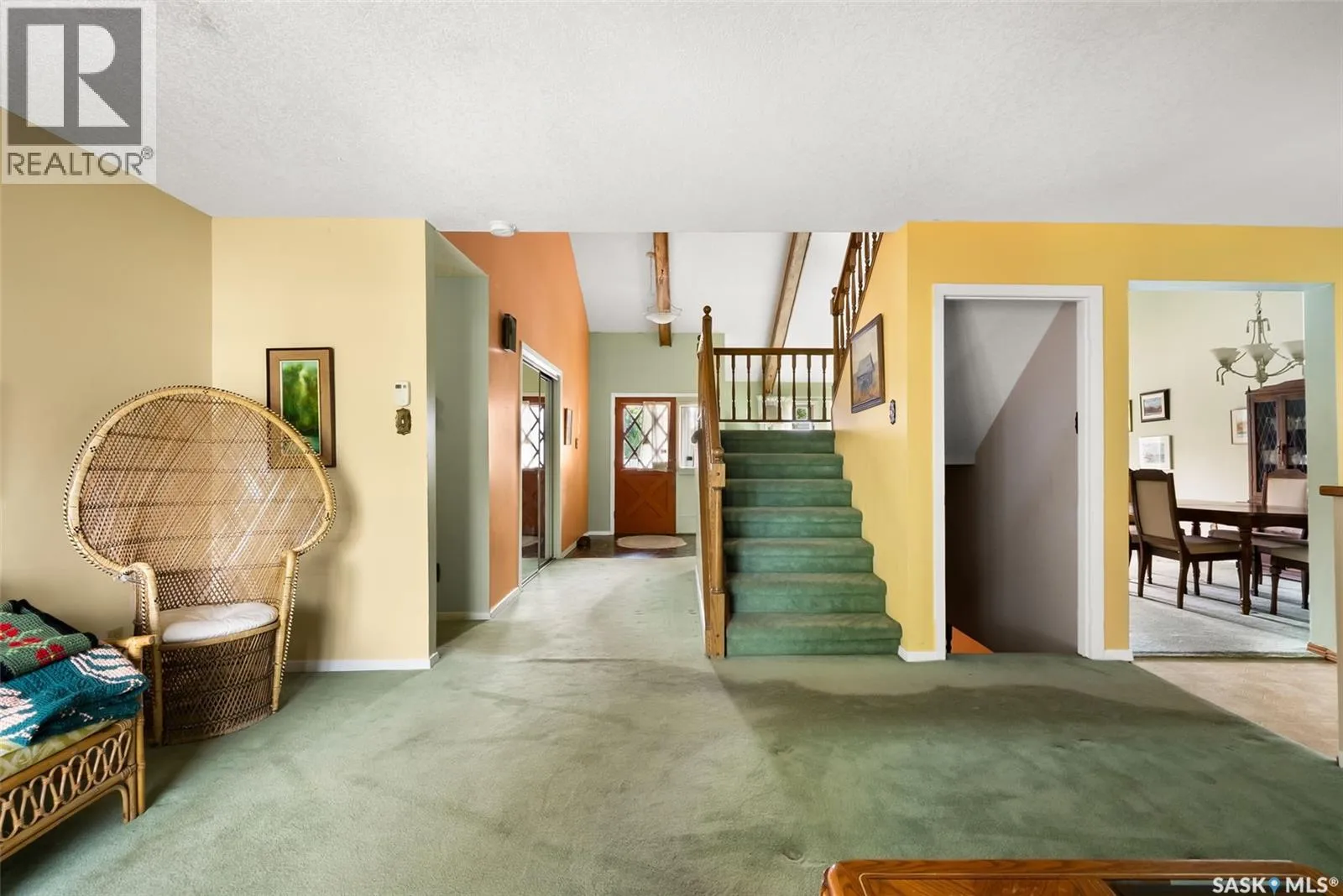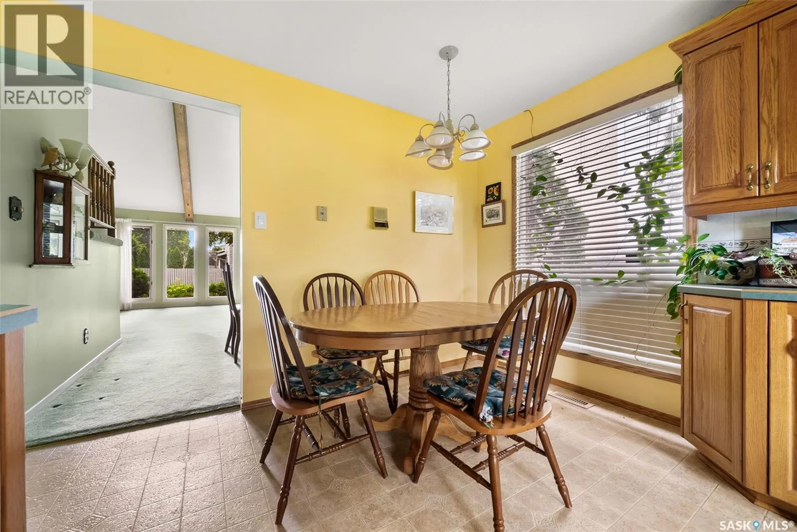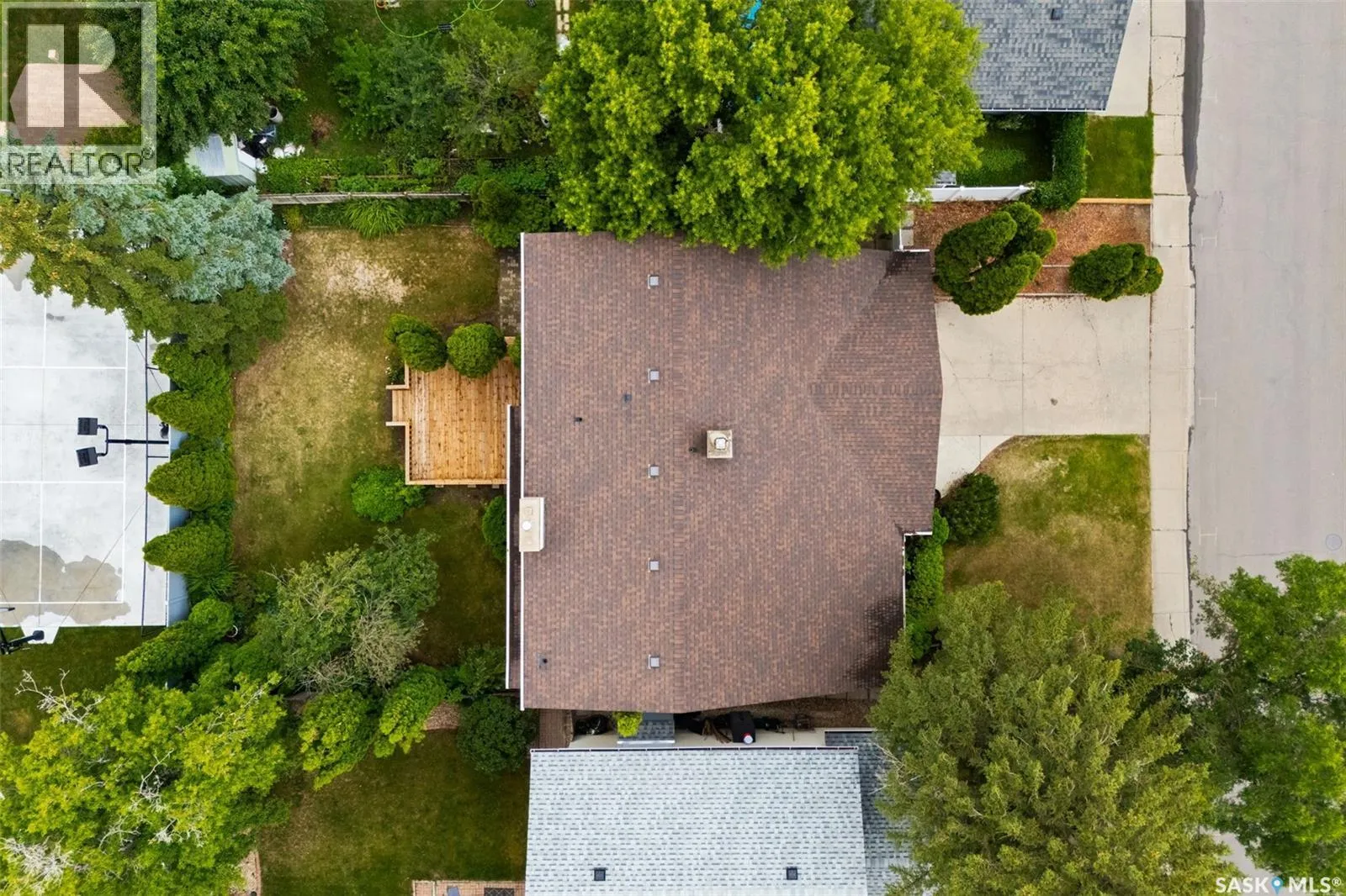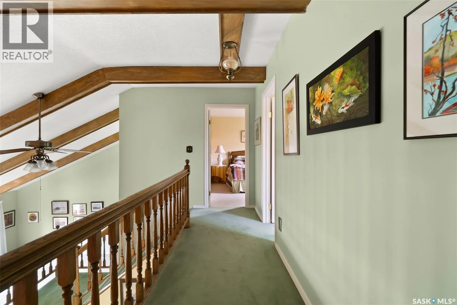 Welcome to this expansive 2,300 square foot two-storey split located in the highly desirable South Albert Park neighborhood. From the moment you enter, you're greeted by a dramatic vaulted ceiling with decorative beams, a striking central staircase, and a second-floor mezzanine that overlooks the formal living roomâcreating a sense of openness and architectural charm. The main floor offers a formal dining room and a bright, spacious eat-in kitchen featuring solid wood cabinetry, newer stainless steel appliances, and a lovely view of the backyard. Adjacent to the kitchen is a cozy family area with a gas fireplace and garden doors that lead to a newer, oversized wood deck. The backyard is lush and private, filled with mature trees and shrubs that offer a peaceful retreat. Numerous new windows on the main floor bring in natural light, while newer shingles add to the home's curb appeal and durability. Also on the main level is an updated three-piece bathroom with a tiled shower, dual vanity, and tiled flooring, along with a generously sized primary bedroom for convenient main-floor living. Upstairs, you'll find four additional bedrooms and a beautifully renovated main bathroom with a quartz vanity and tiled surround. The basement level is designed for entertaining and relaxation, featuring a huge recreation room, games area, and a third bathroom. There's excellent storage in the utility room, plus a dedicated laundry space. The insulated double garage includes a newer overhead door and a well-maintained concrete slab. Two newer high-efficiency furnaces ensure comfort and energy savings year-round. This home blends timeless character with thoughtful updates, offering space, warmth, and functionality in one of Reginaâs most established communities. (id:27476)