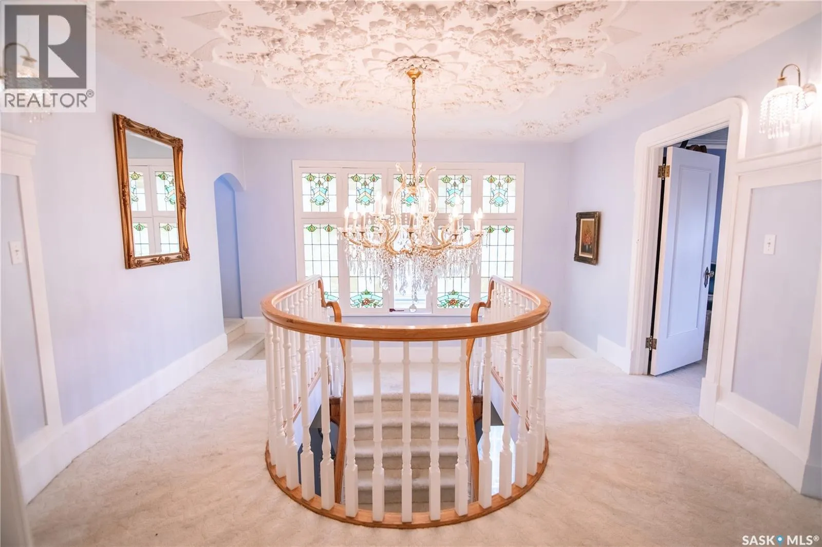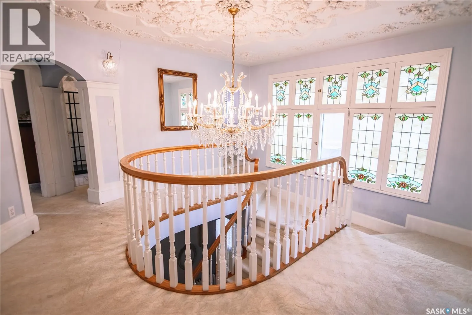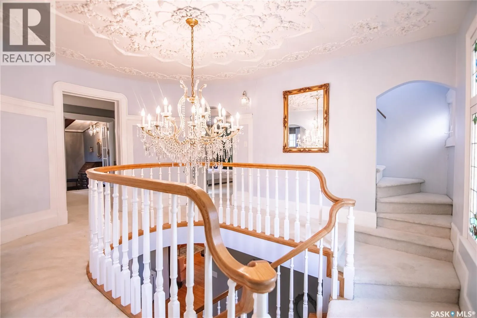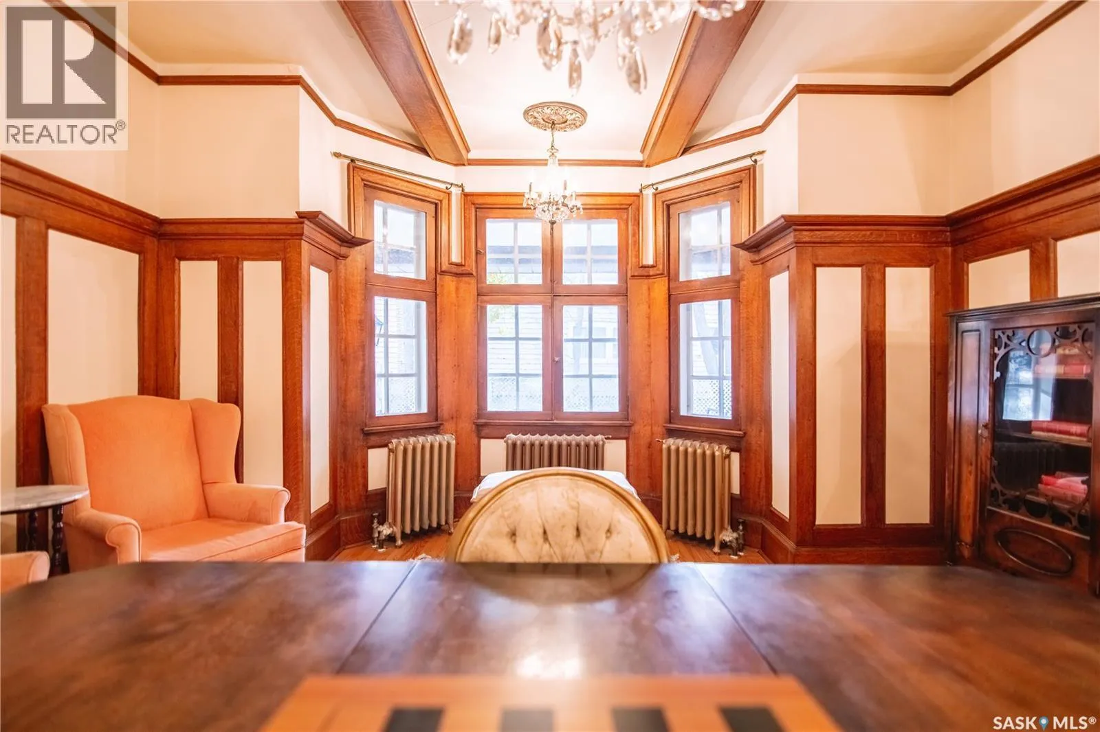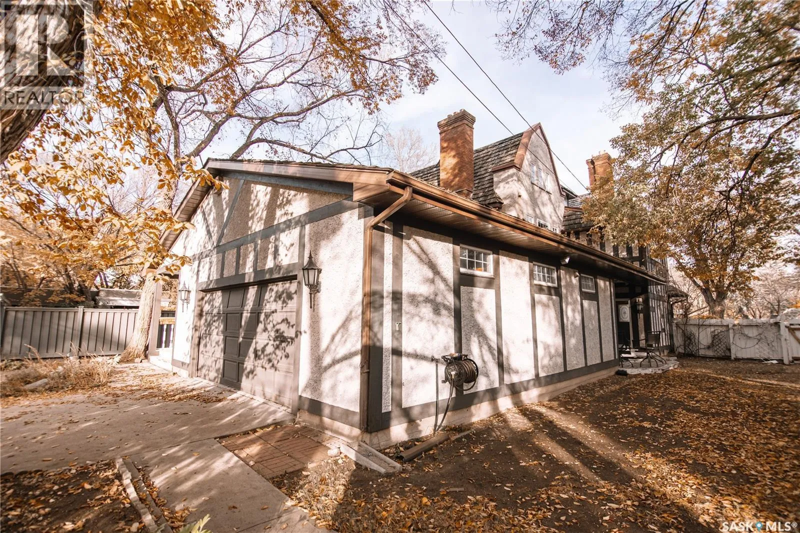 This remarkable 6-bedroom, 5-bathroom character home offers 3,795 sq. ft. of elegant living space, blending preserved 1913 architectural detail with extensive modern upgrades. Designed by renowned architect James Puntin for prominent Regina figure William Masonâeight-term city councillor and mayor from 1925â1926âthis property stands as a true piece of Reginaâs history. The double attached insulated garage offers rare dual access from both Albert Street and the back alley. Classic features such as stained glass windows, wainscoting, crown moldings, claw-foot tubs, and antique vanities are paired with high-end updates including marble flooring, new lighting, custom wallpaper, window treatments, smart home technology (August lock, smart video doorbell, Ecobee thermostat), and an upgraded 200 amp electrical panel. A large heated porch leads to an impressive reception hall with a stunning open staircase and ceiling feature. The main floor includes a spacious living room, formal dining room, an upgraded white kitchen with included appliances, a 2-pc powder room, and a 2023-renovated laundry room with washer and dryer included. The second level features three generous bedrooms, including a primary suite with a sitting room, sunroom, walk-in closet, and a newly developed 4-pc ensuite. The third floor offers two bedrooms, a 3-pc bath, a living room, and a kitchenetteâall furniture and accessories included. The fully developed basement contains a large one-bedroom non-regulation suite with its own kitchen and 3-pc bath (furniture included), ideal for extra income, multigenerational living, or a nanny suite. Additional updates include a new boiler (2014) and spray foam insulation in key areas. Furniture on the main and second floors is negotiable, making this home truly move-in ready. A rare combination of history, character, and modern comfort, this property is one of Reginaâs finest and most storied residences. (id:27476)