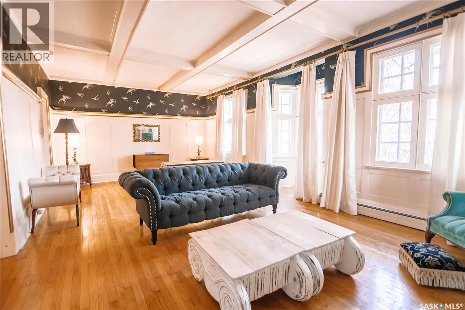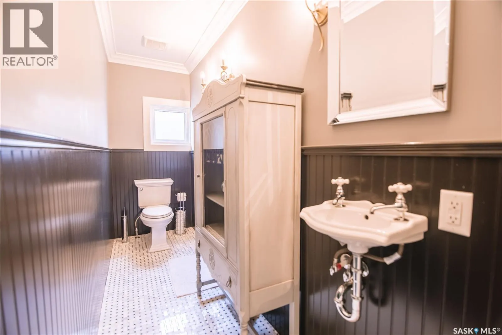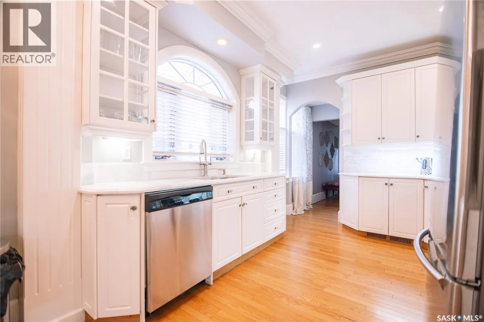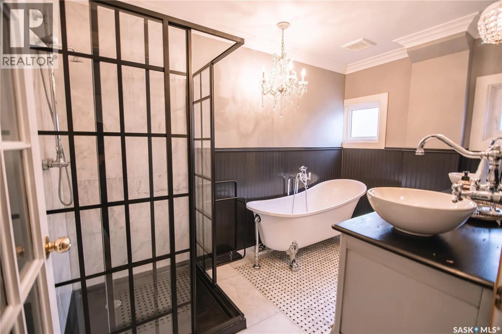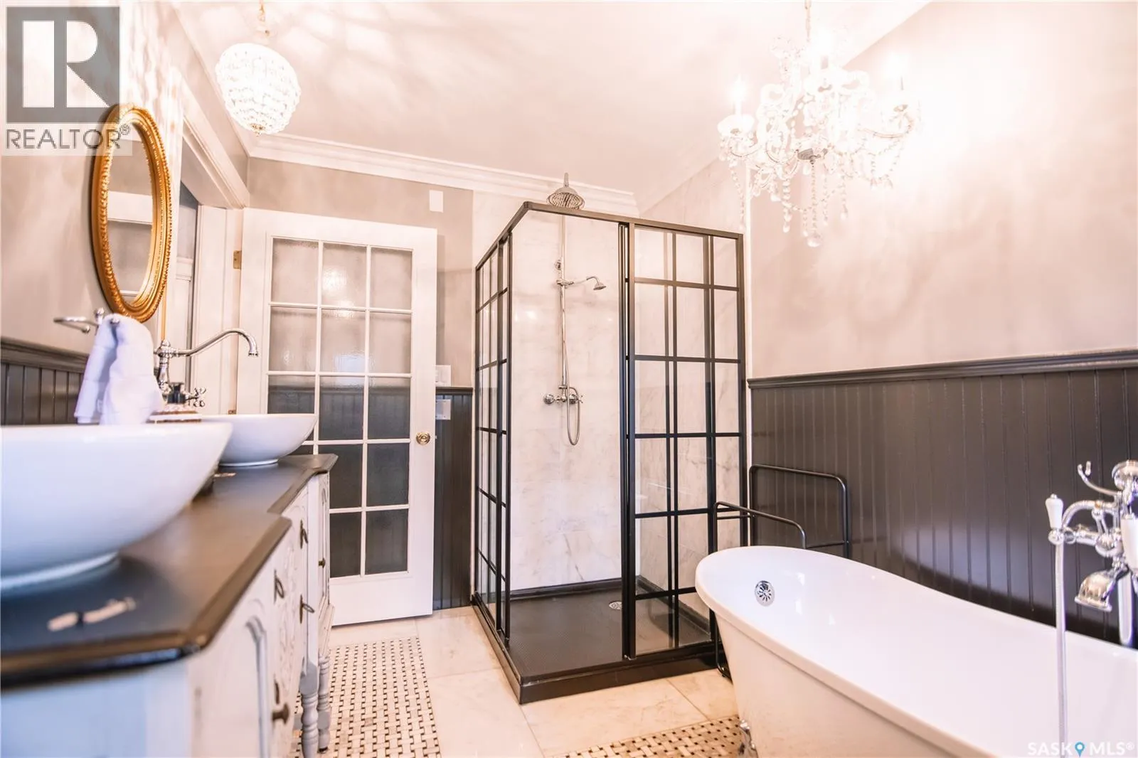 This remarkable 6-bedroom, 5-bathroom character home offers 3,795 sq. ft. of elegant living space, blending preserved 1913 architectural detail with extensive modern upgrades. Designed by renowned architect James Puntin for prominent Regina figure William Masonâeight-term city councillor and mayor from 1925â1926âthis property stands as a true piece of Reginaâs history. The double attached insulated garage offers rare dual access from both Albert Street and the back alley. Classic features such as stained glass windows, wainscoting, crown moldings, claw-foot tubs, and antique vanities are paired with high-end updates including marble flooring, new lighting, custom wallpaper, window treatments, smart home technology (August lock, smart video doorbell, Ecobee thermostat), and an upgraded 200 amp electrical panel. A large heated porch leads to an impressive reception hall with a stunning open staircase and ceiling feature. The main floor includes a spacious living room, formal dining room, an upgraded white kitchen with included appliances, a 2-pc powder room, and a 2023-renovated laundry room with washer and dryer included. The second level features three generous bedrooms, including a primary suite with a sitting room, sunroom, walk-in closet, and a newly developed 4-pc ensuite. The third floor offers two bedrooms, a 3-pc bath, a living room, and a kitchenetteâall furniture and accessories included. The fully developed basement contains a large one-bedroom non-regulation suite with its own kitchen and 3-pc bath (furniture included), ideal for extra income, multigenerational living, or a nanny suite. Additional updates include a new boiler (2014) and spray foam insulation in key areas. Furniture on the main and second floors is negotiable, making this home truly move-in ready. A rare combination of history, character, and modern comfort, this property is one of Reginaâs finest and most storied residences. (id:27476)