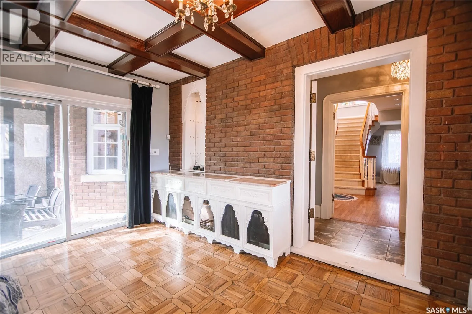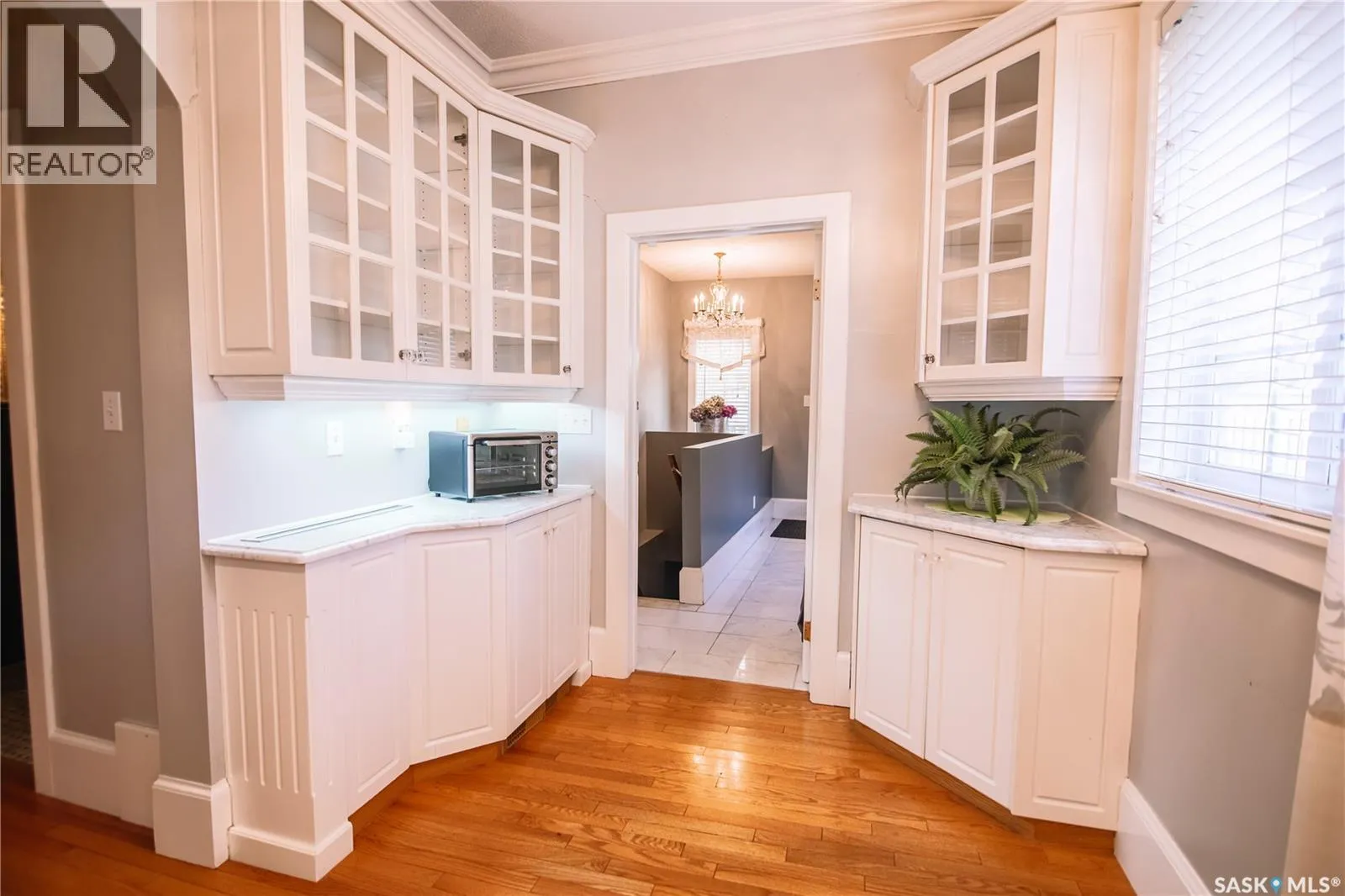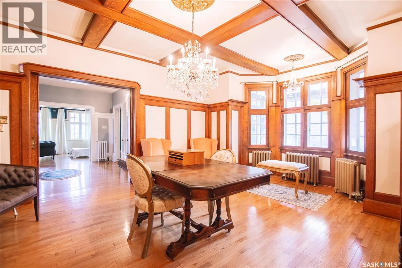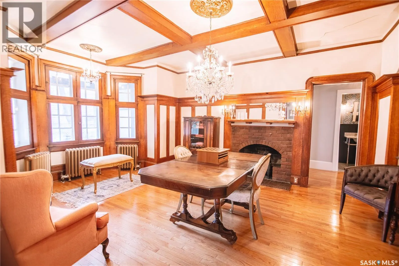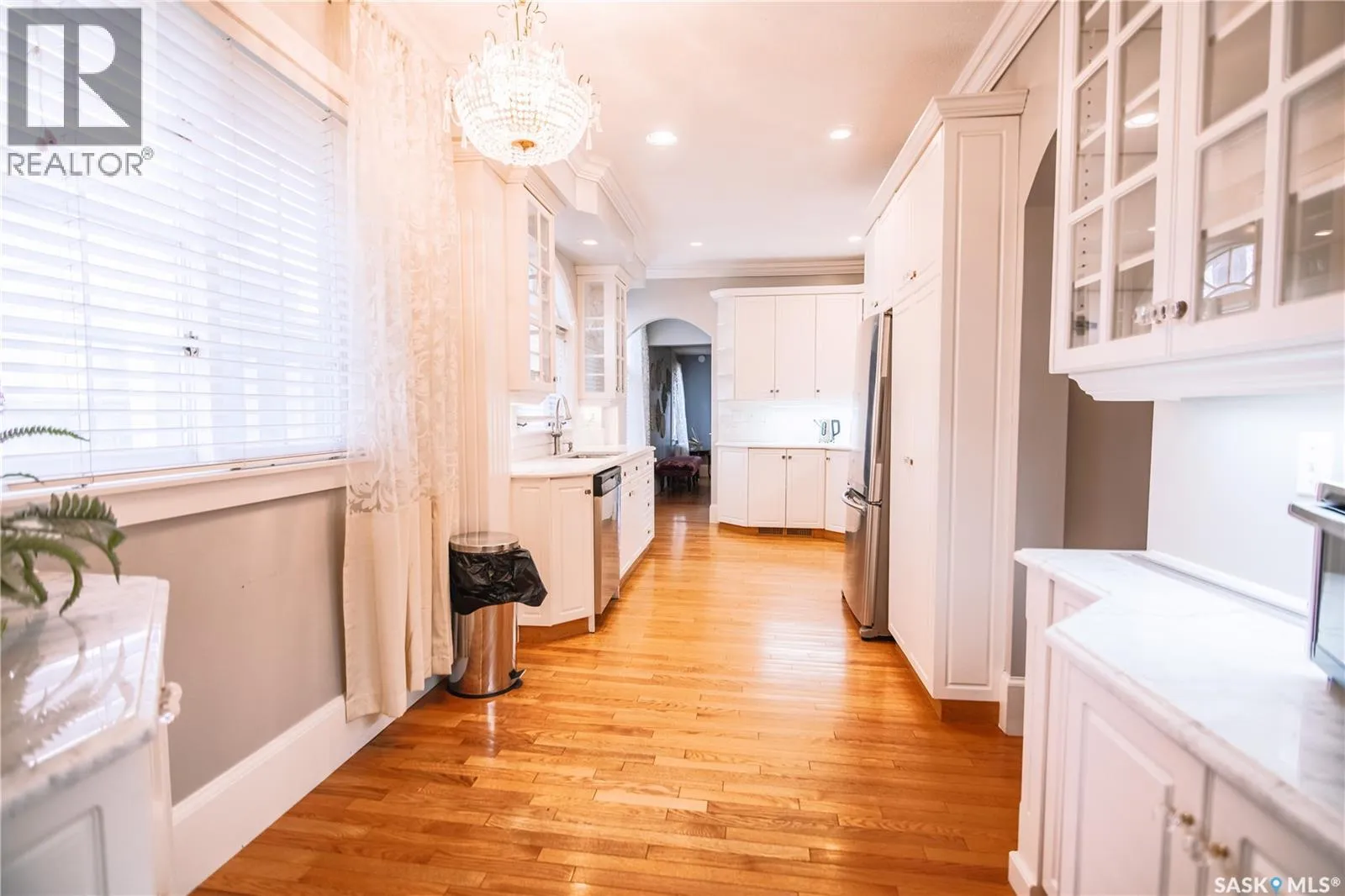 This remarkable 6-bedroom, 5-bathroom character home offers 3,795 sq. ft. of elegant living space, blending preserved 1913 architectural detail with extensive modern upgrades. Designed by renowned architect James Puntin for prominent Regina figure William Masonâeight-term city councillor and mayor from 1925â1926âthis property stands as a true piece of Reginaâs history. The double attached insulated garage offers rare dual access from both Albert Street and the back alley. Classic features such as stained glass windows, wainscoting, crown moldings, claw-foot tubs, and antique vanities are paired with high-end updates including marble flooring, new lighting, custom wallpaper, window treatments, smart home technology (August lock, smart video doorbell, Ecobee thermostat), and an upgraded 200 amp electrical panel. A large heated porch leads to an impressive reception hall with a stunning open staircase and ceiling feature. The main floor includes a spacious living room, formal dining room, an upgraded white kitchen with included appliances, a 2-pc powder room, and a 2023-renovated laundry room with washer and dryer included. The second level features three generous bedrooms, including a primary suite with a sitting room, sunroom, walk-in closet, and a newly developed 4-pc ensuite. The third floor offers two bedrooms, a 3-pc bath, a living room, and a kitchenetteâall furniture and accessories included. The fully developed basement contains a large one-bedroom non-regulation suite with its own kitchen and 3-pc bath (furniture included), ideal for extra income, multigenerational living, or a nanny suite. Additional updates include a new boiler (2014) and spray foam insulation in key areas. Furniture on the main and second floors is negotiable, making this home truly move-in ready. A rare combination of history, character, and modern comfort, this property is one of Reginaâs finest and most storied residences. (id:27476)