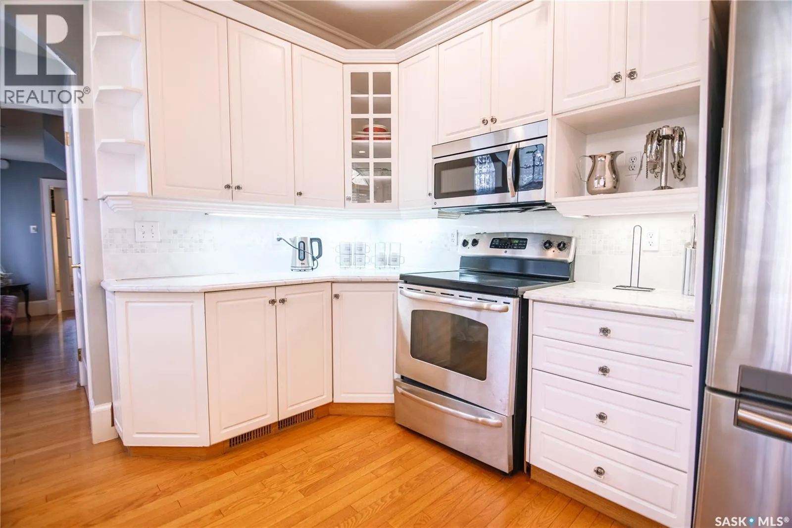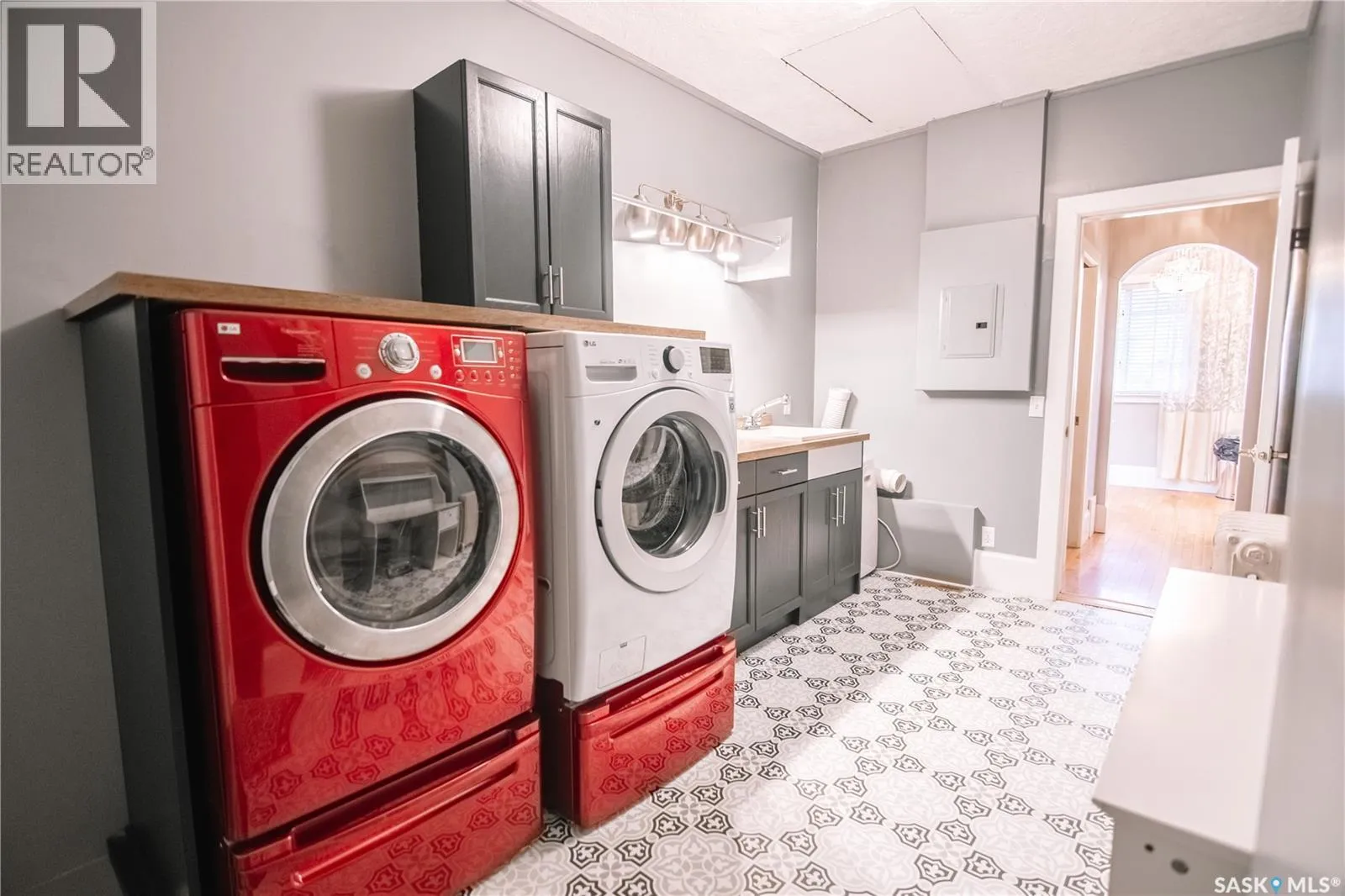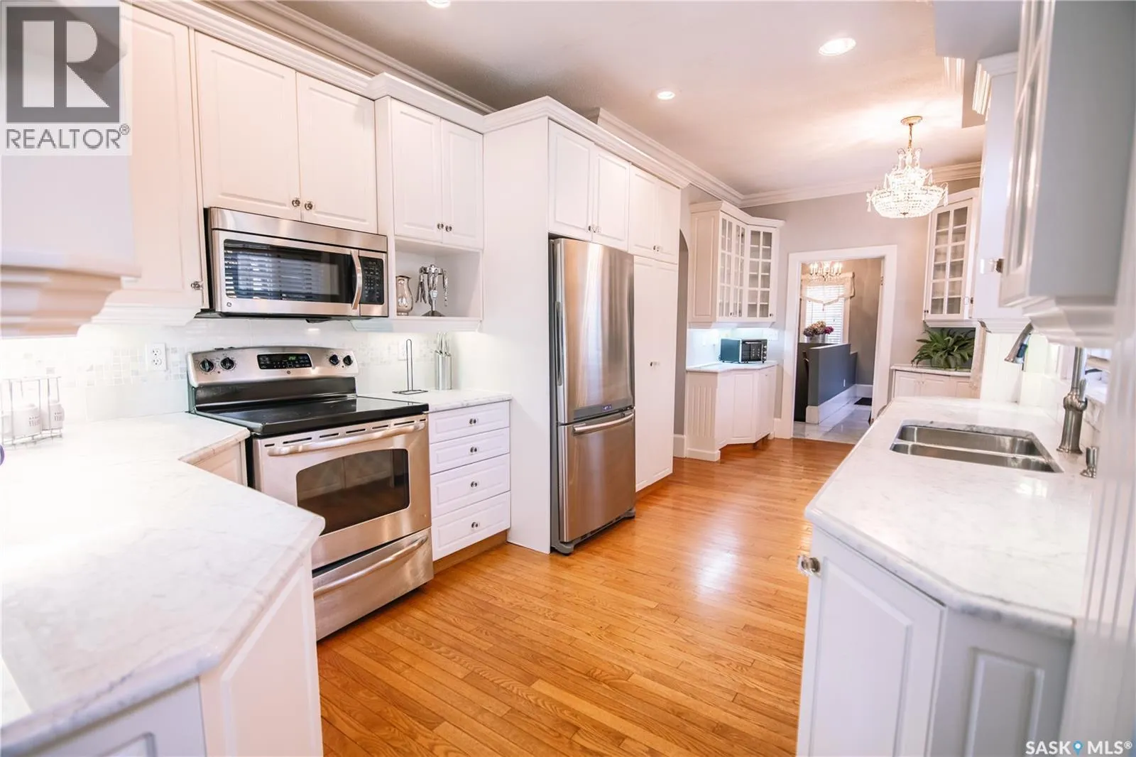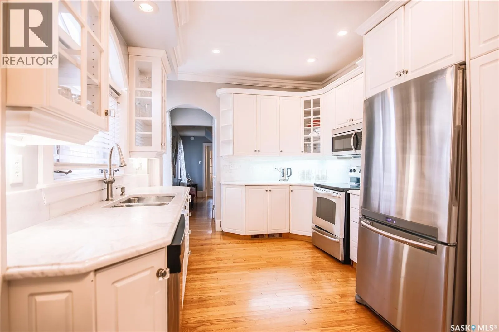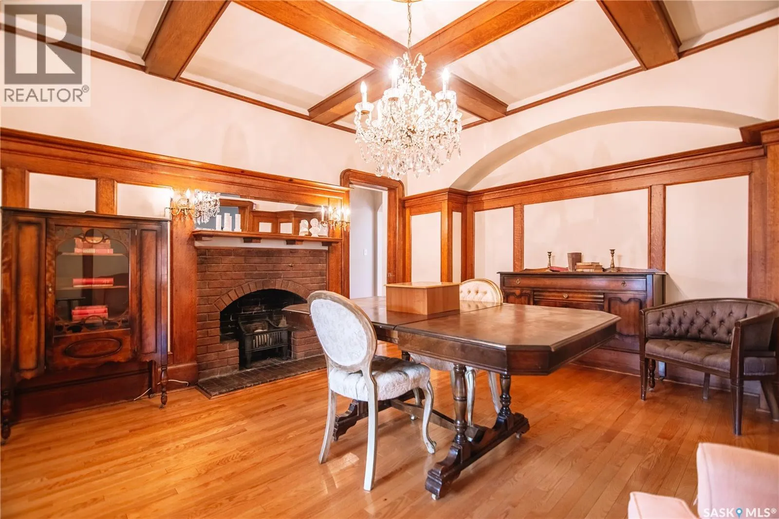 This remarkable 6-bedroom, 5-bathroom character home offers 3,795 sq. ft. of elegant living space, blending preserved 1913 architectural detail with extensive modern upgrades. Designed by renowned architect James Puntin for prominent Regina figure William Masonâeight-term city councillor and mayor from 1925â1926âthis property stands as a true piece of Reginaâs history. The double attached insulated garage offers rare dual access from both Albert Street and the back alley. Classic features such as stained glass windows, wainscoting, crown moldings, claw-foot tubs, and antique vanities are paired with high-end updates including marble flooring, new lighting, custom wallpaper, window treatments, smart home technology (August lock, smart video doorbell, Ecobee thermostat), and an upgraded 200 amp electrical panel. A large heated porch leads to an impressive reception hall with a stunning open staircase and ceiling feature. The main floor includes a spacious living room, formal dining room, an upgraded white kitchen with included appliances, a 2-pc powder room, and a 2023-renovated laundry room with washer and dryer included. The second level features three generous bedrooms, including a primary suite with a sitting room, sunroom, walk-in closet, and a newly developed 4-pc ensuite. The third floor offers two bedrooms, a 3-pc bath, a living room, and a kitchenetteâall furniture and accessories included. The fully developed basement contains a large one-bedroom non-regulation suite with its own kitchen and 3-pc bath (furniture included), ideal for extra income, multigenerational living, or a nanny suite. Additional updates include a new boiler (2014) and spray foam insulation in key areas. Furniture on the main and second floors is negotiable, making this home truly move-in ready. A rare combination of history, character, and modern comfort, this property is one of Reginaâs finest and most storied residences. (id:27476)