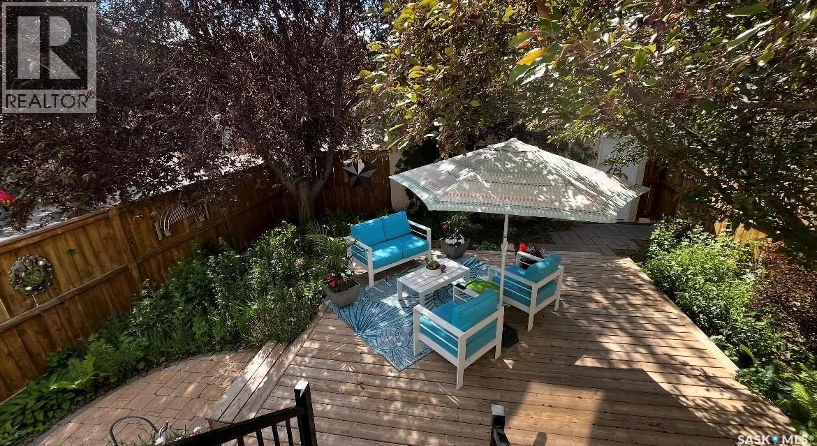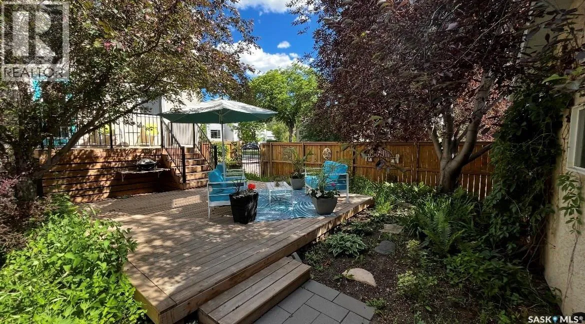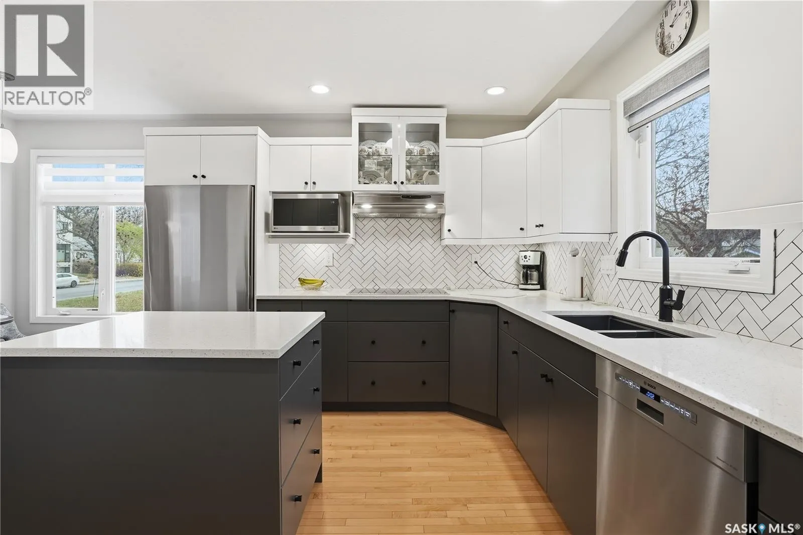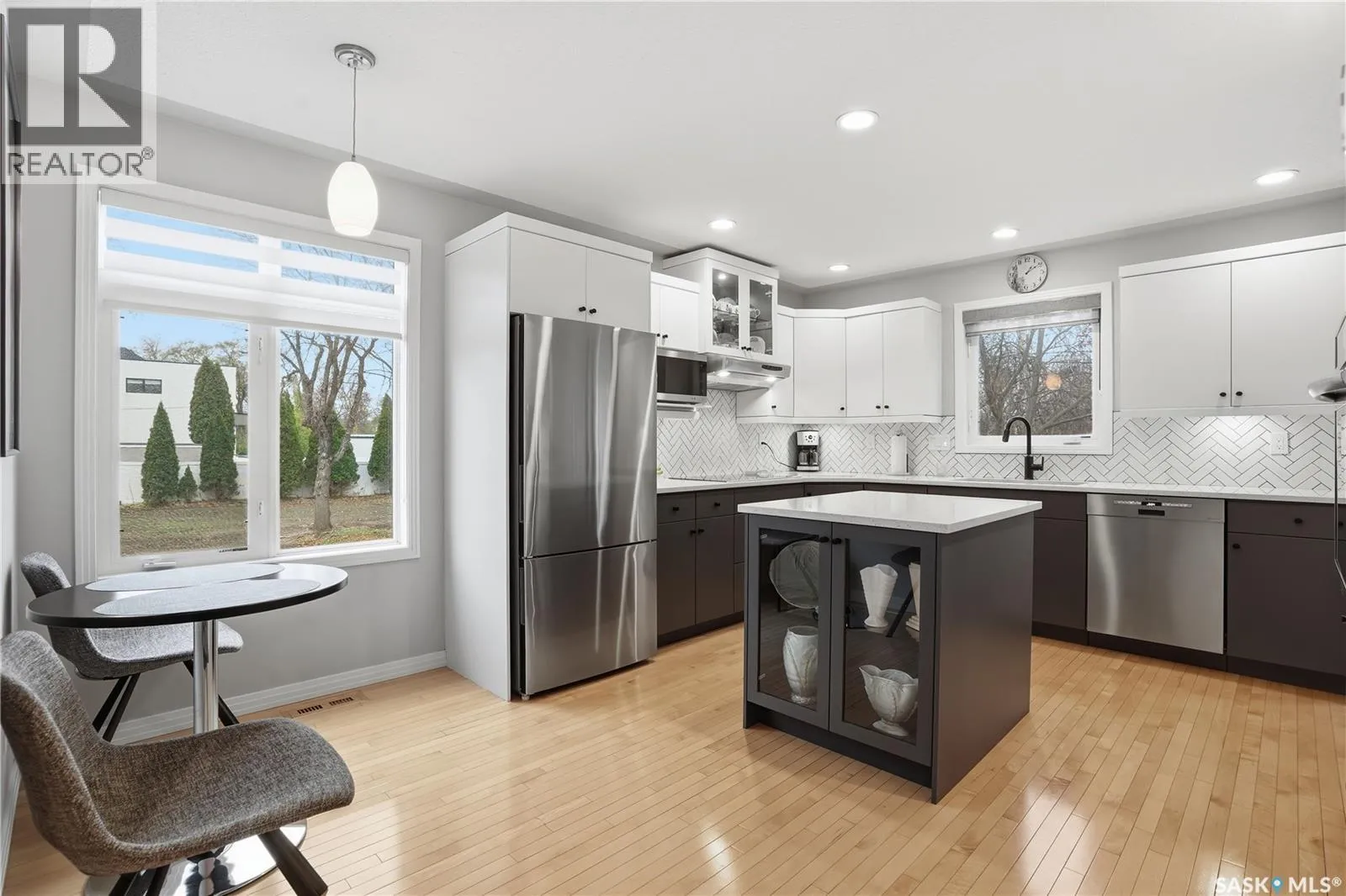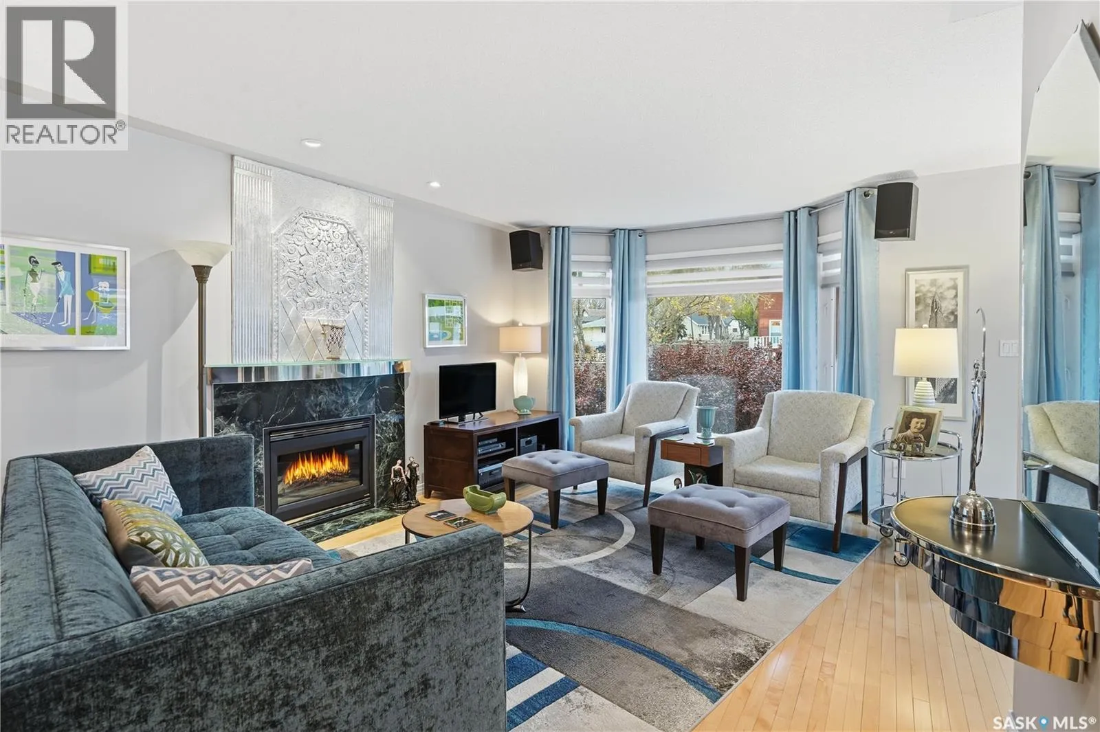Welcome to 2576 Cameron Street. This charming 2 story is located in the desirable Crescents Neighbourhood. Immediately you will notice the attractive curb appeal with a large front and side yard that has been beautifully landscaped. Custom Ripplinger build distinguished by meticulous attention to detail, tastefully decorated and offering 1588 square feet of living space. As you enter you will be greeted by the large foyer and open concept living space. Large windows allow for an abundance of natural light. Living room features maple hardwood flooring that continues throughout the main level, lovely drapery which is included, and a gas fireplace with marble surround and custom plaster feature wall. Living room speakers can also stay if the buyer so chooses. The spacious dining room boasts a ceramic tile floor inlay and back lighting accenting the glass block wall. The kitchen is a chefâs dream with plenty of counter space, two tone custom cabinets, herringbone pattern subway tile backsplash, and stainless steel appliances which are included. Off the kitchen you will find a 2 piece bathroom and entry to the backyard with a large tiered deck and 2 car detached garage with lane access. Primary bedroom can be found upstairs with direct access to walk in closet and the large 5 piece bathroom featuring a jacuzzi tub, a glass block shower and in floor heating. 2 more bedrooms and laundry complete the second level. The basement is the perfect entertaining space with a media room which includes the projector and screen along with surround sound system. Large storage/ utility space with additional fridge and freezer that are both included. This property is conveniently located close to Downtown, The Royal Saskatchewan Museum, Wascana Park and mere steps from green space. Additional features include: shingles 2022, furnace 2016, central air conditioning, roughed in plumbing in basement, and roughed in natural gas hook up. (id:27476)