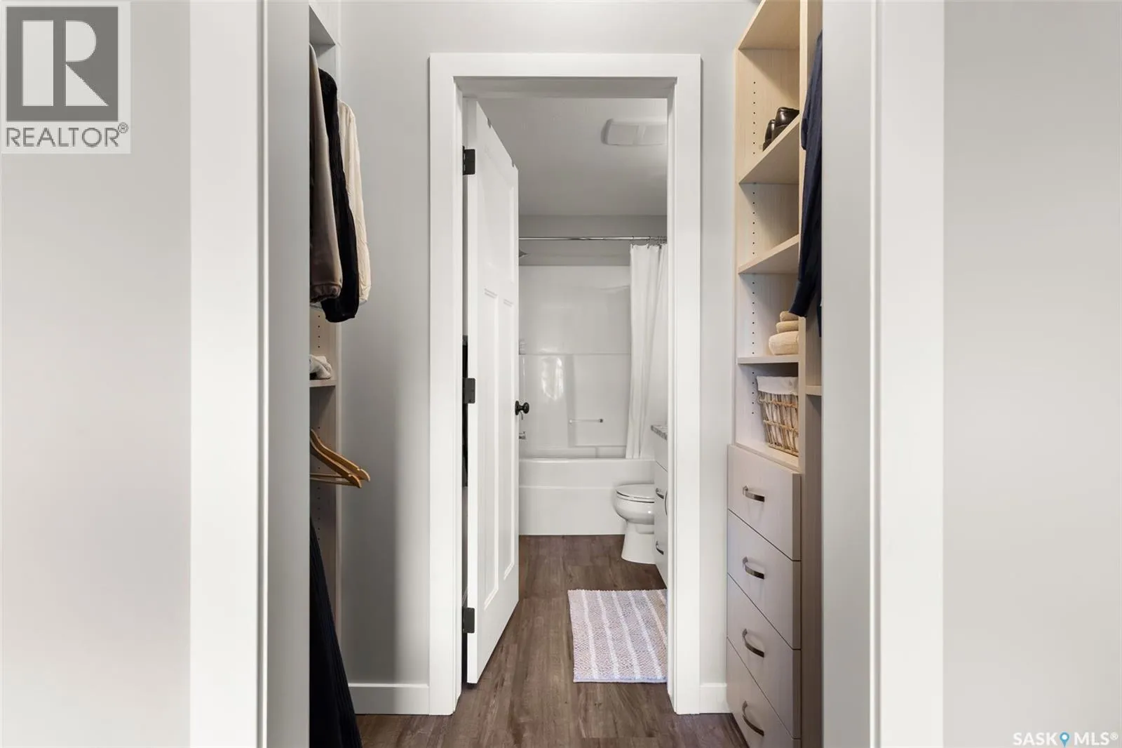 Located in Hillsdale across from Wascana Lake with great access to the U of R, Downtown and all of Regina's South amenities is this modern, upscale one bedroom condo in the Bellagio. Enjoy the sunlit mornings from the comfy living room that overlooks the manicured landscaping surrounding the Bellagio. The dining area has built in cabinetry with quartz counter tops that seamlessly integrates elegant dining area cabinetry for your dinnerware and multipurpose as a workspace desk. The dining room design maximizes space with a luxurious functionality. Opposite is the custom designed wine rack with extra space to display your stemware. The chic, inviting white kitchen will inspire your culinary skills offering pull out drawers, subway tiled backsplash, quartz counter tops, stainless steel appliances and an eating bar for extra seating. The primary bedroom overlooks the front balcony with large east facing windows, vinyl plank flooring that seamlessly runs through the custom designed walk-through closet to the 4-piece bath. The bathroom is a modern luxury retreat. The granite countertop has unique veining patterns to add timeless elegance and a soothing touch to your bathroom. The condo unit is complete with an in suite laundry area & storage space. Capping it all off, the unit comes with a secured underground parking stall with storage cabinets, plus the Bellagio offers an amenities room and a gym. (id:27476)
