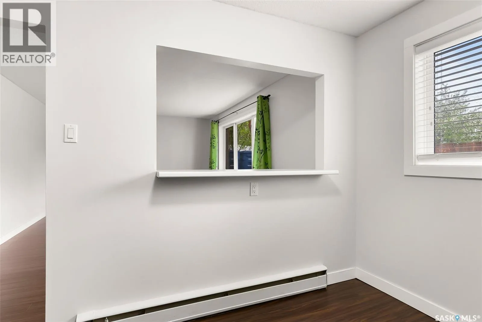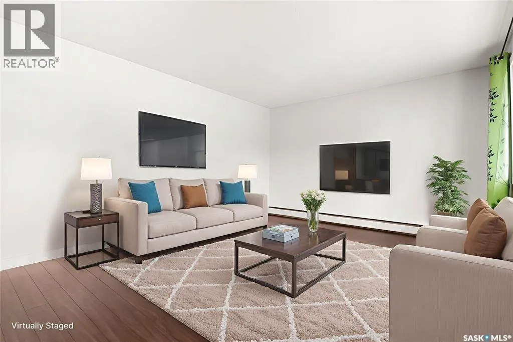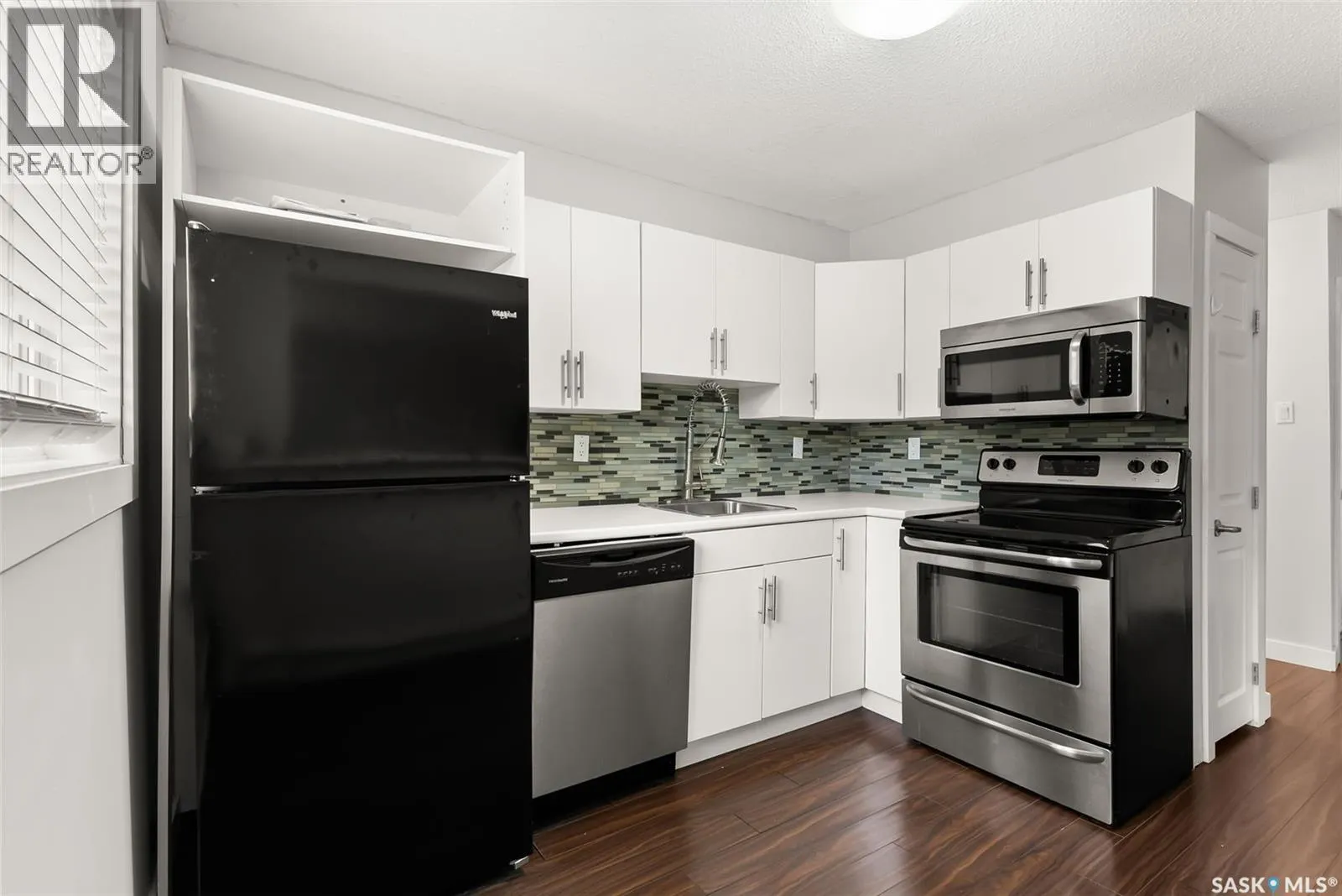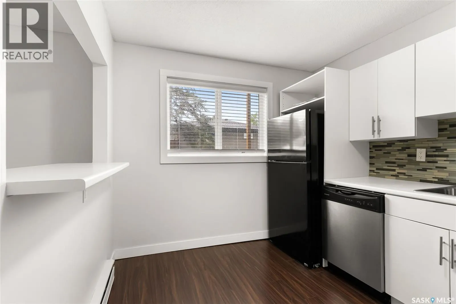 Welcome to #4 230 Broadway Avenue East, a beautifully updated condo nestled in the highly desirable Arnhem Place neighbourhood. This bright and modern 1 bedroom, 1 bathroom unit offers 593 sq. ft. of thoughtfully designed living space, highlighted by an abundant of natural light and tasteful finishes throughout. The refreshed kitchen features crisp white cabinetry, newer appliances, and an efficient layout, while the contemporary bathroom adds to the homeâs fresh and move-in-ready appeal. Durable laminate flooring flows seamlessly through the unit, complemented by the convenience of in-suite laundry and a dedicated parking stall. Set in a quiet and established area just minutes from Ring Road, downtown area, Wascana Park and all south end amenities. This location is perfect for first time buyers, students, or investors. With nearby parks, walking paths, and easy access to amenities, this is a charming, turnkey home in a fantastic neighbourhood, this is an opportunity you wonât want to miss. (id:27476)