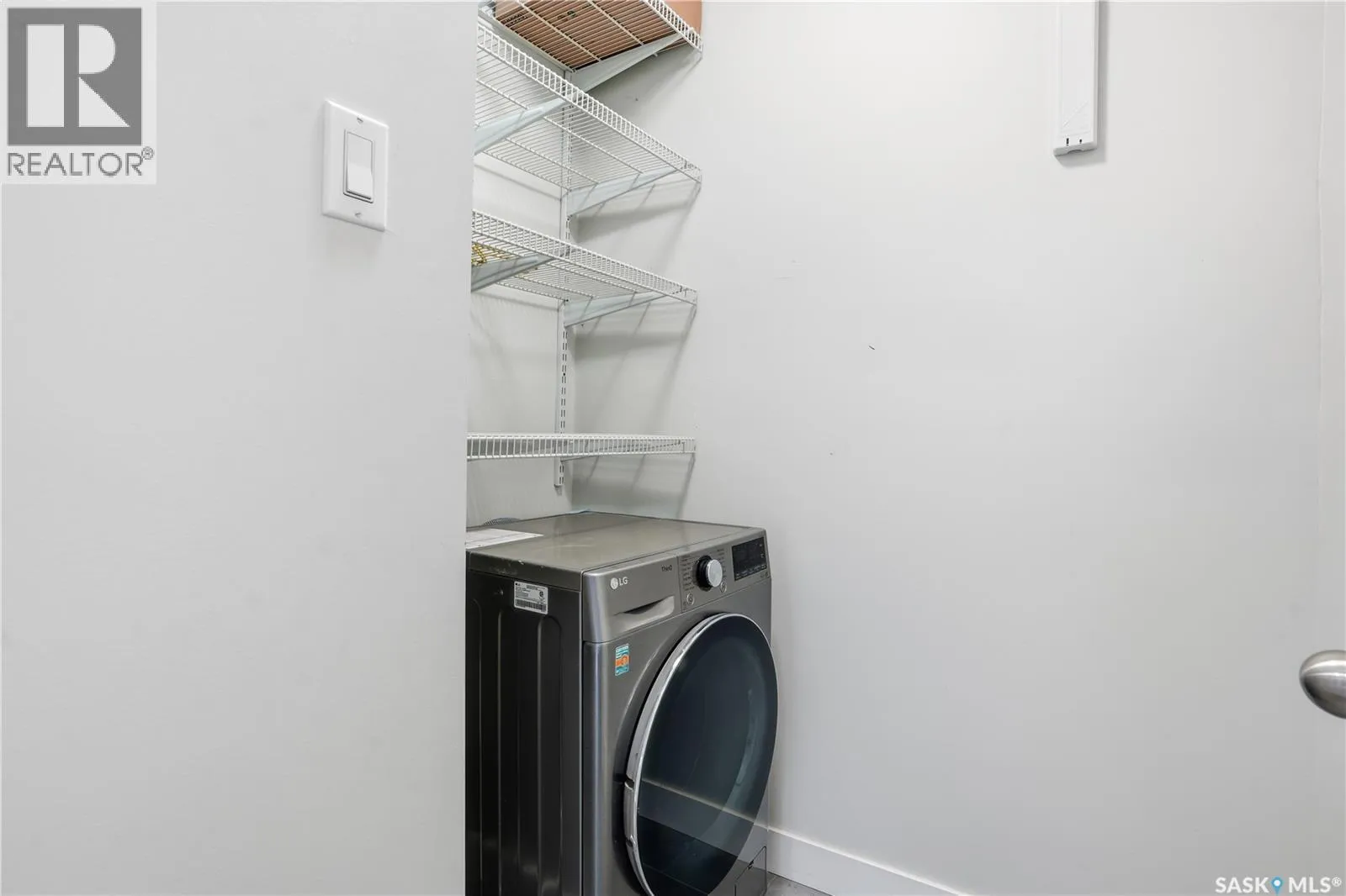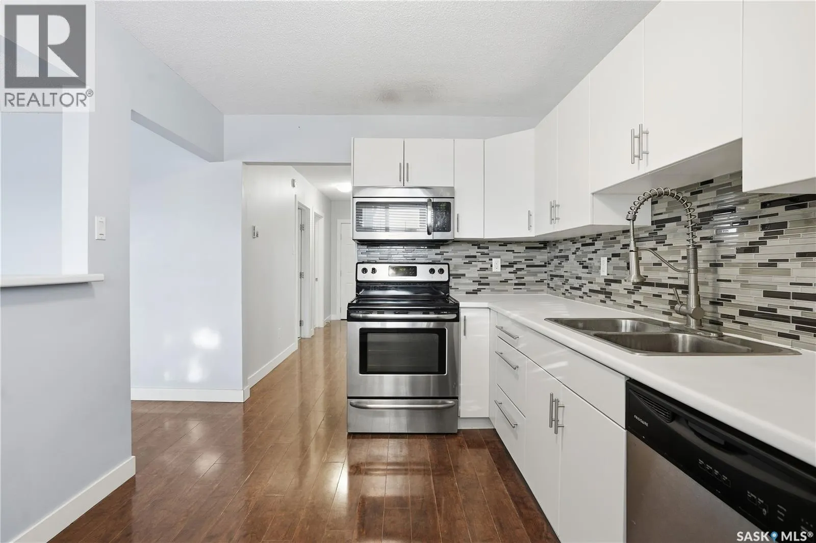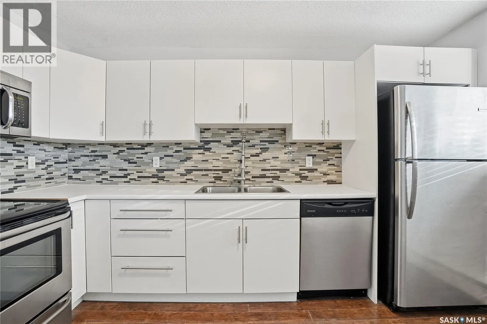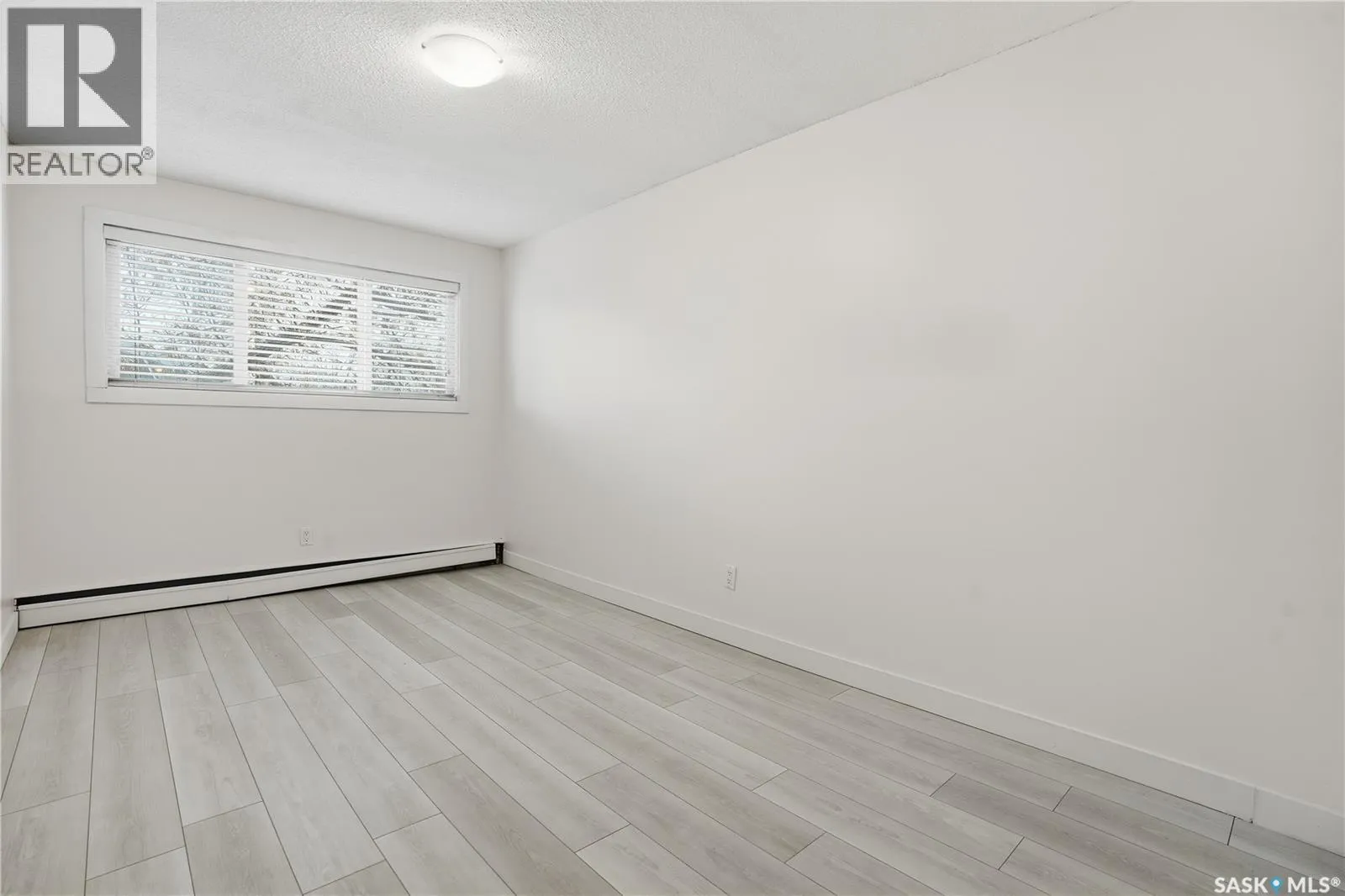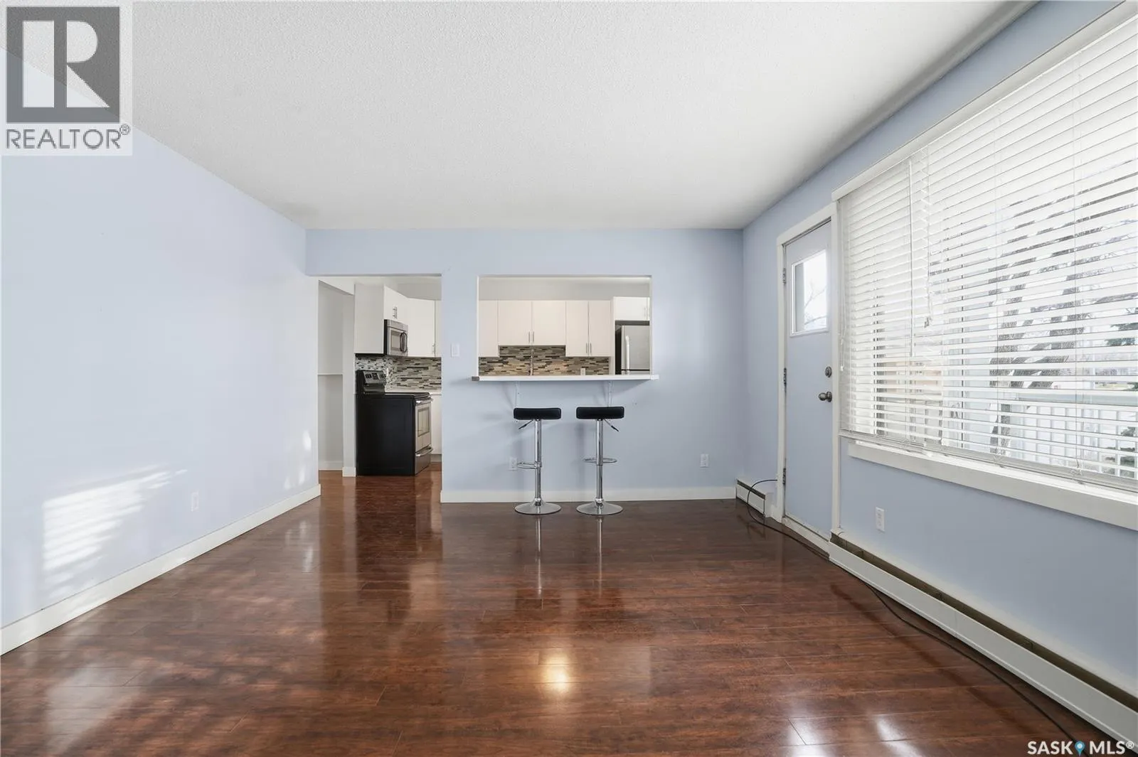 Great location and nice layout. Two good size bedrooms, four piece bathroom with in-suite laundry/storage room. The kitchen has updated white cabinets, eat at island, very functional space with the amount of counter top and location of appliances. Natural light in kitchen and living room. Plus a good size balcony - room for a bbq and bistro set. Laminate flooring throughout, new flooring in bedrooms, ready to move into. The washer/dryer appliances is all in one. In addition there is shared laundry available in the building. An electrified exterior outside parking stall - it's larger as its on the end. Condo fees include water and heat, common area insurance, lawn care, snow removal. Pets area allowed with restrictions. Smaller apartment condo building in a desirable neighbourhood of Arnhem, close to beautiful Wascana Park, walking paths. Easy commute to university and downtown, For more information or a viewing contact your salesperson. (id:27476)