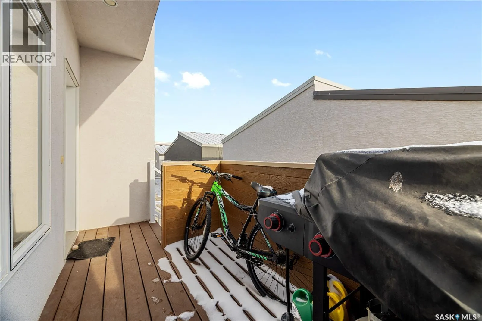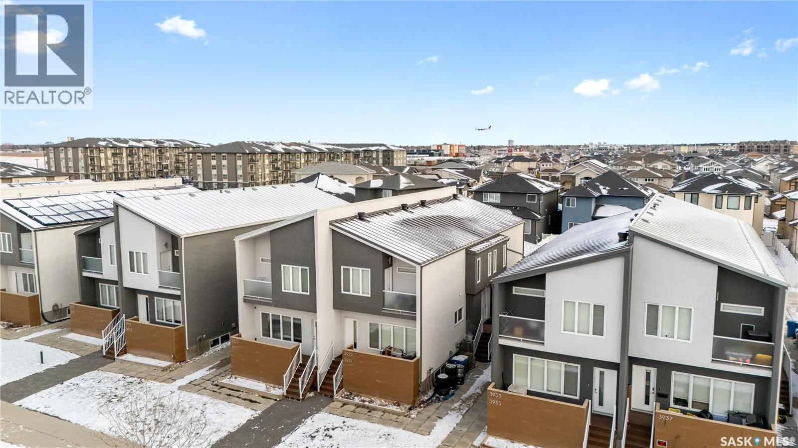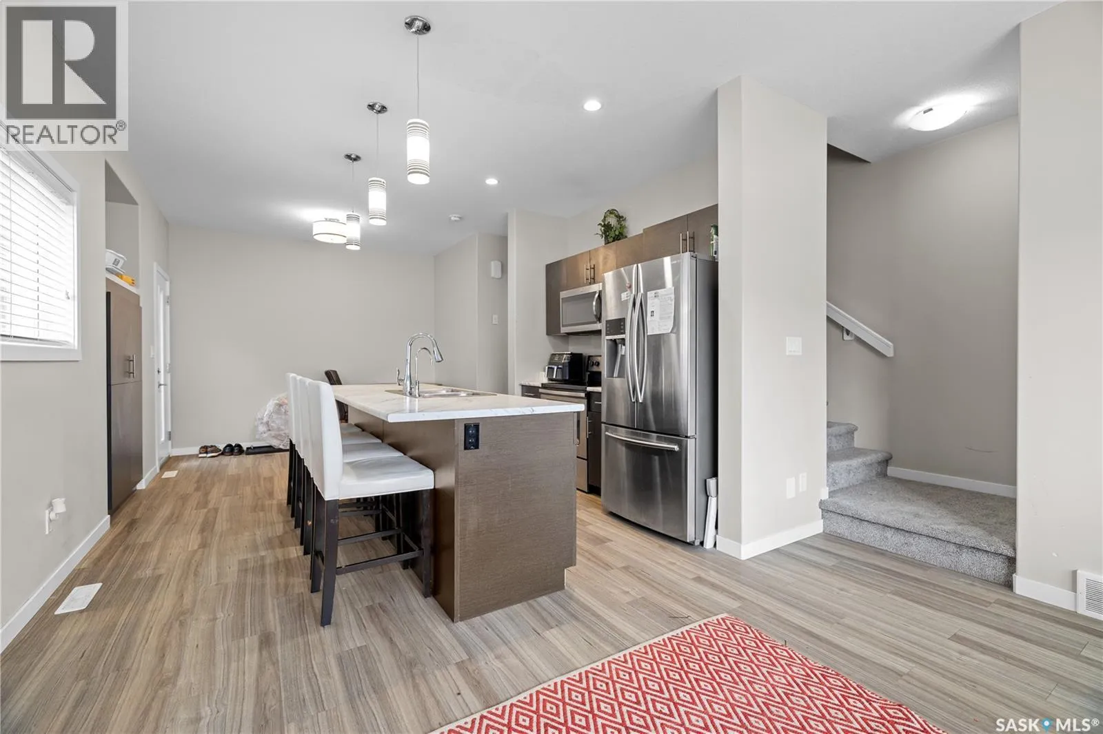 This beautifully and tremendously townhouse condo in amazing Harbour Landing neighbourhood community is less than 7 minutes drive to Regina International Airport, few metres to Havilland Park and short walking distance to school, seniors home, daycare, and shopping centres. The home is fitted with metal roof, primary bedroom balcony, barbecue deck and on 1 detached garage. Upon entry, you are welcome by the modern open plan concept with sizable living room open to the dining area and U-shaped kitchen that is equipped with sit-up island, numerous cabinets and stainless-steel appliances, mudroom, 2 pc washroom and vinyl plank floorings. 2nd level features sizable primary bedroom with 4pcs bathroom en-suit and walk-in closet, another good size bedroom, 4pcs bathroom and laundry room compliment this level. Basement level is professionally and fully finished with spacious recreational room, roughed-in bathroom and utilities room for tons of storage. The condo fee is $150 and include: Common Area Maintenance, External Building Maintenance, Lawncare, Snow Removal, Insurance (Common). Schedule your showings. (id:27476)